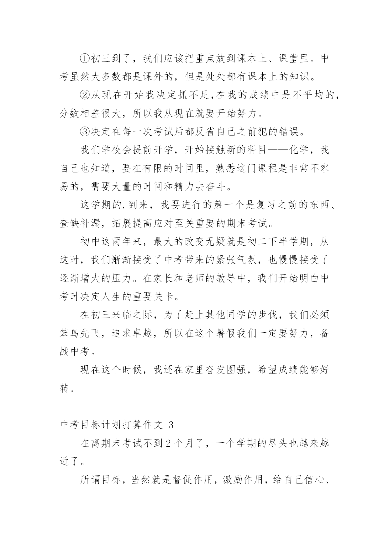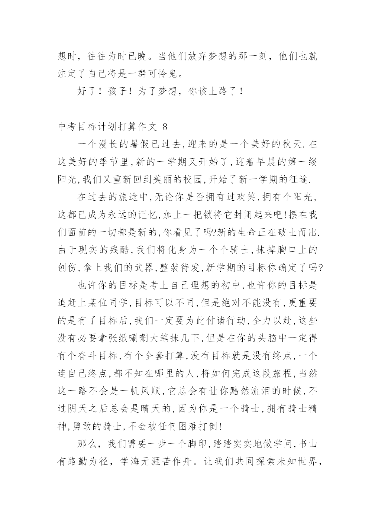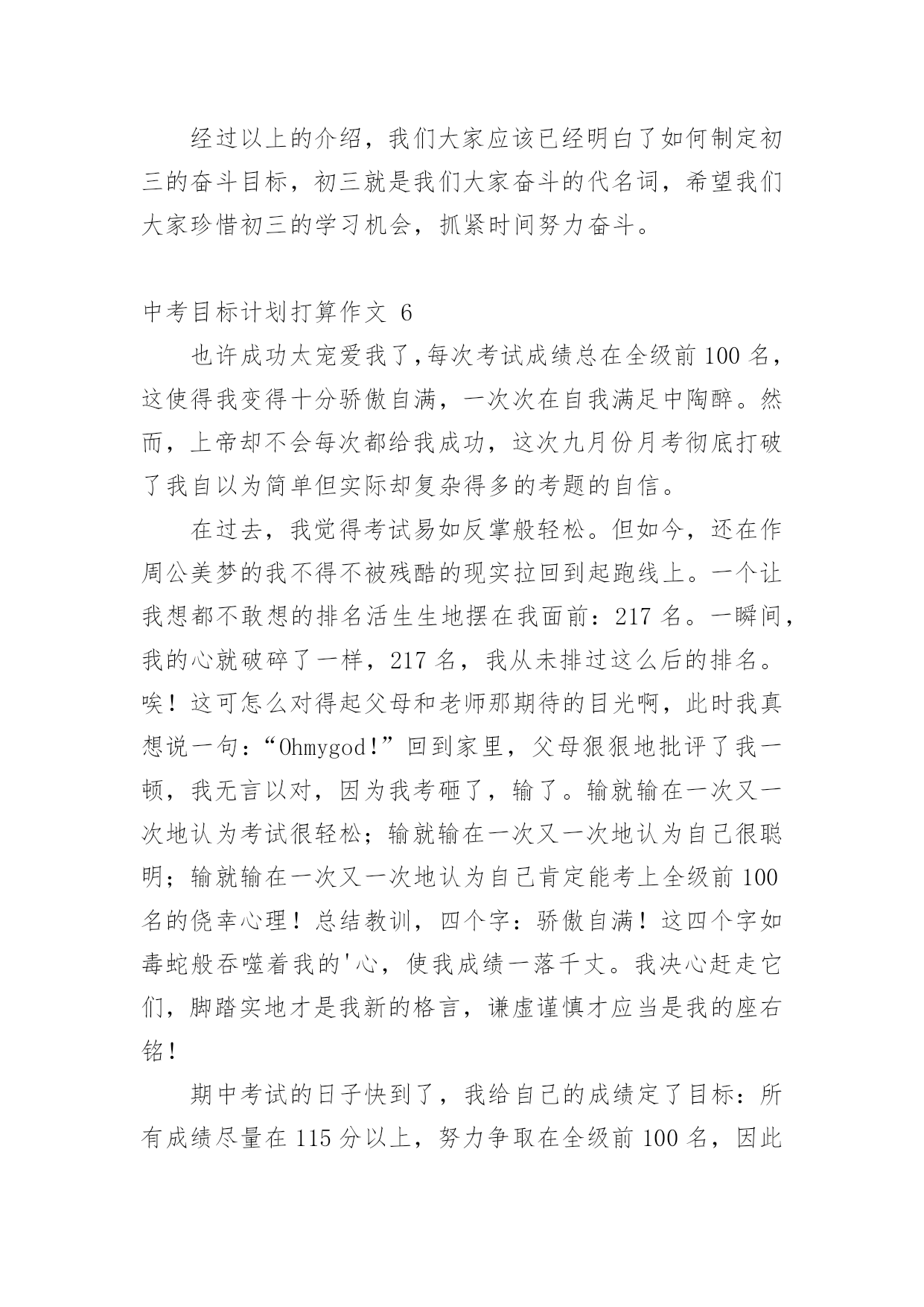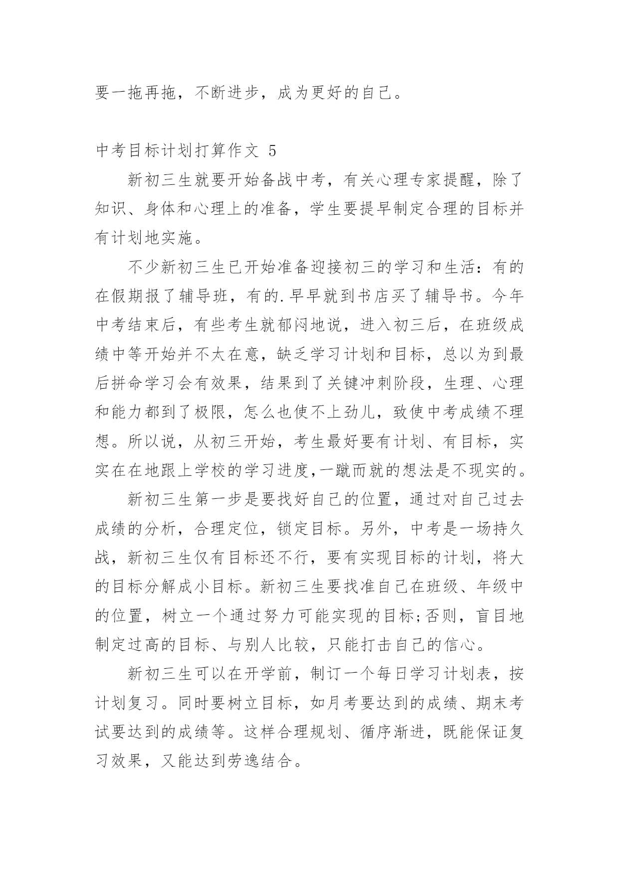 中考目标计划打算作文中考目标计划打算作文(精选15篇)在学习、工作、生活中,大家或多或少都会接触过作文吧,作文是人们把记忆中所存储的有关知识、经验和思想用书面形式表达出来的记叙方式。你所见过的作文是什么样的呢?下面是小编精心整理的中考目标计划打算作文,仅供参考,欢迎大家阅读。中考目标计划打算作文1马上就要开学了,开学后我就是初三的学生了。初三的到来,好像自己马上就要上战场了。自己慢慢地有一点危机感了,害怕同学超越自己。为了能在初三学的好一点,我决定现在就想好新学期的打算。第一,我决定学会放弃。在前两个学期里,我经常去上网、看小说、睡觉,对于老师布置的作业也不认真完成。对于这些流失的时间,我不能挽回,对于初三我一定要把握。初三我要学会放弃,放弃了我也可能失去很多东西。但是我不怕,放弃了会让我更认真点。那些东西以后来做也一样,何必就要现在呢?我对自己说。第二,我决定抓不足。在我的.成绩中是不平均的,分数高的和分数低的相差几十分。之前的两个学期我的思想还不够成熟,想法还比较简单。现在我不之前那想法简单的自己了,我有了自己的目标,自己的想法,我的记忆也更好了。为了自己的成绩能在平均中上等,我决定在自己擅长的科目不放过,对于自己不懂的向别人学习。第三,我决定在每一次周测后都会认真去反思我之前的错误。每一个人都会有不同的错误,而且也不会没有错误。在之前,每一次周测下来我都会有许多错误。那些错误的地方看起来我我都知道,但还是做错了。过去我不认真去反思,去发现自己的错误,去改正它。但是在这个学期,我会去认真改正,我会以最还得状态去面对新的学期。还有,在初二我发现有许多人比我努力·认真。在我们班上有一个人,她在初一的时候英语很不好,比我还差。但是后来她努力了,现在已经在中上了。她现在还是默默无闻地认真学习,她不懂感认真像我们请教。老师您多次叫我向她学习,这回我认识到了,你是对的,我早都有向她学习了。我有许多的坏习惯了,骄傲是我最大的弱点,我会改的——在这个学期。英语我一定会跟上去,相信我。新的学期,我会有新的改变。老师请你相信,我会给您带来惊喜!中考目标计划打算作文2漫漫长路走到这决定人生命运的时刻就会鼓起花骨朵,至于是开的芬芳四溢,还是含骨凋谢,那就要看我们对自己的要求是否严格,所以就要为自己量身定做一个合一的学习规划。我的规划:①初三到了,我们应该把重点放到课本上、课堂里。中考虽然大多数都是课外的,但是处处都有课本上的知识。②从现在开始我决定抓不足,在我的成绩中是不平均的,分数相差很大,所以我从现在就要开始努力。③决定在每一次考试后都反省自己之前犯的错误。我们学校会提前开学,开始接触新的科目——化学,我自己也知道,要在有限的时间里,熟悉这门课程是非常不容易的,需要大量的时间和精力去奋斗。这学期的.到来,我要进行的第一个是复习之前的东西、查缺补漏,拓展提高应对至关重要的期末考试。初中这两年来,最大的改变无疑就是初二下半学期,从这时,我们渐渐接受了中考带来的紧张气氛,也慢慢接受了逐渐增大的压力。在家长和老师的教导中,我们开始明白中考时决定人生的重要关卡。在初三来临之际,为了赶上其他同学的步伐,我们必须笨鸟先飞,追求卓越,所以在这个暑假我们一定要努力,备战中考。现在这个时候,我还在家里奋发图强,希望成绩能够好转。中考目标计划打算作文3在离期末考试不到2个月了,一个学期的尽头也越来越近了。所谓目标,当然就是督促作用,激励作用,给自己信心、力量的口号!为了过一个高兴的年,心安理得的收下压岁钱,考出个好成绩吧!上次考试都还不错。so,这次——期末大战,无论如何,至少也得保持吧!数学:115,我觉得期中考试考得太差,只考了114,既不是我喜欢的数字,也不是我喜欢的分数,想想就觉得失败。这半学期数学比上半学期难度提高了不少,但是我会努力达到的,甚至更好。英语:115,英语上课记的许多重点是要掌握的,此外,练一练,背一背,读一读,记一记,再把字写好点,就差不多ok了!语文:100,语文的话就没什么大问题,相对来说还不算是我的弱项。关键是作文,吸取了上次的教训,期末考试我一定不会纵容自己犯同样的错误。物理:90,这是我到现在觉得最难的.一门课。有时候简直是在听天书,不过,我相信勤奋也可以造就天才。政治:90,历史:90,地理:90,生物:90,总分:780针对期末考试,我不能说自己是“胸有成竹”,虽然我不会因为考试而紧张的吃不下饭,睡不着觉,但是我也不会轻视它,我会重视它,把它当成自己的一个敌人,用自己的全力把它打倒。中考目标计划打算作文4新学期到来,我们应该有新的小目标,鼓励并且激励着自己。试问:上个学期的小目标,你完成了吗?我们开始为新的学期定一个目标吧。定目标是为了我们能更好的分清自己需要改掉什么,去加强什么。为了能更好地发展完善自己,自己弱的一项要