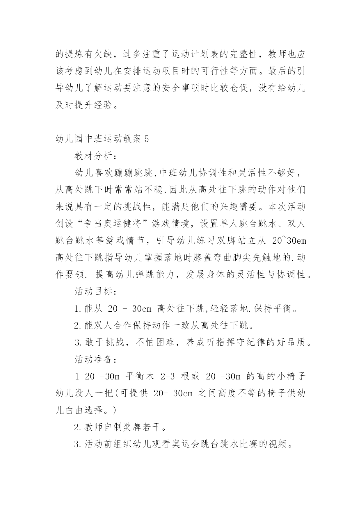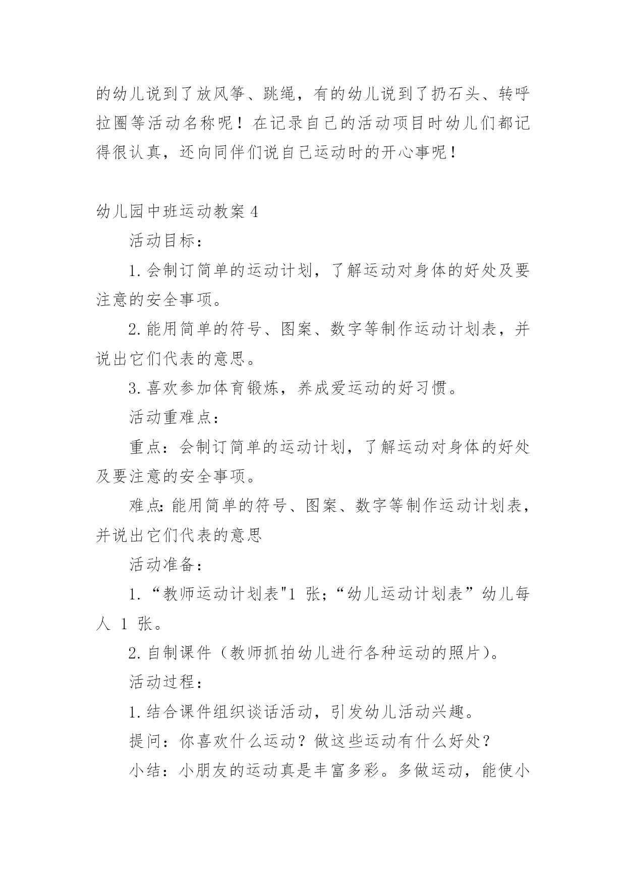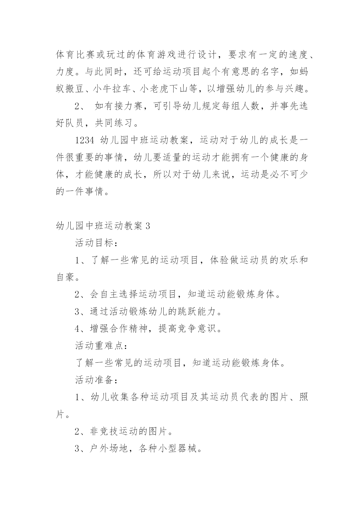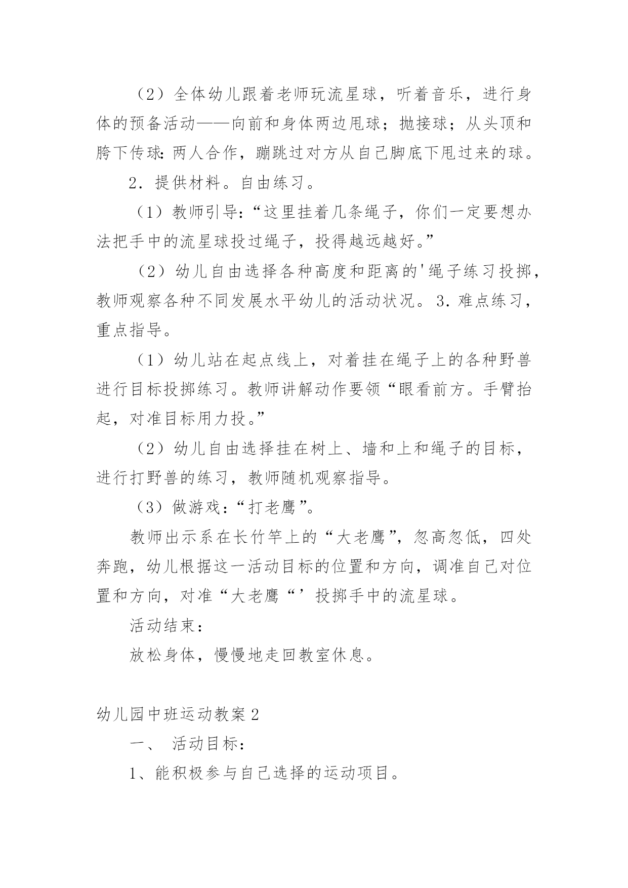 幼儿园中班运动教案幼儿园中班运动教案必备【15篇】作为一位兢兢业业的人民教师,时常需要用到教案,借助教案可以提高教学质量,收到预期的教学效果。那么什么样的教案才是好的呢?以下是小编收集整理的幼儿园中班运动教案,仅供参考,欢迎大家阅读。幼儿园中班运动教案1活动目标学习择臂动作,增强上肢肌肉的力量,提高幼儿身体的灵活性和协调性。重点与难点能抬高手臂,将手中物体用力掷向目标。活动准备1.小皮球若干,装在废旧的丝袜中打上结为流星球。2.在树上、墙上或一家高度的绳子上布置好有各种野兽图像的活动场景。3.系在竹竿上可以操作摆动的大老鹰一个。4.录音机一架、磁带若干。活动过程1.扮演角色,活动身体。(1)教师启发:我们小朋友真聪明,做了许多流星球,今天我们就来做杂技党员,听着音乐,玩流星球好吗?(2)全体幼儿跟着老师玩流星球,听着音乐,进行身体的预备活动——向前和身体两边甩球;抛接球;从头顶和胯下传球:两人合作,蹦跳过对方从自己脚底下甩过来的球。2.提供材料。自由练习。(1)教师引导:“这里挂着几条绳子,你们一定要想办法把手中的流星球投过绳子,投得越远越好。”(2)幼儿自由选择各种高度和距离的'绳子练习投掷,教师观察各种不同发展水平幼儿的活动状况。3.难点练习,重点指导。(1)幼儿站在起点线上,对着挂在绳子上的各种野兽进行目标投掷练习。教师讲解动作要领“眼看前方。手臂抬起,对准目标用力投。”(2)幼儿自由选择挂在树上、墙和上和绳子的目标,进行打野兽的练习,教师随机观察指导。(3)做游戏:“打老鹰”。教师出示系在长竹竿上的“大老鹰”,忽高忽低,四处奔跑,幼儿根据这一活动目标的位置和方向,调准自己对位置和方向,对准“大老鹰“’投掷手中的流星球。活动结束:放松身体,慢慢地走回教室休息。幼儿园中班运动教案2一、活动目标:1、能积极参与自己选择的运动项目。2、能较好地与同伴配合,共同完成比赛项目。二、活动准备:1、和幼儿一起设计运动会项目,并制作运动项目胸牌和奖牌。2、幼儿自由报名,每人选择2到3个项目参加运动会。3、在每天的晨间锻炼活动中,提供所需的运动器械,让幼儿反复练习为运动会做准备。4、《运动会进行曲》音乐磁带。三、活动过程:1、运动员入场。幼儿挂着自制的运动项目胸牌,在《运动员进行曲》的音乐声中,有精神地入场。幼儿进行早操表演。2、小小运动会开幕。根据运动会项目表,逐项进行比赛。运动器械的准备、更换、收拾等,由参加该项目比赛的幼儿协助教师共同完成。鼓励幼儿积极参加比赛,争当文明观众。3、举行颁奖仪式。在雄壮有力的进行曲音乐声中,颁发各个项目的金、银、铜牌。“采访”个别“运动员”,请他们谈谈自己的'感受。四、活动建议:1、在设计运动会项目时,教师可启发幼儿回忆看过的体育比赛或玩过的体育游戏进行设计,要求有一定的速度、力度。与此同时,还可给运动项目起个有意思的名字,如蚂蚁搬豆、小牛拉车、小老虎下山等,以增强幼儿的参与兴趣。2、如有接力赛,可引导幼儿规定每组人数,并事先选好队员,共同练习。1234幼儿园中班运动教案,运动对于幼儿的成长是一件很重要的事情,幼儿要适量的运动才能拥有一个健康的身体,才能健康的成长,所以对于幼儿来说,运动是必不可少的一件事情。幼儿园中班运动教案3活动目标:1、了解一些常见的运动项目,体验做运动员的欢乐和自豪。2、会自主选择运动项目,知道运动能锻炼身体。3、通过活动锻炼幼儿的跳跃能力。4、增强合作精神,提高竞争意识。活动重难点:了解一些常见的运动项目,知道运动能锻炼身体。活动准备:1、幼儿收集各种运动项目及其运动员代表的图片、照片。2、非竞技运动的图片。3、户外场地,各种小型器械。4、统计表、笔。活动过程:一、我们知道的运动员。1、幼儿介绍自己知道的运动员,展示相关图片和照片。2、鼓励幼儿用较连贯的语言,清楚的介绍这些运动员在进行的运动项目,如:这是自行车运动员,他们每天练习骑自行车,想让自己骑得更快一些。二、他们也在运动。1、出示幼儿没有谈到的其他运动项目的图片,请幼儿看一看、说一说图片上的人在干什么。2、播放一些非竞技能运动项目的.录像,如放风筝、打太极拳、跳伞、舞剑、水上芭蕾等,使幼儿了解有很多运动项目都能锻炼身体。三、我们来做运动员。1、幼儿自由到户外场地上运动。2、引导幼儿相互交流自己进行了什么运动,教师用简笔画的形式记录在统计表上,并用竖线记录参加各项运动的人数。3、带领幼儿观看记录表,数一数,大家一共锻炼了哪些项目,哪项运动参加人数最多,哪项运动参加人数最少。活动反思:在活动中,幼儿观看图片时,兴趣很高。注意力集中,并能说出图片上的运动员正在做的运动,以及运动员所需要的器械及专用服装。在幼儿说一些非竞技能运动项目时,有的幼儿说到了放风筝、跳绳,有的幼儿说到了扔石头、转呼拉圈等活动名称呢!在记录自己的活动项