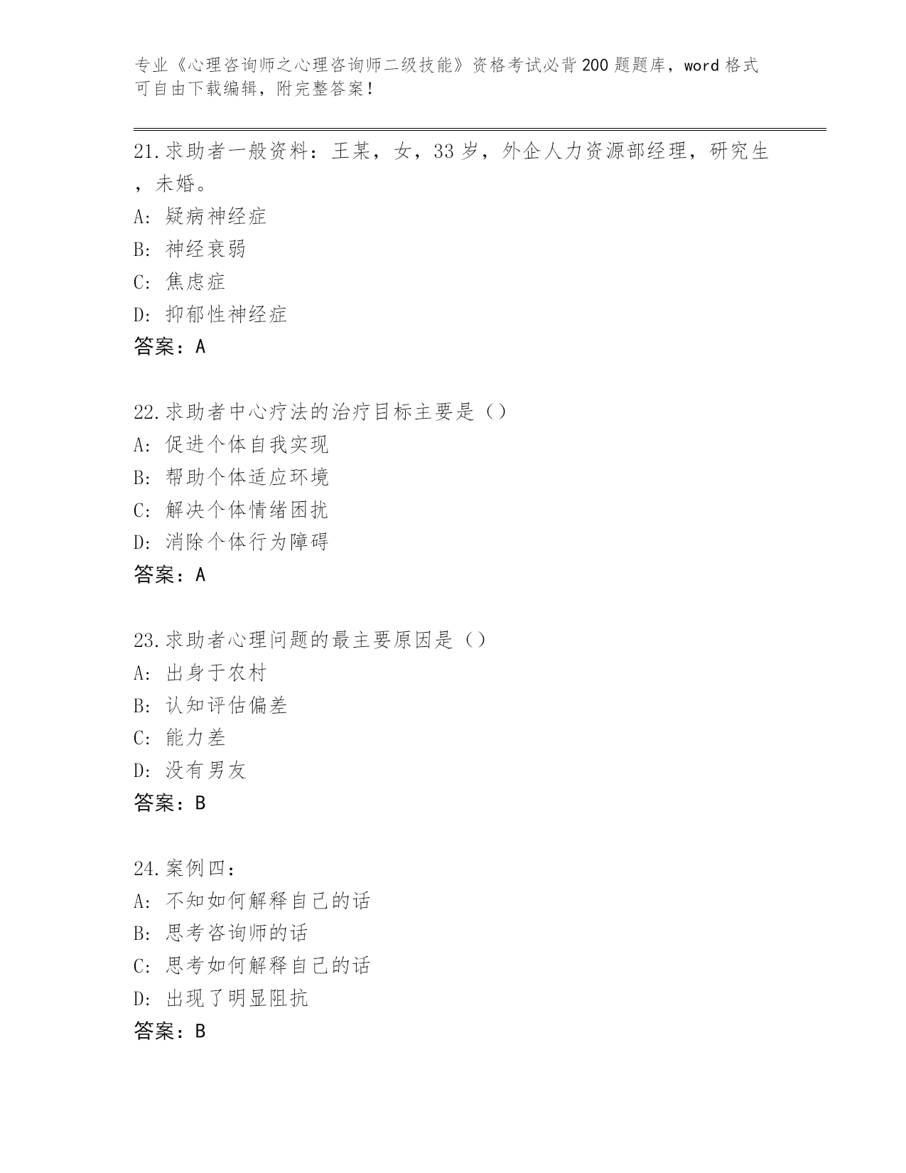 山西省新荣区《心理咨询师之心理咨询师二级技能》资格考试必背200题题库大全带答案(培优)