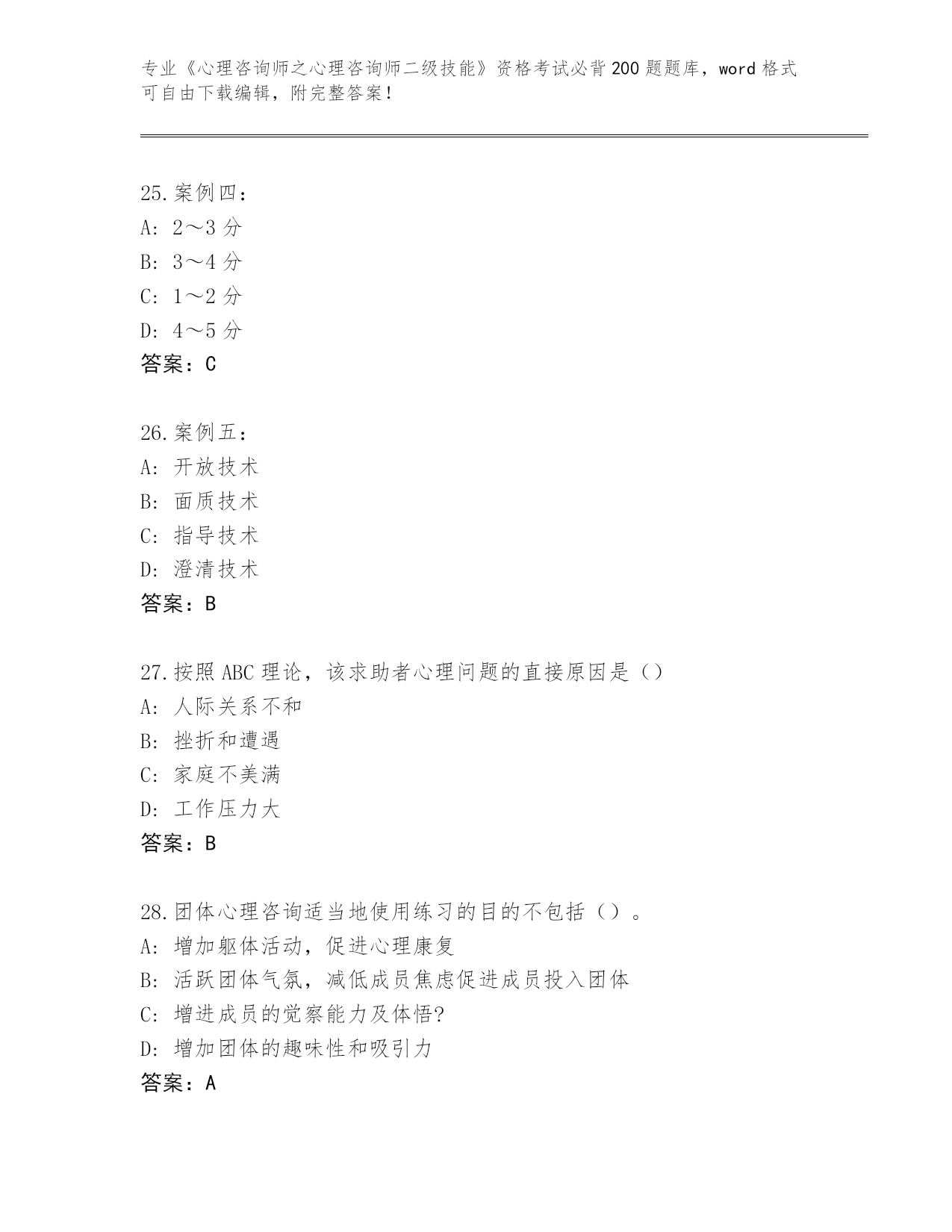 吉林省2024年《心理咨询师之心理咨询师二级技能》资格考试必背200题大全(巩固)
