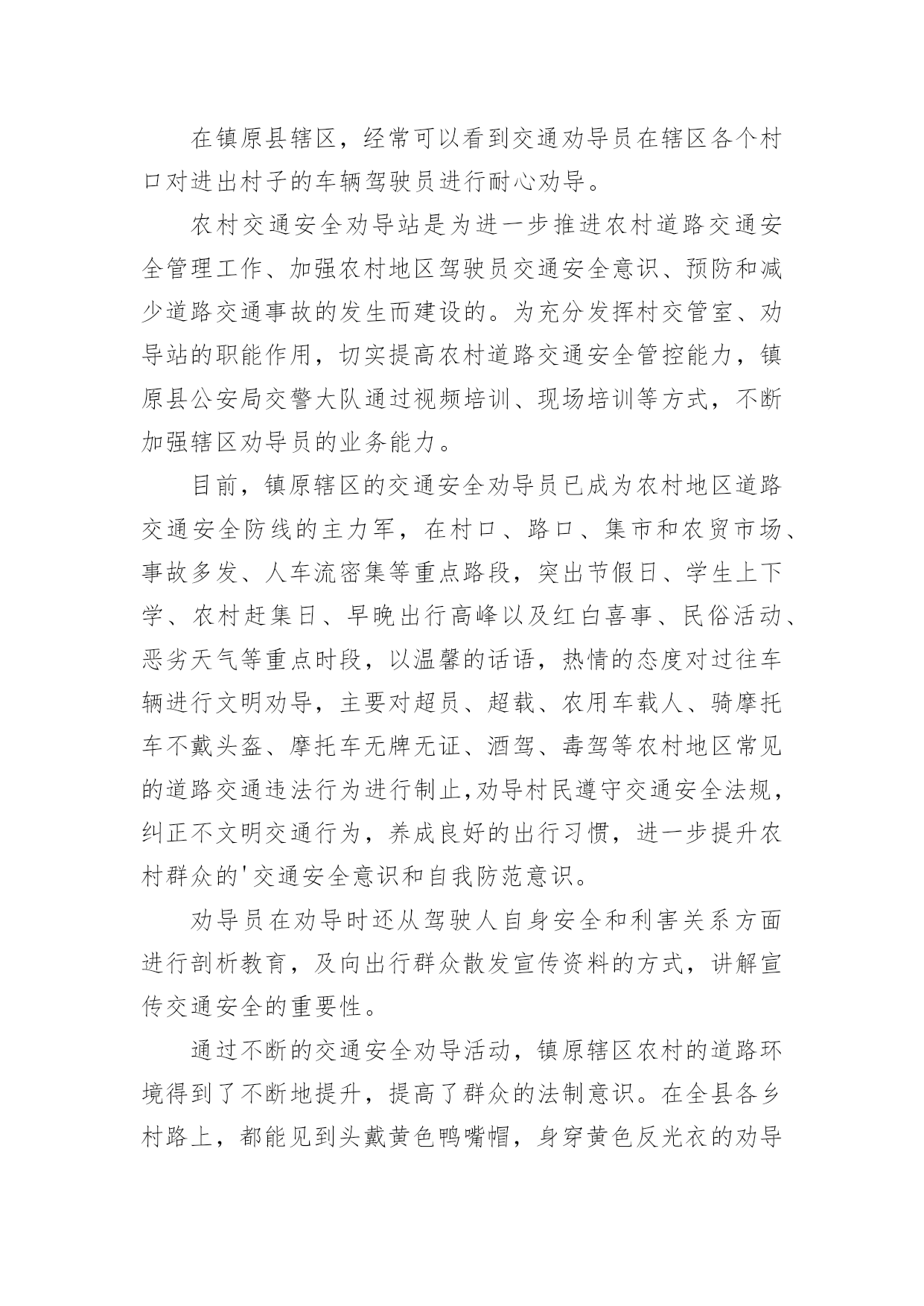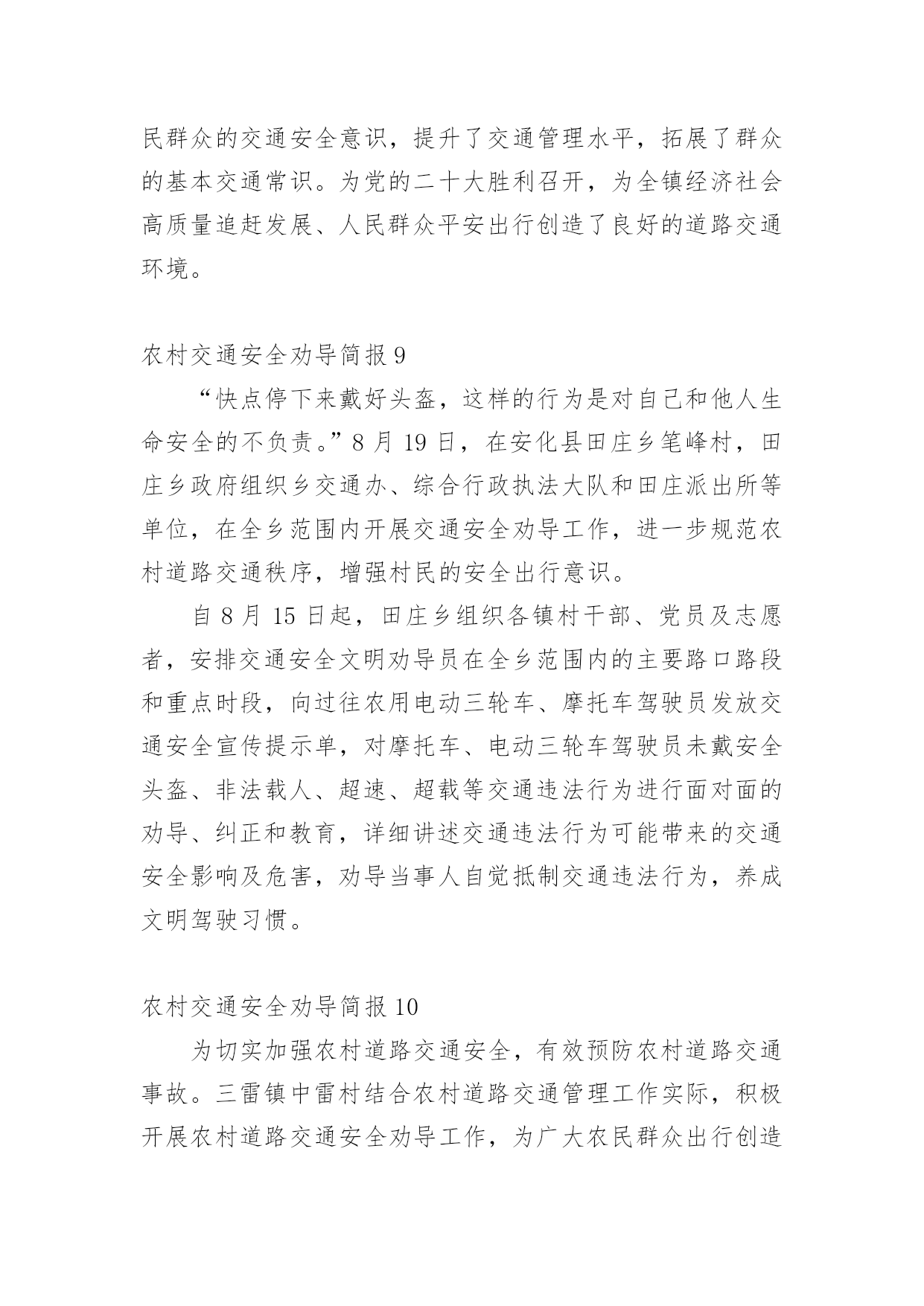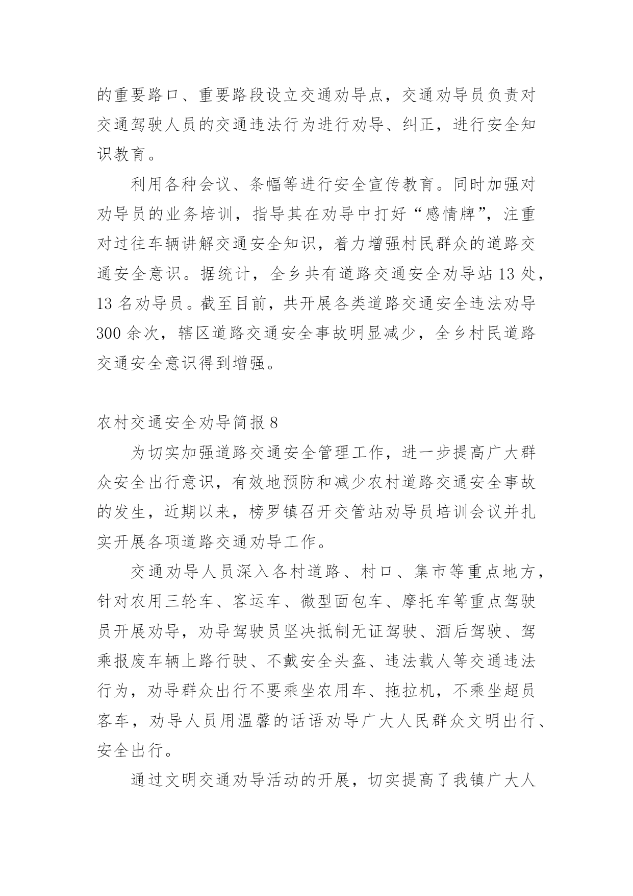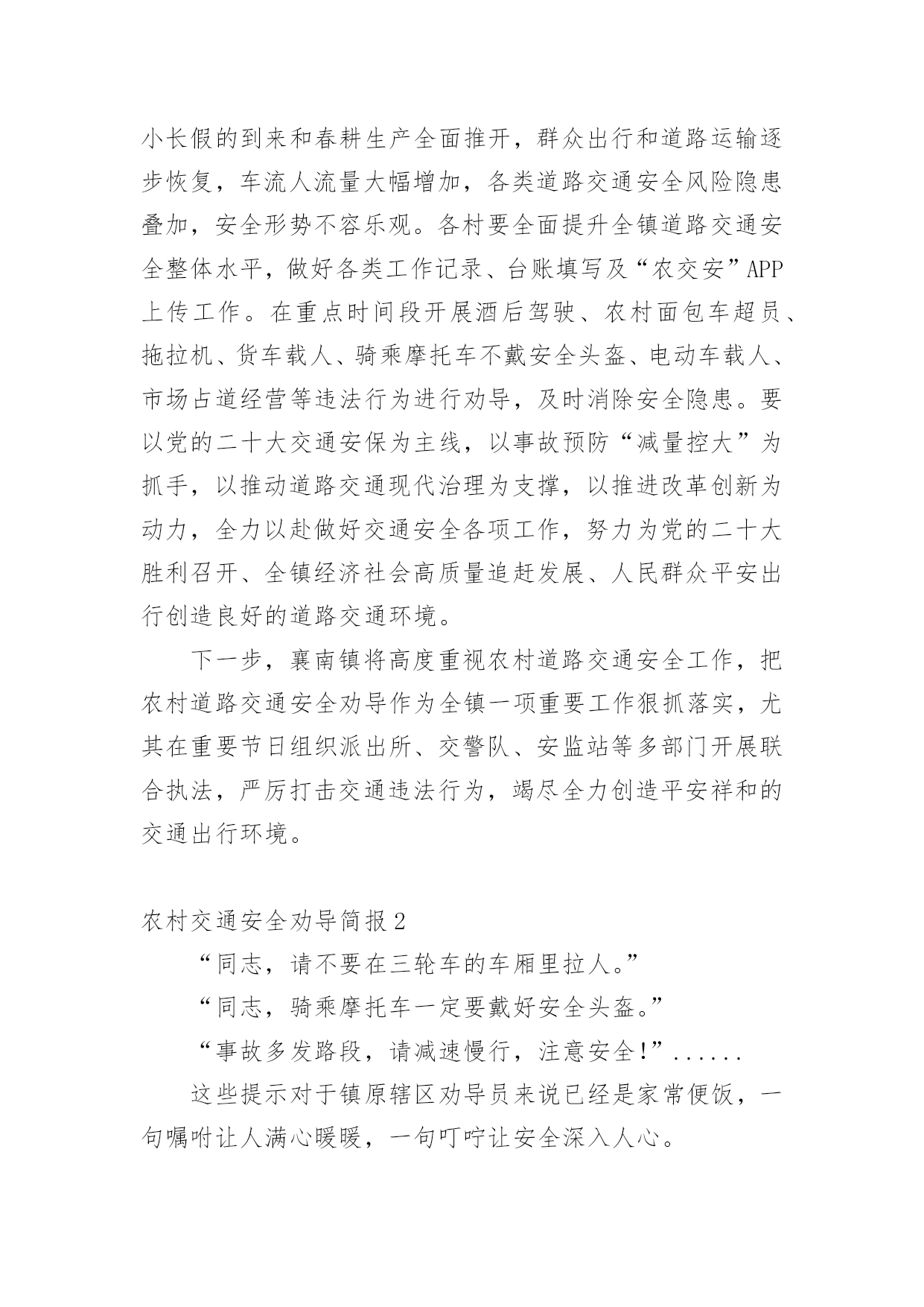 农村交通安全劝导简报农村交通安全劝导简报(精选15篇)在不断进步的社会中,很多情况下我们都会接触到简报,简报的写作既不同于文字作品,也不同于评论文章。你知道简报怎样才能写的好吗?以下是小编为大家整理的农村交通安全劝导简报(精选15篇),希望对大家有所帮助。农村交通安全劝导简报1为进一步保障农村道路交通安全,提高机动车驾驶员的交通安全意识和文明行车意识,预防和减少农村道路交通事故发生,切实加强农村道路交通安全管理工作,近日,襄南镇召开2022年第二季度道路交通安全推进会议,镇党委书记张晓军出席会议并讲话。各村党支部书记、镇交管站全体成员、各村交通劝导员共60多人参加会议。会上,副镇长孟振宇传达学习了省市安全生产工作会议精神和通渭县道路交通安全委员会2022年第二次全体(扩大)会议精神,并对第二季度全镇农村道路交通安全工作进行全面的安排部署。会议强调,今年以来,由于新冠肺炎疫情影响,各村、各交管站闻令而动,自觉服从疫情防控大局的需要,不畏艰难险阻,在配合做好疫情防控工作的前提下,聚焦道路交通安全工作重点,一手抓道路保通保畅,一手抓交通事故预防,确保了辖区道路交通安全形势基本保持平稳。但随着“五一”小长假的到来和春耕生产全面推开,群众出行和道路运输逐步恢复,车流人流量大幅增加,各类道路交通安全风险隐患叠加,安全形势不容乐观。各村要全面提升全镇道路交通安全整体水平,做好各类工作记录、台账填写及“农交安”APP上传工作。在重点时间段开展酒后驾驶、农村面包车超员、拖拉机、货车载人、骑乘摩托车不戴安全头盔、电动车载人、市场占道经营等违法行为进行劝导,及时消除安全隐患。要以党的二十大交通安保为主线,以事故预防“减量控大”为抓手,以推动道路交通现代治理为支撑,以推进改革创新为动力,全力以赴做好交通安全各项工作,努力为党的二十大胜利召开、全镇经济社会高质量追赶发展、人民群众平安出行创造良好的道路交通环境。下一步,襄南镇将高度重视农村道路交通安全工作,把农村道路交通安全劝导作为全镇一项重要工作狠抓落实,尤其在重要节日组织派出所、交警队、安监站等多部门开展联合执法,严厉打击交通违法行为,竭尽全力创造平安祥和的交通出行环境。农村交通安全劝导简报2“同志,请不要在三轮车的车厢里拉人。”“同志,骑乘摩托车一定要戴好安全头盔。”“事故多发路段,请减速慢行,注意安全!”......这些提示对于镇原辖区劝导员来说已经是家常便饭,一句嘱咐让人满心暖暖,一句叮咛让安全深入人心。在镇原县辖区,经常可以看到交通劝导员在辖区各个村口对进出村子的车辆驾驶员进行耐心劝导。农村交通安全劝导站是为进一步推进农村道路交通安全管理工作、加强农村地区驾驶员交通安全意识、预防和减少道路交通事故的发生而建设的。为充分发挥村交管室、劝导站的职能作用,切实提高农村道路交通安全管控能力,镇原县公安局交警大队通过视频培训、现场培训等方式,不断加强辖区劝导员的业务能力。目前,镇原辖区的交通安全劝导员已成为农村地区道路交通安全防线的主力军,在村口、路口、集市和农贸市场、事故多发、人车流密集等重点路段,突出节假日、学生上下学、农村赶集日、早晚出行高峰以及红白喜事、民俗活动、恶劣天气等重点时段,以温馨的话语,热情的态度对过往车辆进行文明劝导,主要对超员、超载、农用车载人、骑摩托车不戴头盔、摩托车无牌无证、酒驾、毒驾等农村地区常见的道路交通违法行为进行制止,劝导村民遵守交通安全法规,纠正不文明交通行为,养成良好的出行习惯,进一步提升农村群众的'交通安全意识和自我防范意识。劝导员在劝导时还从驾驶人自身安全和利害关系方面进行剖析教育,及向出行群众散发宣传资料的方式,讲解宣传交通安全的重要性。通过不断的交通安全劝导活动,镇原辖区农村的道路环境得到了不断地提升,提高了群众的法制意识。在全县各乡村路上,都能见到头戴黄色鸭嘴帽,身穿黄色反光衣的劝导员,他们用责任,用义务和劝导员的情怀助力我县的道路交通管理工作,己成为我县交通大动脉“毛细血管”上的一支生力军。农村交通安全劝导简报3“细节关于生命、安全文明出行”,为营造文明、安全、畅通的交通环境,进一步增强广大群众的交通安全意识。8月24日,镇道安办、村道路交通劝导员等在本辖区范围内开展农村道路交通安全劝导活动。活动开展中,各劝导员在主要路口、路段和重点时段,对农用车及三轮车违法载人、驾乘摩托车不戴安全头盔等交通违法行为进行劝导、纠正,并向驾驶员讲解交通违法行为和交通事故的危害性、宣传道路交通安全知识。通过劝导和宣传活动的开展,切实提高了辖区群众的遵纪守法意识和安全出行意识,有效的在源头上预防与减少交通安全事故的发生,为进一步营造安全、有序、畅通的道路交通环境打下坚实基础。农村交通安全劝导简报4为营造安全、文明、有序的农村道路交通环境,进一步提高村民群众安全出行意识,
