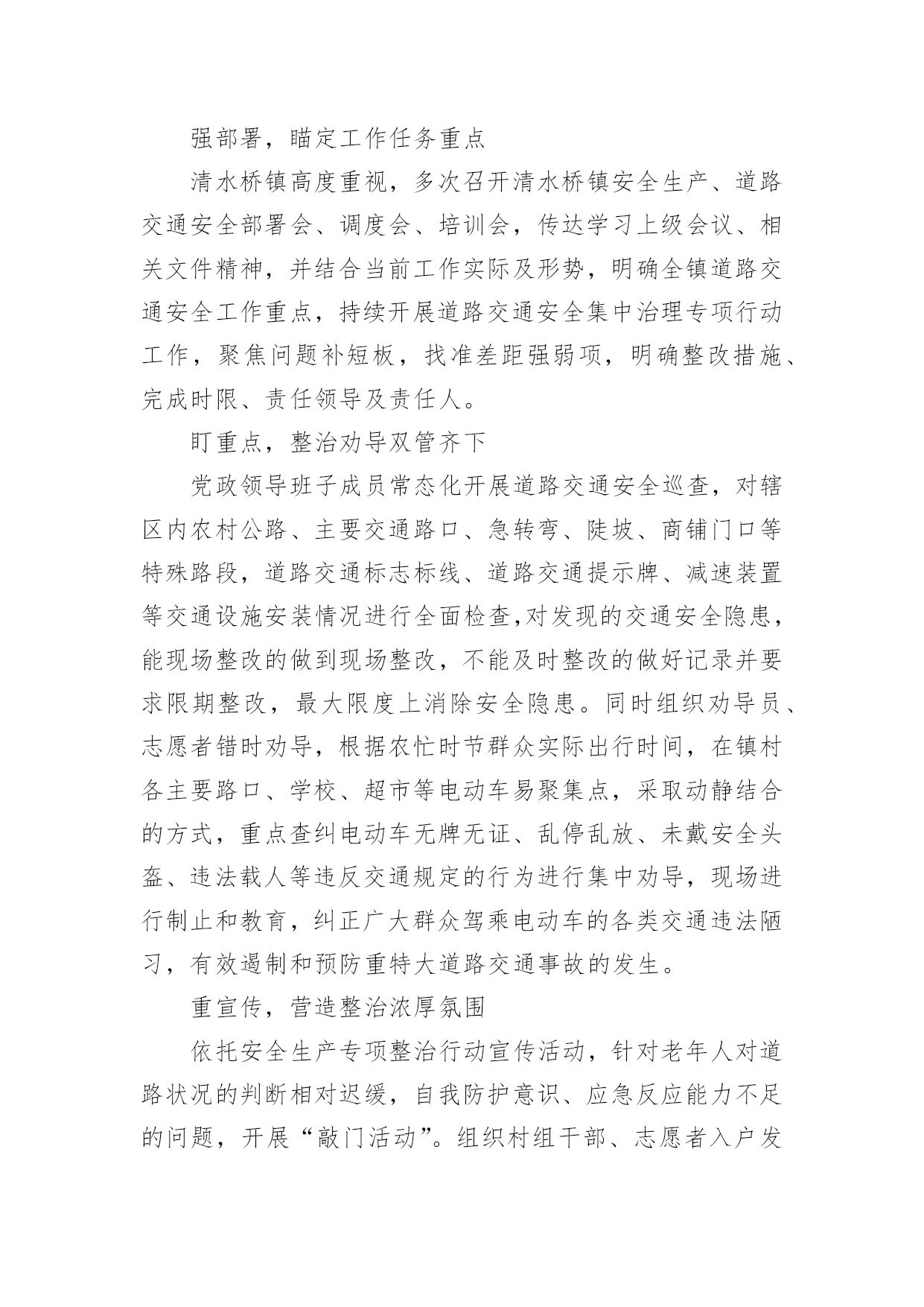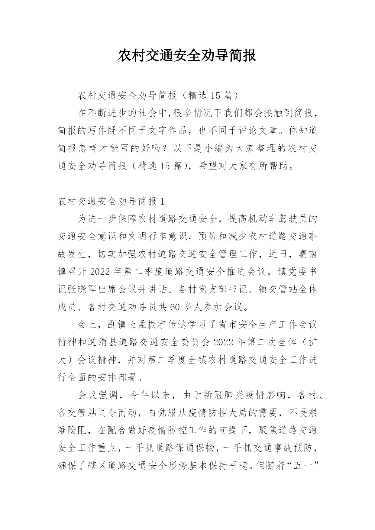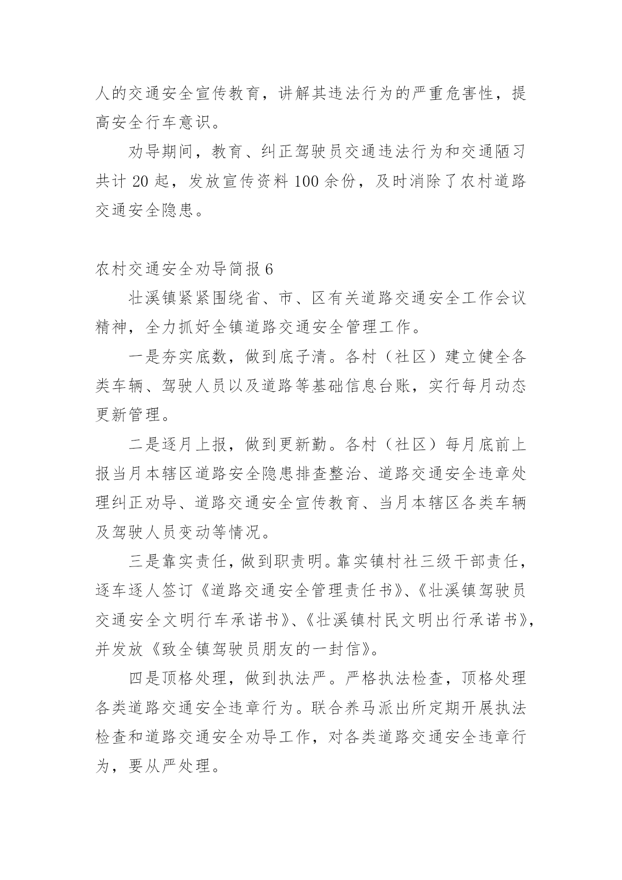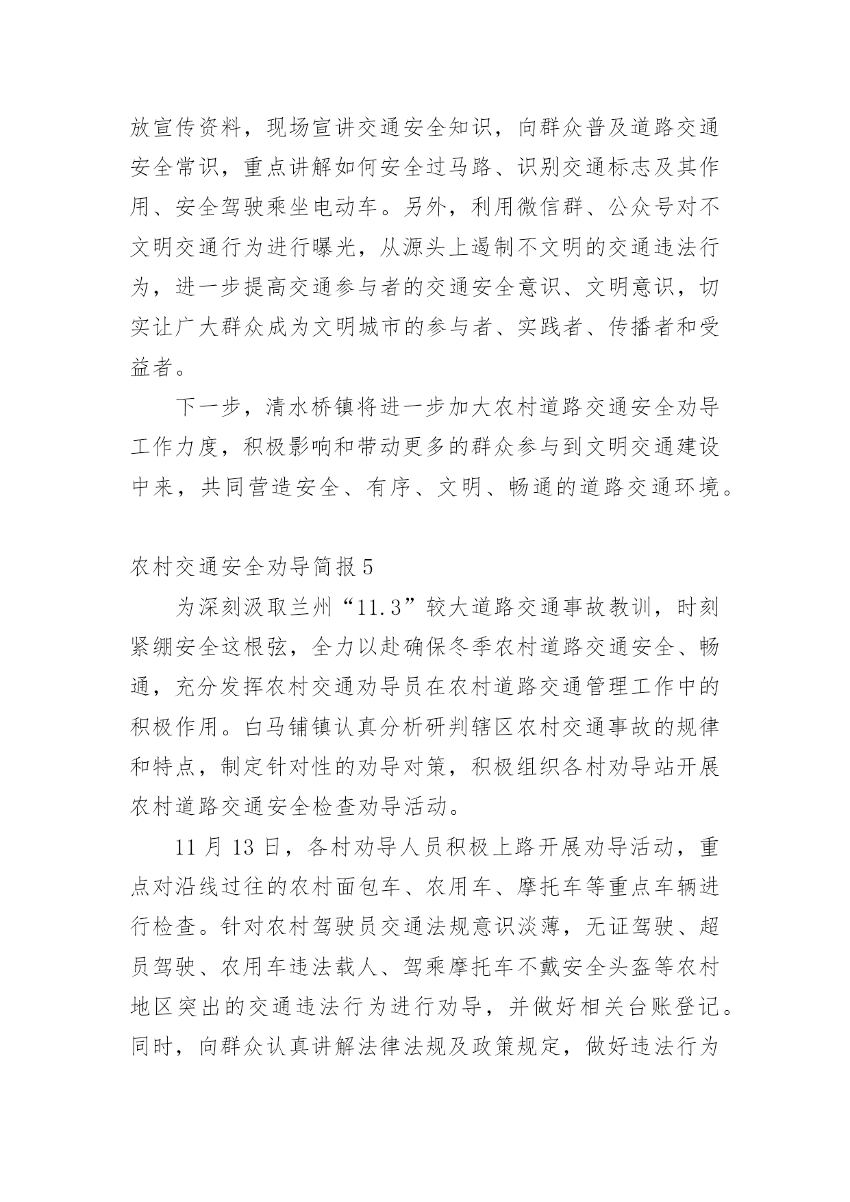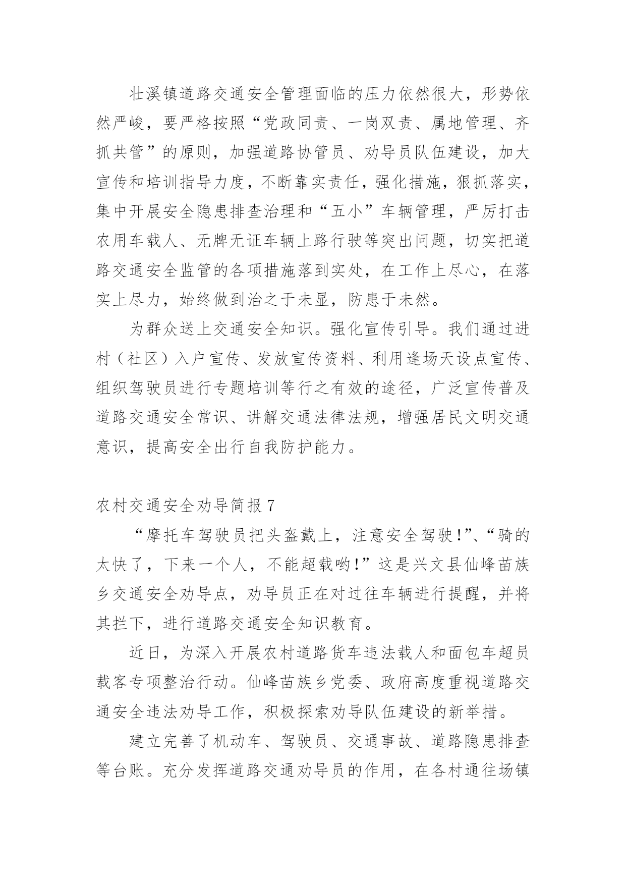 农村交通安全劝导简报农村交通安全劝导简报(精选15篇)在不断进步的社会中,很多情况下我们都会接触到简报,简报的写作既不同于文字作品,也不同于评论文章。你知道简报怎样才能写的好吗?以下是小编为大家整理的农村交通安全劝导简报(精选15篇),希望对大家有所帮助。农村交通安全劝导简报1为进一步保障农村道路交通安全,提高机动车驾驶员的交通安全意识和文明行车意识,预防和减少农村道路交通事故发生,切实加强农村道路交通安全管理工作,近日,襄南镇召开2022年第二季度道路交通安全推进会议,镇党委书记张晓军出席会议并讲话。各村党支部书记、镇交管站全体成员、各村交通劝导员共60多人参加会议。会上,副镇长孟振宇传达学习了省市安全生产工作会议精神和通渭县道路交通安全委员会2022年第二次全体(扩大)会议精神,并对第二季度全镇农村道路交通安全工作进行全面的安排部署。会议强调,今年以来,由于新冠肺炎疫情影响,各村、各交管站闻令而动,自觉服从疫情防控大局的需要,不畏艰难险阻,在配合做好疫情防控工作的前提下,聚焦道路交通安全工作重点,一手抓道路保通保畅,一手抓交通事故预防,确保了辖区道路交通安全形势基本保持平稳。但随着“五一”小长假的到来和春耕生产全面推开,群众出行和道路运输逐步恢复,车流人流量大幅增加,各类道路交通安全风险隐患叠加,安全形势不容乐观。各村要全面提升全镇道路交通安全整体水平,做好各类工作记录、台账填写及“农交安”APP上传工作。在重点时间段开展酒后驾驶、农村面包车超员、拖拉机、货车载人、骑乘摩托车不戴安全头盔、电动车载人、市场占道经营等违法行为进行劝导,及时消除安全隐患。要以党的二十大交通安保为主线,以事故预防“减量控大”为抓手,以推动道路交通现代治理为支撑,以推进改革创新为动力,全力以赴做好交通安全各项工作,努力为党的二十大胜利召开、全镇经济社会高质量追赶发展、人民群众平安出行创造良好的道路交通环境。下一步,襄南镇将高度重视农村道路交通安全工作,把农村道路交通安全劝导作为全镇一项重要工作狠抓落实,尤其在重要节日组织派出所、交警队、安监站等多部门开展联合执法,严厉打击交通违法行为,竭尽全力创造平安祥和的交通出行环境。农村交通安全劝导简报2“同志,请不要在三轮车的车厢里拉人。”“同志,骑乘摩托车一定要戴好安全头盔。”“事故多发路段,请减速慢行,注意安全!”......这些提示对于镇原辖区劝导员来说已经是家常便饭,一句嘱咐让人满心暖暖,一句叮咛让安全深入人心。在镇原县辖区,经常可以看到交通劝导员在辖区各个村口对进出村子的车辆驾驶员进行耐心劝导。农村交通安全劝导站是为进一步推进农村道路交通安全管理工作、加强农村地区驾驶员交通安全意识、预防和减少道路交通事故的发生而建设的。为充分发挥村交管室、劝导站的职能作用,切实提高农村道路交通安全管控能力,镇原县公安局交警大队通过视频培训、现场培训等方式,不断加强辖区劝导员的业务能力。目前,镇原辖区的交通安全劝导员已成为农村地区道路交通安全防线的主力军,在村口、路口、集市和农贸市场、事故多发、人车流密集等重点路段,突出节假日、学生上下学、农村赶集日、早晚出行高峰以及红白喜事、民俗活动、恶劣天气等重点时段,以温馨的话语,热情的态度对过往车辆进行文明劝导,主要对超员、超载、农用车载人、骑摩托车不戴头盔、摩托车无牌无证、酒驾、毒驾等农村地区常见的道路交通违法行为进行制止,劝导村民遵守交通安全法规,纠正不文明交通行为,养成良好的出行习惯,进一步提升农村群众的'交通安全意识和自我防范意识。劝导员在劝导时还从驾驶人自身安全和利害关系方面进行剖析教育,及向出行群众散发宣传资料的方式,讲解宣传交通安全的重要性。通过不断的交通安全劝导活动,镇原辖区农村的道路环境得到了不断地提升,提高了群众的法制意识。在全县各乡村路上,都能见到头戴黄色鸭嘴帽,身穿黄色反光衣的劝导员,他们用责任,用义务和劝导员的情怀助力我县的道路交通管理工作,己成为我县交通大动脉“毛细血管”上的一支生力军。农村交通安全劝导简报3“细节关于生命、安全文明出行”,为营造文明、安全、畅通的交通环境,进一步增强广大群众的交通安全意识。8月24日,镇道安办、村道路交通劝导员等在本辖区范围内开展农村道路交通安全劝导活动。活动开展中,各劝导员在主要路口、路段和重点时段,对农用车及三轮车违法载人、驾乘摩托车不戴安全头盔等交通违法行为进行劝导、纠正,并向驾驶员讲解交通违法行为和交通事故的危害性、宣传道路交通安全知识。通过劝导和宣传活动的开展,切实提高了辖区群众的遵纪守法意识和安全出行意识,有效的在源头上预防与减少交通安全事故的发生,为进一步营造安全、有序、畅通的道路交通环境打下坚实基础。农村交通安全劝导简报4为营造安全、文明、有序的农村道路交通环境,进一步提高村民群众安全出行意识,
