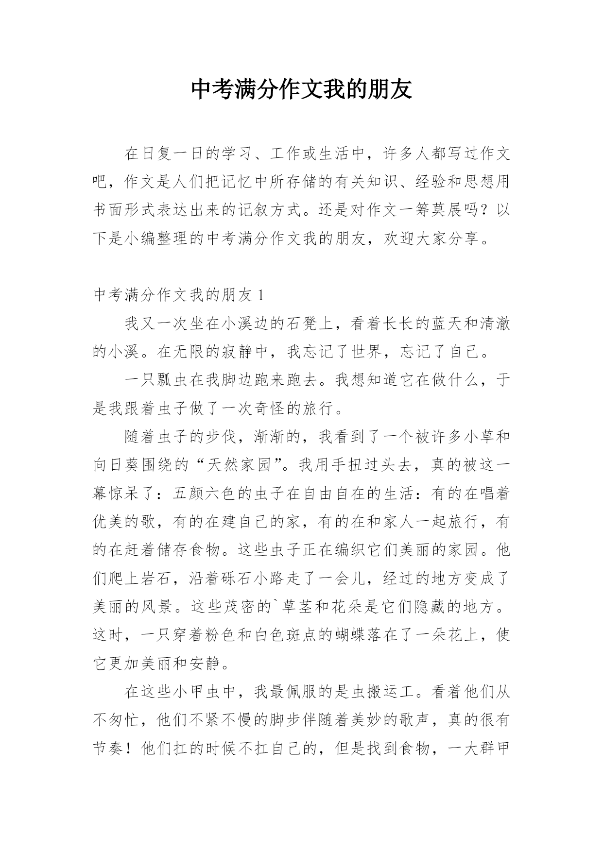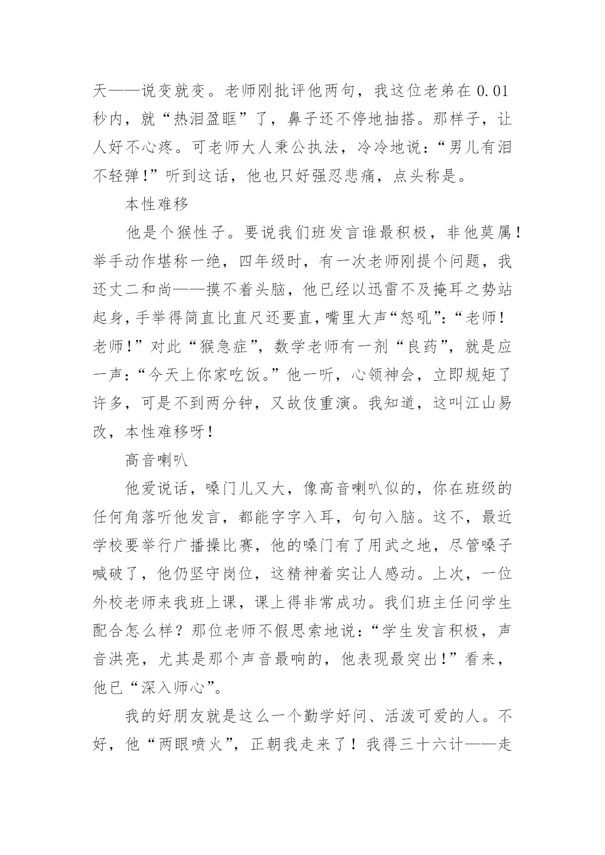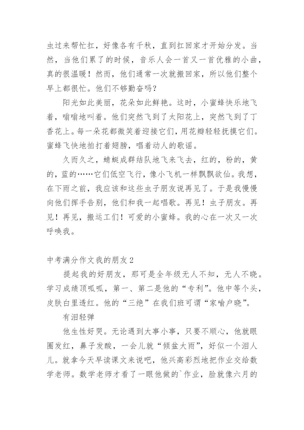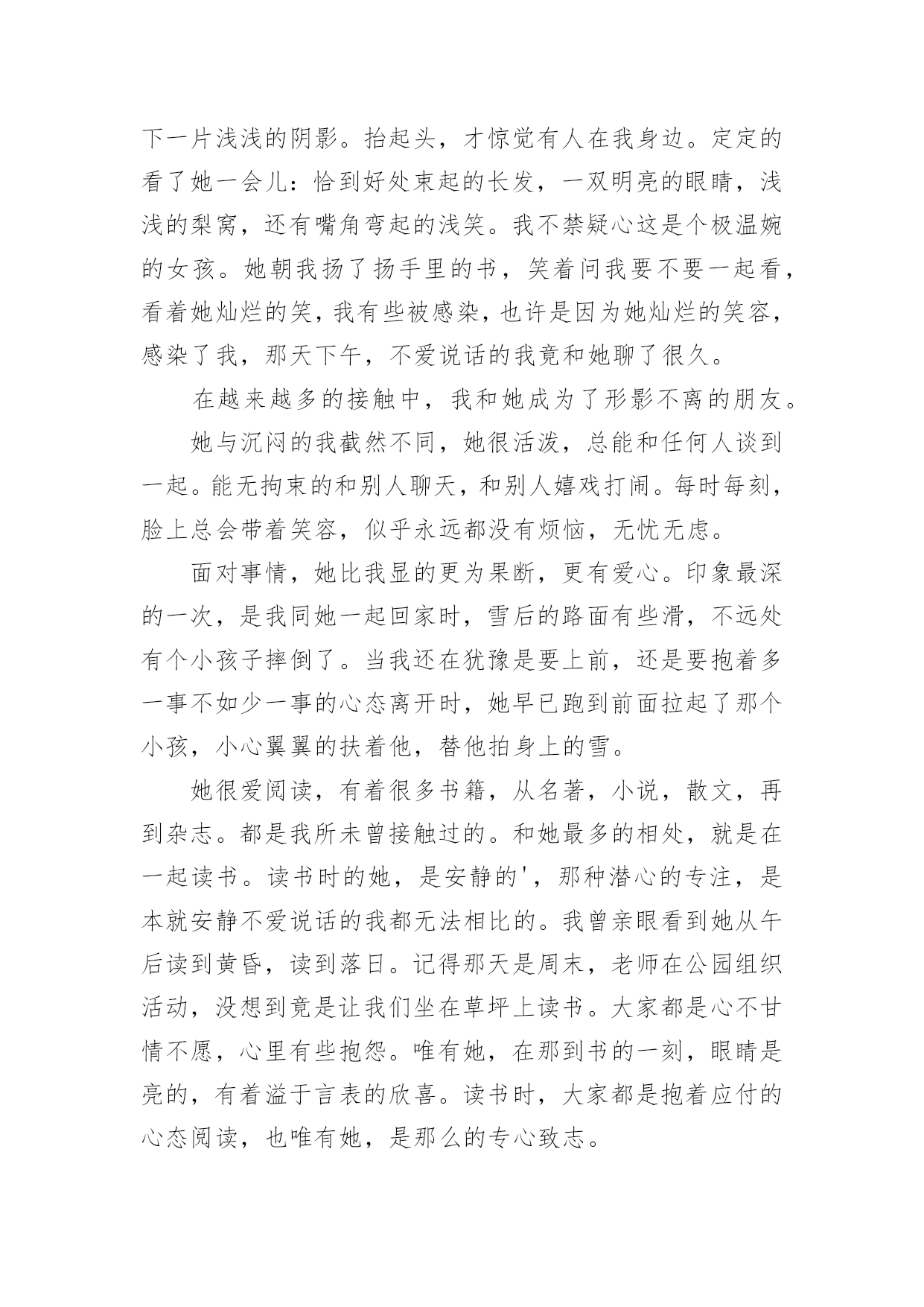 中考满分作文我的朋友在日复一日的学习、工作或生活中,许多人都写过作文吧,作文是人们把记忆中所存储的有关知识、经验和思想用书面形式表达出来的记叙方式。还是对作文一筹莫展吗?以下是小编整理的中考满分作文我的朋友,欢迎大家分享。中考满分作文我的朋友1我又一次坐在小溪边的石凳上,看着长长的蓝天和清澈的小溪。在无限的寂静中,我忘记了世界,忘记了自己。一只瓢虫在我脚边跑来跑去。我想知道它在做什么,于是我跟着虫子做了一次奇怪的旅行。随着虫子的步伐,渐渐的,我看到了一个被许多小草和向日葵围绕的“天然家园”。我用手扭过头去,真的被这一幕惊呆了:五颜六色的虫子在自由自在的生活:有的在唱着优美的歌,有的在建自己的家,有的在和家人一起旅行,有的在赶着储存食物。这些虫子正在编织它们美丽的家园。他们爬上岩石,沿着砾石小路走了一会儿,经过的地方变成了美丽的风景。这些茂密的`草茎和花朵是它们隐藏的地方。这时,一只穿着粉色和白色斑点的蝴蝶落在了一朵花上,使它更加美丽和安静。在这些小甲虫中,我最佩服的是虫搬运工。看着他们从不匆忙,他们不紧不慢的脚步伴随着美妙的歌声,真的很有节奏!他们扛的时候不扛自己的,但是找到食物,一大群甲虫过来帮忙扛,好像各有千秋,直到扛回家才开始分发。当然,当他们累了的时候,音乐人会一首又一首优雅的小曲,真的很温暖!然而,他们通常一次就搬回家,所以他们整个早上都很忙。他们不够勤奋吗?阳光如此美丽,花朵如此鲜艳。这时,小蜜蜂快乐地飞着,嗡嗡地叫着。他们突然飞到了太阳花上,突然飞到了丁香花上。每一朵花都微笑着迎接它们,用花瓣轻轻抚摸它们。蜜蜂飞快地拍打着翅膀,唱着动人的歌谣。久而久之,蜻蜓成群结队地飞来飞去,红的,粉的,黄的,蓝的……它们低空飞行,像小飞机一样飘飘欲仙。我想,在下雨之前,我应该和这些虫子朋友说再见了。于是我慢慢向他们挥手告别,他们和我一起唱歌。再见!虫子朋友。再见!再见,搬运工们!可爱的小蜜蜂。我的心在一次又一次呼唤我。中考满分作文我的朋友2提起我的好朋友,那可是全年级无人不知,无人不晓。学习成绩顶呱呱,第一、第二是他的“专利”。他中等个头,皮肤白里透红。他的“三绝”在我们班可谓“家喻户晓”。有泪轻弹他生性好哭。无论遇到大事小事,只要不顺心,他就眼圈发红,鼻子发酸,一会儿就“倾盆大雨”,好似一个泪人儿。就拿今天早读课文来说吧,他兴高彩烈地把作业交给数学老师。数学老师才看了一眼他做的`作业,脸就像六月的天——说变就变。老师刚批评他两句,我这位老弟在0.01秒内,就“热泪盈眶”了,鼻子还不停地抽搭。那样子,让人好不心疼。可老师大人秉公执法,冷冷地说:“男儿有泪不轻弹!”听到这话,他也只好强忍悲痛,点头称是。本性难移他是个猴性子。要说我们班发言谁最积极,非他莫属!举手动作堪称一绝,四年级时,有一次老师刚提个问题,我还丈二和尚——摸不着头脑,他已经以迅雷不及掩耳之势站起身,手举得简直比直尺还要直,嘴里大声“怒吼”:“老师!老师!”对此“猴急症”,数学老师有一剂“良药”,就是应一声:“今天上你家吃饭。”他一听,心领神会,立即规矩了许多,可是不到两分钟,又故伎重演。我知道,这叫江山易改,本性难移呀!高音喇叭他爱说话,嗓门儿又大,像高音喇叭似的,你在班级的任何角落听他发言,都能字字入耳,句句入脑。这不,最近学校要举行广播操比赛,他的嗓门有了用武之地,尽管嗓子喊破了,他仍坚守岗位,这精神着实让人感动。上次,一位外校老师来我班上课,课上得非常成功。我们班主任问学生配合怎么样?那位老师不假思索地说:“学生发言积极,声音洪亮,尤其是那个声音最响的,他表现最突出!”看来,他已“深入师心”。我的好朋友就是这么一个勤学好问、活泼可爱的人。不好,他“两眼喷火”,正朝我走来了!我得三十六计——走为上策!看我这木鱼脑袋,忘了告诉你们,他是我最要好的朋友——张皓。中考满分作文我的朋友3每个人的人生就像一本书,每本书都诉说着不一样的故事。书中有好事有坏事,有好人也有坏人,而我的人生中就有三个这样的女孩儿,让我的生活变得快乐、充实。王露琦,应该是我最常提起的一个人了。她不胖不瘦,个子很高,长的很清秀。学习的时候是一个文静的小女孩,但在玩耍的时候就判若两人了。她性格大大咧咧,我经常调侃她说你后面头发乱的都可以当鸡窝了,她却不在意的摆摆手说:乱就乱吧!。虽然她大大咧咧的,当正经起来的时候还是很聪明的。王露琦非常喜欢看一个动漫叫《名侦探柯南》,果然动漫看多了,分析事情时讲得有条有理,头头是道。她作文写得也很好,还在我们县的公众号上发布过呢!第二位就是我们的鱼蛋于昊啦!她很瘦却非常有力气,个子嘛,比我矮了那么一点,眼睛有点小,但是炯炯有神。这位也是一个喜欢动漫的孩子,喜欢看《我的英雄学院》,可能是喜欢动漫的缘故吧,她的画画非常好。经常把动漫里的人物刻画得栩栩如生,都可以和