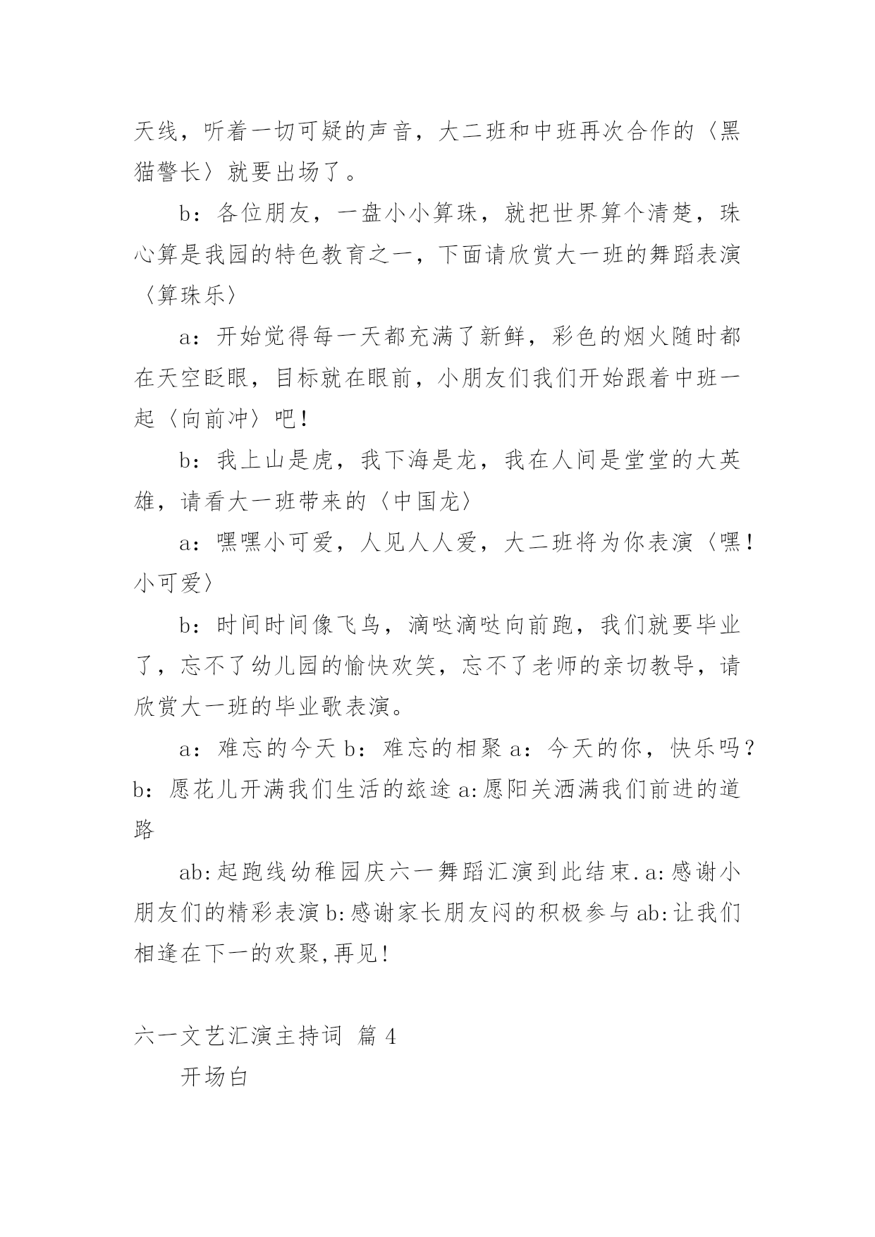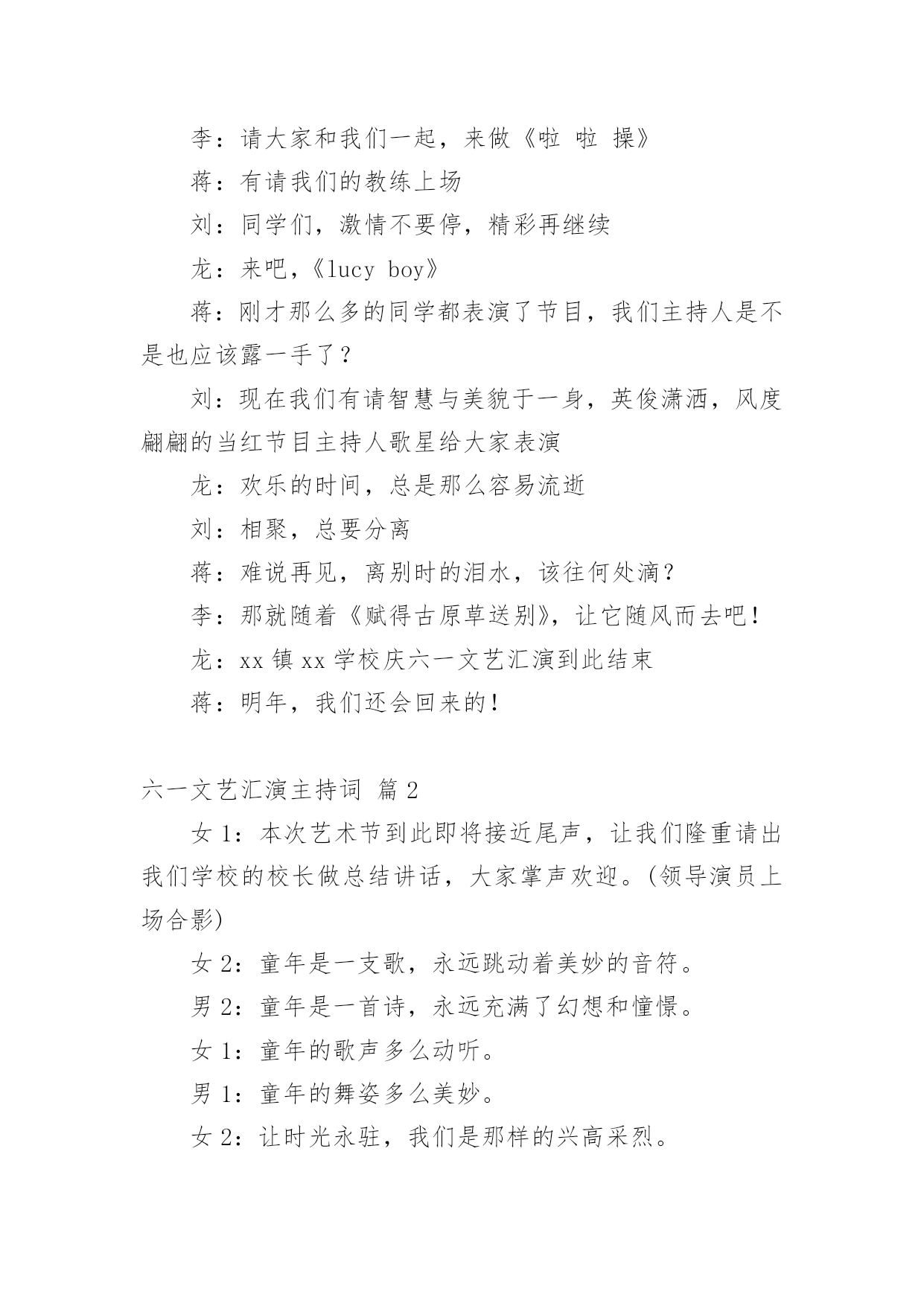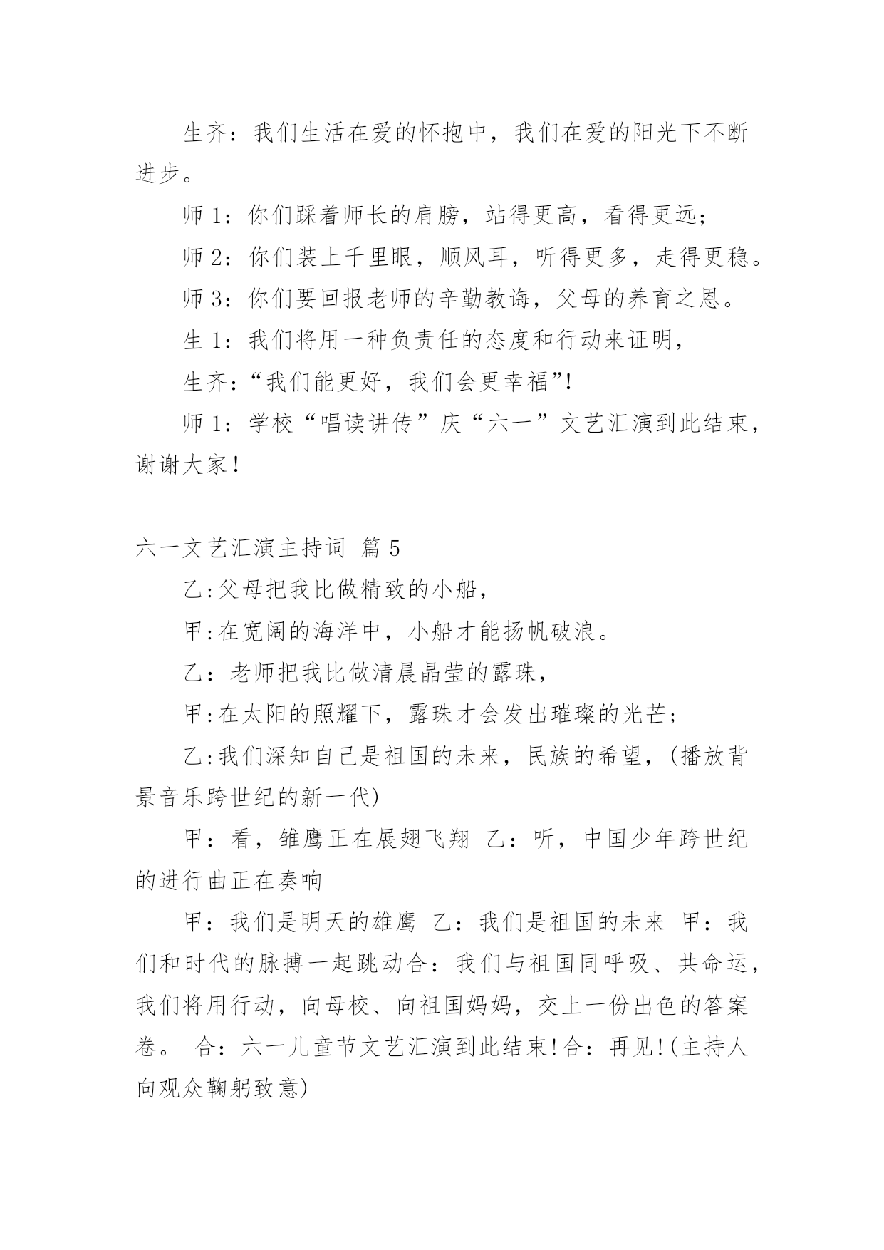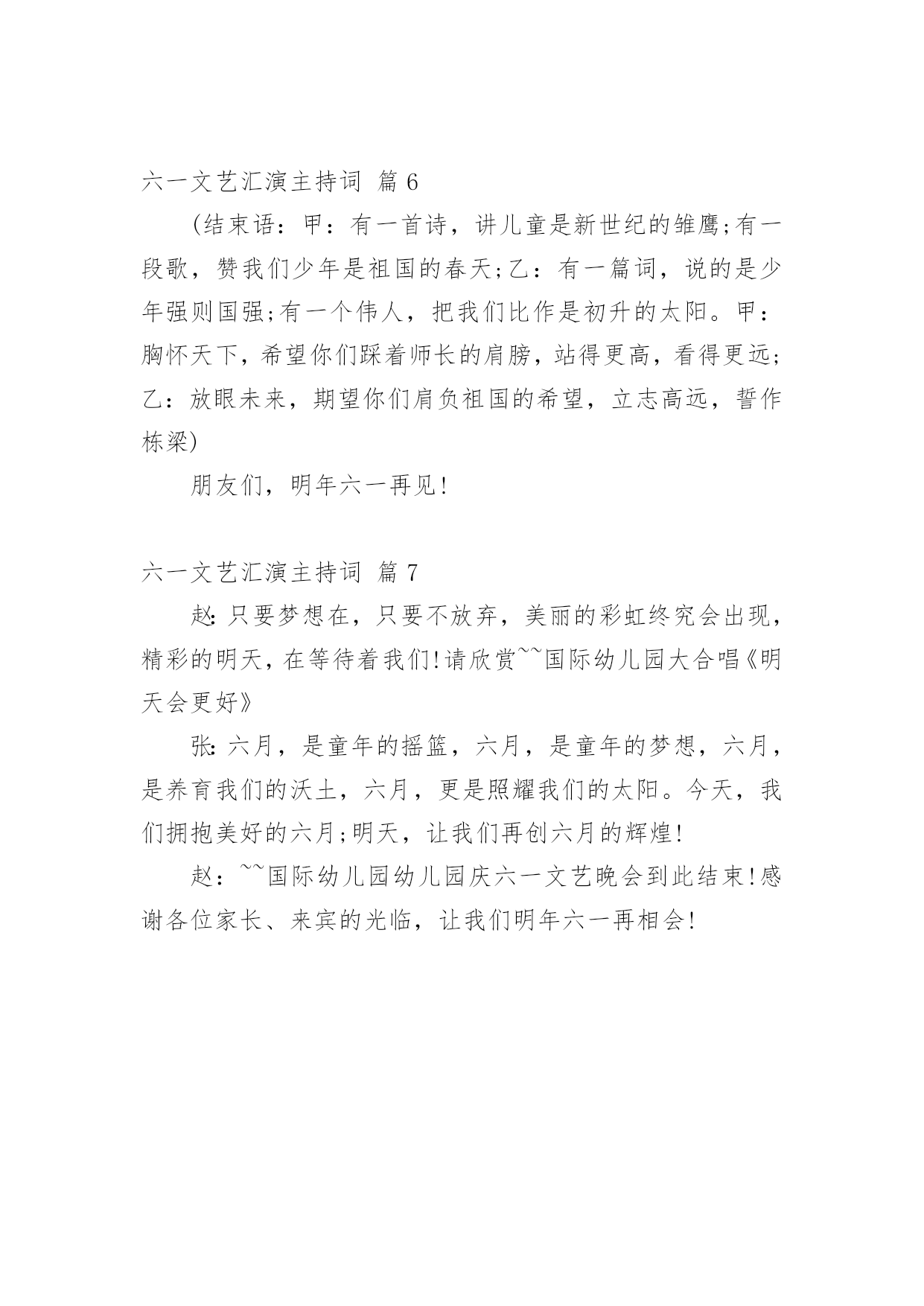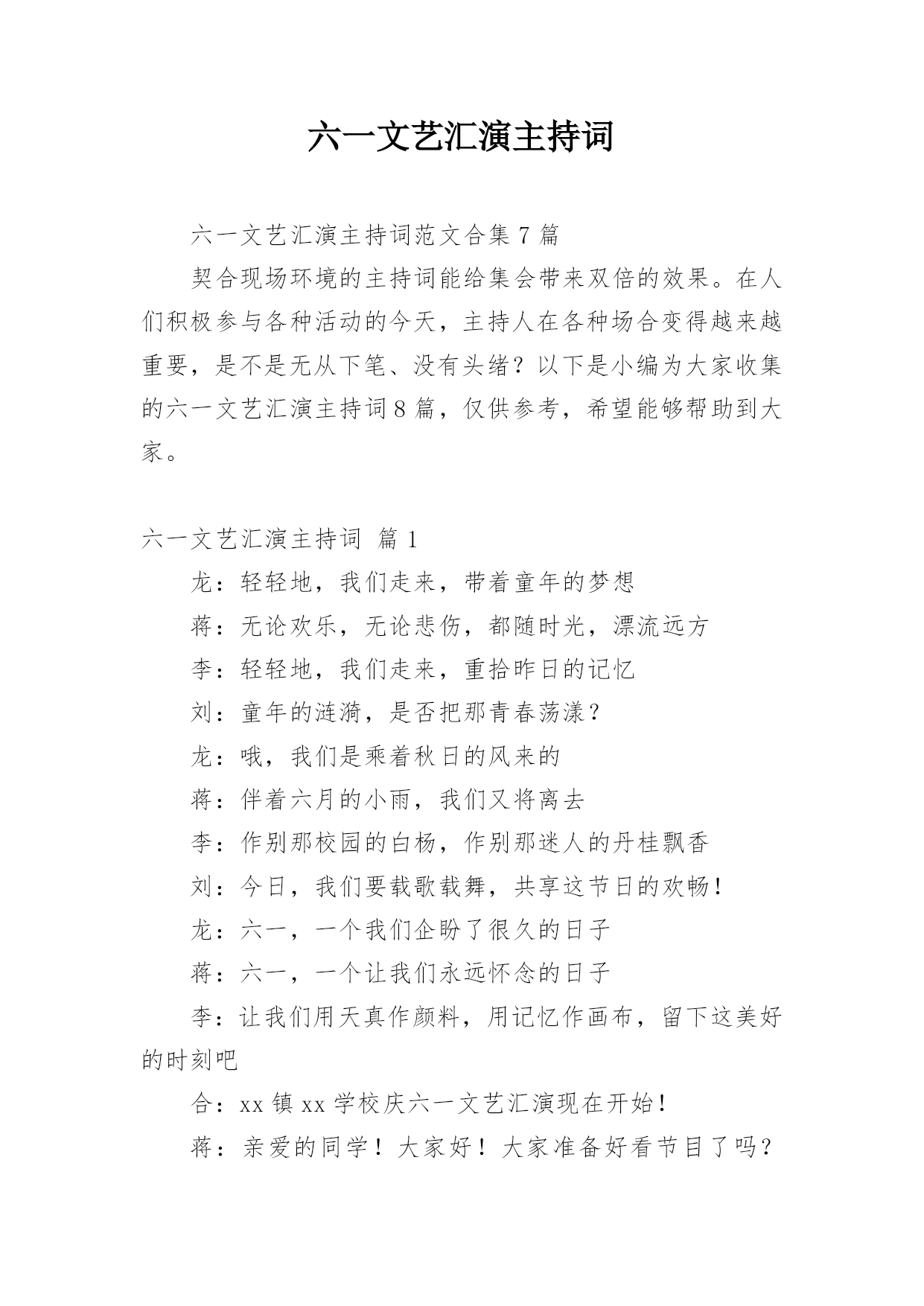 六一文艺汇演主持词六一文艺汇演主持词范文合集7篇契合现场环境的主持词能给集会带来双倍的效果。在人们积极参与各种活动的今天,主持人在各种场合变得越来越重要,是不是无从下笔、没有头绪?以下是小编为大家收集的六一文艺汇演主持词8篇,仅供参考,希望能够帮助到大家。六一文艺汇演主持词篇1龙:轻轻地,我们走来,带着童年的梦想蒋:无论欢乐,无论悲伤,都随时光,漂流远方李:轻轻地,我们走来,重拾昨日的记忆刘:童年的涟漪,是否把那青春荡漾?龙:哦,我们是乘着秋日的风来的蒋:伴着六月的小雨,我们又将离去李:作别那校园的白杨,作别那迷人的丹桂飘香刘:今日,我们要载歌载舞,共享这节日的欢畅!龙:六一,一个我们企盼了很久的日子蒋:六一,一个让我们永远怀念的日子李:让我们用天真作颜料,用记忆作画布,留下这美好的时刻吧合:xx镇xx学校庆六一文艺汇演现在开始!蒋:亲爱的同学!大家好!大家准备好看节目了吗?areyouready!好,下面就请大家一起,随着《青春与活力》动起来吧!龙:感受了青春与活力,现在大家也该休息休息,就让我们一起来静静聆听一组合唱歌曲。李:请大家欣赏合唱,《阿拉木汗》《乘着歌声的翅膀》刘:多么美妙的歌声,真令人陶醉呀蒋:是呀,当我学会了欣赏,就能感受更多美好的东西刘:对,感受美好,就是一种体验,一种快乐的感觉蒋:这种感觉,《快乐你懂得》刘:有请舞蹈《快乐你懂得》李:看完了集体表演的节目,现在该看什么了?蒋:那当然是个人秀了。李:谁呀?蒋:韩红!李:什么?大歌星韩红今天来到了我们学校?蒋:别急嘛,我话还没有说完。蒋:来得生安得乡亲们,现在请大家以热烈的掌声,欢迎,当红明星韩红——的模仿者卫妍上台,她给大家带来了《天路》李:请大家欣赏。龙:哇塞,好好听哟!刘:真想找她签个名!龙:好呀,我也想。可是我们在哪去找她呢?刘:嗯……这个好办,我们就在这个台上等不就行了。龙:好主意!她上来了一次,一定还会再来的,我们就来个《守株待兔》蒋:来得生安得乡亲们,我comeback李:唉,你的英语也太bad了,该好好学习学习蒋:我也想,可就是没有多大兴趣李:那我们就来听两首英文歌吧,你可以边听边学哟蒋:这还不错!李:请听英语小合唱!龙:听,充满动感与激情的音乐又响了起来刘:同学们,和我们一起动起来吧龙:因为我们《快乐崇拜》龙:下面请欣赏歌曲《山歌好比春江水》李:刚才我看见了一些会魔法的人,不过,她们一下又不见了蒋:你不知道,今天,我们的小魔仙也来了。李:她们在哪儿蒋:只要我一念咒语她们就会出来的。李:我才不信!蒋:不信,你瞧着,巴啦——巴啦——小魔仙!!龙:请把我的歌,带回你的家,请把你的微笑留下。刘:你这个歌真好听,叫什么名字?龙:美好新家园里的歌声与微笑!蒋:看了这么久的节目,又该活动活动一下了。李:请大家和我们一起,来做《啦啦操》蒋:有请我们的教练上场刘:同学们,激情不要停,精彩再继续龙:来吧,《lucyboy》蒋:刚才那么多的同学都表演了节目,我们主持人是不是也应该露一手了?刘:现在我们有请智慧与美貌于一身,英俊潇洒,风度翩翩的当红节目主持人歌星给大家表演龙:欢乐的时间,总是那么容易流逝刘:相聚,总要分离蒋:难说再见,离别时的泪水,该往何处滴?李:那就随着《赋得古原草送别》,让它随风而去吧!龙:xx镇xx学校庆六一文艺汇演到此结束蒋:明年,我们还会回来的!六一文艺汇演主持词篇2女1:本次艺术节到此即将接近尾声,让我们隆重请出我们学校的校长做总结讲话,大家掌声欢迎。(领导演员上场合影)女2:童年是一支歌,永远跳动着美妙的音符。男2:童年是一首诗,永远充满了幻想和憧憬。女1:童年的歌声多么动听。男1:童年的舞姿多么美妙。女2:让时光永驻,我们是那样的兴高采烈。男2:让时光永驻,我们是那样的依依不舍。女1:孩子们,虽然你们的歌声还不够嘹亮,但你们努力了,进步了。男1:孩子们,虽然你们的表演还很稚嫩,但你们勇敢了,自信了。女2:亲爱的爷爷奶奶、爸爸妈妈。男2:亲爱的老师,小伙伴们。女1:感谢您们为我们付出的辛勤劳动!男1:感谢您们为我们共同庆祝这个美好的节日!女2:祝愿各位领导身体健康,工作顺利!男2:祝愿我们的老师事事顺心、永远年轻!女1:祝愿家长朋友们合家幸福,万事如意!男1:祝愿小朋友们茁壮成长,永远快乐!合:祝愿我们的学校明天更加辉煌!男1女1合:~~小学“追逐梦想童心绽放”第~届校园艺术节到此结束!合:再见!六一文艺汇演主持词篇3a:亲爱的小朋友们b:尊敬的家长朋友们!ab:大家上午好!a:感谢大家能从百忙之中抽空来参加我们的六一文艺汇演b:下面起跑线幼稚园庆六一文艺汇演正式开始a:我们的祖国繁荣昌盛,我们的祖国繁花似锦,我们在祖国的怀抱中健康成长,下面请欣赏舞蹈〈恭喜祖国富起来〉表演者:起跑线幼稚园大一班。b:我有一只可爱的小狗,蹦蹦跳跳跟在