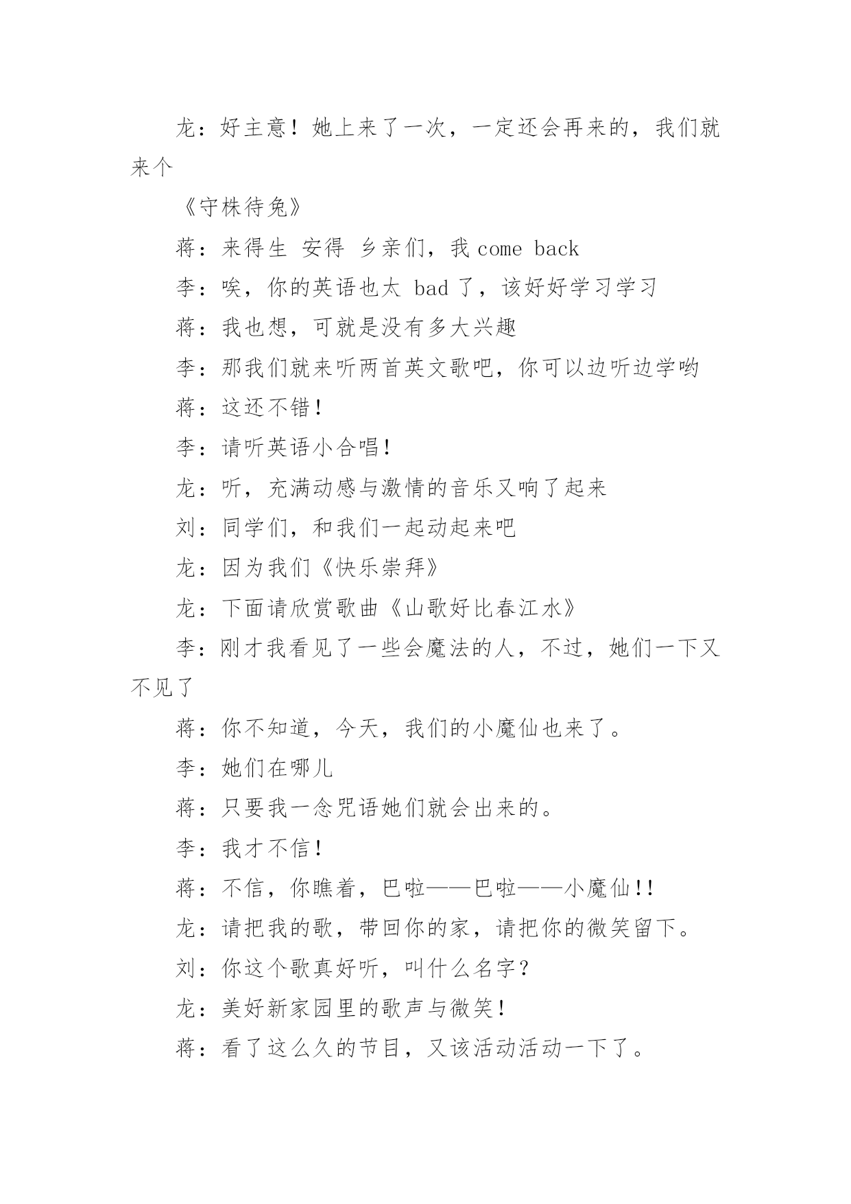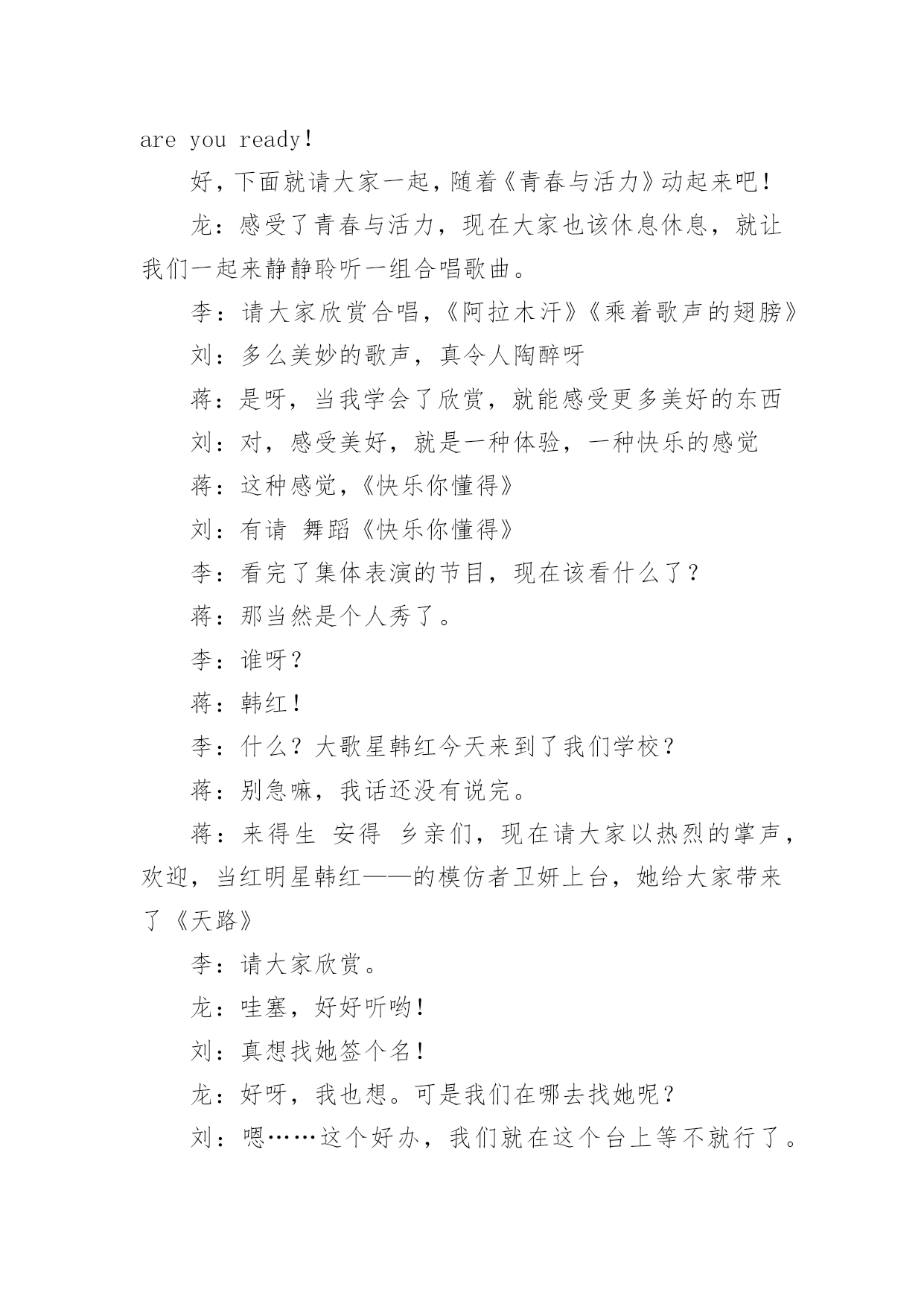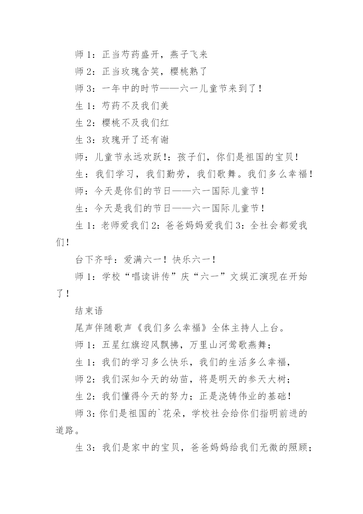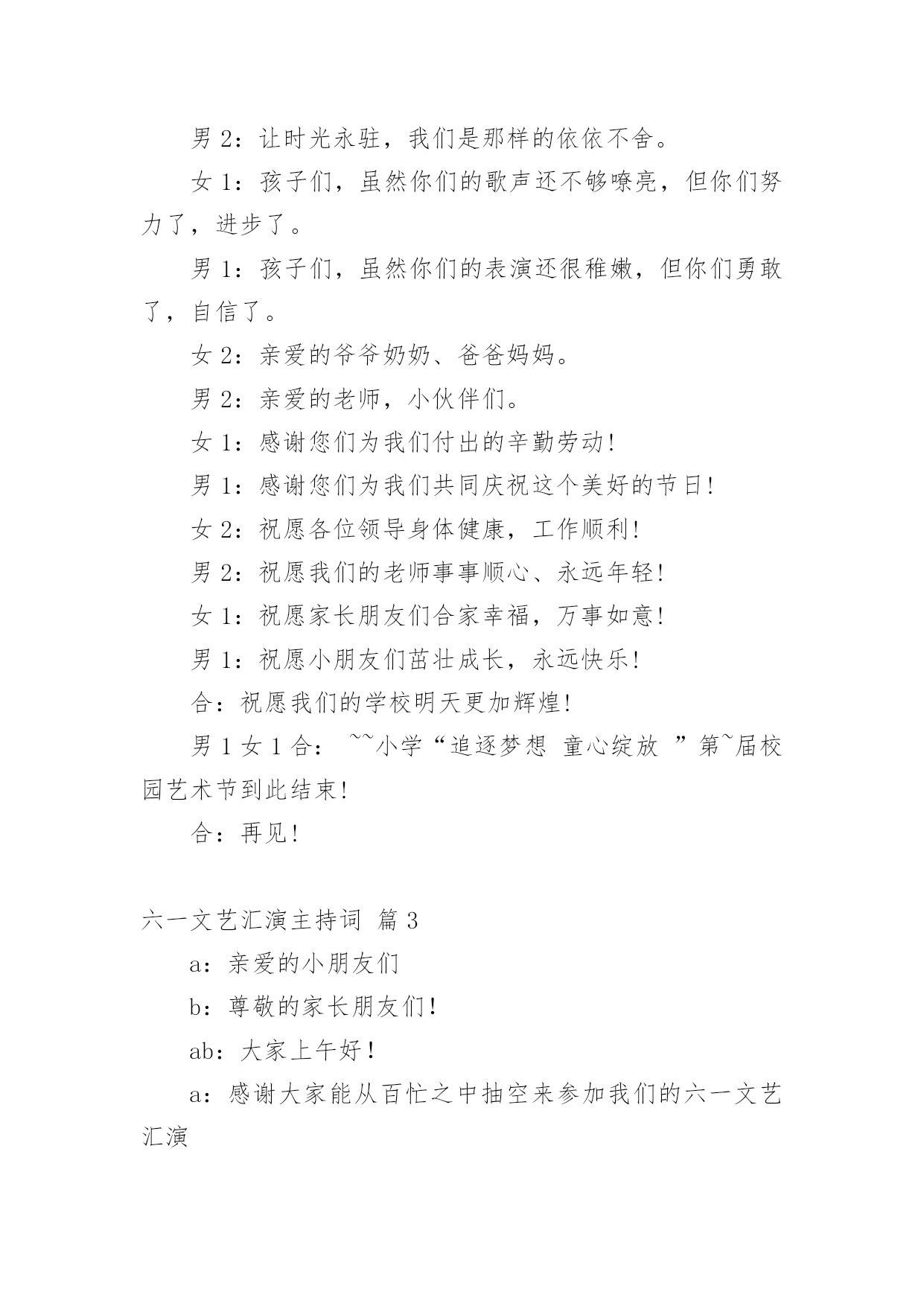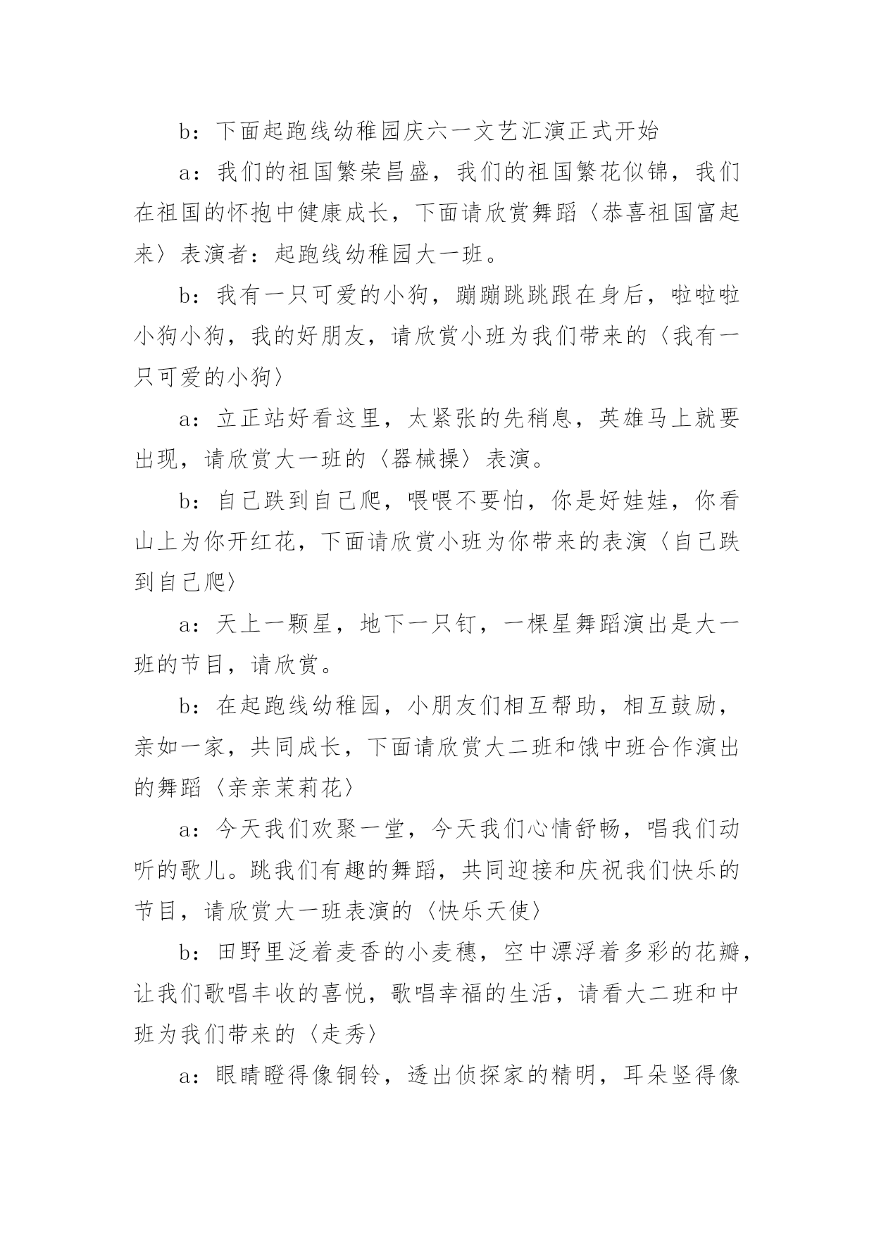 六一文艺汇演主持词六一文艺汇演主持词范文合集7篇契合现场环境的主持词能给集会带来双倍的效果。在人们积极参与各种活动的今天,主持人在各种场合变得越来越重要,是不是无从下笔、没有头绪?以下是小编为大家收集的六一文艺汇演主持词8篇,仅供参考,希望能够帮助到大家。六一文艺汇演主持词篇1龙:轻轻地,我们走来,带着童年的梦想蒋:无论欢乐,无论悲伤,都随时光,漂流远方李:轻轻地,我们走来,重拾昨日的记忆刘:童年的涟漪,是否把那青春荡漾?龙:哦,我们是乘着秋日的风来的蒋:伴着六月的小雨,我们又将离去李:作别那校园的白杨,作别那迷人的丹桂飘香刘:今日,我们要载歌载舞,共享这节日的欢畅!龙:六一,一个我们企盼了很久的日子蒋:六一,一个让我们永远怀念的日子李:让我们用天真作颜料,用记忆作画布,留下这美好的时刻吧合:xx镇xx学校庆六一文艺汇演现在开始!蒋:亲爱的同学!大家好!大家准备好看节目了吗?areyouready!好,下面就请大家一起,随着《青春与活力》动起来吧!龙:感受了青春与活力,现在大家也该休息休息,就让我们一起来静静聆听一组合唱歌曲。李:请大家欣赏合唱,《阿拉木汗》《乘着歌声的翅膀》刘:多么美妙的歌声,真令人陶醉呀蒋:是呀,当我学会了欣赏,就能感受更多美好的东西刘:对,感受美好,就是一种体验,一种快乐的感觉蒋:这种感觉,《快乐你懂得》刘:有请舞蹈《快乐你懂得》李:看完了集体表演的节目,现在该看什么了?蒋:那当然是个人秀了。李:谁呀?蒋:韩红!李:什么?大歌星韩红今天来到了我们学校?蒋:别急嘛,我话还没有说完。蒋:来得生安得乡亲们,现在请大家以热烈的掌声,欢迎,当红明星韩红——的模仿者卫妍上台,她给大家带来了《天路》李:请大家欣赏。龙:哇塞,好好听哟!刘:真想找她签个名!龙:好呀,我也想。可是我们在哪去找她呢?刘:嗯……这个好办,我们就在这个台上等不就行了。龙:好主意!她上来了一次,一定还会再来的,我们就来个《守株待兔》蒋:来得生安得乡亲们,我comeback李:唉,你的英语也太bad了,该好好学习学习蒋:我也想,可就是没有多大兴趣李:那我们就来听两首英文歌吧,你可以边听边学哟蒋:这还不错!李:请听英语小合唱!龙:听,充满动感与激情的音乐又响了起来刘:同学们,和我们一起动起来吧龙:因为我们《快乐崇拜》龙:下面请欣赏歌曲《山歌好比春江水》李:刚才我看见了一些会魔法的人,不过,她们一下又不见了蒋:你不知道,今天,我们的小魔仙也来了。李:她们在哪儿蒋:只要我一念咒语她们就会出来的。李:我才不信!蒋:不信,你瞧着,巴啦——巴啦——小魔仙!!龙:请把我的歌,带回你的家,请把你的微笑留下。刘:你这个歌真好听,叫什么名字?龙:美好新家园里的歌声与微笑!蒋:看了这么久的节目,又该活动活动一下了。李:请大家和我们一起,来做《啦啦操》蒋:有请我们的教练上场刘:同学们,激情不要停,精彩再继续龙:来吧,《lucyboy》蒋:刚才那么多的同学都表演了节目,我们主持人是不是也应该露一手了?刘:现在我们有请智慧与美貌于一身,英俊潇洒,风度翩翩的当红节目主持人歌星给大家表演龙:欢乐的时间,总是那么容易流逝刘:相聚,总要分离蒋:难说再见,离别时的泪水,该往何处滴?李:那就随着《赋得古原草送别》,让它随风而去吧!龙:xx镇xx学校庆六一文艺汇演到此结束蒋:明年,我们还会回来的!六一文艺汇演主持词篇2女1:本次艺术节到此即将接近尾声,让我们隆重请出我们学校的校长做总结讲话,大家掌声欢迎。(领导演员上场合影)女2:童年是一支歌,永远跳动着美妙的音符。男2:童年是一首诗,永远充满了幻想和憧憬。女1:童年的歌声多么动听。男1:童年的舞姿多么美妙。女2:让时光永驻,我们是那样的兴高采烈。男2:让时光永驻,我们是那样的依依不舍。女1:孩子们,虽然你们的歌声还不够嘹亮,但你们努力了,进步了。男1:孩子们,虽然你们的表演还很稚嫩,但你们勇敢了,自信了。女2:亲爱的爷爷奶奶、爸爸妈妈。男2:亲爱的老师,小伙伴们。女1:感谢您们为我们付出的辛勤劳动!男1:感谢您们为我们共同庆祝这个美好的节日!女2:祝愿各位领导身体健康,工作顺利!男2:祝愿我们的老师事事顺心、永远年轻!女1:祝愿家长朋友们合家幸福,万事如意!男1:祝愿小朋友们茁壮成长,永远快乐!合:祝愿我们的学校明天更加辉煌!男1女1合:~~小学“追逐梦想童心绽放”第~届校园艺术节到此结束!合:再见!六一文艺汇演主持词篇3a:亲爱的小朋友们b:尊敬的家长朋友们!ab:大家上午好!a:感谢大家能从百忙之中抽空来参加我们的六一文艺汇演b:下面起跑线幼稚园庆六一文艺汇演正式开始a:我们的祖国繁荣昌盛,我们的祖国繁花似锦,我们在祖国的怀抱中健康成长,下面请欣赏舞蹈〈恭喜祖国富起来〉表演者:起跑线幼稚园大一班。b:我有一只可爱的小狗,蹦蹦跳跳跟在