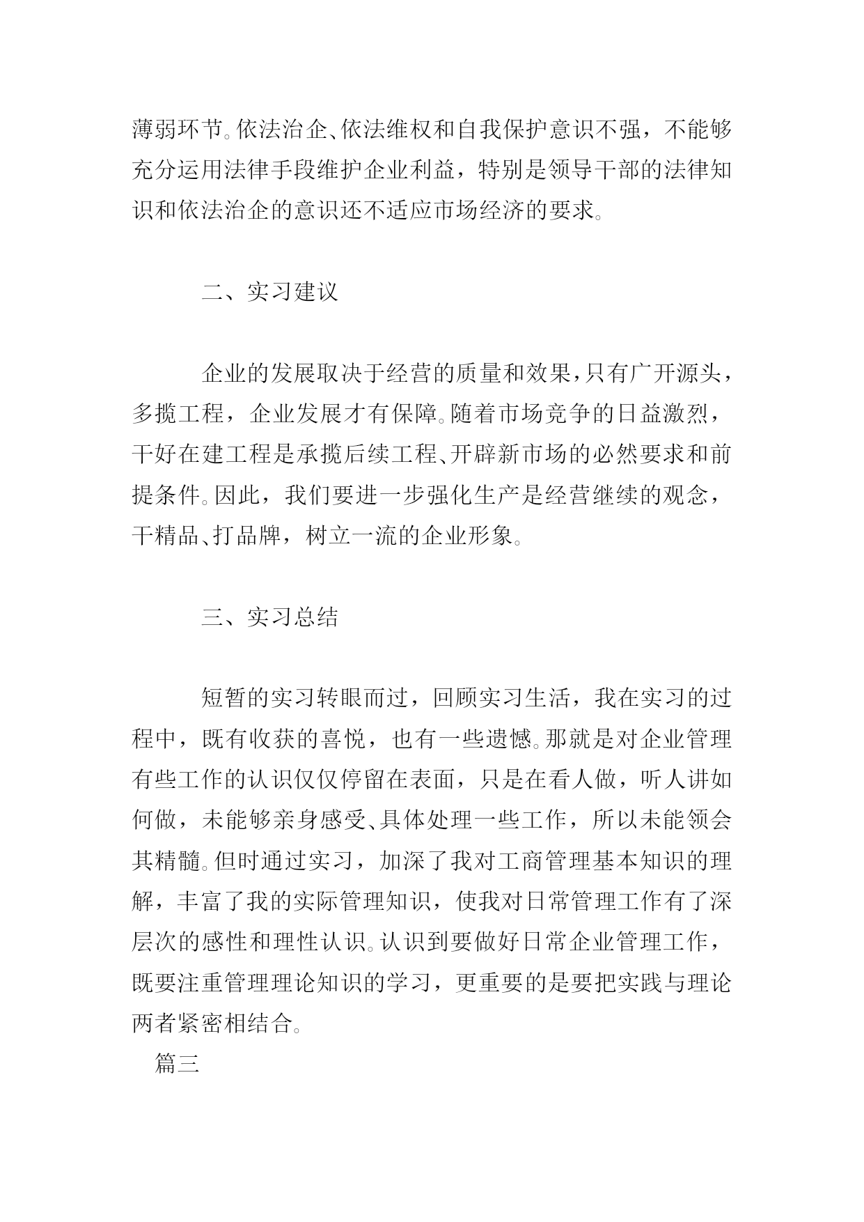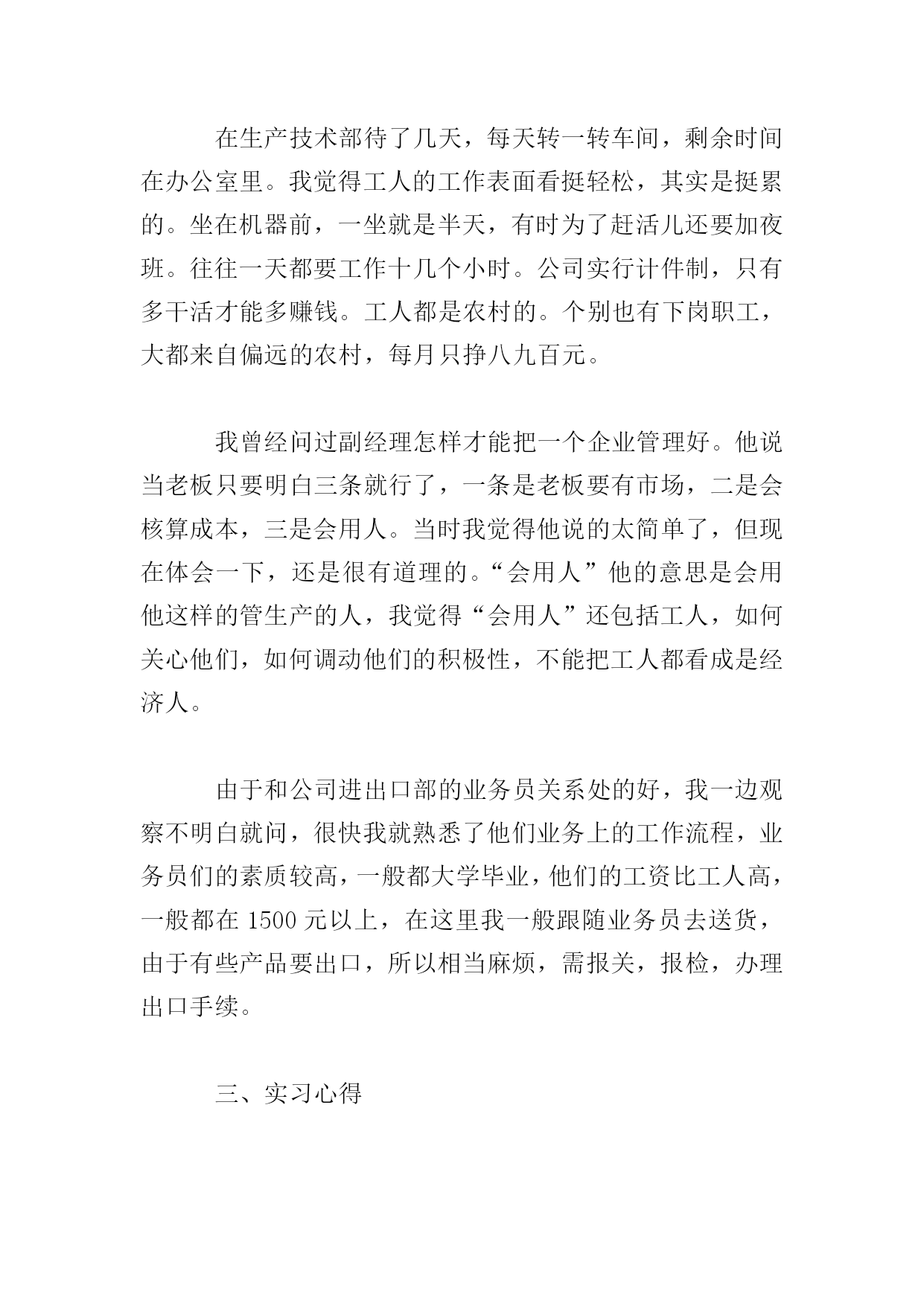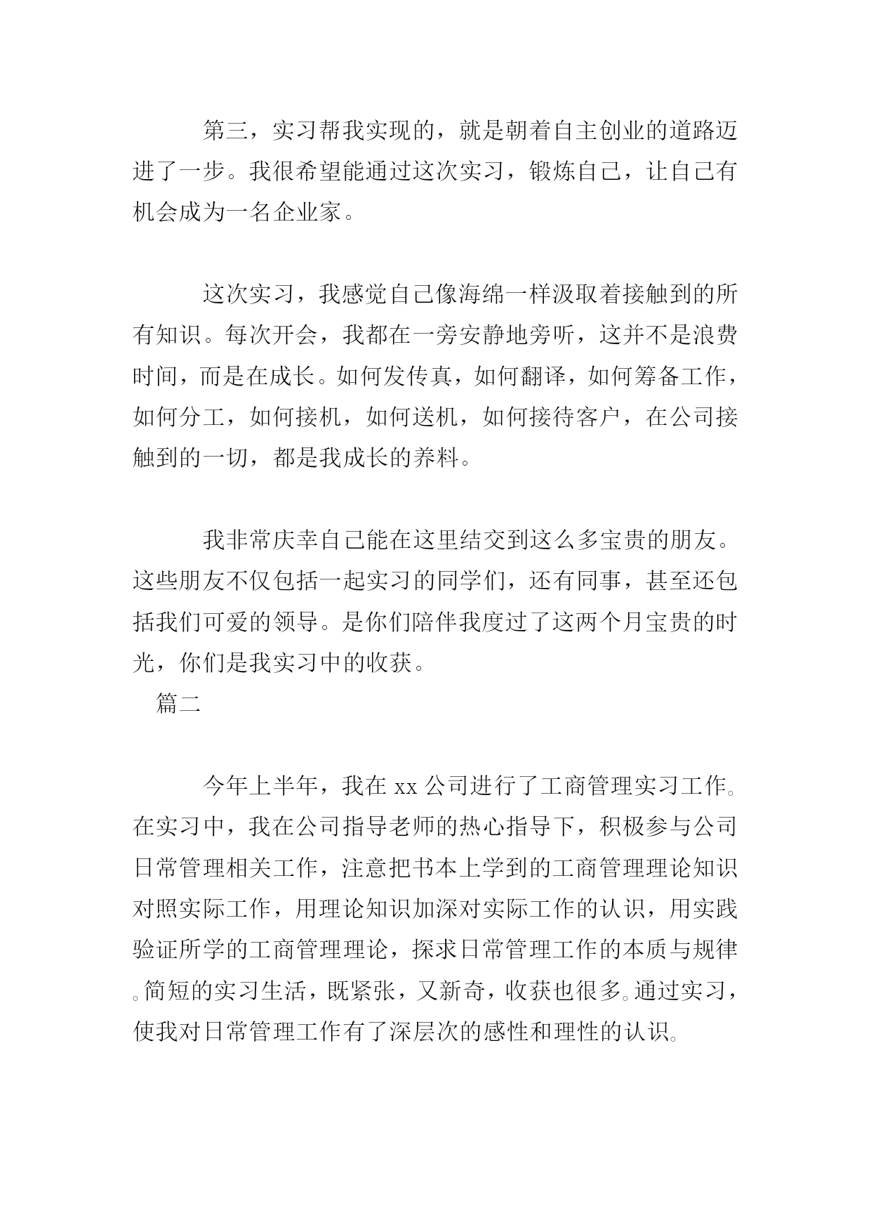 工商管理实习报告三篇篇一为了真正做到理论和实践相结合,也为了能更详细地了解工商管理这一专业的真正内涵,通过对企业实际的调查、研究,熟悉外贸实务的具体操作程序,增强感性认识,初步培养学生理论联系实际的能力和分析问题与解决问题的能力。真正做到融会贯通,切实达到实习的目的。我在xx公司进行实习。实习期间,我的岗位是管理培训生。我了解到了这个岗位的职责,工作内容,并参与策划了公司的各项活动,并提出了自己的想法。根据相关的各种贸易法律与惯例,结合实际情况,以贸易的基本过程为主线,针对贸易中业务函电的草拟、商品价格的核算、交易条件的磋商、买卖合同的签订、出口货物的托运订舱、报验、信用证的审核与修改以及贸易文件制作和审核等主要业务操作技能。在此期间,我进一步学习了公司管理、物流、营销等方面的知识,对企业经营有了深层次的感性与理性的认识。我的工作得到了实习单位充分的肯定和较好的评价。现将主要实习情况报告如下:一、公司概况在通过一个简单而严肃的面试后我来到了xx公司实习。xx公司规模并不大,但是个麻雀虽小,五脏俱全的公司。很早就听别人说,学会干服装,做什么外贸都没有问题。服装做起来真的非常复杂,需要涉及很多方面。所以,一旦我摸清了做服装的外贸流程,那么将来做其他外贸都是驾轻就熟的。二、实习过程今天是实习的第一天,经理带着我参观了整个公司,让我对公司的整体情况有了初步的了解。毕竟没有工作经验。所以我一进公司先被安排在办公室,给公司打文件,制表格。确实有些枯燥无味。一周后才被管生产的副经理带到生产技术部,并将生产流程逐一给我介绍了一遍。生产技术部有6个人各负其责。生产车间的设备全都是缝纫机、包缝机。一个车间约有100人,全是年轻女工,操作比较简单,缝纫机前有一塑料管,加工好的产品都推到前边的管中。车间里设备放置非常整齐,生产有序,都实现定置管理,工作环境非常好,卫生、整齐、明亮。工人都穿统一的工作服,带工作帽。在生产技术部待了几天,每天转一转车间,剩余时间在办公室里。我觉得工人的工作表面看挺轻松,其实是挺累的。坐在机器前,一坐就是半天,有时为了赶活儿还要加夜班。往往一天都要工作十几个小时。公司实行计件制,只有多干活才能多赚钱。工人都是农村的。个别也有下岗职工,大都来自偏远的农村,每月只挣八九百元。我曾经问过副经理怎样才能把一个企业管理好。他说当老板只要明白三条就行了,一条是老板要有市场,二是会核算成本,三是会用人。当时我觉得他说的太简单了,但现在体会一下,还是很有道理的。“会用人”他的意思是会用他这样的管生产的人,我觉得“会用人”还包括工人,如何关心他们,如何调动他们的积极性,不能把工人都看成是经济人。由于和公司进出口部的业务员关系处的好,我一边观察不明白就问,很快我就熟悉了他们业务上的工作流程,业务员们的素质较高,一般都大学毕业,他们的工资比工人高,一般都在1500元以上,在这里我一般跟随业务员去送货,由于有些产品要出口,所以相当麻烦,需报关,报检,办理出口手续。三、实习心得相信所有的实习生都和我一样,在实习结束的时候都会感叹时间逝去得如此之快。两个月的时间,说长不长,说短也不短。直到今天,第一步xx公司的记忆还是那么的清晰。或许,短短两个月的历练,别人还无法从我身上感受到我的成长,但是我自己深知自己得到了什么。和面试那天的侃侃而谈相比,实习的第一天用“怯懦、胆小”来形容是再确切不过了。记得刚进xx公司的那天,因为是新人,没有什么事情能帮得上手,所以坐在座位上的我只好对着一本公司报表发呆。小心翼翼地向旁边的同事询问有无事务可帮忙。看着大家忙得不亦乐乎,坐在办公室最前面的我像一只可怜的刺猬似的缩着,希望有人来接近,但又害怕接近别人。可能这正是大学生刚刚接触社会,接触工作时的状况吧。不知道其他各位实习生的实习生活是怎么开始的,我的实习生活就在这样战战兢兢的状态下拉开了序幕。刚进公司,感受最深的一句话就是:事情办不好,无外乎两个原因,一个是能力不够,一个是责任心不强。自己的思想,而是我在实习期间所见识到的各种各样让我受益良多的思想。在实习期间,我参加了不少的会议。我以前曾经觉得,这种小公司里面的会议,应该都是比较沉闷的,老板一手遮天。可是事实却完全相反。在我旁听过的所有会议中,热烈的讨论比比皆是。例如就公司生产排程的问题,几乎每个人都会提出自己的意见,说出自己的看法,集思广益,敲定最后的计划。相对这些大的方面,在平常的工作中许多新鲜的想法也让我受益良多。例如请客户就餐的问题,在这之前,我自己能想到的问题无非就是餐桌上菜式要多,菜式不能重复等问题,而完全不能像前辈一样考虑到某些地方的客户有不同生活习惯的问题。他们对自己的工作乃至生活态