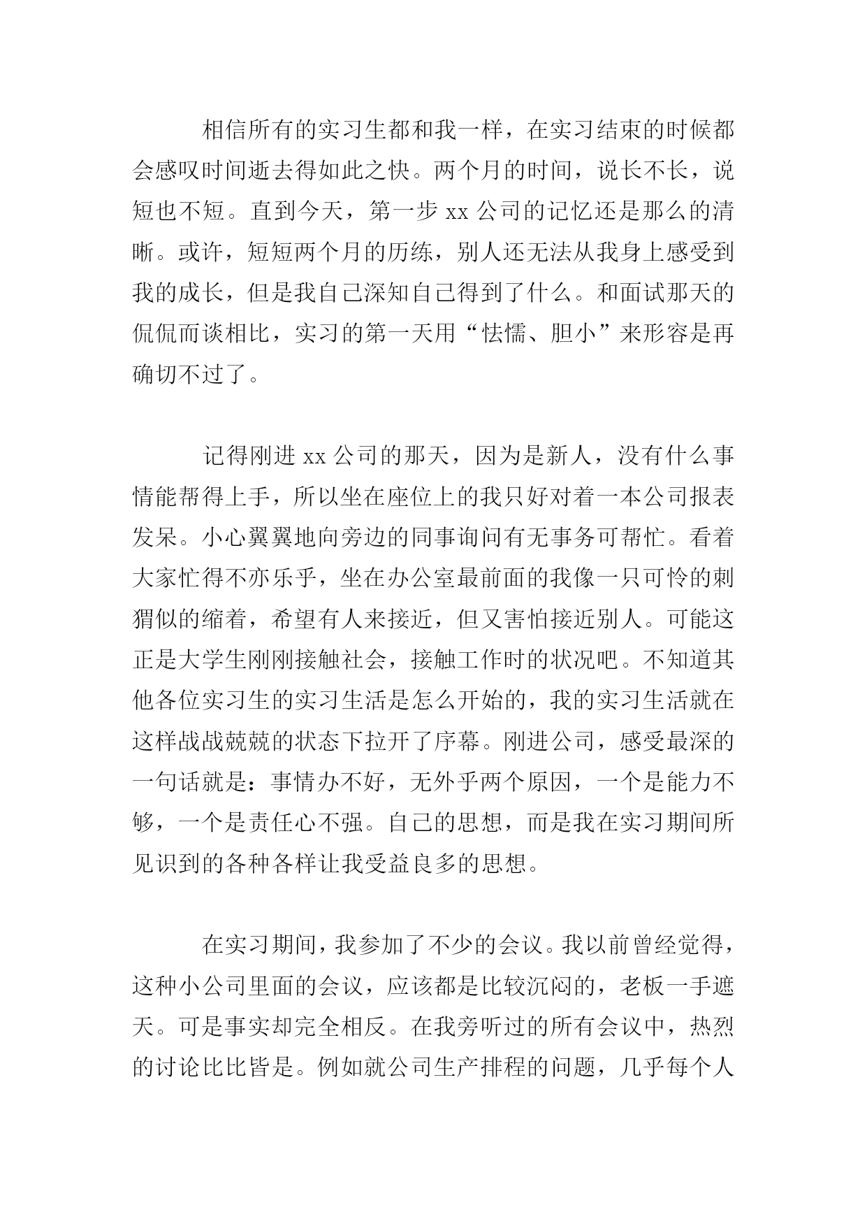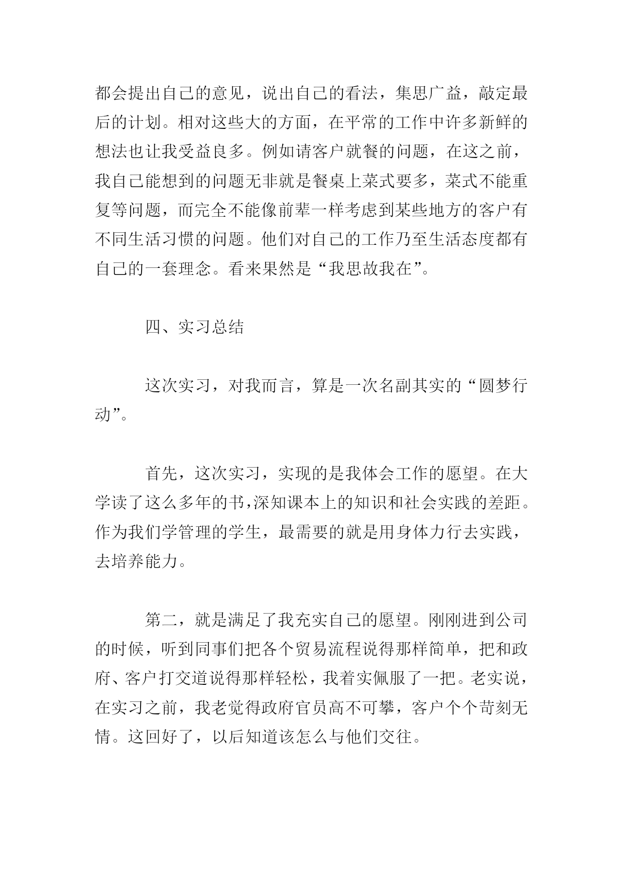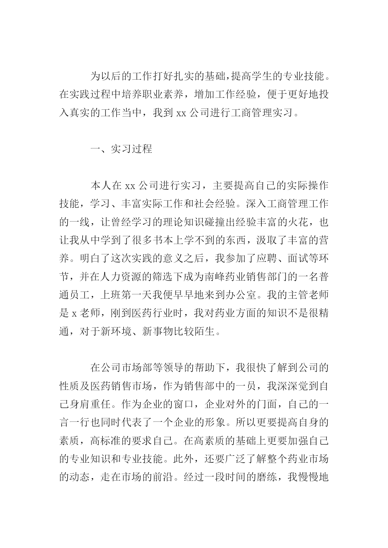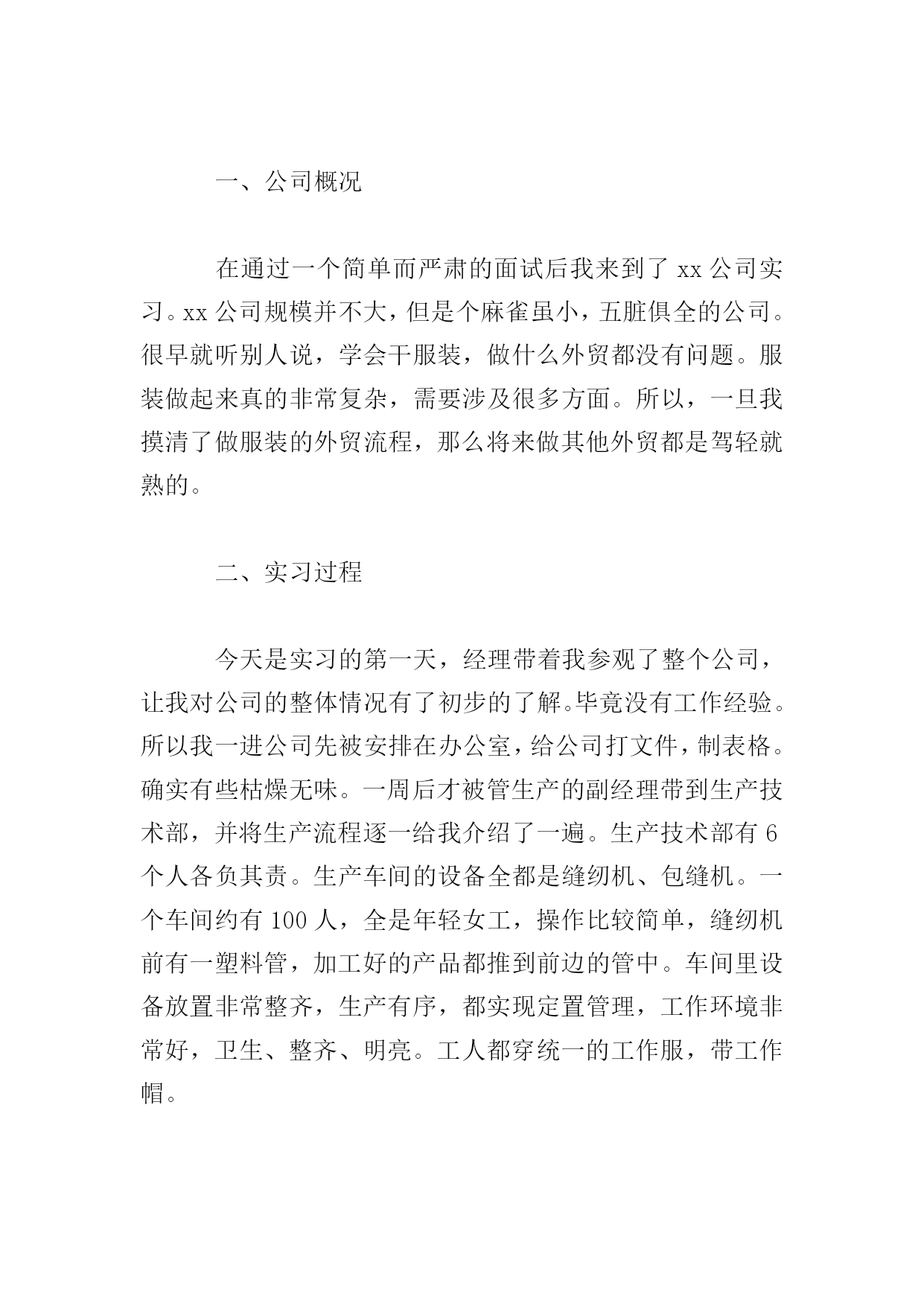 工商管理实习报告三篇篇一为了真正做到理论和实践相结合,也为了能更详细地了解工商管理这一专业的真正内涵,通过对企业实际的调查、研究,熟悉外贸实务的具体操作程序,增强感性认识,初步培养学生理论联系实际的能力和分析问题与解决问题的能力。真正做到融会贯通,切实达到实习的目的。我在xx公司进行实习。实习期间,我的岗位是管理培训生。我了解到了这个岗位的职责,工作内容,并参与策划了公司的各项活动,并提出了自己的想法。根据相关的各种贸易法律与惯例,结合实际情况,以贸易的基本过程为主线,针对贸易中业务函电的草拟、商品价格的核算、交易条件的磋商、买卖合同的签订、出口货物的托运订舱、报验、信用证的审核与修改以及贸易文件制作和审核等主要业务操作技能。在此期间,我进一步学习了公司管理、物流、营销等方面的知识,对企业经营有了深层次的感性与理性的认识。我的工作得到了实习单位充分的肯定和较好的评价。现将主要实习情况报告如下:一、公司概况在通过一个简单而严肃的面试后我来到了xx公司实习。xx公司规模并不大,但是个麻雀虽小,五脏俱全的公司。很早就听别人说,学会干服装,做什么外贸都没有问题。服装做起来真的非常复杂,需要涉及很多方面。所以,一旦我摸清了做服装的外贸流程,那么将来做其他外贸都是驾轻就熟的。二、实习过程今天是实习的第一天,经理带着我参观了整个公司,让我对公司的整体情况有了初步的了解。毕竟没有工作经验。所以我一进公司先被安排在办公室,给公司打文件,制表格。确实有些枯燥无味。一周后才被管生产的副经理带到生产技术部,并将生产流程逐一给我介绍了一遍。生产技术部有6个人各负其责。生产车间的设备全都是缝纫机、包缝机。一个车间约有100人,全是年轻女工,操作比较简单,缝纫机前有一塑料管,加工好的产品都推到前边的管中。车间里设备放置非常整齐,生产有序,都实现定置管理,工作环境非常好,卫生、整齐、明亮。工人都穿统一的工作服,带工作帽。在生产技术部待了几天,每天转一转车间,剩余时间在办公室里。我觉得工人的工作表面看挺轻松,其实是挺累的。坐在机器前,一坐就是半天,有时为了赶活儿还要加夜班。往往一天都要工作十几个小时。公司实行计件制,只有多干活才能多赚钱。工人都是农村的。个别也有下岗职工,大都来自偏远的农村,每月只挣八九百元。我曾经问过副经理怎样才能把一个企业管理好。他说当老板只要明白三条就行了,一条是老板要有市场,二是会核算成本,三是会用人。当时我觉得他说的太简单了,但现在体会一下,还是很有道理的。“会用人”他的意思是会用他这样的管生产的人,我觉得“会用人”还包括工人,如何关心他们,如何调动他们的积极性,不能把工人都看成是经济人。由于和公司进出口部的业务员关系处的好,我一边观察不明白就问,很快我就熟悉了他们业务上的工作流程,业务员们的素质较高,一般都大学毕业,他们的工资比工人高,一般都在1500元以上,在这里我一般跟随业务员去送货,由于有些产品要出口,所以相当麻烦,需报关,报检,办理出口手续。三、实习心得相信所有的实习生都和我一样,在实习结束的时候都会感叹时间逝去得如此之快。两个月的时间,说长不长,说短也不短。直到今天,第一步xx公司的记忆还是那么的清晰。或许,短短两个月的历练,别人还无法从我身上感受到我的成长,但是我自己深知自己得到了什么。和面试那天的侃侃而谈相比,实习的第一天用“怯懦、胆小”来形容是再确切不过了。记得刚进xx公司的那天,因为是新人,没有什么事情能帮得上手,所以坐在座位上的我只好对着一本公司报表发呆。小心翼翼地向旁边的同事询问有无事务可帮忙。看着大家忙得不亦乐乎,坐在办公室最前面的我像一只可怜的刺猬似的缩着,希望有人来接近,但又害怕接近别人。可能这正是大学生刚刚接触社会,接触工作时的状况吧。不知道其他各位实习生的实习生活是怎么开始的,我的实习生活就在这样战战兢兢的状态下拉开了序幕。刚进公司,感受最深的一句话就是:事情办不好,无外乎两个原因,一个是能力不够,一个是责任心不强。自己的思想,而是我在实习期间所见识到的各种各样让我受益良多的思想。在实习期间,我参加了不少的会议。我以前曾经觉得,这种小公司里面的会议,应该都是比较沉闷的,老板一手遮天。可是事实却完全相反。在我旁听过的所有会议中,热烈的讨论比比皆是。例如就公司生产排程的问题,几乎每个人都会提出自己的意见,说出自己的看法,集思广益,敲定最后的计划。相对这些大的方面,在平常的工作中许多新鲜的想法也让我受益良多。例如请客户就餐的问题,在这之前,我自己能想到的问题无非就是餐桌上菜式要多,菜式不能重复等问题,而完全不能像前辈一样考虑到某些地方的客户有不同生活习惯的问题。他们对自己的工作乃至生活态