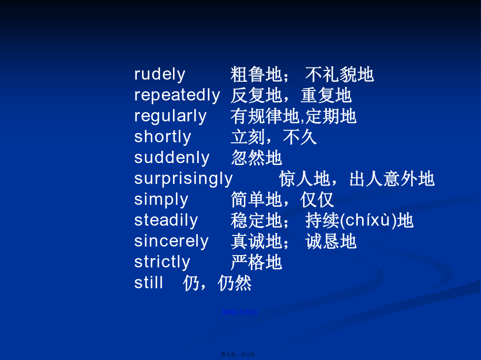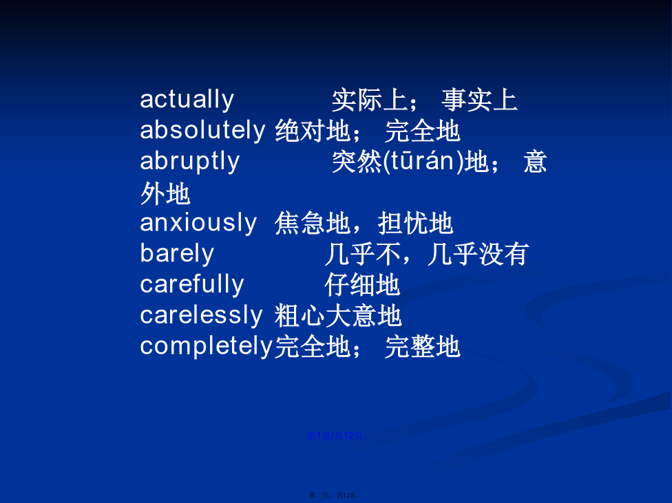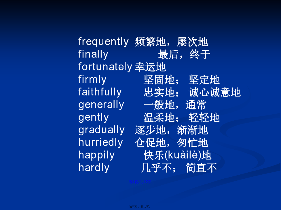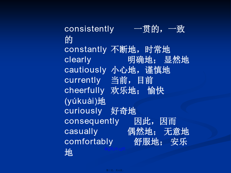 会计学actually实际上;事实上absolutely绝对地;完全地abruptly突然(tūrán)地;意外地anxiously焦急地,担忧地barely几乎不,几乎没有carefully仔细地carelessly粗心大意地completely完全地;完整地consistently一贯的,一致的constantly不断地,时常地clearly明确地;显然地cautiously小心地,谨慎地currently当前,目前cheerfully欢乐地;愉快(yúkuài)地curiously好奇地consequently因此,因而casually偶然地;无意地comfortably舒服地;安乐地desperately绝望地;不顾一切地directly直接(zhíjiē)地deeply深厚的;深深的definitely明确地;肯定地deliberately故意地;深思熟虑地embarrassedly尴尬地,局促不安地eventually终于,最后eagerly渴望地,热切地equally相等地;平等地exactly精确地;确切地especially特别;尤其frequently频繁地,屡次地finally最后,终于fortunately幸运地firmly坚固地;坚定地faithfully忠实地;诚心诚意地generally一般地,通常gently温柔地;轻轻地gradually逐步地,渐渐地hurriedly仓促地,匆忙地happily快乐(kuàilè)地hardly几乎不;简直不increasingly越来越多地;日益immediately立即,马上incidentally偶然地,不经意地instantly马上,立刻(lìkè)luckily幸运地later较晚地;后来merrily快乐地,愉快地merely仅仅,只不过meanwhile同时,其间mildly和善地;轻微地never从不,从来没有naturally自然地,顺理成章地necessarily必要地;必需地normally正常地;通常地obviously明显地occasionally偶尔;偶然particularly特别;异乎寻常(yìhūxúncháng)地parently明显地pitifully可怜地presently目前perfectly完美地;理想地punctually如期地,准时地properly适当地;恰当(qiàdàng)地personally亲自地;就个人而言patiently耐心地quickly迅速地quite相当,很;非常rarely很少地;罕有地relatively相对地;比较地really真,真正respectively各自地;分别地reluctantly不情愿地,勉强地rudely粗鲁地;不礼貌地repeatedly反复地,重复地regularly有规律地,定期地shortly立刻,不久suddenly忽然地surprisingly惊人地,出人意外地simply简单地,仅仅steadily稳定地;持续(chíxù)地sincerely真诚地;诚恳地strictly严格地still仍,仍然slightly轻微地,轻轻地surely无疑;确实successfully顺利地;成功地specially特别地;专门(zhuānmén)地smoothly流畅地;顺利地totally整个地,全部地unexpectedly未料到地,意外(yìwài)地unfortunately不幸地unluckily不幸地unbelievably难以置信地urgently紧急地,急迫地vividly生动地;逼真地widely广泛地;普遍地wisely聪明地;明智地wildly疯狂地;粗暴地Theend!Thankyou!