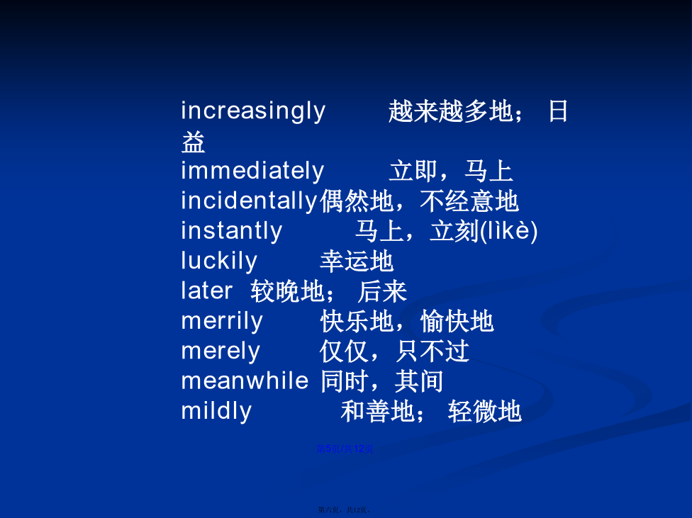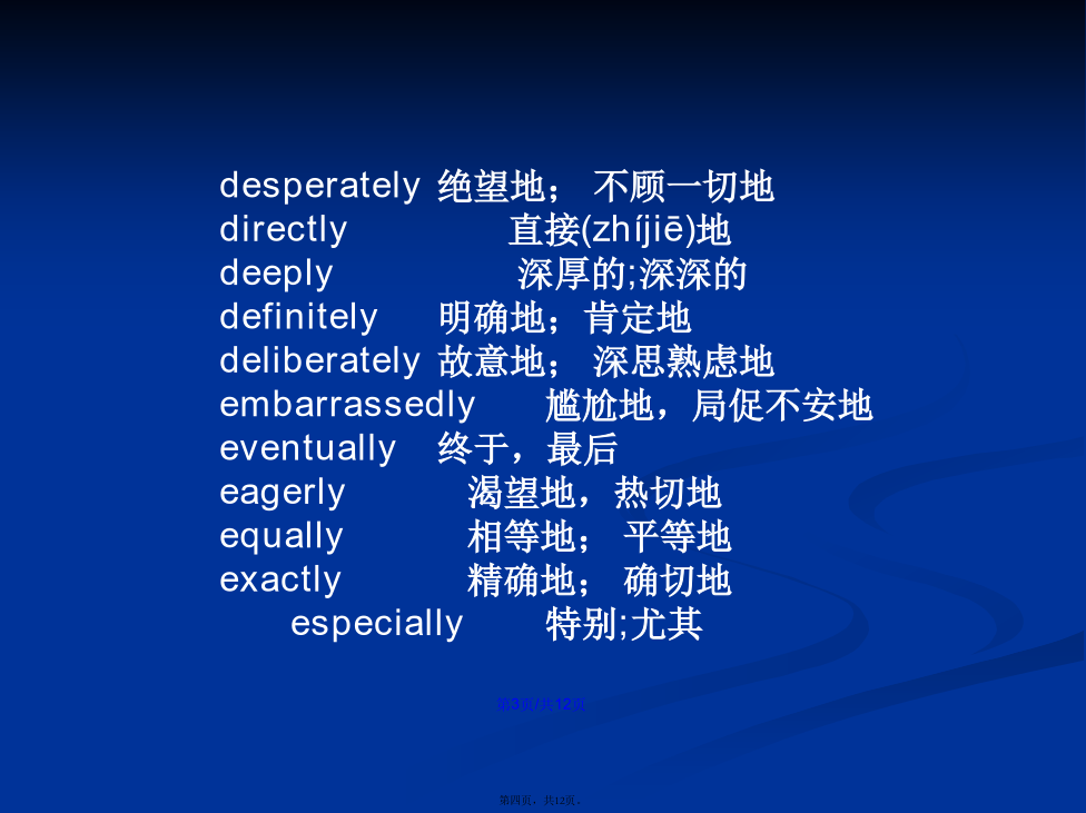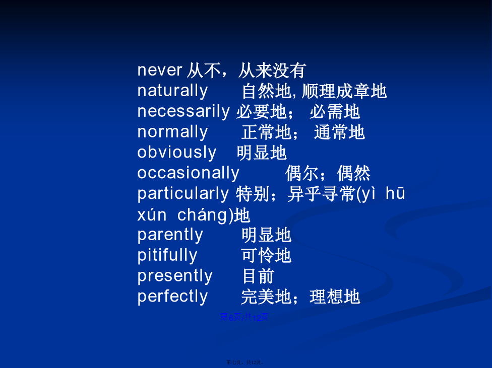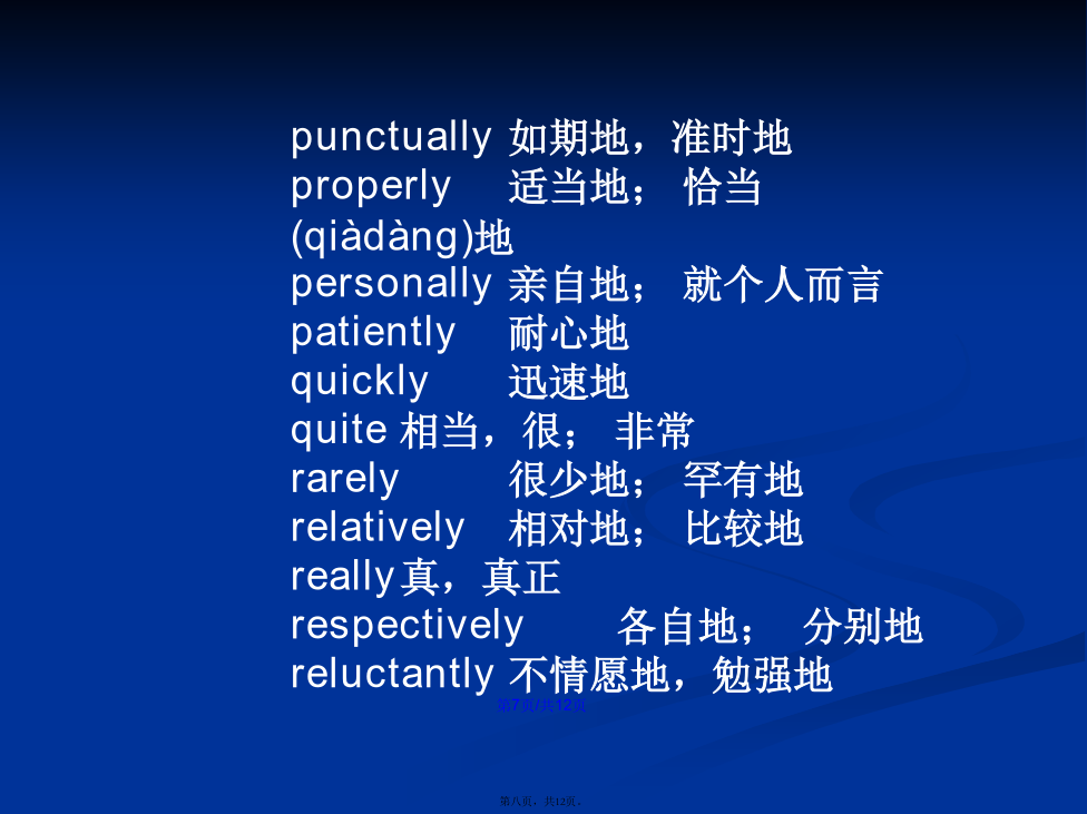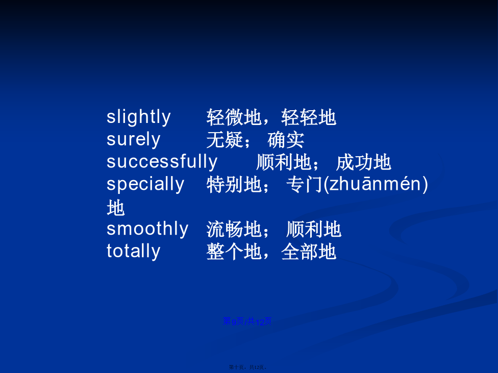 会计学actually实际上;事实上absolutely绝对地;完全地abruptly突然(tūrán)地;意外地anxiously焦急地,担忧地barely几乎不,几乎没有carefully仔细地carelessly粗心大意地completely完全地;完整地consistently一贯的,一致的constantly不断地,时常地clearly明确地;显然地cautiously小心地,谨慎地currently当前,目前cheerfully欢乐地;愉快(yúkuài)地curiously好奇地consequently因此,因而casually偶然地;无意地comfortably舒服地;安乐地desperately绝望地;不顾一切地directly直接(zhíjiē)地deeply深厚的;深深的definitely明确地;肯定地deliberately故意地;深思熟虑地embarrassedly尴尬地,局促不安地eventually终于,最后eagerly渴望地,热切地equally相等地;平等地exactly精确地;确切地especially特别;尤其frequently频繁地,屡次地finally最后,终于fortunately幸运地firmly坚固地;坚定地faithfully忠实地;诚心诚意地generally一般地,通常gently温柔地;轻轻地gradually逐步地,渐渐地hurriedly仓促地,匆忙地happily快乐(kuàilè)地hardly几乎不;简直不increasingly越来越多地;日益immediately立即,马上incidentally偶然地,不经意地instantly马上,立刻(lìkè)luckily幸运地later较晚地;后来merrily快乐地,愉快地merely仅仅,只不过meanwhile同时,其间mildly和善地;轻微地never从不,从来没有naturally自然地,顺理成章地necessarily必要地;必需地normally正常地;通常地obviously明显地occasionally偶尔;偶然particularly特别;异乎寻常(yìhūxúncháng)地parently明显地pitifully可怜地presently目前perfectly完美地;理想地punctually如期地,准时地properly适当地;恰当(qiàdàng)地personally亲自地;就个人而言patiently耐心地quickly迅速地quite相当,很;非常rarely很少地;罕有地relatively相对地;比较地really真,真正respectively各自地;分别地reluctantly不情愿地,勉强地rudely粗鲁地;不礼貌地repeatedly反复地,重复地regularly有规律地,定期地shortly立刻,不久suddenly忽然地surprisingly惊人地,出人意外地simply简单地,仅仅steadily稳定地;持续(chíxù)地sincerely真诚地;诚恳地strictly严格地still仍,仍然slightly轻微地,轻轻地surely无疑;确实successfully顺利地;成功地specially特别地;专门(zhuānmén)地smoothly流畅地;顺利地totally整个地,全部地unexpectedly未料到地,意外(yìwài)地unfortunately不幸地unluckily不幸地unbelievably难以置信地urgently紧急地,急迫地vividly生动地;逼真地widely广泛地;普遍地wisely聪明地;明智地wildly疯狂地;粗暴地Theend!Thankyou!