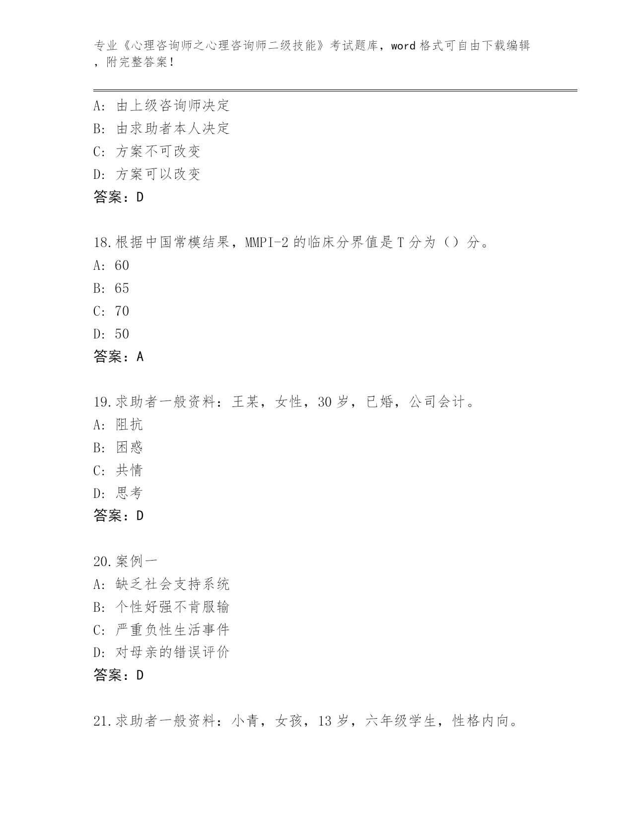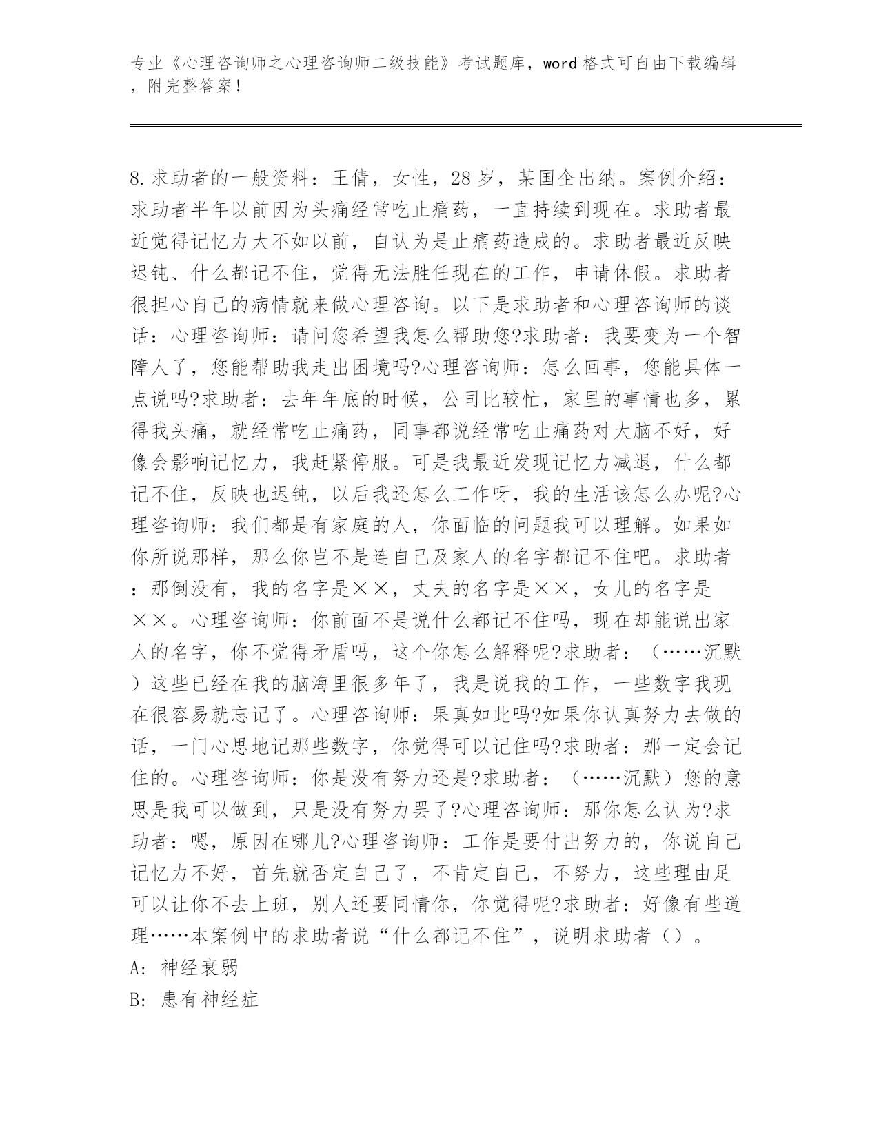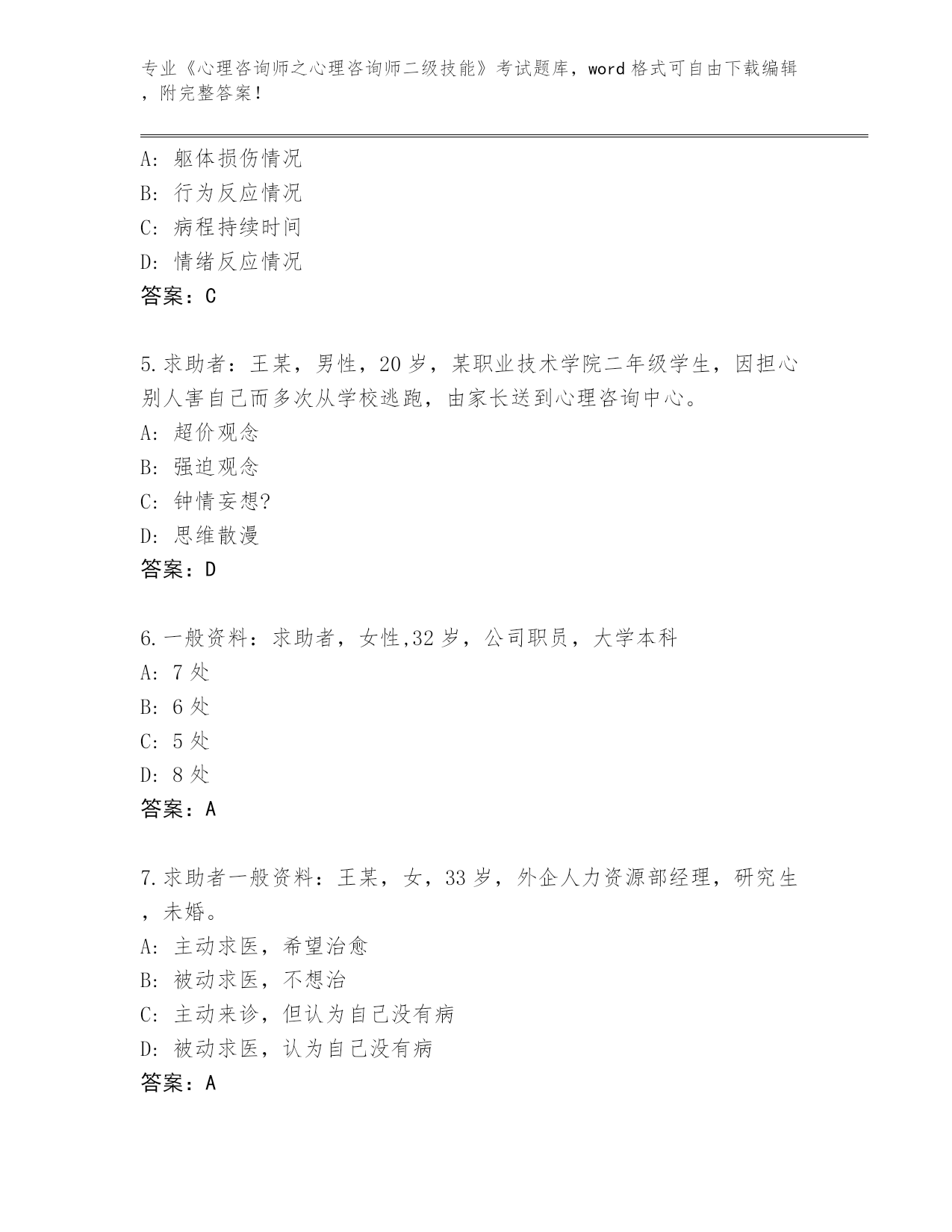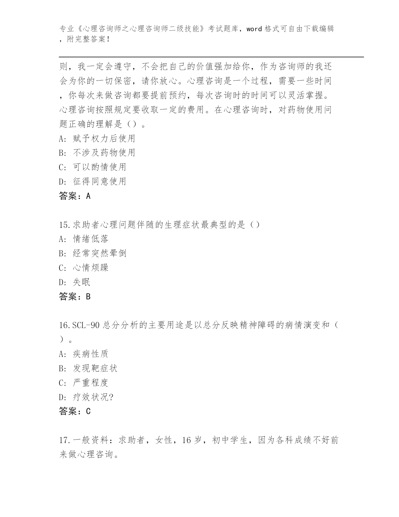 2024年湖南省《心理咨询师之心理咨询师二级技能》考试题库含下载答案