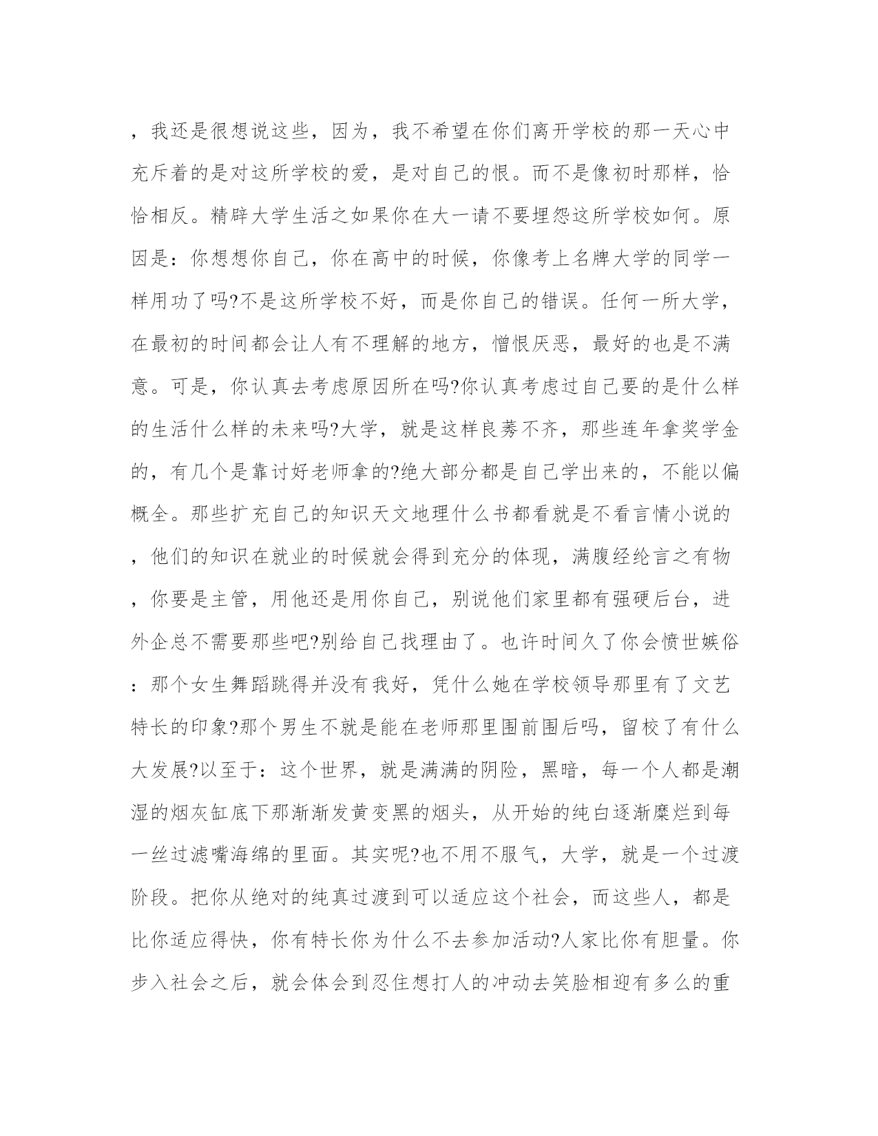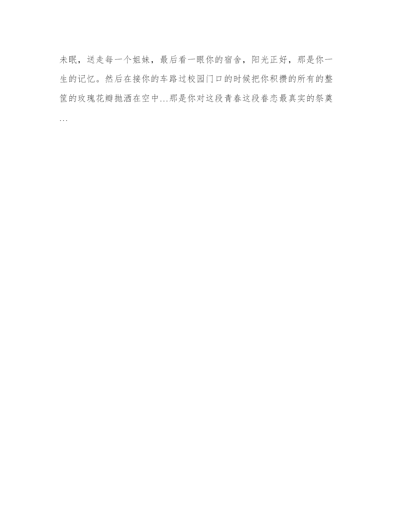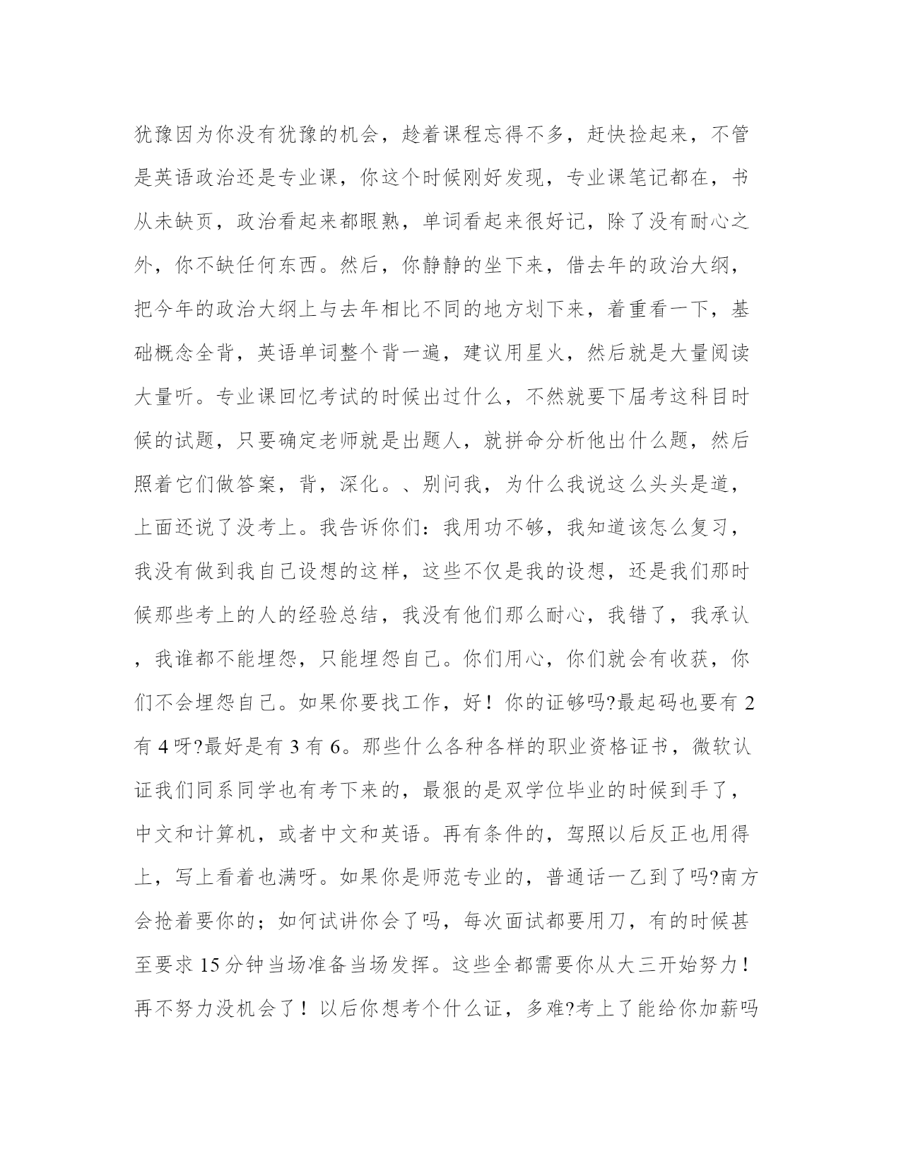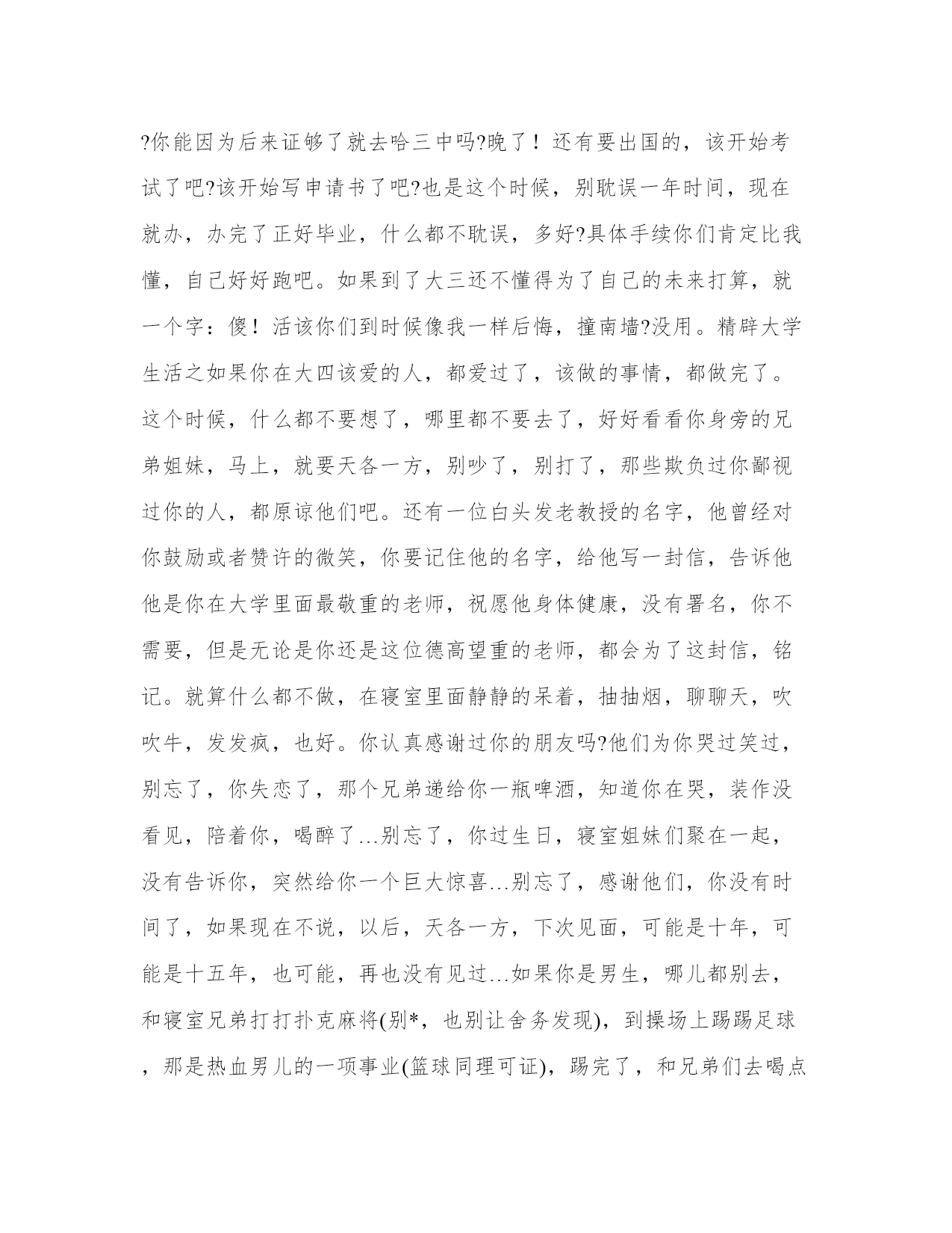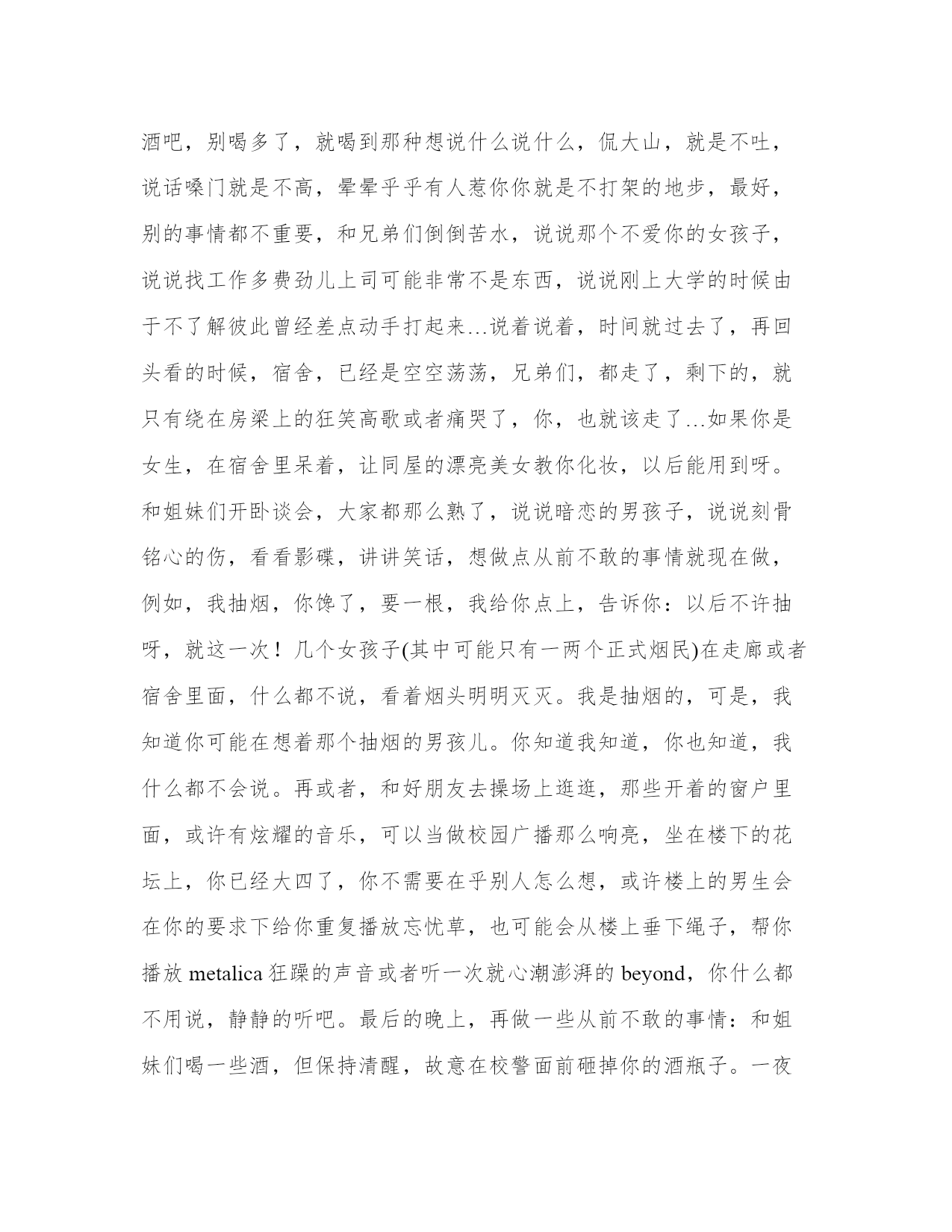 生活哲理之大学不留遗憾【正文】踏入了大学的校门,曾经以为:大学中,草是绿的,天更蓝,水更清,生活更美好。那是让高考的辛酸给压榨出来的,家长们说:上大学了以后,我们什么都不管你。于是,以为自己以后是一支自由的鸟。可是,也许很短的时间内,你就会觉得:这所学校,真差,真黑,真破,真烂!反正就是和最初的想象不一样!食堂,永远难吃;操场,永远人满为患;自习室,从来没有安静过;规矩、导员、班级干部,永远让你觉得:怎么那么能装!于是,你彷徨,站在一个迷茫的世界里,问:我来做什么?我想,有很大一部分人,都是这样过来的。我们幼稚,我们懵懂无知,我们不知道未来的方向,我们无法无天不计后果没有未来…那一年的圣诞节的夜晚(我想起来了,是圣诞节),我一个人在食堂的汉堡屋里,吃着一块小小的蛋糕,几个看起来就很小的女孩子没有位子了,就坐在了我的旁边。问了问,果然是大一的。那样单纯的眼睛,毫无心机的笑容,未加修饰的脸庞,回头看了看玻璃窗中的我,烟雾缭绕,眼神漠然,只能轻轻叹了一口气。我曾经真诚的在心里感谢她们,她们的笑容陪我度过了那样寂寞的节日,于是,我和她们言谈甚欢,听她们单纯地叫师姐,告诉她们应该乖乖的学习。可是,没过多久,就看到她们中的一个人眼含笑意,和一个男孩子一起去上自习了。我才知道,说些什么,都是没有用的了。每一个人,终究会按照他们自己的选择继续他们自己的方式。可是,我还是很想说这些,因为,我不希望在你们离开学校的那一天心中充斥着的是对这所学校的爱,是对自己的恨。而不是像初时那样,恰恰相反。精辟大学生活之如果你在大一请不要埋怨这所学校如何。原因是:你想想你自己,你在高中的时候,你像考上名牌大学的同学一样用功了吗?不是这所学校不好,而是你自己的错误。任何一所大学,在最初的时间都会让人有不理解的地方,憎恨厌恶,最好的也是不满意。可是,你认真去考虑原因所在吗?你认真考虑过自己要的是什么样的生活什么样的未来吗?大学,就是这样良莠不齐,那些连年拿奖学金的,有几个是靠讨好老师拿的?绝大部分都是自己学出来的,不能以偏概全。那些扩充自己的知识天文地理什么书都看就是不看言情小说的,他们的知识在就业的时候就会得到充分的体现,满腹经纶言之有物,你要是主管,用他还是用你自己,别说他们家里都有强硬后台,进外企总不需要那些吧?别给自己找理由了。也许时间久了你会愤世嫉俗:那个女生舞蹈跳得并没有我好,凭什么她在学校领导那里有了文艺特长的印象?那个男生不就是能在老师那里围前围后吗,留校了有什么大发展?以至于:这个世界,就是满满的阴险,黑暗,每一个人都是潮湿的烟灰缸底下那渐渐发黄变黑的烟头,从开始的纯白逐渐糜烂到每一丝过滤嘴海绵的里面。其实呢?也不用不服气,大学,就是一个过渡阶段。把你从绝对的纯真过渡到可以适应这个社会,而这些人,都是比你适应得快,你有特长你为什么不去参加活动?人家比你有胆量。你步入社会之后,就会体会到忍住想打人的冲动去笑脸相迎有多么的重要,其实每个人都一样。那也是一种求生手段。用正确的眼光去理解,自己也许就没有那么多痛苦。最重要的,也是最可能挨板砖的,就是:你忘记了,你是学生,你应该学习。别说我酸别说我恶心,我说的是真的。因为如果你每天多看一眼书,你就不需要交补考的钱;如果你每科多一分,你综合排名就会往前提一名;如果你多背一个英语单词365*4=1460,加上高中的你就不需要过四六级那么费劲;如果你肯提前努力一个月,你也许就不会再考分析生的时候落榜,又错过了找工作最好的机会;如果你多拿一个某某证,你就会在竞聘的众多人中脱颖而出,又一个有为新人诞生了。可能你在骂我说大话讲山理吧?可是你知道吗?这些都是我看着别人的成功总结出来的,我后悔了,没用了,可是我不希望你们将来和我一样后悔。粤语版的无间道:"明明我已昼夜无间打转面前路,梦想中的彼岸为何还未到,明明我已奋力无间天天上路,…快到终点才能知道,又再回到起点从头上路。"那时我在成绩公布之后和一同考研的战友在好乐迪唱歌,在这歌声中所有的人都为了那种艰辛抱头痛哭,可是后来有人去复试了,有人没有。第二年,我们没有的从头上路,英语考试的作文是:终点就是新的起点,我差点在考场上哭出声音,我写的内容就是自己重考第二年的路,回到起点重头上路,那么容易吗?如果我四年没有荒废,我至于像今天这么狼狈吗?精辟大学生活之如果你在大三:别沉溺于那些虚无的情感,我不是让你们不看重感情,因为很少有人在最后得到什么,反而更多的人在其中失去了太多。如果你想到要考研,请你立刻开始不要犹豫因为你没有犹豫的机会,趁着课程忘得不多,赶快捡起来,不管是英语政治还是专业课,你这个时候刚好发现,专业课笔记都在,书从未缺页,政治看起来都眼熟,单词看起来很好记,除了没有耐心之外,你不缺任何东西。然后,你静静的坐下来,借去年的政治大纲,把今年的政治大纲上与去年相比不同