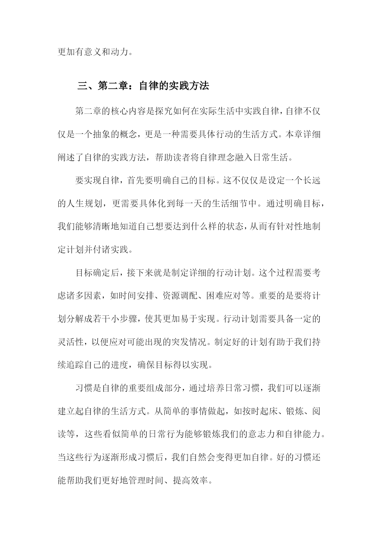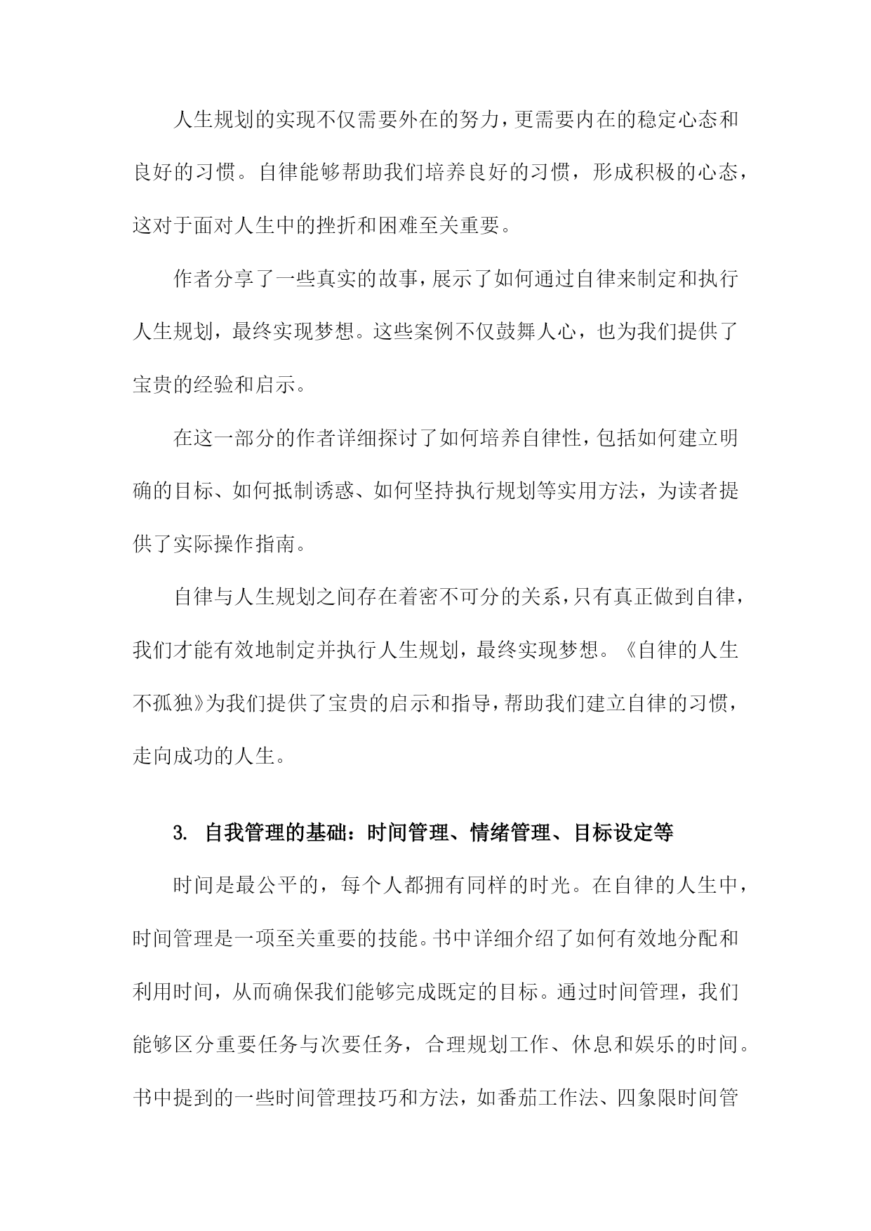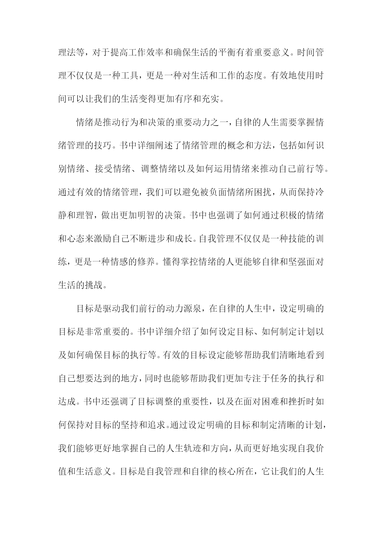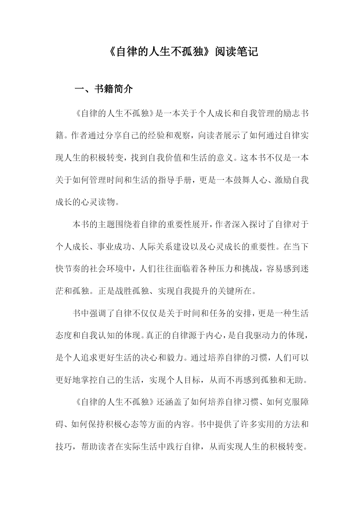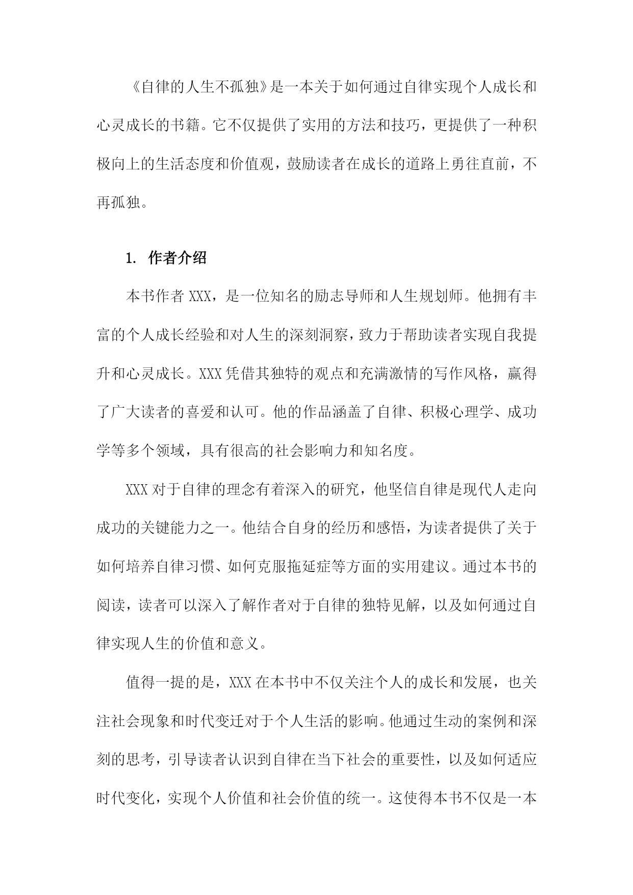 《自律的人生不孤独》阅读笔记一、书籍简介《自律的人生不孤独》是一本关于个人成长和自我管理的励志书籍。作者通过分享自己的经验和观察,向读者展示了如何通过自律实现人生的积极转变,找到自我价值和生活的意义。这本书不仅是一本关于如何管理时间和生活的指导手册,更是一本鼓舞人心、激励自我成长的心灵读物。本书的主题围绕着自律的重要性展开,作者深入探讨了自律对于个人成长、事业成功、人际关系建设以及心灵成长的重要性。在当下快节奏的社会环境中,人们往往面临着各种压力和挑战,容易感到迷茫和孤独。正是战胜孤独、实现自我提升的关键所在。书中强调了自律不仅仅是关于时间和任务的安排,更是一种生活态度和自我认知的体现。真正的自律源于内心,是自我驱动力的体现,是个人追求更好生活的决心和毅力。通过培养自律的习惯,人们可以更好地掌控自己的生活,实现个人目标,从而不再感到孤独和无助。《自律的人生不孤独》还涵盖了如何培养自律习惯、如何克服障碍、如何保持积极心态等方面的内容。书中提供了许多实用的方法和技巧,帮助读者在实际生活中践行自律,从而实现人生的积极转变。《自律的人生不孤独》是一本关于如何通过自律实现个人成长和心灵成长的书籍。它不仅提供了实用的方法和技巧,更提供了一种积极向上的生活态度和价值观,鼓励读者在成长的道路上勇往直前,不再孤独。1.作者介绍本书作者XXX,是一位知名的励志导师和人生规划师。他拥有丰富的个人成长经验和对人生的深刻洞察,致力于帮助读者实现自我提升和心灵成长。XXX凭借其独特的观点和充满激情的写作风格,赢得了广大读者的喜爱和认可。他的作品涵盖了自律、积极心理学、成功学等多个领域,具有很高的社会影响力和知名度。XXX对于自律的理念有着深入的研究,他坚信自律是现代人走向成功的关键能力之一。他结合自身的经历和感悟,为读者提供了关于如何培养自律习惯、如何克服拖延症等方面的实用建议。通过本书的阅读,读者可以深入了解作者对于自律的独特见解,以及如何通过自律实现人生的价值和意义。值得一提的是,XXX在本书中不仅关注个人的成长和发展,也关注社会现象和时代变迁对于个人生活的影响。他通过生动的案例和深刻的思考,引导读者认识到自律在当下社会的重要性,以及如何适应时代变化,实现个人价值和社会价值的统一。这使得本书不仅是一本关于自律的实用指南,也是一本具有深刻思考和人文关怀的作品。2.出版信息《自律的人生不孤独》是一本由知名作家XX所著的畅销书籍。本书由著名出版社YY出版社负责出版,于年XX月首次面世。这本书在全球范围内发行,并受到了广大读者的热烈追捧和高度评价。该书的ISBN号为X。在阅读这本书时,可以注意到封面设计简洁大方,版式设计清晰明了,印刷质量优良,给读者带来了良好的阅读体验。值得一提的是,该书的出版团队对内容的编辑和校对非常用心,确保了书籍内容的准确性和完整性。出版社还通过多渠道推广,使得这本书在市场上取得了极大的成功。3.书籍主题及内容简介《自律的人生不孤独》一书主要围绕自律这一主题展开,深入探讨了自律对于个人成长与人生发展的重要影响。这本书旨在帮助读者了解如何培养自律习惯,实现个人成长,并在人生旅途中收获更多的成就与幸福。书籍强调了自律不仅是一种自我管理能力,更是一种生活态度,能够引导人们走向更加积极、健康、充实的人生道路。本书内容涵盖了自律的内涵、意义、实践方法以及面对挑战时的应对策略等方面。通过书中的论述,读者可以了解到如何制定明确的目标、如何合理规划时间与精力、如何养成好的习惯并坚持下去,以及如何在遇到困难和挫折时调整心态、保持自律。书中还涉及了如何在工作、学习、生活等各个方面运用自律的力量,实现个人价值的最大化。本书不仅为读者提供了理论上的指导,还通过真实的案例和故事,展示了自律在实际生活中的巨大作用,使读者更容易理解和接受书中的观点。二、第一章:认识自律简单来说,就是自我管理和自我控制。它涉及一个人如何在日常生活中安排时间、管理情绪、设定目标并努力实现。自律不仅仅是一种行为规范,更是一种生活态度和精神追求。目标导向:自律能帮助我们设定明确的目标,并坚持朝着这些目标努力。我们可以更好地规划自己的时间和行动,确保每一步都朝着目标前进。心理健康:自律有助于我们更好地管理情绪和压力。通过培养自我控制的能力,我们可以更有效地应对生活中的挑战和困难,从而保持积极的心态。提高效率:自律可以提高我们的工作效率和生产力。当我们对自己的行为和决策有更多的控制时,我们就能更有效地完成任务,提高工作效率。改变生活:通过自律,我们可以改变自己的生活方式和习惯,从而实现更健康、更积极、更充实的生活。自我观察:要认识自律,首先要进行自我观察。通过观察自己的行为和决策,我们可以了解自己的优点和不足,从而找到需要改进的地方。设定目标:设