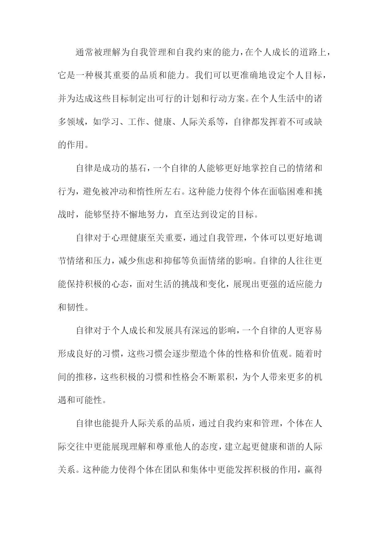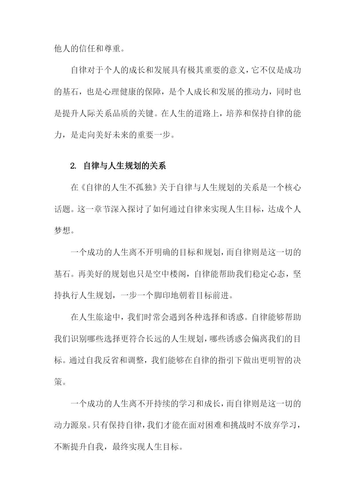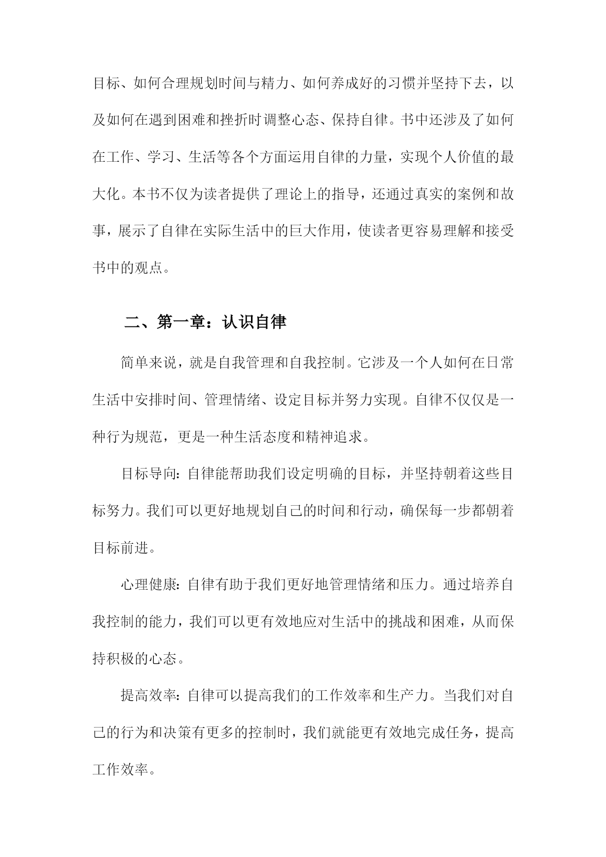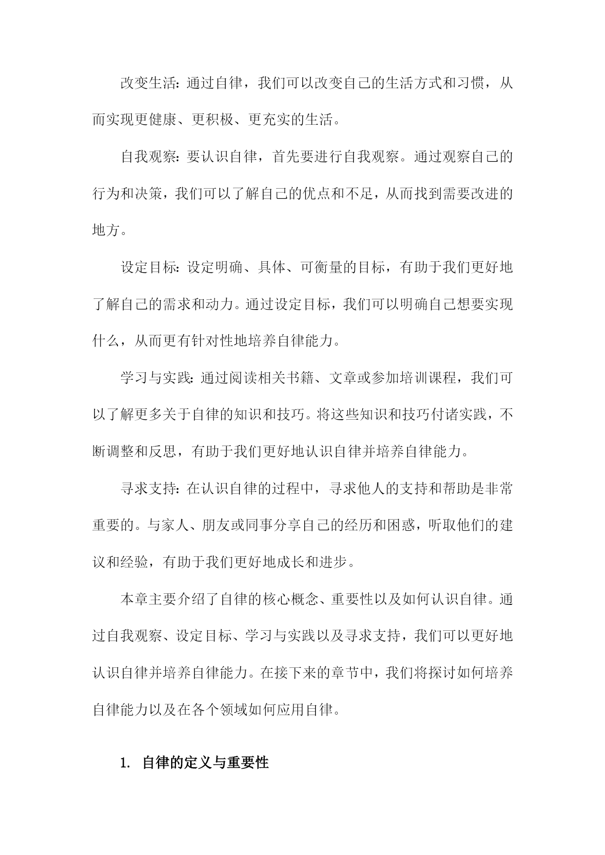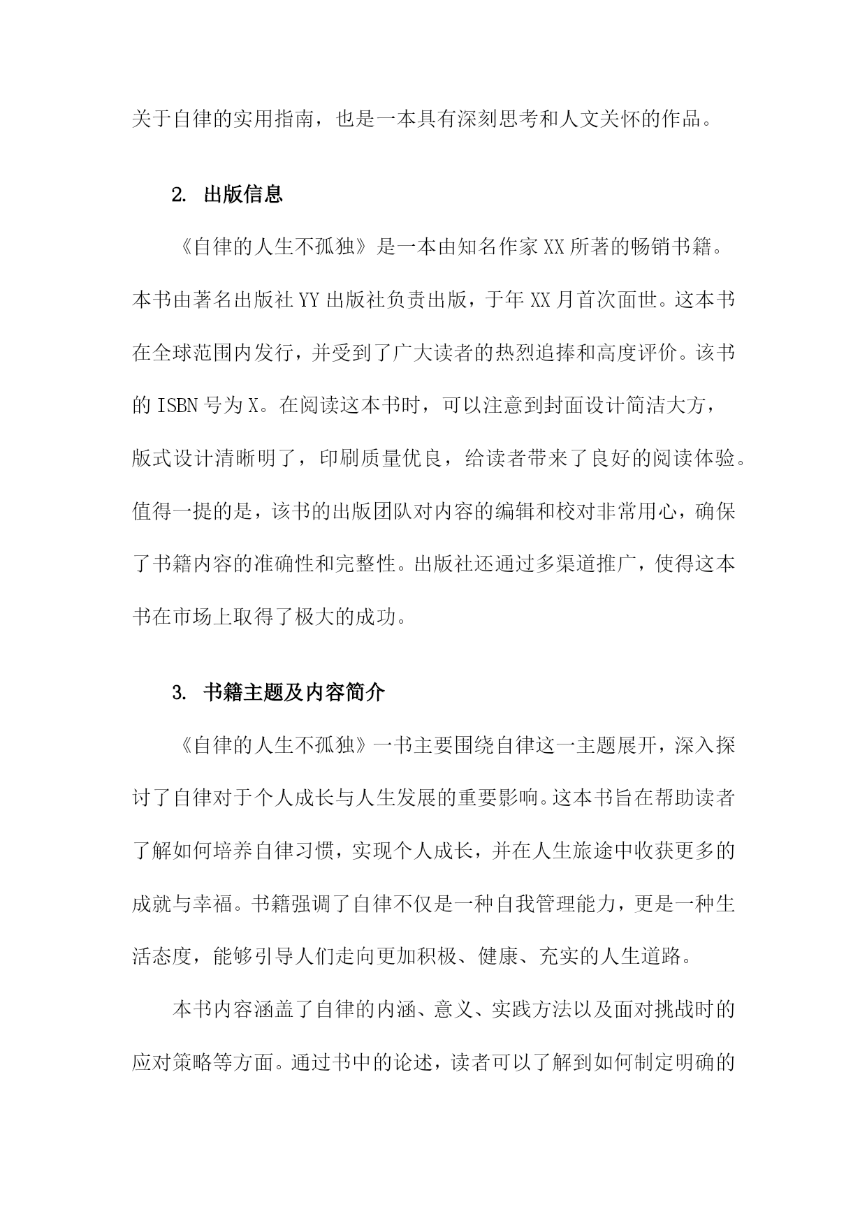 《自律的人生不孤独》阅读笔记一、书籍简介《自律的人生不孤独》是一本关于个人成长和自我管理的励志书籍。作者通过分享自己的经验和观察,向读者展示了如何通过自律实现人生的积极转变,找到自我价值和生活的意义。这本书不仅是一本关于如何管理时间和生活的指导手册,更是一本鼓舞人心、激励自我成长的心灵读物。本书的主题围绕着自律的重要性展开,作者深入探讨了自律对于个人成长、事业成功、人际关系建设以及心灵成长的重要性。在当下快节奏的社会环境中,人们往往面临着各种压力和挑战,容易感到迷茫和孤独。正是战胜孤独、实现自我提升的关键所在。书中强调了自律不仅仅是关于时间和任务的安排,更是一种生活态度和自我认知的体现。真正的自律源于内心,是自我驱动力的体现,是个人追求更好生活的决心和毅力。通过培养自律的习惯,人们可以更好地掌控自己的生活,实现个人目标,从而不再感到孤独和无助。《自律的人生不孤独》还涵盖了如何培养自律习惯、如何克服障碍、如何保持积极心态等方面的内容。书中提供了许多实用的方法和技巧,帮助读者在实际生活中践行自律,从而实现人生的积极转变。《自律的人生不孤独》是一本关于如何通过自律实现个人成长和心灵成长的书籍。它不仅提供了实用的方法和技巧,更提供了一种积极向上的生活态度和价值观,鼓励读者在成长的道路上勇往直前,不再孤独。1.作者介绍本书作者XXX,是一位知名的励志导师和人生规划师。他拥有丰富的个人成长经验和对人生的深刻洞察,致力于帮助读者实现自我提升和心灵成长。XXX凭借其独特的观点和充满激情的写作风格,赢得了广大读者的喜爱和认可。他的作品涵盖了自律、积极心理学、成功学等多个领域,具有很高的社会影响力和知名度。XXX对于自律的理念有着深入的研究,他坚信自律是现代人走向成功的关键能力之一。他结合自身的经历和感悟,为读者提供了关于如何培养自律习惯、如何克服拖延症等方面的实用建议。通过本书的阅读,读者可以深入了解作者对于自律的独特见解,以及如何通过自律实现人生的价值和意义。值得一提的是,XXX在本书中不仅关注个人的成长和发展,也关注社会现象和时代变迁对于个人生活的影响。他通过生动的案例和深刻的思考,引导读者认识到自律在当下社会的重要性,以及如何适应时代变化,实现个人价值和社会价值的统一。这使得本书不仅是一本关于自律的实用指南,也是一本具有深刻思考和人文关怀的作品。2.出版信息《自律的人生不孤独》是一本由知名作家XX所著的畅销书籍。本书由著名出版社YY出版社负责出版,于年XX月首次面世。这本书在全球范围内发行,并受到了广大读者的热烈追捧和高度评价。该书的ISBN号为X。在阅读这本书时,可以注意到封面设计简洁大方,版式设计清晰明了,印刷质量优良,给读者带来了良好的阅读体验。值得一提的是,该书的出版团队对内容的编辑和校对非常用心,确保了书籍内容的准确性和完整性。出版社还通过多渠道推广,使得这本书在市场上取得了极大的成功。3.书籍主题及内容简介《自律的人生不孤独》一书主要围绕自律这一主题展开,深入探讨了自律对于个人成长与人生发展的重要影响。这本书旨在帮助读者了解如何培养自律习惯,实现个人成长,并在人生旅途中收获更多的成就与幸福。书籍强调了自律不仅是一种自我管理能力,更是一种生活态度,能够引导人们走向更加积极、健康、充实的人生道路。本书内容涵盖了自律的内涵、意义、实践方法以及面对挑战时的应对策略等方面。通过书中的论述,读者可以了解到如何制定明确的目标、如何合理规划时间与精力、如何养成好的习惯并坚持下去,以及如何在遇到困难和挫折时调整心态、保持自律。书中还涉及了如何在工作、学习、生活等各个方面运用自律的力量,实现个人价值的最大化。本书不仅为读者提供了理论上的指导,还通过真实的案例和故事,展示了自律在实际生活中的巨大作用,使读者更容易理解和接受书中的观点。二、第一章:认识自律简单来说,就是自我管理和自我控制。它涉及一个人如何在日常生活中安排时间、管理情绪、设定目标并努力实现。自律不仅仅是一种行为规范,更是一种生活态度和精神追求。目标导向:自律能帮助我们设定明确的目标,并坚持朝着这些目标努力。我们可以更好地规划自己的时间和行动,确保每一步都朝着目标前进。心理健康:自律有助于我们更好地管理情绪和压力。通过培养自我控制的能力,我们可以更有效地应对生活中的挑战和困难,从而保持积极的心态。提高效率:自律可以提高我们的工作效率和生产力。当我们对自己的行为和决策有更多的控制时,我们就能更有效地完成任务,提高工作效率。改变生活:通过自律,我们可以改变自己的生活方式和习惯,从而实现更健康、更积极、更充实的生活。自我观察:要认识自律,首先要进行自我观察。通过观察自己的行为和决策,我们可以了解自己的优点和不足,从而找到需要改进的地方。设定目标:设