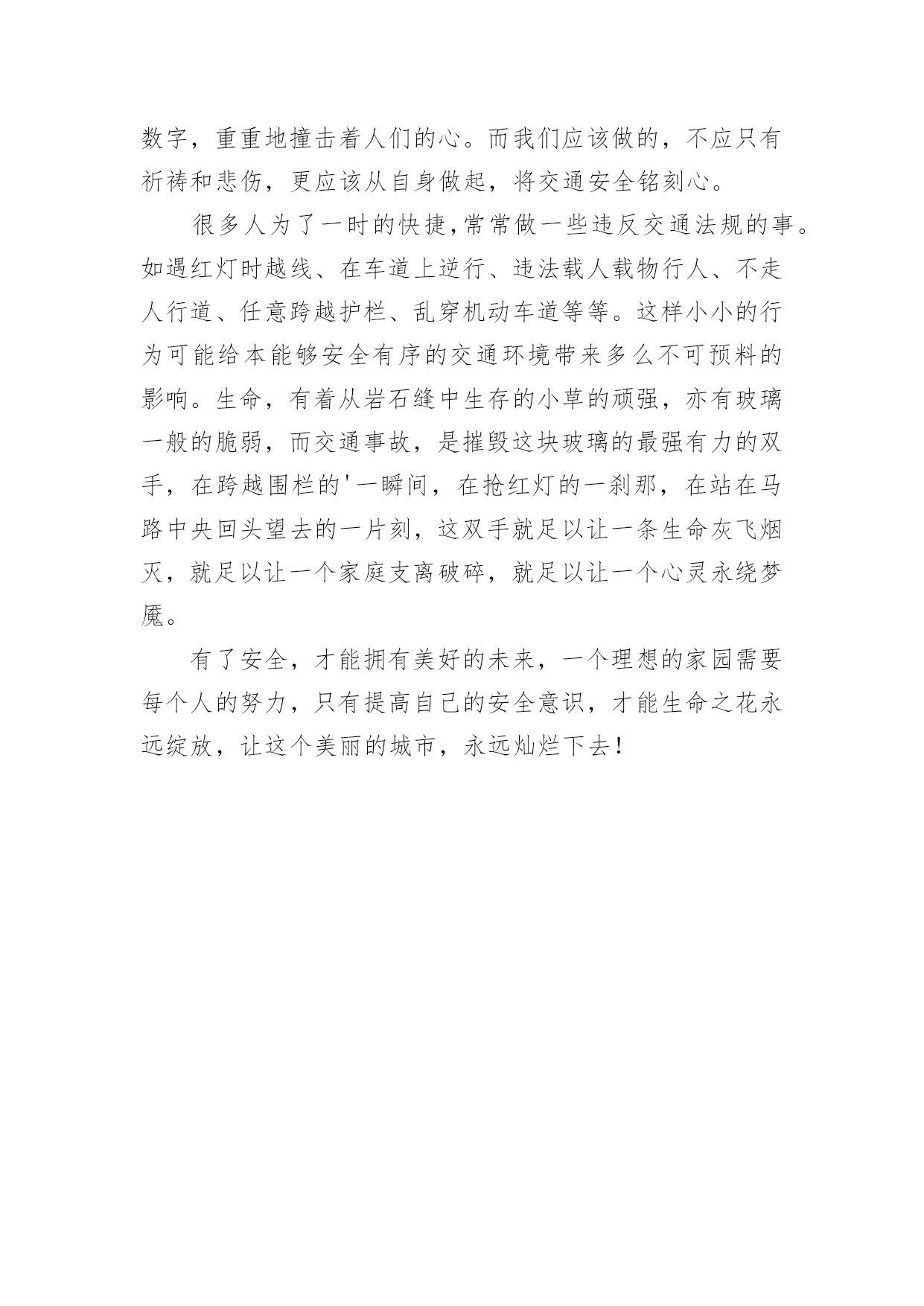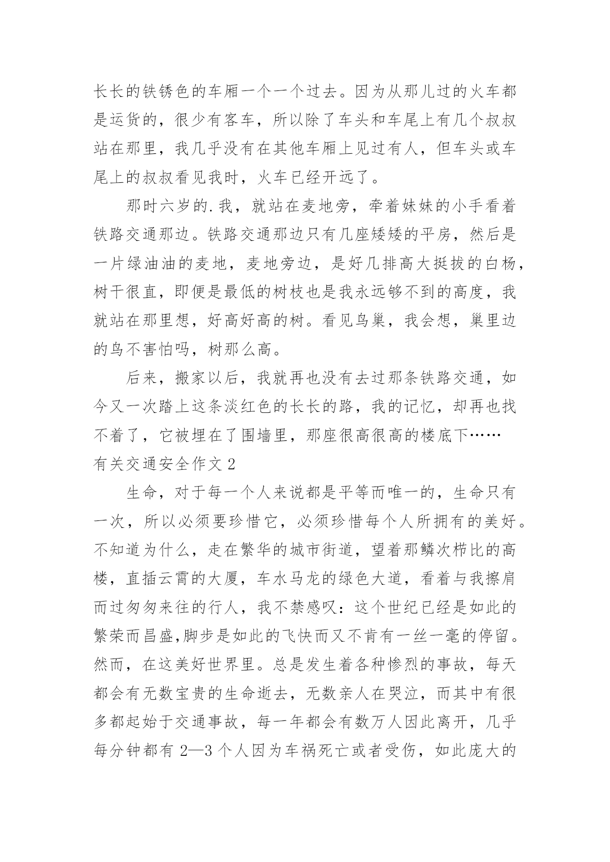 交通安全作文有关交通安全作文在日复一日的学习、工作或生活中,大家总少不了接触作文吧,通过作文可以把我们那些零零散散的思想,聚集在一块。一篇什么样的作文才能称之为优秀作文呢?下面是小编帮大家整理的有关交通安全作文,仅供参考,大家一起来看看吧。有关交通安全作文1当我再去看那条铁路交通时,已经是几年以后了。我带着满脑子的回忆,望向那条铁路交通,左右两旁不再是大片大片的麦地,而是几堵白色的围墙,我记忆中的铁路交通,被困在了围墙头。在很久以前,我就知道那条铁路交通,并经常到那里玩耍。那时铁路交通边上长的有很多“荠荠菜”,铁路交通缝里也有,一到春天,就它最先开花,开出来的是白色小花,花茎上还有很小的心形叶瓣,风一吹,小小的花一晃一晃的,有时我还会担心细长的花茎会断掉,我的担心一直很多余,但我却担心了好几年。我们那时不爱玩玩具,就喜欢蹲在水泥板做的路旁,采集那些白色的小花,铁路交通那里有好多,我就带着妹妹一起去摘花,偶尔,有火车过来,我就招呼妹妹下来,一起等长长的铁锈色的车厢一个一个过去。因为从那儿过的火车都是运货的,很少有客车,所以除了车头和车尾上有几个叔叔站在那里,我几乎没有在其他车厢上见过有人,但车头或车尾上的叔叔看见我时,火车已经开远了。那时六岁的.我,就站在麦地旁,牵着妹妹的小手看着铁路交通那边。铁路交通那边只有几座矮矮的平房,然后是一片绿油油的麦地,麦地旁边,是好几排高大挺拔的白杨,树干很直,即便是最低的树枝也是我永远够不到的高度,我就站在那里想,好高好高的树。看见鸟巢,我会想,巢里边的鸟不害怕吗,树那么高。后来,搬家以后,我就再也没有去过那条铁路交通,如今又一次踏上这条淡红色的长长的路,我的记忆,却再也找不着了,它被埋在了围墙里,那座很高很高的楼底下……有关交通安全作文2生命,对于每一个人来说都是平等而唯一的,生命只有一次,所以必须要珍惜它,必须珍惜每个人所拥有的美好。不知道为什么,走在繁华的城市街道,望着那鳞次栉比的高楼,直插云霄的大厦,车水马龙的绿色大道,看着与我擦肩而过匆匆来往的行人,我不禁感叹:这个世纪已经是如此的繁荣而昌盛,脚步是如此的飞快而又不肯有一丝一毫的停留。然而,在这美好世界里。总是发生着各种惨烈的事故,每天都会有无数宝贵的生命逝去,无数亲人在哭泣,而其中有很多都起始于交通事故,每一年都会有数万人因此离开,几乎每分钟都有2—3个人因为车祸死亡或者受伤,如此庞大的数字,重重地撞击着人们的心。而我们应该做的,不应只有祈祷和悲伤,更应该从自身做起,将交通安全铭刻心。很多人为了一时的快捷,常常做一些违反交通法规的事。如遇红灯时越线、在车道上逆行、违法载人载物行人、不走人行道、任意跨越护栏、乱穿机动车道等等。这样小小的行为可能给本能够安全有序的交通环境带来多么不可预料的影响。生命,有着从岩石缝中生存的小草的顽强,亦有玻璃一般的脆弱,而交通事故,是摧毁这块玻璃的最强有力的双手,在跨越围栏的'一瞬间,在抢红灯的一刹那,在站在马路中央回头望去的一片刻,这双手就足以让一条生命灰飞烟灭,就足以让一个家庭支离破碎,就足以让一个心灵永绕梦魇。有了安全,才能拥有美好的未来,一个理想的家园需要每个人的努力,只有提高自己的安全意识,才能生命之花永远绽放,让这个美丽的城市,永远灿烂下去!