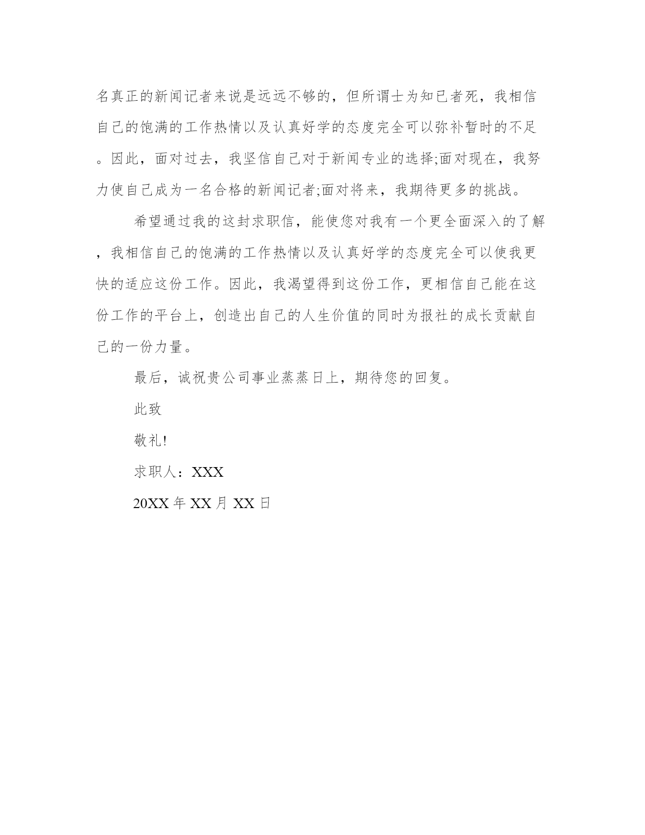 新闻学专业应届生求职信您好!首先感谢您在百忙之中抽空查阅我的求职信,同时也希望您能给我一个展现自我的机会。本人是长春大学2017届的应届毕业生,在校期间主修新闻学。2012年,凭借着个人对记者工作的喜爱我报考了新闻学专业,进入大学通过系统学习,在认识到了作为一名记者身上所应担负的社会责任之后,我更加确定了自己的选择。在这四年里,在所学专业方面,我力求向上,努力学习基础与专业知识,成绩优异并分别获得校一等、二等奖学金,也通过阅读南方周末、羊城晚报、光明日报等来拓宽自己的眼界、增强自己的新闻敏感、提高自己的写作水平。在课余时间,我积极参加学校的各类活动。如文艺方面,参加书法、舞蹈、歌唱演出、演讲比赛等多重活动;社会实践方面,于2010年利用暑假时间进入济源日报社记者部实习,参与了创建文明城市等活动的新闻报道工作。如今大学生活结束,回头总结,独立的校园生活使我从各方面都得到了锻炼,真正做到了学历与能力并进,并自信为一名有担当的女青年。作为刚刚跨出校门,迈向社会的应届毕业生,我以满腔的热情与信心去迎接一切。新闻行业需要“杂家”和复合型人才,我深知四年的校园学习和锻炼教给我的更多的是理论知识的积累,而这对于成为一名真正的新闻记者来说是远远不够的,但所谓士为知已者死,我相信自己的饱满的工作热情以及认真好学的态度完全可以弥补暂时的不足。因此,面对过去,我坚信自己对于新闻专业的选择;面对现在,我努力使自己成为一名合格的新闻记者;面对将来,我期待更多的挑战。希望通过我的这封求职信,能使您对我有一个更全面深入的了解,我相信自己的饱满的工作热情以及认真好学的态度完全可以使我更快的适应这份工作。因此,我渴望得到这份工作,更相信自己能在这份工作的平台上,创造出自己的人生价值的同时为报社的成长贡献自己的一份力量。最后,诚祝贵公司事业蒸蒸日上,期待您的回复。此致敬礼!求职人:XXX20XX年XX月XX日