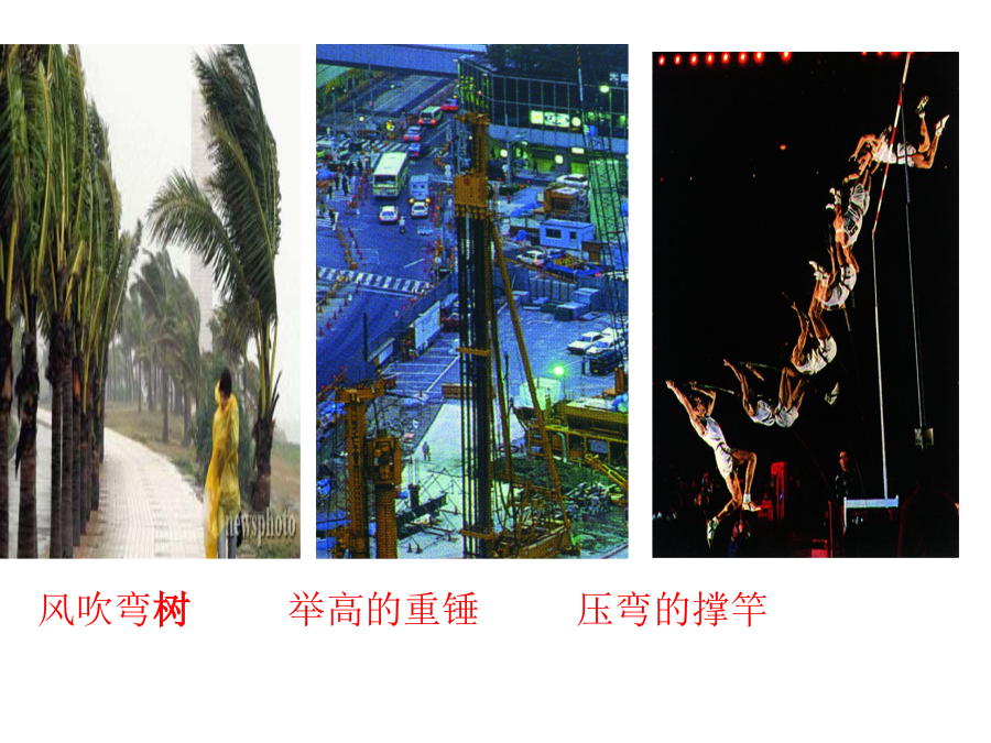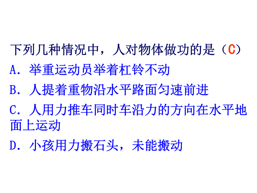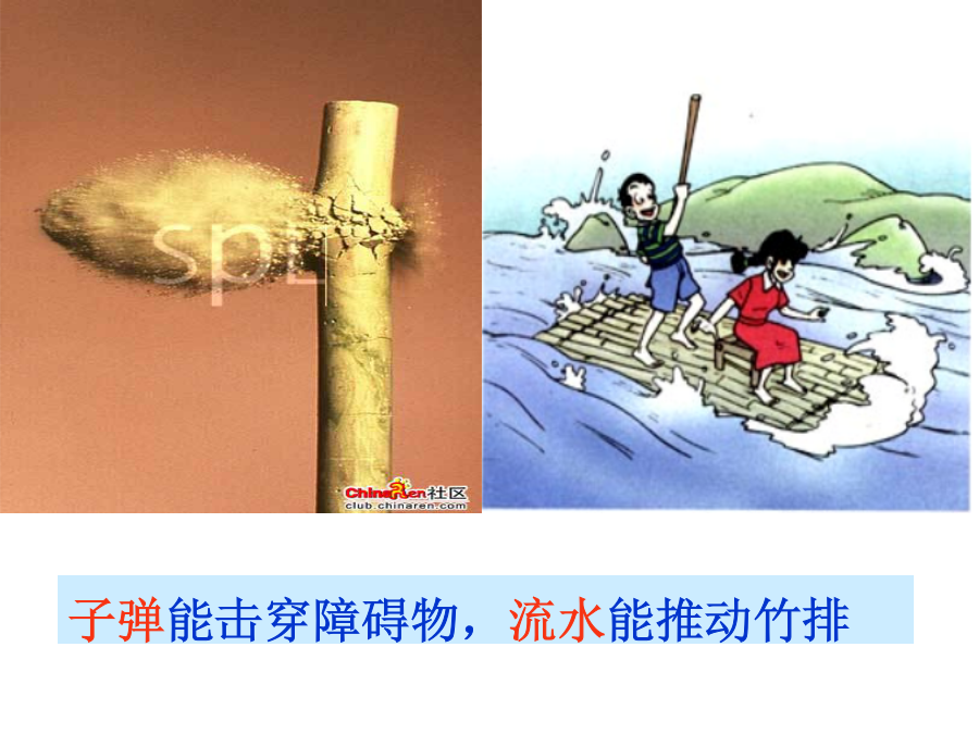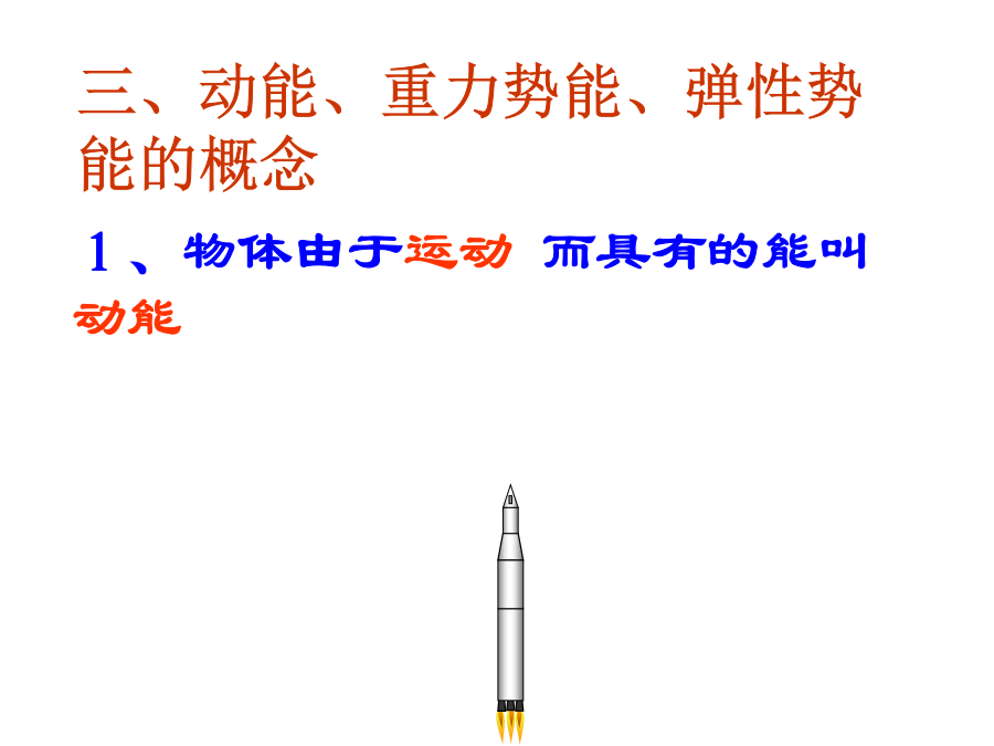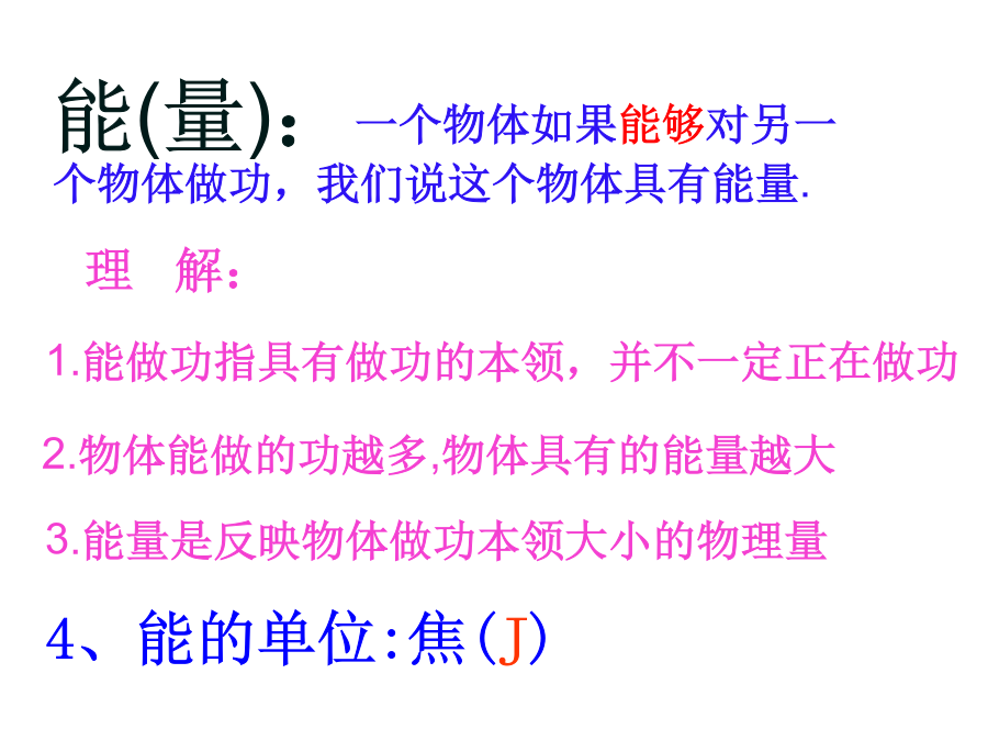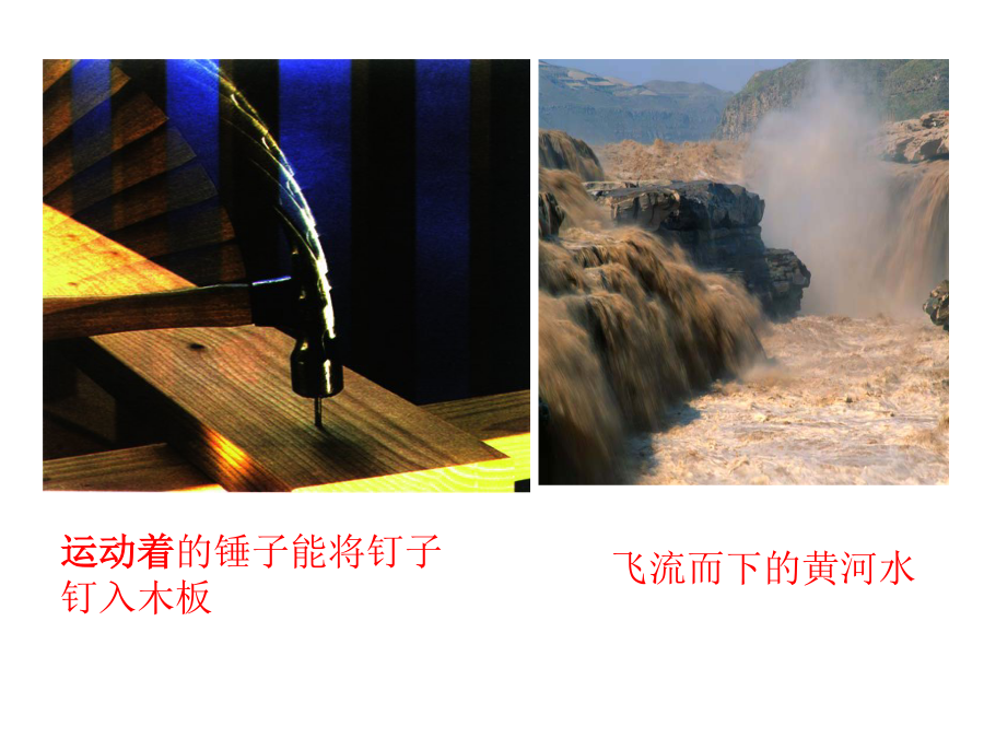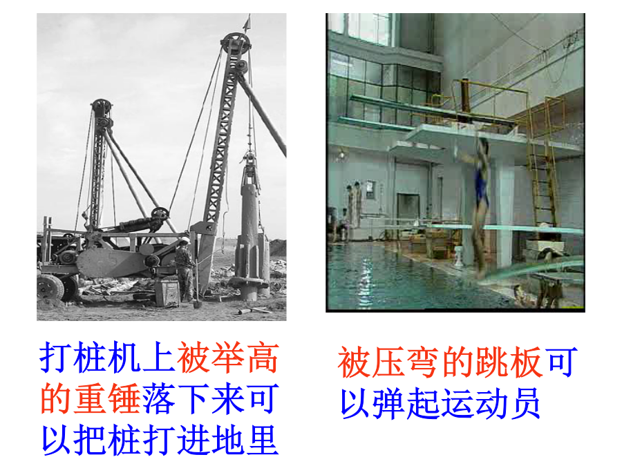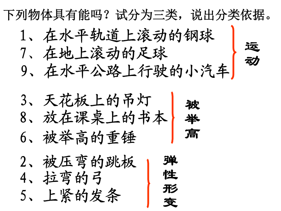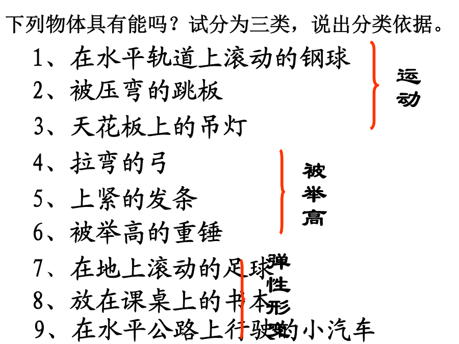 动能势能机械能下列几种情况中,人对物体做功的是()A.举重运动员举着杠铃不动B.人提着重物沿水平路面匀速前进C.人用力推车同时车沿力的方向在水平地面上运动D.小孩用力搬石头,未能搬动打桩机上被举高的重锤落下来可以把桩打进地里子弹能击穿障碍物,流水能推动竹排运动着的锤子能将钉子钉入木板风吹弯树举高的重锤压弯的撑竿4、能的单位:焦(J)9、在水平公路上行驶的小汽车1、物体由于运动而具有的能叫动能9、在水平公路上行驶的小汽车2、物体由于被举高而具有的能叫重力势能9、在水平公路上行驶的小汽车3、物体由于发生弹性形变而具有的能叫做弹性势能。你比较动能大小的标准是。这里用了的方法。猜想:比较右图两个实验得出:大石头你比较重力势能大小的标准是。这里用了的方法。3、物体的弹性势能大小跟什么因素有关?六、小结1.关于能的概念,下列说法中正确的是()A.树上挂的苹果静止不动,所以它不具有能B.在行驶的汽车中,由于乘客在座位上静止不动,所以乘客不具有能C.弹簧具有弹性,所以它一定具有弹性势能D.物体具有能量与它们是否做功无关2、判断动能变化情况4、一架飞机在灾区上方水平匀速飞行,并不断向灾区空投救灾物资,则飞机在这个过程中,动能_____,势能______。(填“变大”或“变小”)A用物理学的术语解释:1、为什么要对机动车的行驶速度进行限制?2、为什么在同样的道路上,不同的车型的限制速度不一样?