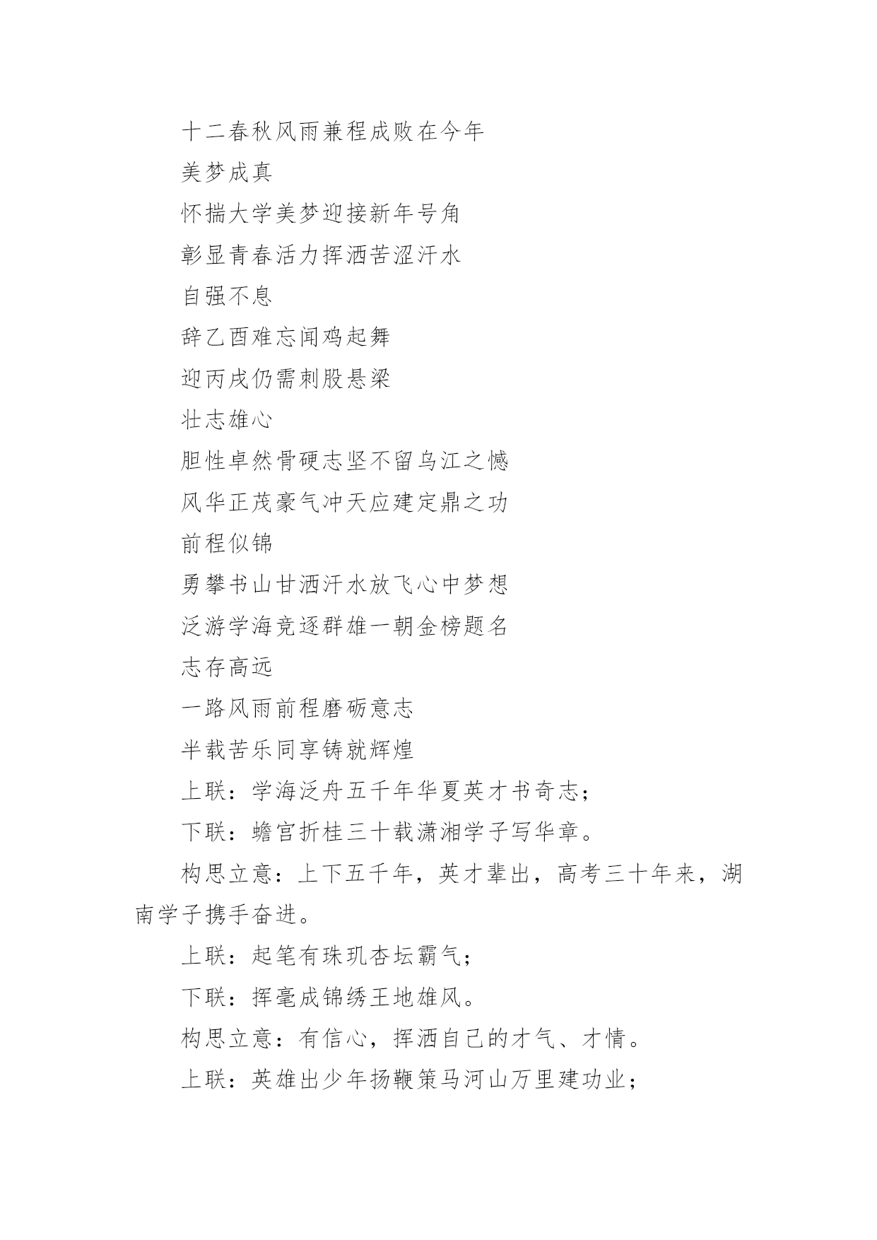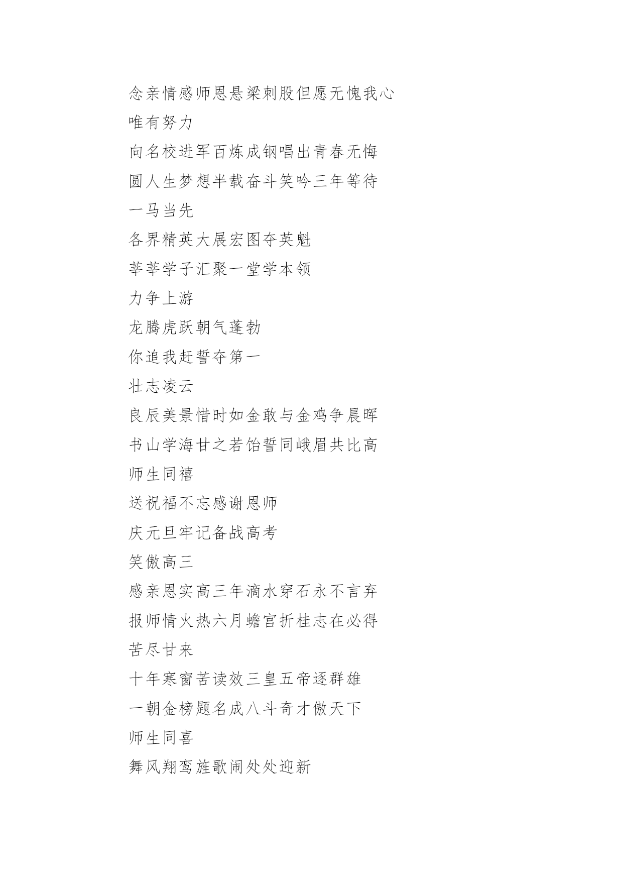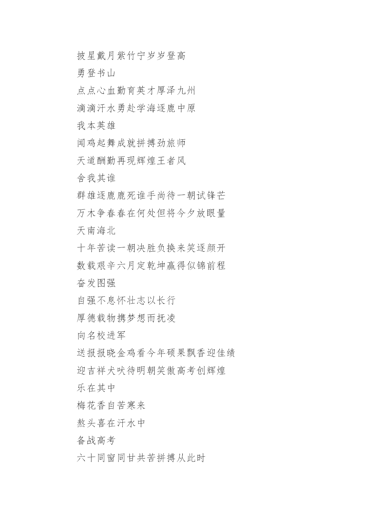 高考励志对联高考励志对联【高考励志】誓夺第一效苏秦之刺股折桂还需苦战学陶侃之惜时付出必有回报激流勇进乘风踏浪我欲搏击沧海横流飞鞭催马吾将痛饮黄龙美酒傲视群雄淡淡墨梅凌寒独开今岁瑞雪兆丰年莘莘学子壮志凌云明年金秋送喜来壮志凌云十载求学纵苦三伏三九无悔无怨一朝成就再忆全心全力有苦有乐众志成城卧虎藏龙地豪气干云秣马砺兵锋芒尽露披星戴月时书香盈耳含英咀华学业必成砺志报亲拼十年寒窗挑灯苦读不畏难携双亲期盼背水勇战定夺魁笑书人生滴水穿石战高考如歌岁月应无悔乘风破浪展雄才折桂蟾宫当有时意气风发时光如梭看我少年学子六月追风去云帆直挂令那美丽人生明朝入眼来风华正茂冬去春来好景年年有辞旧迎新成绩步步高意气风发寒冬散尽喜迎元旦佳节春意盎然更看男儿发愤志存高远花开花落腊梅傲雪盼新春春去春来长风破浪迎高考金榜题名辞旧迎新寒风阵阵催人逝苦尽甘来捷报片片暖人心师生同心知天文通地理莘莘学子携手共进鱼跃龙门培栋梁育英才代代园丁含辛茹苦花香桃林功能技成庖丁解牛久练而技进乎道荀子劝学博学则青出于蓝路在脚下览前贤思己任铁杵磨针只求前程似锦念亲情感师恩悬梁刺股但愿无愧我心唯有努力向名校进军百炼成钢唱出青春无悔圆人生梦想半载奋斗笑吟三年等待一马当先各界精英大展宏图夺英魁莘莘学子汇聚一堂学本领力争上游龙腾虎跃朝气蓬勃你追我赶誓夺第一壮志凌云良辰美景惜时如金敢与金鸡争晨晖书山学海甘之若饴誓同峨眉共比高师生同禧送祝福不忘感谢恩师庆元旦牢记备战高考笑傲高三感亲恩实高三年滴水穿石永不言弃报师情火热六月蟾宫折桂志在必得苦尽甘来十年寒窗苦读效三皇五帝逐群雄一朝金榜题名成八斗奇才傲天下师生同喜舞风翔鸾旌歌闹处处迎新披星戴月紫竹宁岁岁登高勇登书山点点心血勤育英才厚泽九州滴滴汗水勇赴学海逐鹿中原我本英雄闻鸡起舞成就拼搏劲旅师天道酬勤再现辉煌王者风舍我其谁群雄逐鹿鹿死谁手尚待一朝试锋芒万木争春春在何处但将今夕放眼量天南海北十年苦读一朝决胜负换来笑逐颜开数载艰辛六月定乾坤赢得似锦前程奋发图强自强不息怀壮志以长行厚德载物携梦想而抚凌向名校进军送报报晓金鸡看今年硕果飘香迎佳绩迎吉祥犬吠待明朝笑傲高考创辉煌乐在其中梅花香自苦寒来熬头喜在汗水中备战高考六十同窗同甘共苦拼搏从此时十二春秋风雨兼程成败在今年美梦成真怀揣大学美梦迎接新年号角彰显青春活力挥洒苦涩汗水自强不息辞乙酉难忘闻鸡起舞迎丙戌仍需刺股悬梁壮志雄心胆性卓然骨硬志坚不留乌江之憾风华正茂豪气冲天应建定鼎之功前程似锦勇攀书山甘洒汗水放飞心中梦想泛游学海竞逐群雄一朝金榜题名志存高远一路风雨前程磨砺意志半载苦乐同享铸就辉煌上联:学海泛舟五千年华夏英才书奇志;下联:蟾宫折桂三十载潇湘学子写华章。构思立意:上下五千年,英才辈出,高考三十年来,湖南学子携手奋进。上联:起笔有珠玑杏坛霸气;下联:挥毫成锦绣王地雄风。构思立意:有信心,挥洒自己的才气、才情。上联:英雄出少年扬鞭策马河山万里建功业;下联:才俊满郡园挥毫泼墨青春十载展宏图。构思立意:通俗大气,上联实写,下联虚写,鼓舞考生士气。上联:数载寒窗多少风雨多少汗水喜看今朝结硕果;下联:几度春秋无限憧憬无限希冀期盼明天成大器。构思立意:莘莘学子数年刻苦攻读,今天满怀信心进考场接受祖国挑选。社会发展、国家强盛激励青年奋发有为,建功立业,争做贡献。上联:十年磨剑白刃生寒涔汗泪;下联:今昔纵毫冰心着意写春秋。构思立意:学子们经过十年历练,流汗流泪,付出艰辛,有了根基,现在终于学有所成。上联:广在往昔求书丹心映雪风流附;下联:益于今朝试压壮志凌云天地中。构思立意:三年刻苦学习,高考中一举成功。上联:盛世重英才精思放胆千帆争渡惊湘水;下联:华年逢国考极目骋怀万马竞驰震麓山。构思立意:盛世国考,在麓山之滨考试,考生一定要细心。上联:德操如帅智体如军问精进诸生谁为健者;下联:诚信其行恢宏其志创和谐伟业俱是雄才。构思立意:提请考生、其他学生乃至全社会重视高考的严格性和严肃性,不要存取巧心理。高考的结果自会有种种不同,但考生只要自己朝着正确的目标、遵循正确的途径去历练奋进,则无论能否考上理想的大学,都能够成为祖国建设所需要的“雄才”。将上下联联系起来,即可见这副对联立意的精到。上联:多年蕴蓄志远功深日日攻坚获益;下联:一卷摊开神驰笔畅堂堂游刃有余。构思立意:学生平日用功,考试没有负担,考场上游刃有余。上联:壮志写春秋学海无涯直挂云帆探胜景;下联:湖湘多才俊今朝有我敢凌绝顶傲群伦。构思立意:考生壮志凌云,考后取得佳绩。上联:驰骋直奔千里远;下联:翱翔必指九天高。构思立意:对考生的希望、寄托,要有远大的理想,寄托一种祝福和希望。上联:博闻强志勤奋创新成就心中学问;下联:精思妙悟严格求实撰写天下文章。构思立意:勤奋学习,勇于创新,学好知识,考试中发扬严格求实精神,考出好成绩。上联:下笔千言凝湘水十里;下联:出门一笑待桂子三秋。构