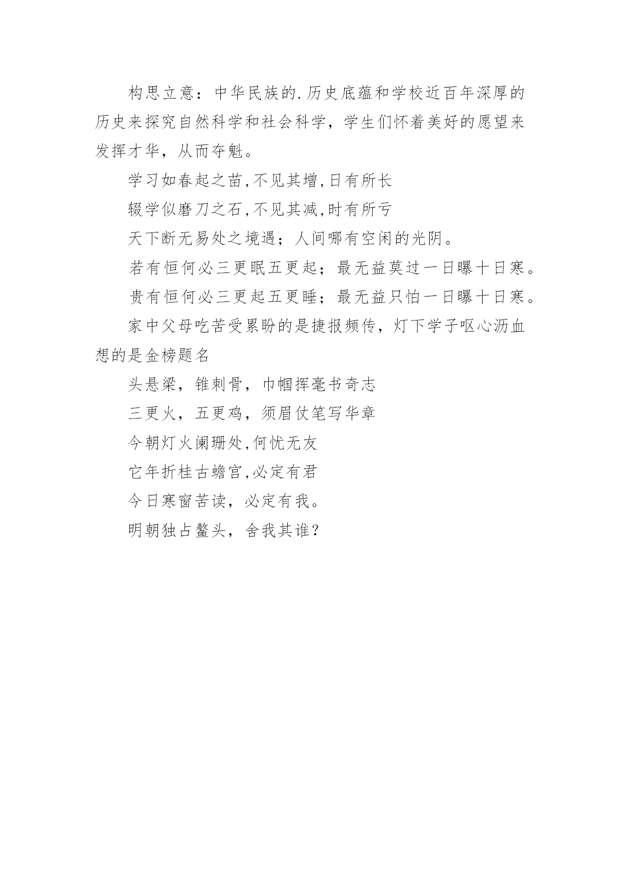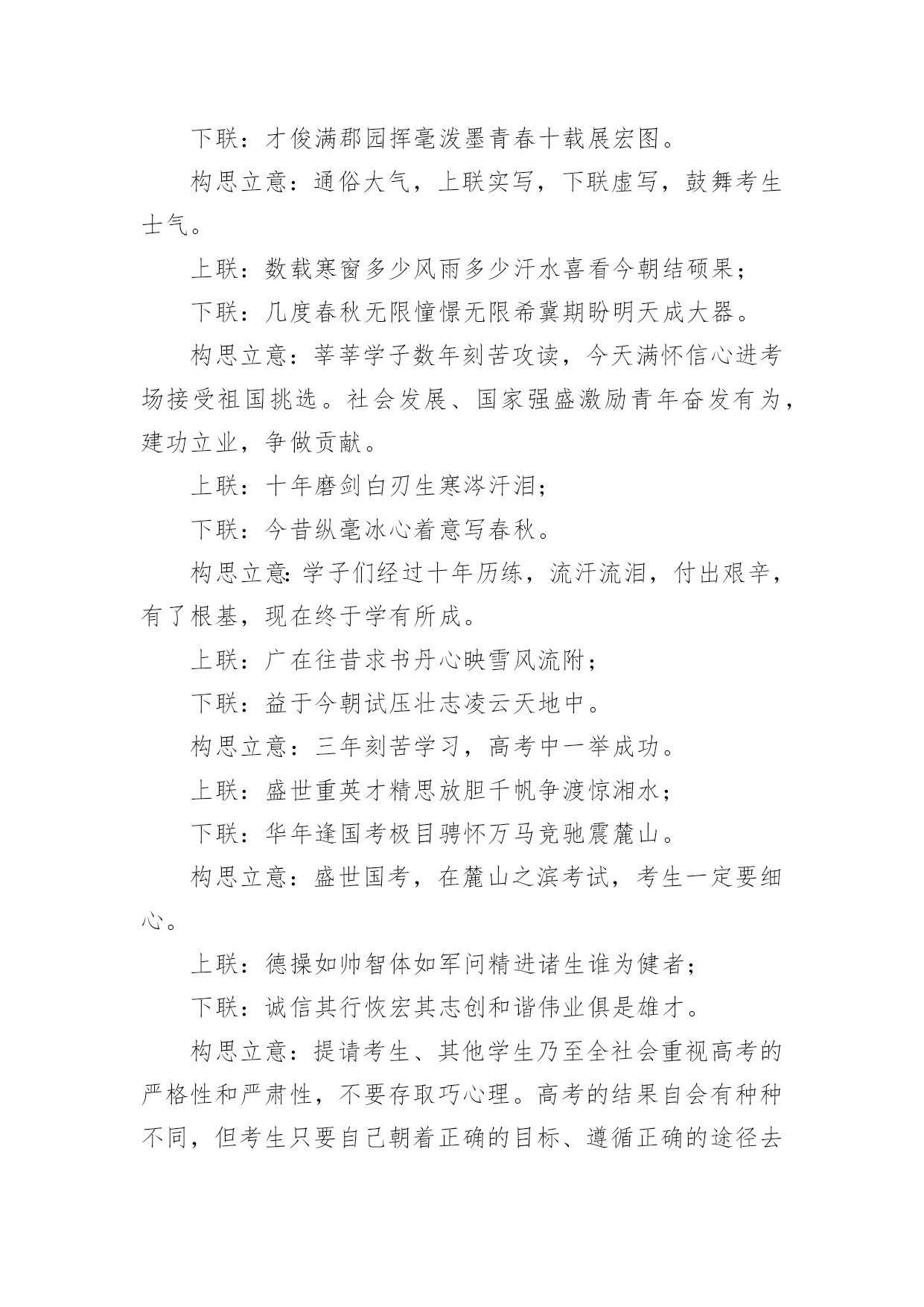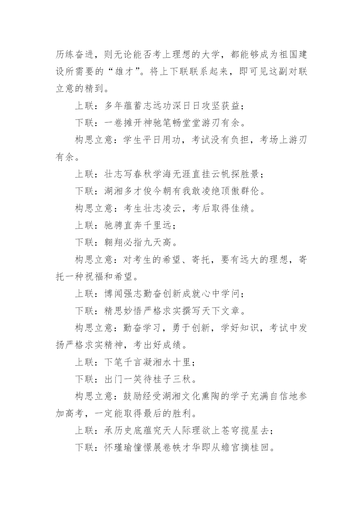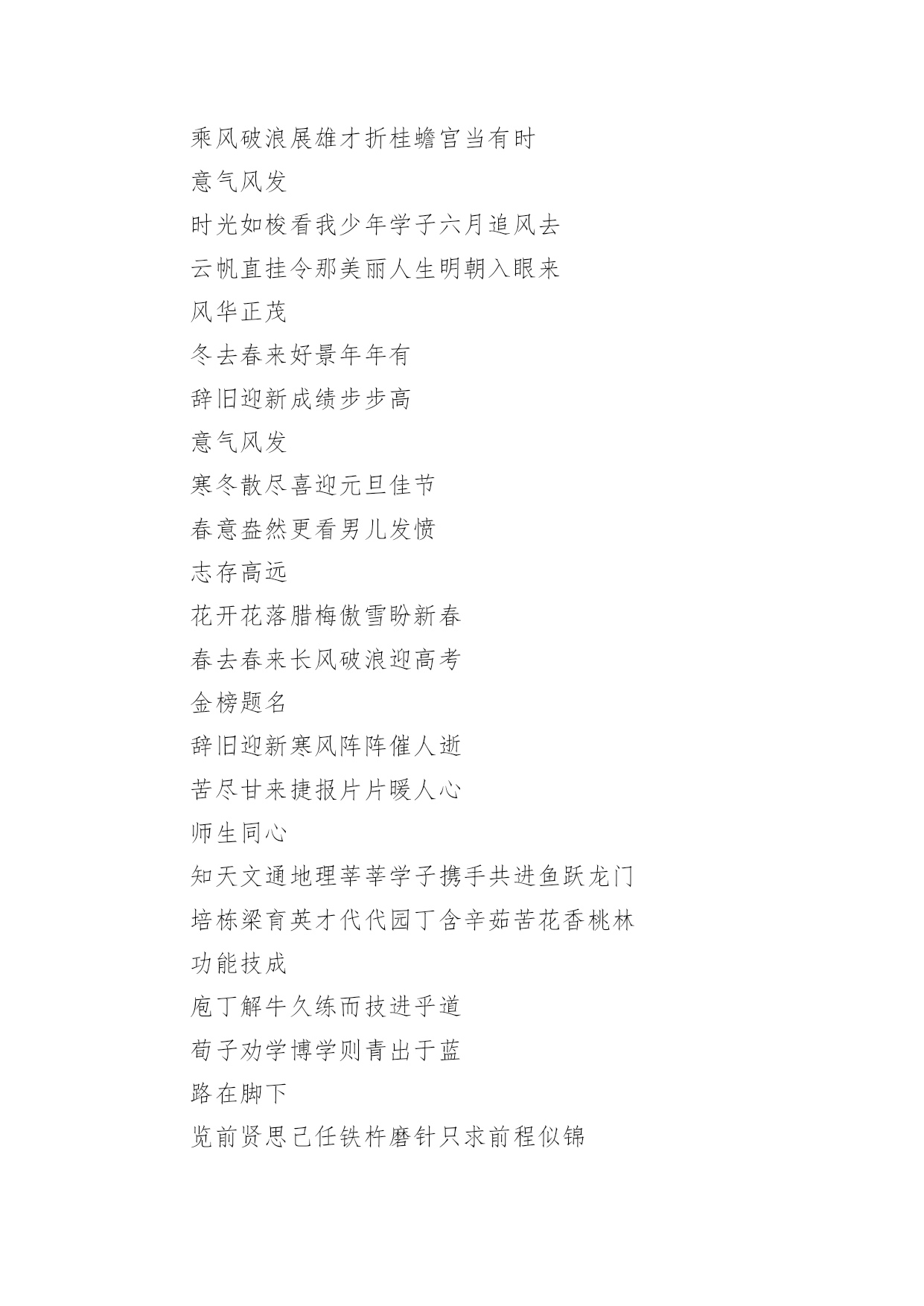 高考励志对联高考励志对联【高考励志】誓夺第一效苏秦之刺股折桂还需苦战学陶侃之惜时付出必有回报激流勇进乘风踏浪我欲搏击沧海横流飞鞭催马吾将痛饮黄龙美酒傲视群雄淡淡墨梅凌寒独开今岁瑞雪兆丰年莘莘学子壮志凌云明年金秋送喜来壮志凌云十载求学纵苦三伏三九无悔无怨一朝成就再忆全心全力有苦有乐众志成城卧虎藏龙地豪气干云秣马砺兵锋芒尽露披星戴月时书香盈耳含英咀华学业必成砺志报亲拼十年寒窗挑灯苦读不畏难携双亲期盼背水勇战定夺魁笑书人生滴水穿石战高考如歌岁月应无悔乘风破浪展雄才折桂蟾宫当有时意气风发时光如梭看我少年学子六月追风去云帆直挂令那美丽人生明朝入眼来风华正茂冬去春来好景年年有辞旧迎新成绩步步高意气风发寒冬散尽喜迎元旦佳节春意盎然更看男儿发愤志存高远花开花落腊梅傲雪盼新春春去春来长风破浪迎高考金榜题名辞旧迎新寒风阵阵催人逝苦尽甘来捷报片片暖人心师生同心知天文通地理莘莘学子携手共进鱼跃龙门培栋梁育英才代代园丁含辛茹苦花香桃林功能技成庖丁解牛久练而技进乎道荀子劝学博学则青出于蓝路在脚下览前贤思己任铁杵磨针只求前程似锦念亲情感师恩悬梁刺股但愿无愧我心唯有努力向名校进军百炼成钢唱出青春无悔圆人生梦想半载奋斗笑吟三年等待一马当先各界精英大展宏图夺英魁莘莘学子汇聚一堂学本领力争上游龙腾虎跃朝气蓬勃你追我赶誓夺第一壮志凌云良辰美景惜时如金敢与金鸡争晨晖书山学海甘之若饴誓同峨眉共比高师生同禧送祝福不忘感谢恩师庆元旦牢记备战高考笑傲高三感亲恩实高三年滴水穿石永不言弃报师情火热六月蟾宫折桂志在必得苦尽甘来十年寒窗苦读效三皇五帝逐群雄一朝金榜题名成八斗奇才傲天下师生同喜舞风翔鸾旌歌闹处处迎新披星戴月紫竹宁岁岁登高勇登书山点点心血勤育英才厚泽九州滴滴汗水勇赴学海逐鹿中原我本英雄闻鸡起舞成就拼搏劲旅师天道酬勤再现辉煌王者风舍我其谁群雄逐鹿鹿死谁手尚待一朝试锋芒万木争春春在何处但将今夕放眼量天南海北十年苦读一朝决胜负换来笑逐颜开数载艰辛六月定乾坤赢得似锦前程奋发图强自强不息怀壮志以长行厚德载物携梦想而抚凌向名校进军送报报晓金鸡看今年硕果飘香迎佳绩迎吉祥犬吠待明朝笑傲高考创辉煌乐在其中梅花香自苦寒来熬头喜在汗水中备战高考六十同窗同甘共苦拼搏从此时十二春秋风雨兼程成败在今年美梦成真怀揣大学美梦迎接新年号角彰显青春活力挥洒苦涩汗水自强不息辞乙酉难忘闻鸡起舞迎丙戌仍需刺股悬梁壮志雄心胆性卓然骨硬志坚不留乌江之憾风华正茂豪气冲天应建定鼎之功前程似锦勇攀书山甘洒汗水放飞心中梦想泛游学海竞逐群雄一朝金榜题名志存高远一路风雨前程磨砺意志半载苦乐同享铸就辉煌上联:学海泛舟五千年华夏英才书奇志;下联:蟾宫折桂三十载潇湘学子写华章。构思立意:上下五千年,英才辈出,高考三十年来,湖南学子携手奋进。上联:起笔有珠玑杏坛霸气;下联:挥毫成锦绣王地雄风。构思立意:有信心,挥洒自己的才气、才情。上联:英雄出少年扬鞭策马河山万里建功业;下联:才俊满郡园挥毫泼墨青春十载展宏图。构思立意:通俗大气,上联实写,下联虚写,鼓舞考生士气。上联:数载寒窗多少风雨多少汗水喜看今朝结硕果;下联:几度春秋无限憧憬无限希冀期盼明天成大器。构思立意:莘莘学子数年刻苦攻读,今天满怀信心进考场接受祖国挑选。社会发展、国家强盛激励青年奋发有为,建功立业,争做贡献。上联:十年磨剑白刃生寒涔汗泪;下联:今昔纵毫冰心着意写春秋。构思立意:学子们经过十年历练,流汗流泪,付出艰辛,有了根基,现在终于学有所成。上联:广在往昔求书丹心映雪风流附;下联:益于今朝试压壮志凌云天地中。构思立意:三年刻苦学习,高考中一举成功。上联:盛世重英才精思放胆千帆争渡惊湘水;下联:华年逢国考极目骋怀万马竞驰震麓山。构思立意:盛世国考,在麓山之滨考试,考生一定要细心。上联:德操如帅智体如军问精进诸生谁为健者;下联:诚信其行恢宏其志创和谐伟业俱是雄才。构思立意:提请考生、其他学生乃至全社会重视高考的严格性和严肃性,不要存取巧心理。高考的结果自会有种种不同,但考生只要自己朝着正确的目标、遵循正确的途径去历练奋进,则无论能否考上理想的大学,都能够成为祖国建设所需要的“雄才”。将上下联联系起来,即可见这副对联立意的精到。上联:多年蕴蓄志远功深日日攻坚获益;下联:一卷摊开神驰笔畅堂堂游刃有余。构思立意:学生平日用功,考试没有负担,考场上游刃有余。上联:壮志写春秋学海无涯直挂云帆探胜景;下联:湖湘多才俊今朝有我敢凌绝顶傲群伦。构思立意:考生壮志凌云,考后取得佳绩。上联:驰骋直奔千里远;下联:翱翔必指九天高。构思立意:对考生的希望、寄托,要有远大的理想,寄托一种祝福和希望。上联:博闻强志勤奋创新成就心中学问;下联:精思妙悟严格求实撰写天下文章。构思立意:勤奋学习,勇于创新,学好知识,考试中发扬严格求实精神,考出好成绩。上联:下笔千言凝湘水十里;下联:出门一笑待桂子三秋。构