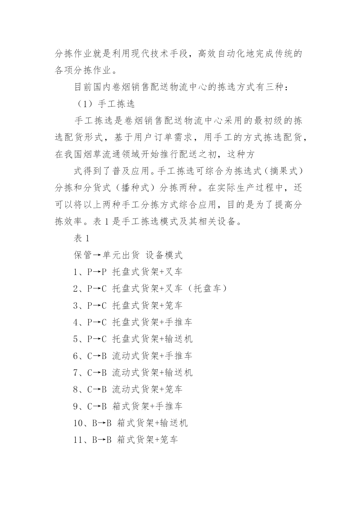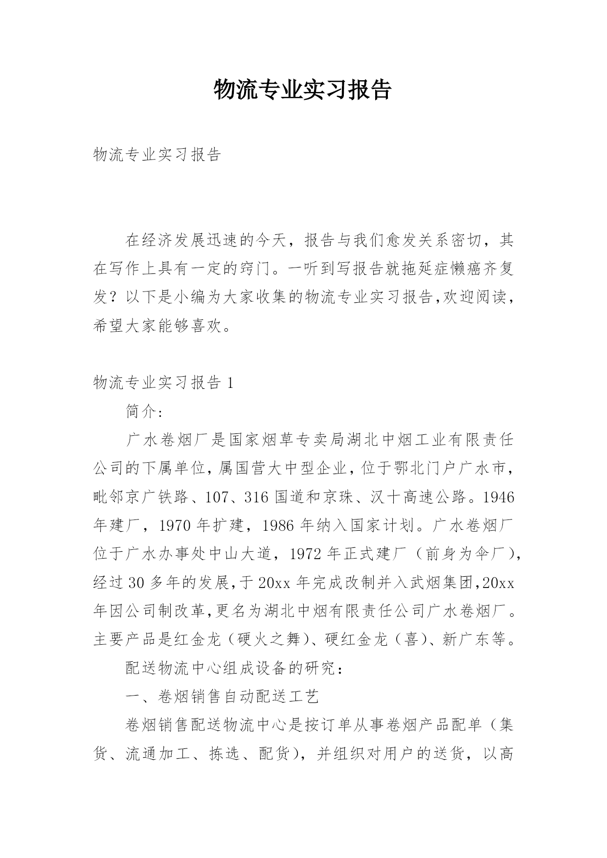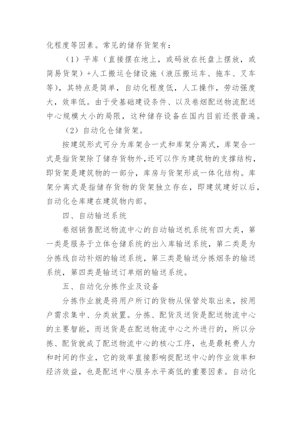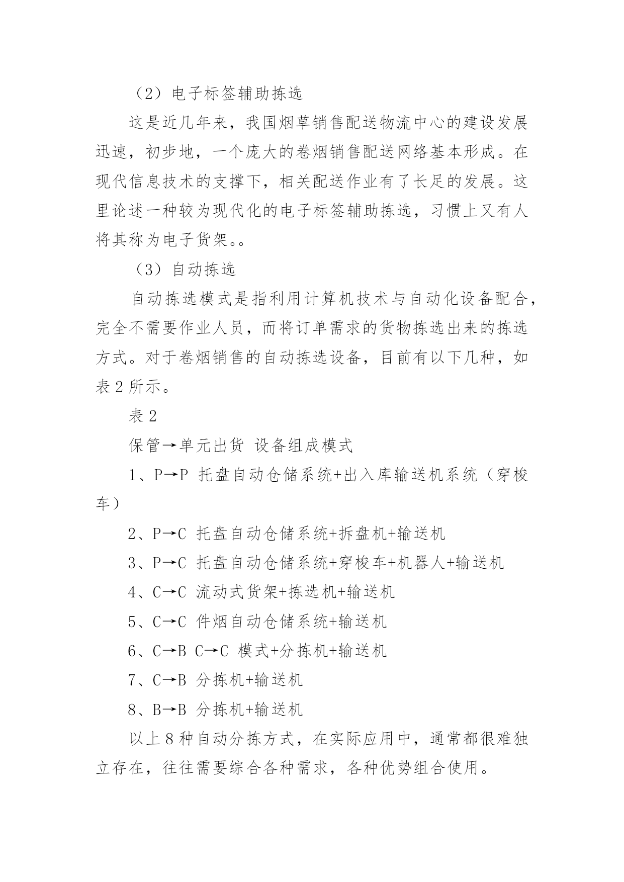 物流专业实习报告物流专业实习报告在经济发展迅速的今天,报告与我们愈发关系密切,其在写作上具有一定的窍门。一听到写报告就拖延症懒癌齐复发?以下是小编为大家收集的物流专业实习报告,欢迎阅读,希望大家能够喜欢。物流专业实习报告1简介:广水卷烟厂是国家烟草专卖局湖北中烟工业有限责任公司的下属单位,属国营大中型企业,位于鄂北门户广水市,毗邻京广铁路、107、316国道和京珠、汉十高速公路。1946年建厂,1970年扩建,1986年纳入国家计划。广水卷烟厂位于广水办事处中山大道,1972年正式建厂(前身为伞厂),经过30多年的发展,于20xx年完成改制并入武烟集团,20xx年因公司制改革,更名为湖北中烟有限责任公司广水卷烟厂。主要产品是红金龙(硬火之舞)、硬红金龙(喜)、新广东等。配送物流中心组成设备的研究:一、卷烟销售自动配送工艺卷烟销售配送物流中心是按订单从事卷烟产品配单(集货、流通加工、拣选、配货),并组织对用户的送货,以高水平实现销售和供应服务的现代流通设施,是现代物流的标志,它能解决用户多样化需求和厂商大批量专业化生产的矛盾。配送的意义在经济合理区域范围内,根据用户要求,对卷烟商品进行拣选、加工、包装、组配等作业,并按时送达指定地点。配货和送货的有机结合,是物流功能要素的一种形式,商流与物流的合一。细分卷烟产品的典型配送作业流程是:进货→储存→拆零→分拣→配货→包装→送货。在卷烟销售配送物流中心的规划中,需要重点考虑与社会供应链连接,必须重点考虑物流主干道的通畅。二、配送中心的设备组成卷烟销售配送物流中心内的主要作业活动,包括卷烟的仓储、搬运、拣取、配单、缓存等物流作业,涉及以下几类设备:(1)容器设施:托盘、配送箱、纸袋(可降解塑料袋)等。托盘用于卷烟成品实托盘的存储、搬运,配送箱、纸袋(可降解塑料袋)为分拣作业后形成订单包件后的即配送容器。一般地,配送容器须根据地区订单大小来划分为多个等级,其目的是提高订单包件的有效运输,有利于配送容器的规范化,也方便配送,随着技术的不断发展,如选用自动订单包装处理工艺,则25条、30条的包装为首选。(2)储存设备:涉及多种仓储设备。按现阶段国内的实际应用情况,包括普通平库,和各种适合件烟存储的自动化立体仓库以及自动货柜。储存设备可分为货架和实现仓储的具体设备。(3)烟条分拣设备:至今为止,烟条的分拣设备已经发展了多种设备,有人工拣选货架,电子标签辅助拣选货架和自动化分拣设备等多类。(4)搬运设备:包括自动化配合的搬运设备(如AGV、轴驱动搬运台车等)、机械化搬运设备(如叉车、油压拖车等)、自动输送设备、分类分流输送设备,拆码盘设备、垂直搬运设备等。(5)流通加工设备:如集包裹包设备、外包装设备、印贴条码标签订单设备、拆箱设备、自动装箱设备、理货平台等,配送烟条的再包装,是影响卷烟配送分拣效率的一个很重要的环节。(6)卷烟销售配送物流中心外围设备:包括楼层转运设备、装卸货平台、装卸货设施、订单烟包暂存笼车(也可以用托盘处理)、废料处理设施等,需视配送中心的具体需求特性而备。三、储存货架储存系统是配送系统的中心环节,是配送网络的节点,是按计划来保管货物(包括原材料、领部件、在制品和产成品等),并对其数量或价值进行统计,提供有关储存物品的信息以供管理决策所用的场所。卷烟销售配送物流中心储存模式有多种,其选择的基础技术条件是“卷烟配送PBC分析研究”的结果、配送中心销售配送的市场总量大小,以及配送中心输送分拣工艺的自动化程度等因素。常见的储存货架有:(1)平库(直接摆在地上,或码放在托盘上摆放,或简易货架)+人工搬运仓储设施(液压搬运车、拖车、叉车等),其特点是简单,自动化程度低,人工操作,劳动强度大,效率低。由于受基础建设条件、以及卷烟配送物流配送中心规模大小的局限,这种储存设备在国内目前还很普遍。(2)自动化仓储货架。按建筑形式可分为库架合一式和库架分离式,库架合一式是指货架除了储存货物外,还可以作为建筑物的支撑结构,即货架是建筑物的一部分,库房与货架形成一体化结构。库架分离式是指储存货物的货架独立存在,即建筑建好以后,自动化仓库建在建筑物内部。四、自动输送系统卷烟销售配送物流中心的自动输送机系统有四大类,第一类是服务于立体仓储系统的出入库输送系统,第二类是为分拣线自动补烟的输送系统,第三类是输送分拣烟条的输送系统,第四类是输送订单烟的输送系统。五、自动化分拣作业及设备分拣作业就是将用户所订的货物从保管处取出来,按用户需求集中、分类放置。分拣、配货及送货是配送物流中心的主要智能,而送货是在配送物流中心之外进行的,所以分拣、配货就成了配送物流中心的核心工序,也是最耗费人力和时间的作业,它的效率直接影响捉配送中心的作业效率和经济效益,也是配送中心服务水平高低的重要因素。自动化分拣作业就是利用现