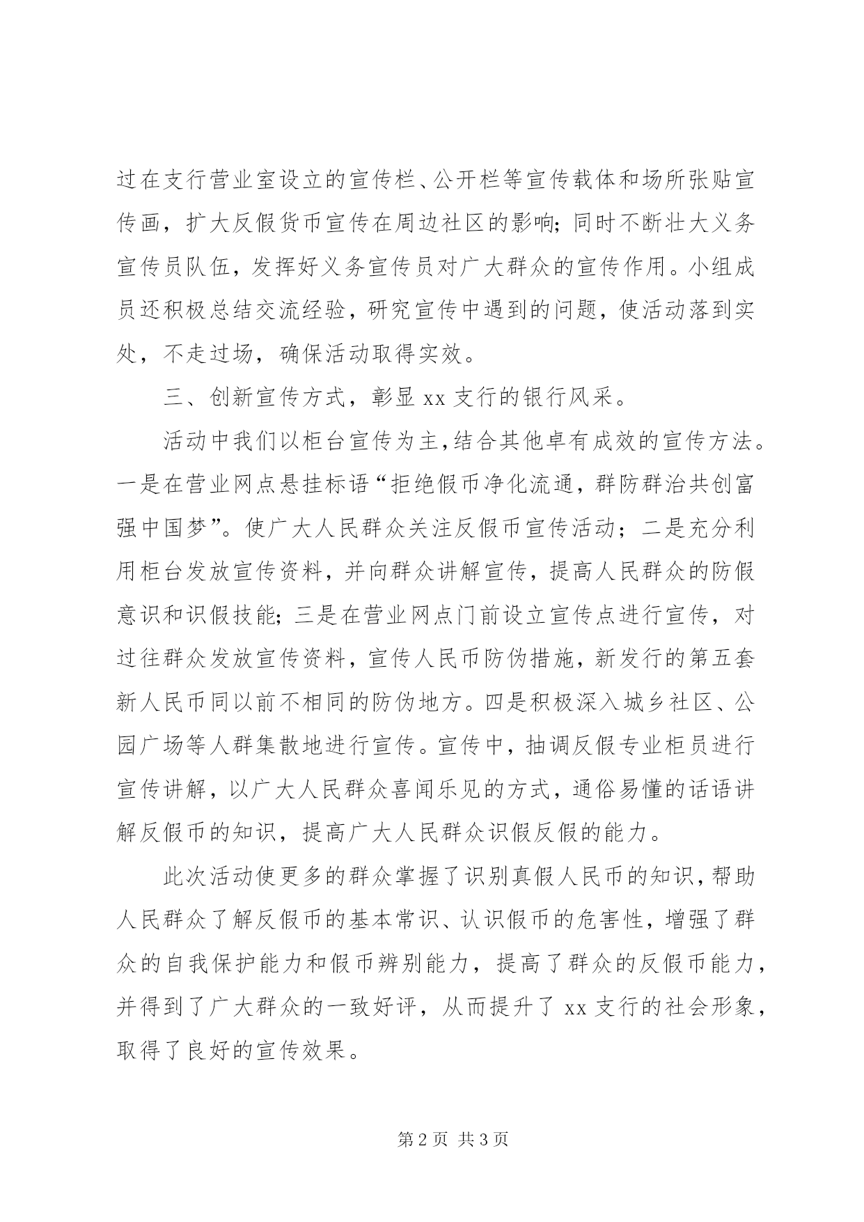 第PAGE\*Arabic\*MERGEFORMAT3页共NUMPAGES\*MERGEFORMAT3页反假货币宣传总结)[范文大全]xx支行反假货币宣传月活动工作汇报总结为进一步提高广大群众的假币鉴别能力和反假币意识,维护社会经济稳定,xx支行于9月在营业网点组织开展了以“拒绝假币净化流通,群防群治共创富强中国梦”“反假货币、人人有责”为主题的反假币“宣传月”活动,积极组织开展了内容丰富、形式多样的反假币宣传活动,全面推进xx支行反假货币工作再上一个新台阶。一、加强组织领导,确保活动顺利开展为加强对反假货币宣传月工作的领导,xx支行高度重视,成立了以行长为组长、支行其他工作人员为组员的反假货币宣传小组,具体负责辖区反假币宣传工作,组织开展形式多样的宣传活动,从而确保此次反假币活动顺利开展。二、加强组织实施,确保活动取得实效。反假币“宣传月”活动主要向广大群众宣传《中华人民共和国人民币管理条列》、《中国人民银行残缺、污损人民币兑换办法》、《中国人民银行假币收缴、鉴定管理办法》等相关法律、法规,人民币基础知识和使用常识,第五套人民币防伪特征及识别方法等内容。支行充分利用宣传月的大好时机,发挥支行宣传工作小组的作用,加快XX县区和农村反假货币宣传网络建设;通过在支行营业室设立的宣传栏、公开栏等宣传载体和场所张贴宣传画,扩大反假货币宣传在周边社区的影响;同时不断壮大义务宣传员队伍,发挥好义务宣传员对广大群众的宣传作用。小组成员还积极总结交流经验,研究宣传中遇到的问题,使活动落到实处,不走过场,确保活动取得实效。三、创新宣传方式,彰显xx支行的银行风采。活动中我们以柜台宣传为主,结合其他卓有成效的宣传方法。一是在营业网点悬挂标语“拒绝假币净化流通,群防群治共创富强中国梦”。使广大人民群众关注反假币宣传活动;二是充分利用柜台发放宣传资料,并向群众讲解宣传,提高人民群众的防假意识和识假技能;三是在营业网点门前设立宣传点进行宣传,对过往群众发放宣传资料,宣传人民币防伪措施,新发行的第五套新人民币同以前不相同的防伪地方。四是积极深入城乡社区、公园广场等人群集散地进行宣传。宣传中,抽调反假专业柜员进行宣传讲解,以广大人民群众喜闻乐见的方式,通俗易懂的话语讲解反假币的知识,提高广大人民群众识假反假的能力。此次活动使更多的群众掌握了识别真假人民币的知识,帮助人民群众了解反假币的基本常识、认识假币的危害性,增强了群众的自我保护能力和假币辨别能力,提高了群众的反假币能力,并得到了广大群众的一致好评,从而提升了xx支行的社会形象,取得了良好的宣传效果。xx支行2015年9月25日