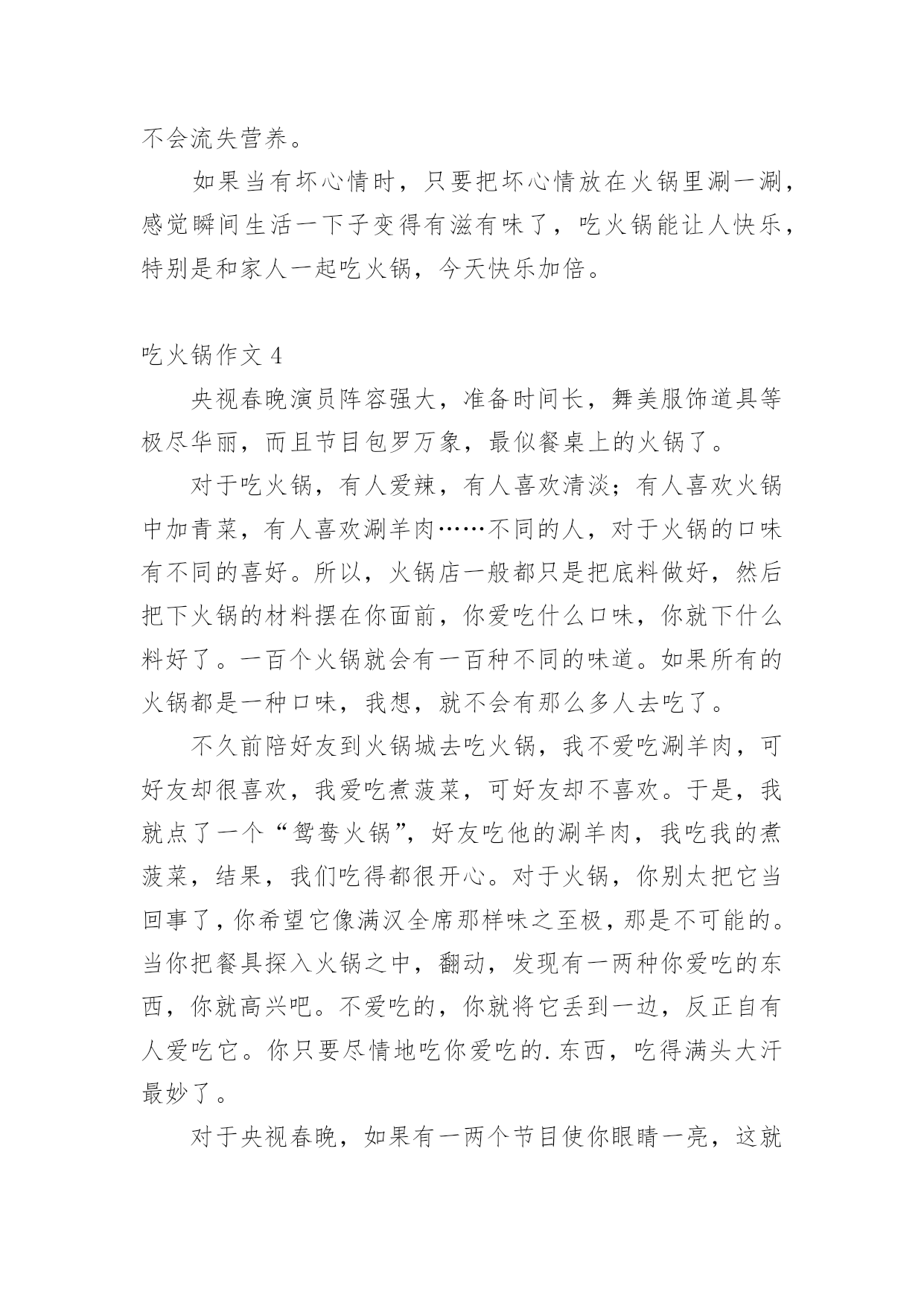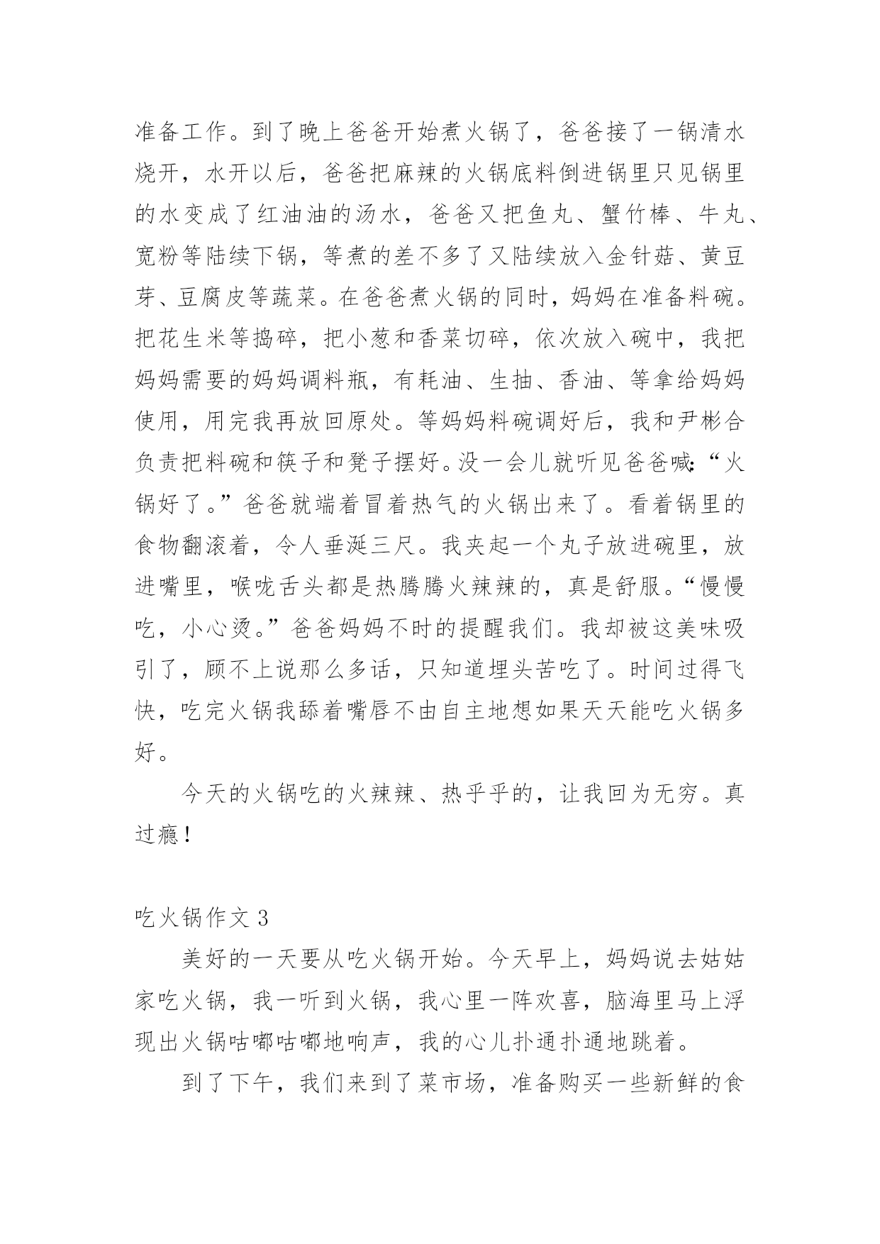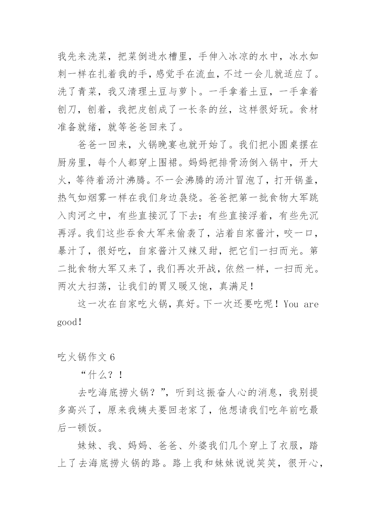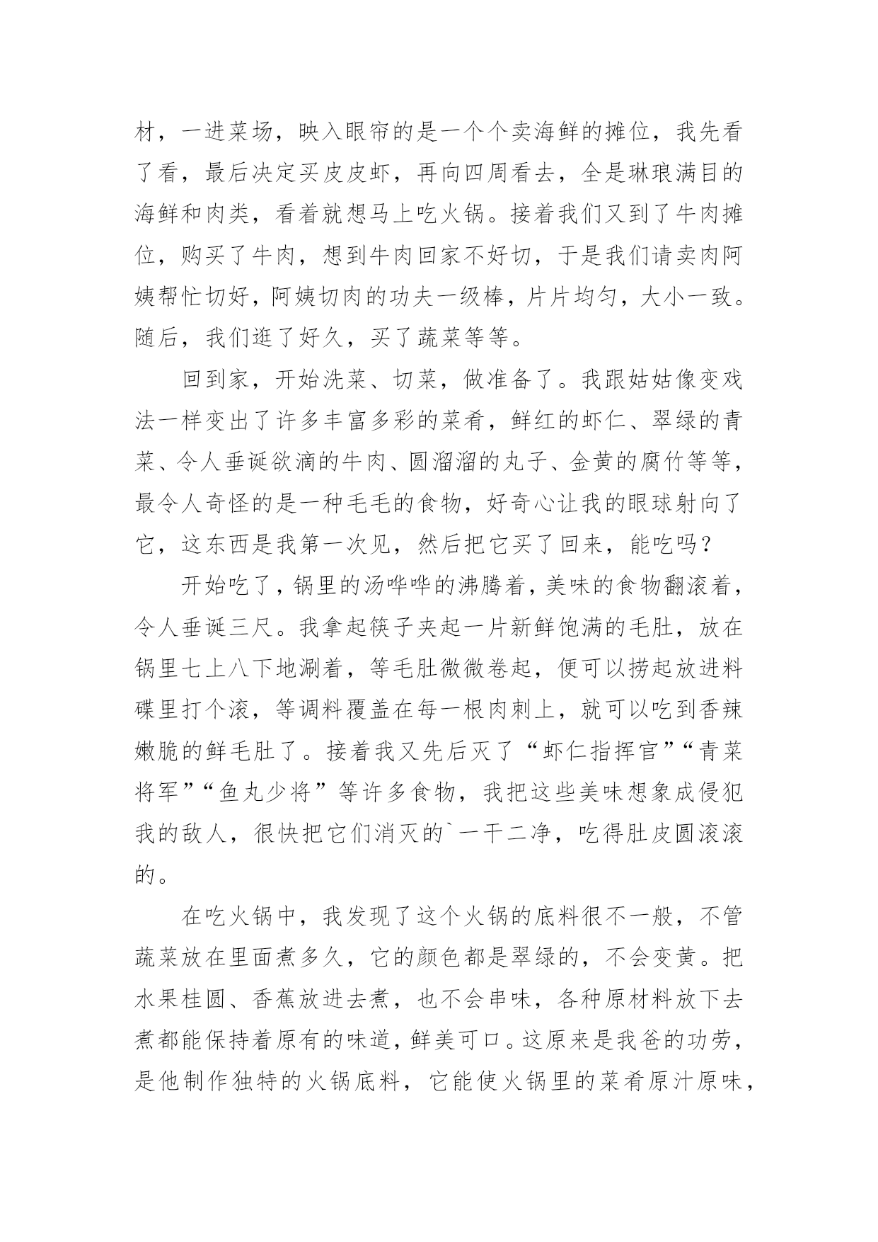 吃火锅作文1吃火锅作文在现实生活或工作学习中,大家或多或少都会接触过作文吧,借助作文人们可以实现文化交流的目的。如何写一篇有思想、有文采的作文呢?以下是小编整理的吃火锅作文,欢迎大家分享。吃火锅作文1火锅是一种中国独有的美食,最为出名的就是重庆火锅,在巴蜀地区,人们最爱的美食就是火锅,现在也已经传遍了全国,甚至是全世界,我最爱吃的美食就是火锅了。作为一名正宗的湖南人,我从小的吃食都是比较辣的,所以我也习惯吃辣了,并且很喜欢吃辣,所以我对于火锅的热爱是非常深沉的,这个周末,听说我家附近新开了一家火锅店,我立马缠着爸爸妈妈一起去吃了。我最喜欢火锅的一点就是可以吃很多种品种,并且都很好吃,我们去吃的火锅店是一家重庆火锅的连锁店,虽然是新开张的,但是人还是很多,爸爸妈妈怕等位,所以我们去的很早,但是还是已经没有位置了,我们等了半个小时才正式开吃。我们点的锅底一上来我就被深深的吸引了,鲜红的颜色一看就很好吃,中间的小锅里面是西红柿的汤底,我趁着点的菜还没上来之前先喝了一碗西红柿的汤底开胃,酸酸的`味道让我一下子就胃口大开了,我感觉我能吃下一头牛。吃火锅最大的一个优点就是上菜快,完全不用等很久,我们一家三口的口味根本对不上,我最爱的是各种豆制品,爸爸最爱的是各种肉类,妈妈最爱的就是各种的蔬菜类,虽然口味对不上,但是最好的就是一下到锅里面觉得什么种类的都好吃,我们一共点的菜看上去不是很多,但是吃到最后已经撑得完全吃不下了。最好吃的就是红薯粉和肥牛,那种滋味想起来都流口水,我们本来点的是一个微辣的锅底,但是迟到最后已经辣的我的嘴巴都已经红彤彤的了,感觉什么压力都没有了,就算快要到期末考试了,我也好像已经忘了考试的压力一样,这也是吃火锅最大的魅力了。朋友们,如果你也爱吃辣,如果你觉得你有很大的压力无处排放,那么就快去吃一顿火锅吧,吃完就可以解决所有问题了。吃火锅作文2今天因为下了阵雨,所以天气格外凉爽。爸爸妈妈正好休息,我好高兴啊!当然令我更高兴的是还迎来了我家的客人,那就是我的同学——尹彬合。妈妈说:“今天天气凉爽,晚上吃火锅吧。”我和尹彬合听了,高兴坏了,不但能吃到喜欢吃的食物,晚上还可以和尹彬合一起睡觉,心里开心极了。首先我和妈妈、尹彬合去市场买吃火锅所需要蔬菜食材。买回食材后,爸爸妈妈把食物该切的切,该洗的.洗,做好准备工作。到了晚上爸爸开始煮火锅了,爸爸接了一锅清水烧开,水开以后,爸爸把麻辣的火锅底料倒进锅里只见锅里的水变成了红油油的汤水,爸爸又把鱼丸、蟹竹棒、牛丸、宽粉等陆续下锅,等煮的差不多了又陆续放入金针菇、黄豆芽、豆腐皮等蔬菜。在爸爸煮火锅的同时,妈妈在准备料碗。把花生米等捣碎,把小葱和香菜切碎,依次放入碗中,我把妈妈需要的妈妈调料瓶,有耗油、生抽、香油、等拿给妈妈使用,用完我再放回原处。等妈妈料碗调好后,我和尹彬合负责把料碗和筷子和凳子摆好。没一会儿就听见爸爸喊:“火锅好了。”爸爸就端着冒着热气的火锅出来了。看着锅里的食物翻滚着,令人垂涎三尺。我夹起一个丸子放进碗里,放进嘴里,喉咙舌头都是热腾腾火辣辣的,真是舒服。“慢慢吃,小心烫。”爸爸妈妈不时的提醒我们。我却被这美味吸引了,顾不上说那么多话,只知道埋头苦吃了。时间过得飞快,吃完火锅我舔着嘴唇不由自主地想如果天天能吃火锅多好。今天的火锅吃的火辣辣、热乎乎的,让我回为无穷。真过瘾!吃火锅作文3美好的一天要从吃火锅开始。今天早上,妈妈说去姑姑家吃火锅,我一听到火锅,我心里一阵欢喜,脑海里马上浮现出火锅咕嘟咕嘟地响声,我的心儿扑通扑通地跳着。到了下午,我们来到了菜市场,准备购买一些新鲜的食材,一进菜场,映入眼帘的是一个个卖海鲜的摊位,我先看了看,最后决定买皮皮虾,再向四周看去,全是琳琅满目的海鲜和肉类,看着就想马上吃火锅。接着我们又到了牛肉摊位,购买了牛肉,想到牛肉回家不好切,于是我们请卖肉阿姨帮忙切好,阿姨切肉的功夫一级棒,片片均匀,大小一致。随后,我们逛了好久,买了蔬菜等等。回到家,开始洗菜、切菜,做准备了。我跟姑姑像变戏法一样变出了许多丰富多彩的菜肴,鲜红的虾仁、翠绿的青菜、令人垂诞欲滴的牛肉、圆溜溜的丸子、金黄的腐竹等等,最令人奇怪的是一种毛毛的食物,好奇心让我的眼球射向了它,这东西是我第一次见,然后把它买了回来,能吃吗?开始吃了,锅里的汤哗哗的沸腾着,美味的食物翻滚着,令人垂诞三尺。我拿起筷子夹起一片新鲜饱满的毛肚,放在锅里七上八下地涮着,等毛肚微微卷起,便可以捞起放进料碟里打个滚,等调料覆盖在每一根肉刺上,就可以吃到香辣嫩脆的鲜毛肚了。接着我又先后灭了“虾仁指挥官”“青菜将军”“鱼丸少将”等许多食物,我把这些美味想象成侵犯我的敌人,很快把它们消灭的`一干二净,吃得肚皮圆滚滚的。在吃火锅中,我发现了这个火锅的底料很不一般,不管蔬菜放在里面煮多久,它的颜色都是翠绿的,