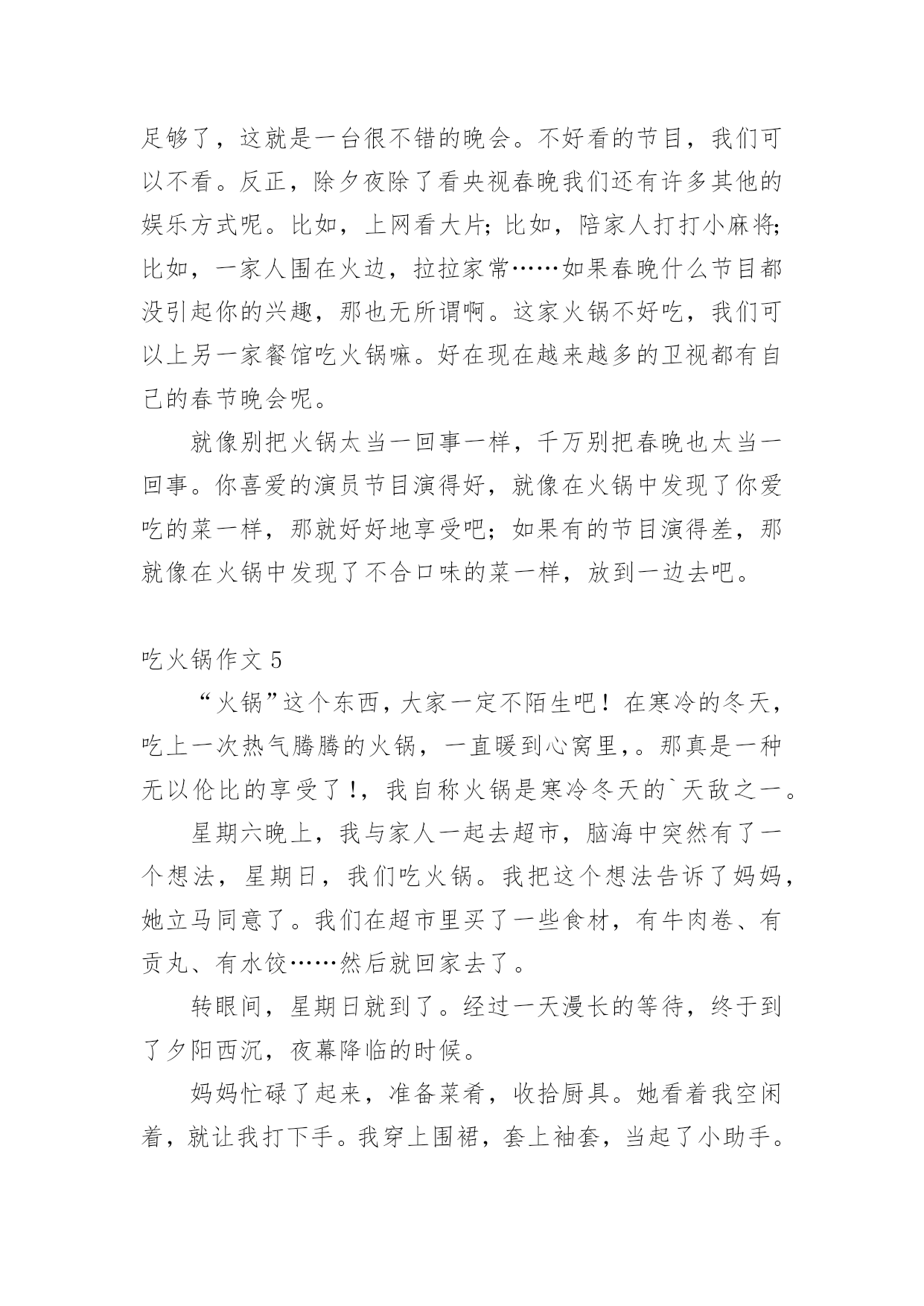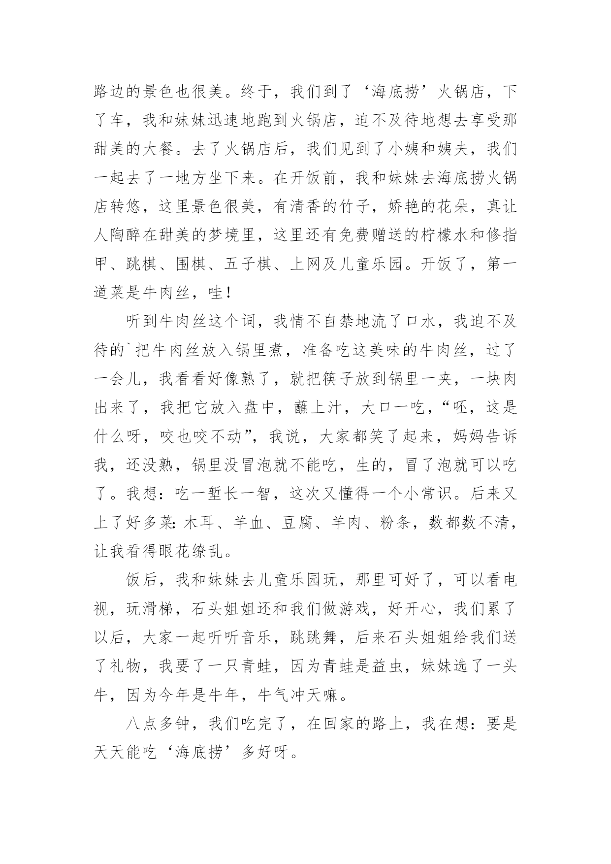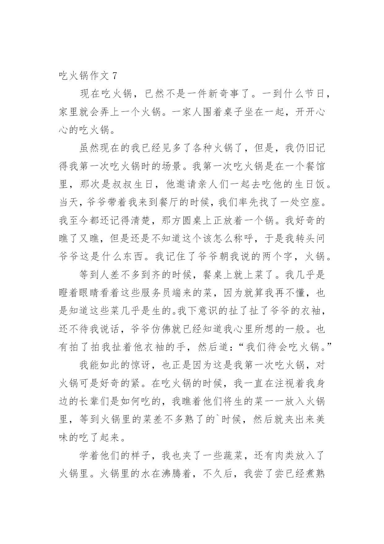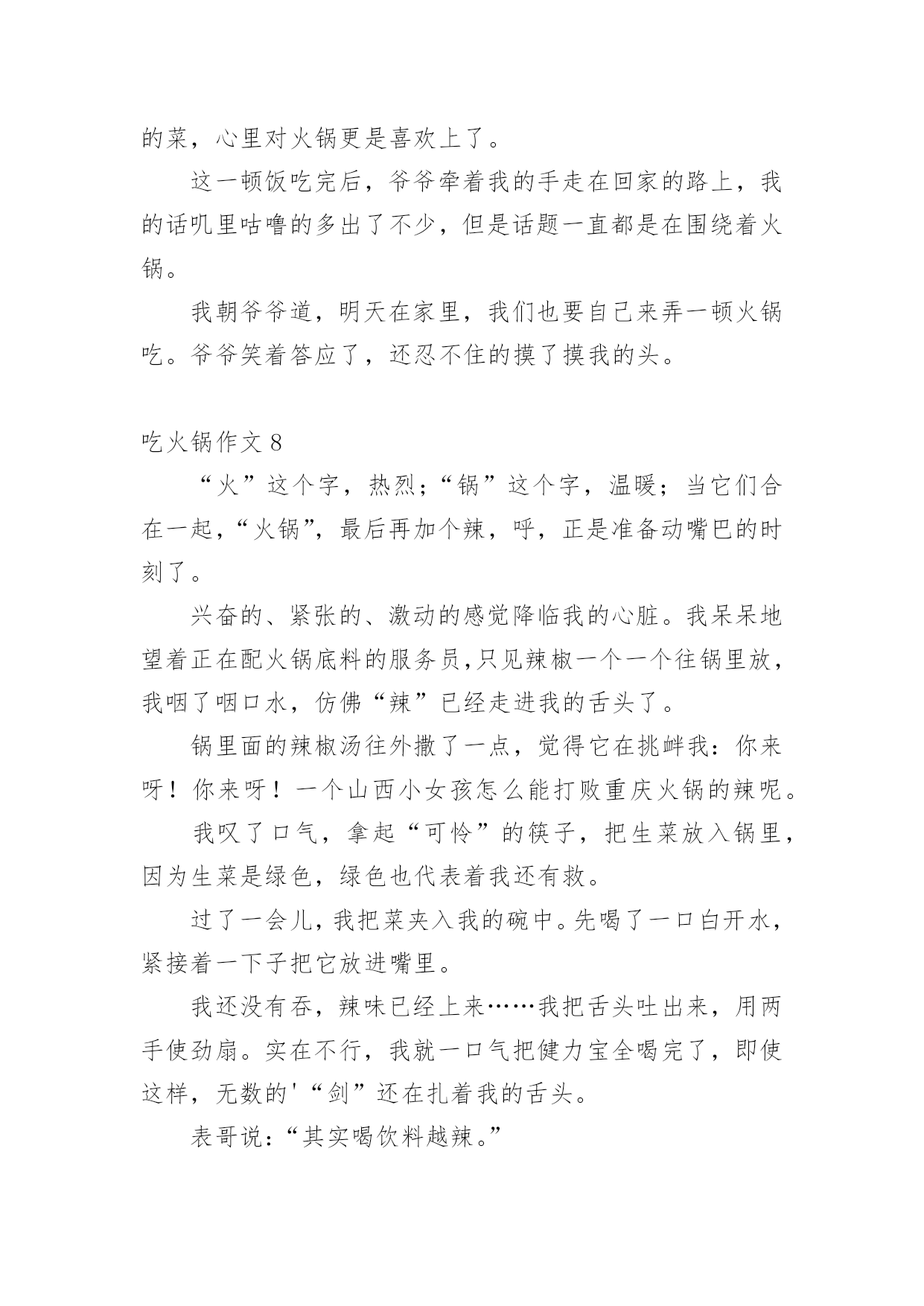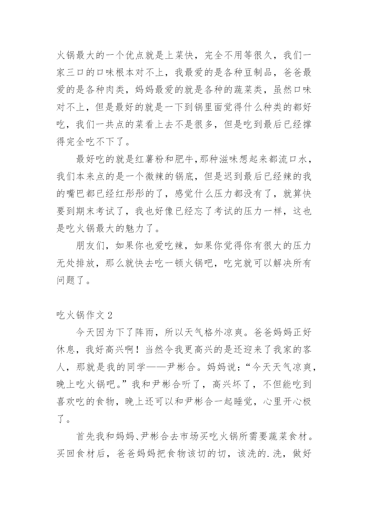 吃火锅作文1吃火锅作文在现实生活或工作学习中,大家或多或少都会接触过作文吧,借助作文人们可以实现文化交流的目的。如何写一篇有思想、有文采的作文呢?以下是小编整理的吃火锅作文,欢迎大家分享。吃火锅作文1火锅是一种中国独有的美食,最为出名的就是重庆火锅,在巴蜀地区,人们最爱的美食就是火锅,现在也已经传遍了全国,甚至是全世界,我最爱吃的美食就是火锅了。作为一名正宗的湖南人,我从小的吃食都是比较辣的,所以我也习惯吃辣了,并且很喜欢吃辣,所以我对于火锅的热爱是非常深沉的,这个周末,听说我家附近新开了一家火锅店,我立马缠着爸爸妈妈一起去吃了。我最喜欢火锅的一点就是可以吃很多种品种,并且都很好吃,我们去吃的火锅店是一家重庆火锅的连锁店,虽然是新开张的,但是人还是很多,爸爸妈妈怕等位,所以我们去的很早,但是还是已经没有位置了,我们等了半个小时才正式开吃。我们点的锅底一上来我就被深深的吸引了,鲜红的颜色一看就很好吃,中间的小锅里面是西红柿的汤底,我趁着点的菜还没上来之前先喝了一碗西红柿的汤底开胃,酸酸的`味道让我一下子就胃口大开了,我感觉我能吃下一头牛。吃火锅最大的一个优点就是上菜快,完全不用等很久,我们一家三口的口味根本对不上,我最爱的是各种豆制品,爸爸最爱的是各种肉类,妈妈最爱的就是各种的蔬菜类,虽然口味对不上,但是最好的就是一下到锅里面觉得什么种类的都好吃,我们一共点的菜看上去不是很多,但是吃到最后已经撑得完全吃不下了。最好吃的就是红薯粉和肥牛,那种滋味想起来都流口水,我们本来点的是一个微辣的锅底,但是迟到最后已经辣的我的嘴巴都已经红彤彤的了,感觉什么压力都没有了,就算快要到期末考试了,我也好像已经忘了考试的压力一样,这也是吃火锅最大的魅力了。朋友们,如果你也爱吃辣,如果你觉得你有很大的压力无处排放,那么就快去吃一顿火锅吧,吃完就可以解决所有问题了。吃火锅作文2今天因为下了阵雨,所以天气格外凉爽。爸爸妈妈正好休息,我好高兴啊!当然令我更高兴的是还迎来了我家的客人,那就是我的同学——尹彬合。妈妈说:“今天天气凉爽,晚上吃火锅吧。”我和尹彬合听了,高兴坏了,不但能吃到喜欢吃的食物,晚上还可以和尹彬合一起睡觉,心里开心极了。首先我和妈妈、尹彬合去市场买吃火锅所需要蔬菜食材。买回食材后,爸爸妈妈把食物该切的切,该洗的.洗,做好准备工作。到了晚上爸爸开始煮火锅了,爸爸接了一锅清水烧开,水开以后,爸爸把麻辣的火锅底料倒进锅里只见锅里的水变成了红油油的汤水,爸爸又把鱼丸、蟹竹棒、牛丸、宽粉等陆续下锅,等煮的差不多了又陆续放入金针菇、黄豆芽、豆腐皮等蔬菜。在爸爸煮火锅的同时,妈妈在准备料碗。把花生米等捣碎,把小葱和香菜切碎,依次放入碗中,我把妈妈需要的妈妈调料瓶,有耗油、生抽、香油、等拿给妈妈使用,用完我再放回原处。等妈妈料碗调好后,我和尹彬合负责把料碗和筷子和凳子摆好。没一会儿就听见爸爸喊:“火锅好了。”爸爸就端着冒着热气的火锅出来了。看着锅里的食物翻滚着,令人垂涎三尺。我夹起一个丸子放进碗里,放进嘴里,喉咙舌头都是热腾腾火辣辣的,真是舒服。“慢慢吃,小心烫。”爸爸妈妈不时的提醒我们。我却被这美味吸引了,顾不上说那么多话,只知道埋头苦吃了。时间过得飞快,吃完火锅我舔着嘴唇不由自主地想如果天天能吃火锅多好。今天的火锅吃的火辣辣、热乎乎的,让我回为无穷。真过瘾!吃火锅作文3美好的一天要从吃火锅开始。今天早上,妈妈说去姑姑家吃火锅,我一听到火锅,我心里一阵欢喜,脑海里马上浮现出火锅咕嘟咕嘟地响声,我的心儿扑通扑通地跳着。到了下午,我们来到了菜市场,准备购买一些新鲜的食材,一进菜场,映入眼帘的是一个个卖海鲜的摊位,我先看了看,最后决定买皮皮虾,再向四周看去,全是琳琅满目的海鲜和肉类,看着就想马上吃火锅。接着我们又到了牛肉摊位,购买了牛肉,想到牛肉回家不好切,于是我们请卖肉阿姨帮忙切好,阿姨切肉的功夫一级棒,片片均匀,大小一致。随后,我们逛了好久,买了蔬菜等等。回到家,开始洗菜、切菜,做准备了。我跟姑姑像变戏法一样变出了许多丰富多彩的菜肴,鲜红的虾仁、翠绿的青菜、令人垂诞欲滴的牛肉、圆溜溜的丸子、金黄的腐竹等等,最令人奇怪的是一种毛毛的食物,好奇心让我的眼球射向了它,这东西是我第一次见,然后把它买了回来,能吃吗?开始吃了,锅里的汤哗哗的沸腾着,美味的食物翻滚着,令人垂诞三尺。我拿起筷子夹起一片新鲜饱满的毛肚,放在锅里七上八下地涮着,等毛肚微微卷起,便可以捞起放进料碟里打个滚,等调料覆盖在每一根肉刺上,就可以吃到香辣嫩脆的鲜毛肚了。接着我又先后灭了“虾仁指挥官”“青菜将军”“鱼丸少将”等许多食物,我把这些美味想象成侵犯我的敌人,很快把它们消灭的`一干二净,吃得肚皮圆滚滚的。在吃火锅中,我发现了这个火锅的底料很不一般,不管蔬菜放在里面煮多久,它的颜色都是翠绿的,