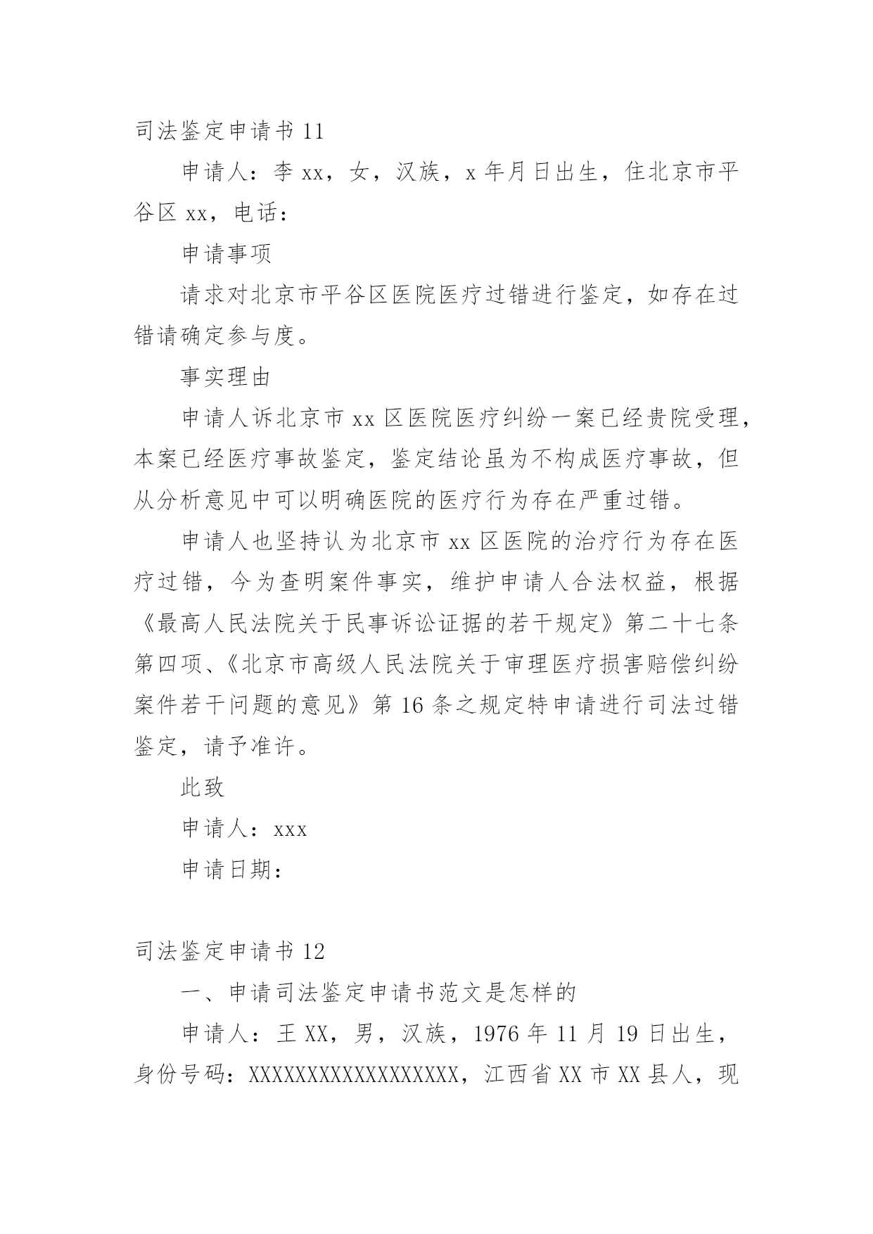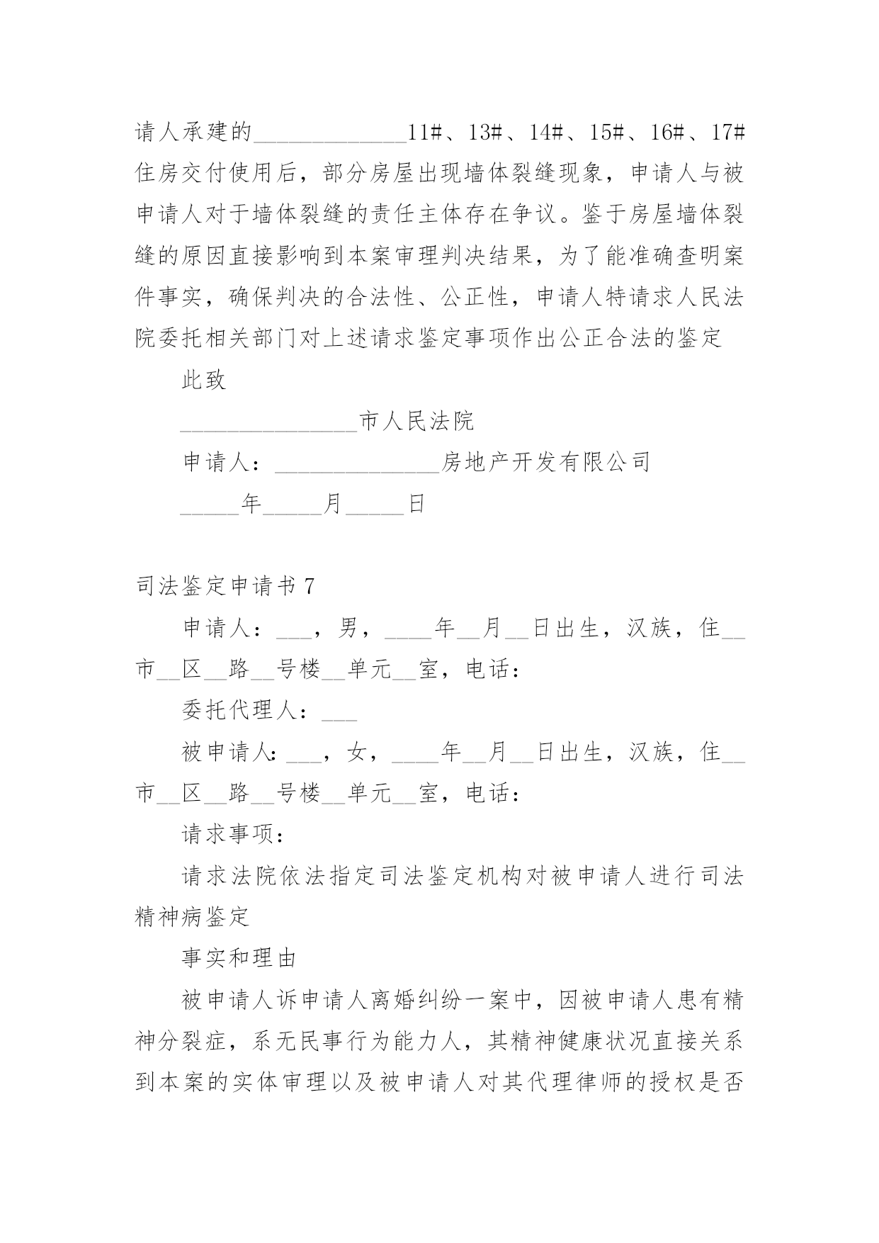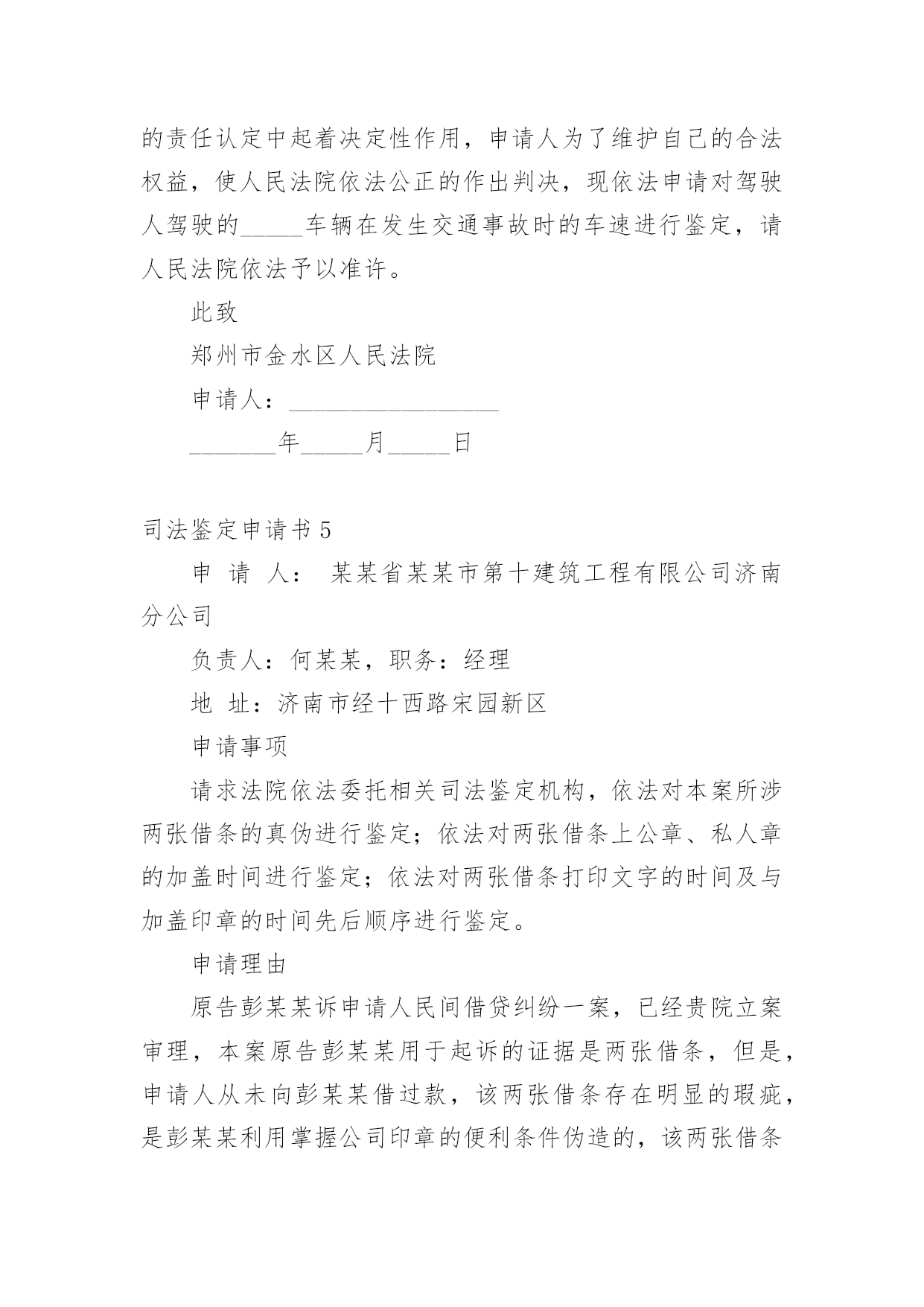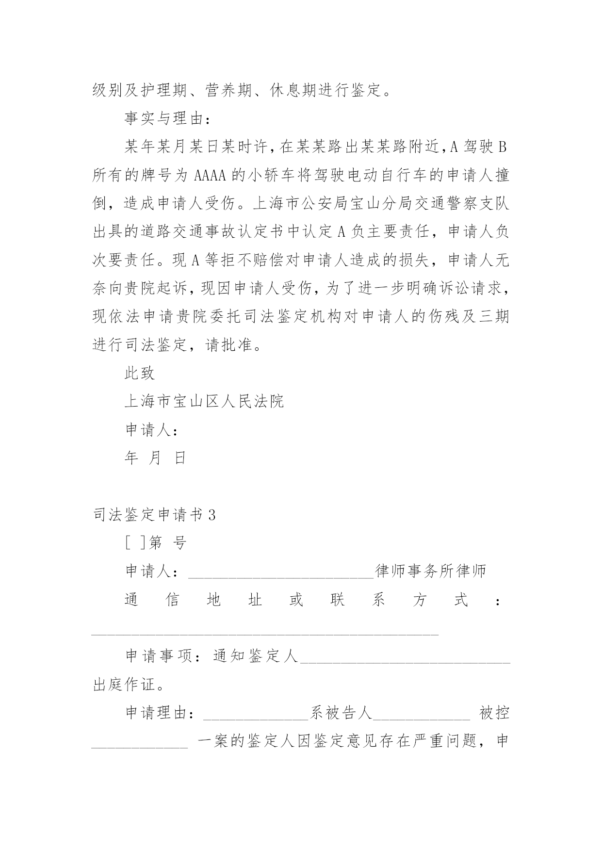 司法鉴定申请书司法鉴定申请书汇编15篇在当今社会生活中,有各项事务需要申请书,申请书是承载我们愿望和请求的专用书信。什么样的申请书才是合理的呢?以下是小编精心整理的司法鉴定申请书,仅供参考,大家一起来看看吧。司法鉴定申请书1申请人:_______________住址:_______________请求事项:_______________请求人民法院依法指定司法鉴定机构对申请人的后续医疗费进行鉴定。事实和理由:此致_______________人民法院申请人:______________________________年_______________月_______________日司法鉴定申请书2申请人:申请事项:请求法院委托司法鉴定机构对申请人的伤残级别及护理期、营养期、休息期进行鉴定。事实与理由:某年某月某日某时许,在某某路出某某路附近,A驾驶B所有的牌号为AAAA的小轿车将驾驶电动自行车的申请人撞倒,造成申请人受伤。上海市公安局宝山分局交通警察支队出具的道路交通事故认定书中认定A负主要责任,申请人负次要责任。现A等拒不赔偿对申请人造成的损失,申请人无奈向贵院起诉,现因申请人受伤,为了进一步明确诉讼请求,现依法申请贵院委托司法鉴定机构对申请人的伤残及三期进行司法鉴定,请批准。此致上海市宝山区人民法院申请人:年月日司法鉴定申请书3[]第号申请人:_______________________律师事务所律师通信地址或联系方式:___________________________________________申请事项:通知鉴定人__________________________出庭作证。申请理由:_____________系被告人____________被控____________一案的鉴定人因鉴定意见存在严重问题,申请人认为需要鉴定人出庭作证。根据据《中华人民共和国刑事诉讼法》第一百八十七条的规定,特提出申请。此致_______________________________人民法院申请人签名:(律师事务所盖章)年月日附:鉴定人地址、联系方式:_________________________司法鉴定申请书4申请人:______________,男,汉族,__________年__________月__________日出生,住__________。申请事项:请求人民法院依法委托鉴定机构对_____驾驶的_____车辆在发生交通事故时的车速进行鉴定。申请理由:申请人与__________等人交通事故损害赔偿纠纷一案,现由你院审理。该交通事故是因对方司机无证驾驶、疲劳驾驶、严重超载、超速、违法变道等多种原告造成的,根据交警部门制作的事故现场图来看,两车相撞点到对方车辆停车地点的距离,长达66米,根据物理学常识,在有事故车辆的起始距离等条件的情况下,用普通的物理学知识,就可以计算出车辆的速度。鉴于本案对方司机超速行驶,在该事故的责任认定中起着决定性作用,申请人为了维护自己的合法权益,使人民法院依法公正的作出判决,现依法申请对驾驶人驾驶的_____车辆在发生交通事故时的车速进行鉴定,请人民法院依法予以准许。此致郑州市金水区人民法院申请人:________________________年_____月_____日司法鉴定申请书5申请人:某某省某某市第十建筑工程有限公司济南分公司负责人:何某某,职务:经理地址:济南市经十西路宋园新区申请事项请求法院依法委托相关司法鉴定机构,依法对本案所涉两张借条的真伪进行鉴定;依法对两张借条上公章、私人章的加盖时间进行鉴定;依法对两张借条打印文字的时间及与加盖印章的时间先后顺序进行鉴定。申请理由原告彭某某诉申请人民间借贷纠纷一案,已经贵院立案审理,本案原告彭某某用于起诉的证据是两张借条,但是,申请人从未向彭某某借过款,该两张借条存在明显的瑕疵,是彭某某利用掌握公司印章的便利条件伪造的,该两张借条不能作为法院认定案件事实的证据。所以,申请人特依法提出鉴定申请,请求贵院依法委托相关司法鉴定机构对本案所涉两张借条的真实性进行鉴定,以便于法院查清案件事实,作出公正的判决。此致济南市槐荫区人民法院申请人司法鉴定申请书6申请人:_____________房地产开发有限公司住所地:______________市_______________路_______________三楼。法定代表人:______________董事长被申请人:_________________河南_______________建设集团有限公司住所地:_________________河南省__________市__________区__________路西段。法定代表人:______________董事长申请事项:__________