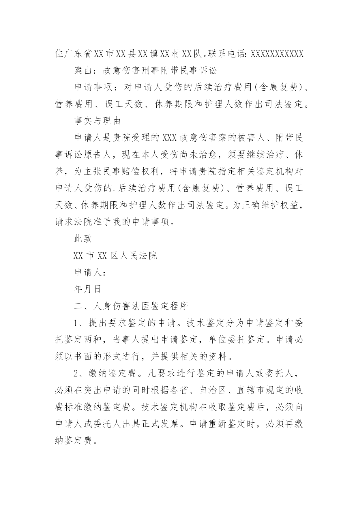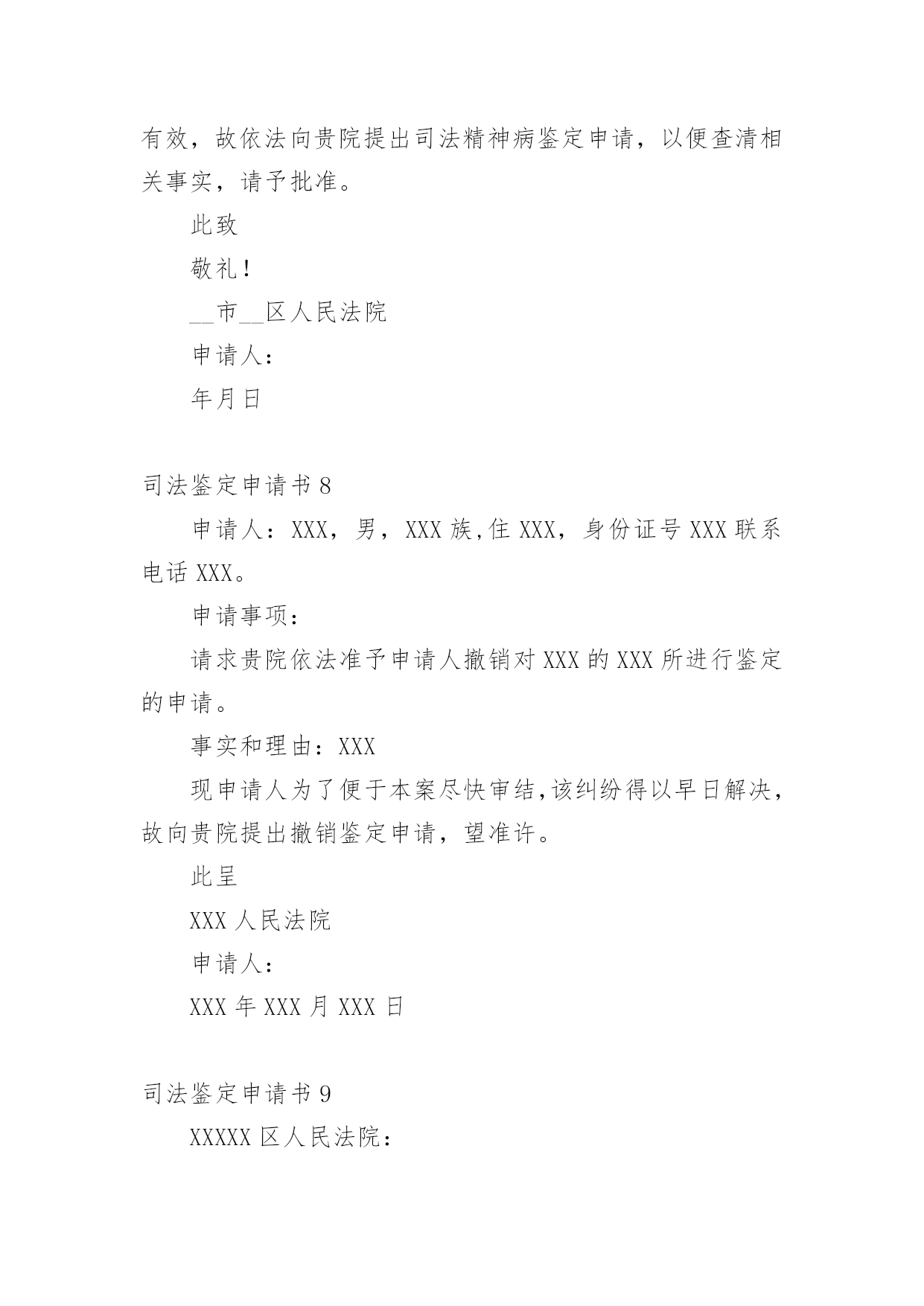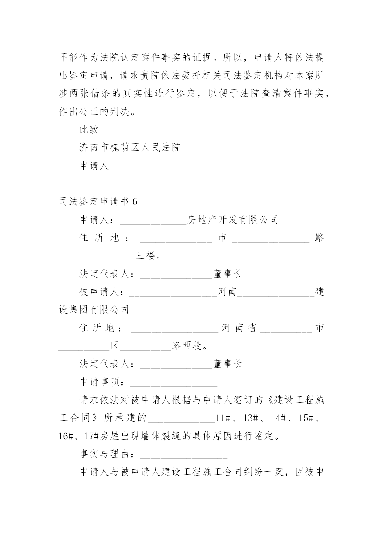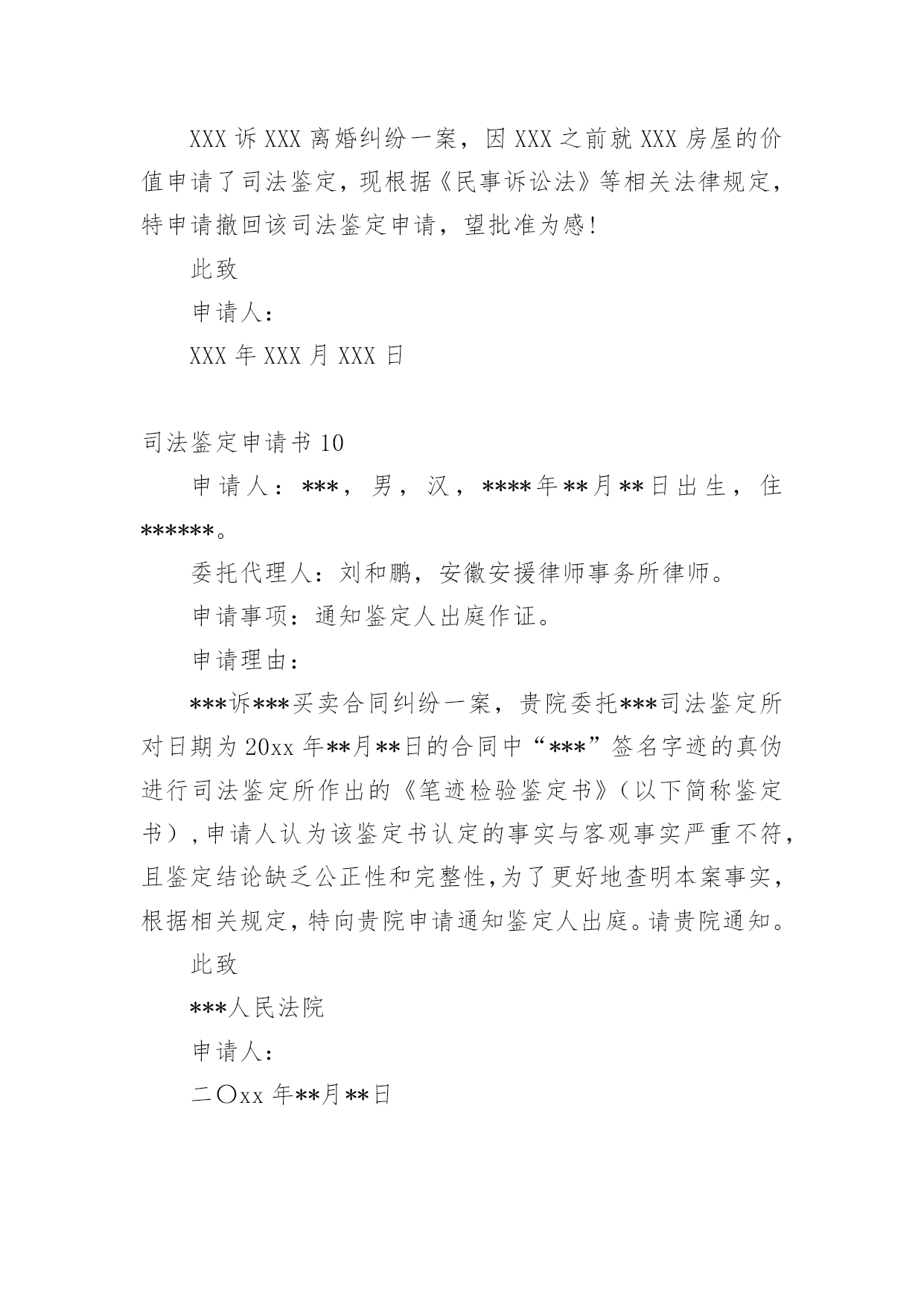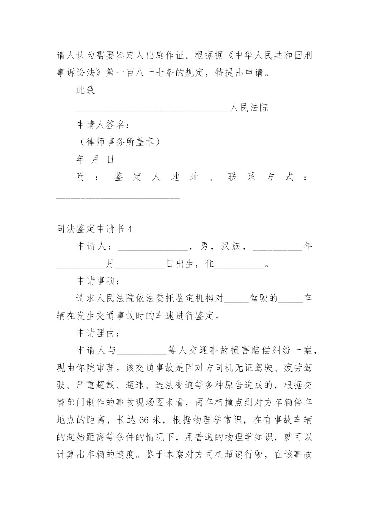 司法鉴定申请书司法鉴定申请书汇编15篇在当今社会生活中,有各项事务需要申请书,申请书是承载我们愿望和请求的专用书信。什么样的申请书才是合理的呢?以下是小编精心整理的司法鉴定申请书,仅供参考,大家一起来看看吧。司法鉴定申请书1申请人:_______________住址:_______________请求事项:_______________请求人民法院依法指定司法鉴定机构对申请人的后续医疗费进行鉴定。事实和理由:此致_______________人民法院申请人:______________________________年_______________月_______________日司法鉴定申请书2申请人:申请事项:请求法院委托司法鉴定机构对申请人的伤残级别及护理期、营养期、休息期进行鉴定。事实与理由:某年某月某日某时许,在某某路出某某路附近,A驾驶B所有的牌号为AAAA的小轿车将驾驶电动自行车的申请人撞倒,造成申请人受伤。上海市公安局宝山分局交通警察支队出具的道路交通事故认定书中认定A负主要责任,申请人负次要责任。现A等拒不赔偿对申请人造成的损失,申请人无奈向贵院起诉,现因申请人受伤,为了进一步明确诉讼请求,现依法申请贵院委托司法鉴定机构对申请人的伤残及三期进行司法鉴定,请批准。此致上海市宝山区人民法院申请人:年月日司法鉴定申请书3[]第号申请人:_______________________律师事务所律师通信地址或联系方式:___________________________________________申请事项:通知鉴定人__________________________出庭作证。申请理由:_____________系被告人____________被控____________一案的鉴定人因鉴定意见存在严重问题,申请人认为需要鉴定人出庭作证。根据据《中华人民共和国刑事诉讼法》第一百八十七条的规定,特提出申请。此致_______________________________人民法院申请人签名:(律师事务所盖章)年月日附:鉴定人地址、联系方式:_________________________司法鉴定申请书4申请人:______________,男,汉族,__________年__________月__________日出生,住__________。申请事项:请求人民法院依法委托鉴定机构对_____驾驶的_____车辆在发生交通事故时的车速进行鉴定。申请理由:申请人与__________等人交通事故损害赔偿纠纷一案,现由你院审理。该交通事故是因对方司机无证驾驶、疲劳驾驶、严重超载、超速、违法变道等多种原告造成的,根据交警部门制作的事故现场图来看,两车相撞点到对方车辆停车地点的距离,长达66米,根据物理学常识,在有事故车辆的起始距离等条件的情况下,用普通的物理学知识,就可以计算出车辆的速度。鉴于本案对方司机超速行驶,在该事故的责任认定中起着决定性作用,申请人为了维护自己的合法权益,使人民法院依法公正的作出判决,现依法申请对驾驶人驾驶的_____车辆在发生交通事故时的车速进行鉴定,请人民法院依法予以准许。此致郑州市金水区人民法院申请人:________________________年_____月_____日司法鉴定申请书5申请人:某某省某某市第十建筑工程有限公司济南分公司负责人:何某某,职务:经理地址:济南市经十西路宋园新区申请事项请求法院依法委托相关司法鉴定机构,依法对本案所涉两张借条的真伪进行鉴定;依法对两张借条上公章、私人章的加盖时间进行鉴定;依法对两张借条打印文字的时间及与加盖印章的时间先后顺序进行鉴定。申请理由原告彭某某诉申请人民间借贷纠纷一案,已经贵院立案审理,本案原告彭某某用于起诉的证据是两张借条,但是,申请人从未向彭某某借过款,该两张借条存在明显的瑕疵,是彭某某利用掌握公司印章的便利条件伪造的,该两张借条不能作为法院认定案件事实的证据。所以,申请人特依法提出鉴定申请,请求贵院依法委托相关司法鉴定机构对本案所涉两张借条的真实性进行鉴定,以便于法院查清案件事实,作出公正的判决。此致济南市槐荫区人民法院申请人司法鉴定申请书6申请人:_____________房地产开发有限公司住所地:______________市_______________路_______________三楼。法定代表人:______________董事长被申请人:_________________河南_______________建设集团有限公司住所地:_________________河南省__________市__________区__________路西段。法定代表人:______________董事长申请事项:__________
