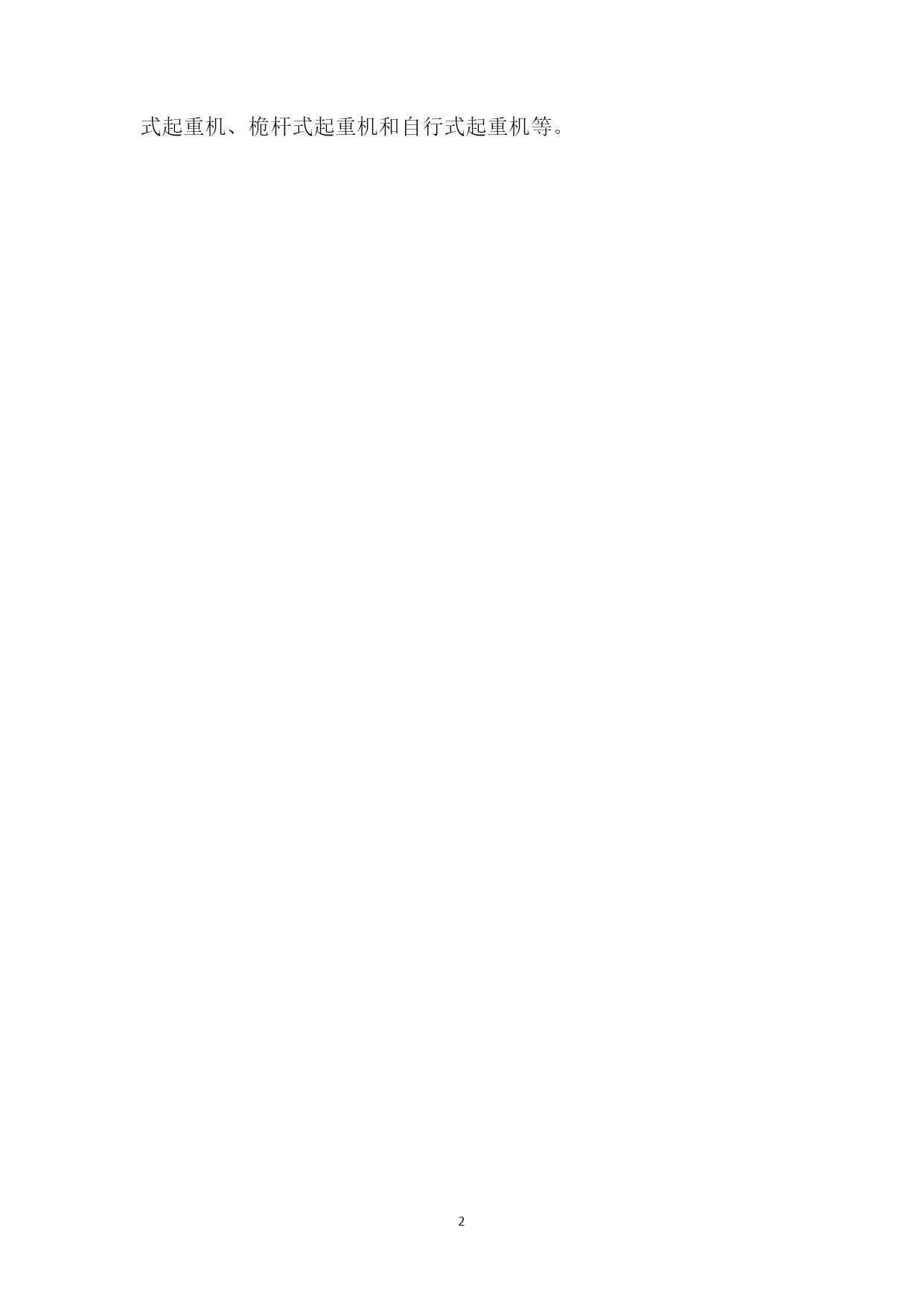 PAGEPAGE2起重运输机械的分类起重运输机械是机械、冶金、化工、矿山、林业等企业,以及在人类生活、生产活动中以间歇、重复的工作方式,通过吊钩或其他吊具起升、搬运物料的一种危险因素较大的特种机械设备。起重运输形式多样,种类繁多,按其结构和用途可分为起重机具(简单起重机械)和起重机两大类。起重机具具有以下几类:(1)千斤顶,分为齿条千斤机、螺旋千斤顶、液压千斤顶和气压千斤顶等。(2)葫芦,分为手动葫芦、电动葫芦和气动葫芦等。(3)卷扬机,分为手动卷扬机、电动卷扬机等。(4)升降机,分为电梯、货用电梯和建筑升降机等。(5)扒杆,分为独脚扒人字扒杆和龙门扒杆等。起重机可根据产品的结构、用途和国内生产管理上的习惯,分为两大类。(1)桥式类型,分为桥式起重机、龙门起重机、装卸桥、缆索起重机和桥式缆索起重机。(2)旋转式类型,分为塔式起重机、门座式起重机、浮船式起重机、桅杆式起重机和自行式起重机等。