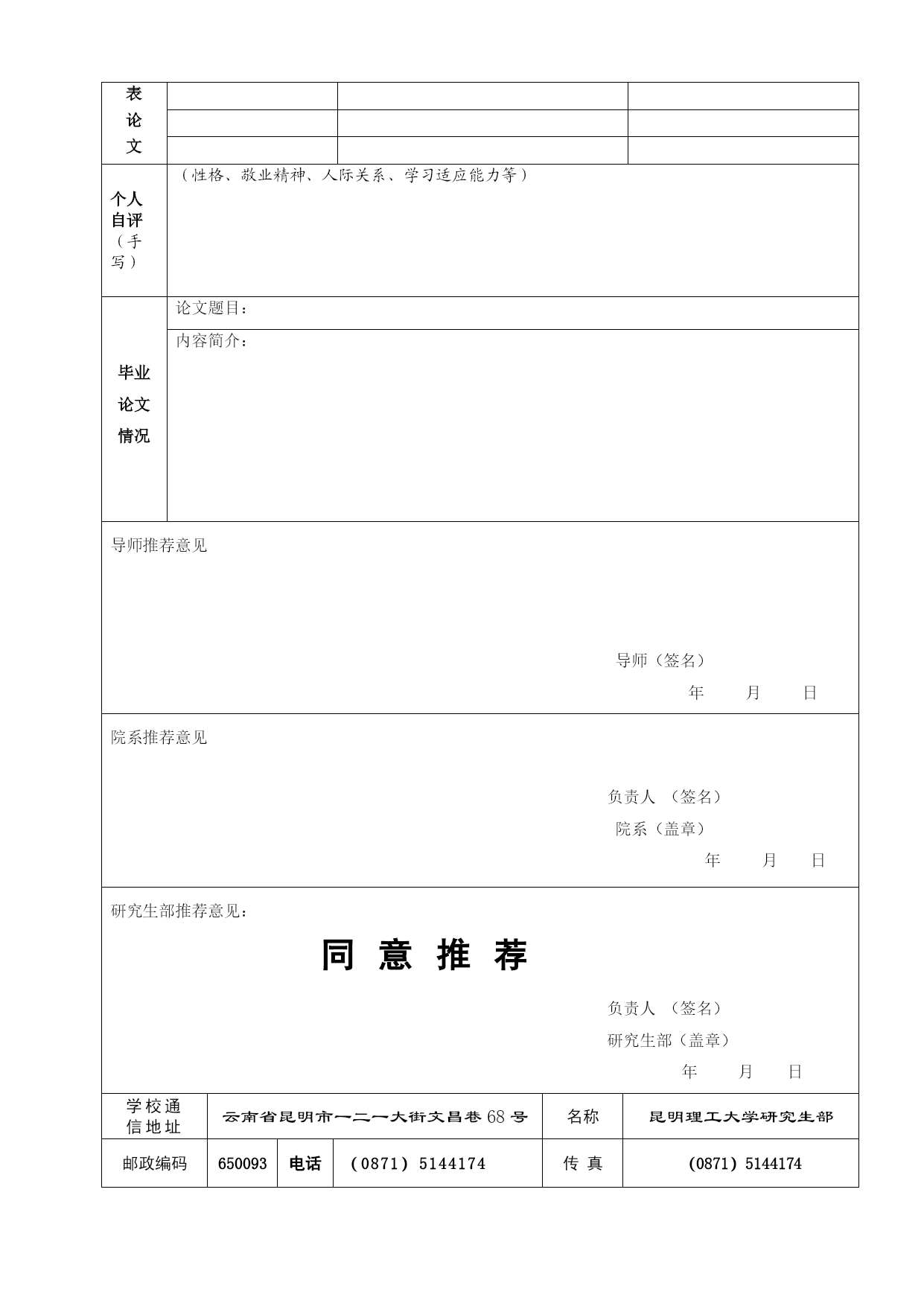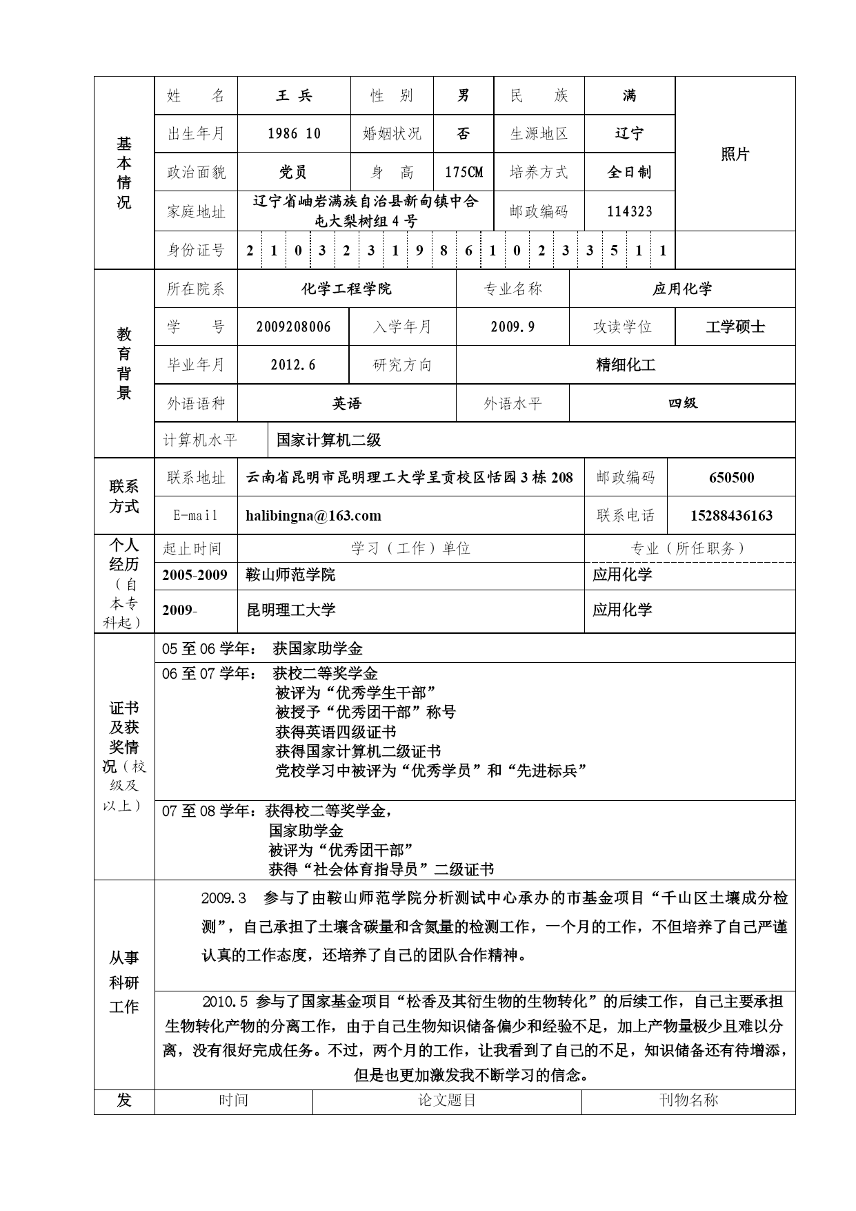 毕业研究生就业推荐表姓名王兵专业应用化学研究方向精细化工攻读学位工学硕士手机15288436163E-mailhalibingna@163.com时间年月日基本情况姓名王兵性别男民族满照片出生年月198610婚姻状况否生源地区辽宁政治面貌党员身高175CM培养方式全日制家庭地址辽宁省岫岩满族自治县新甸镇中合屯大梨树组4号邮政编码114323身份证号210323198610233511教育背景所在院系化学工程学院专业名称应用化学学号2009208006入学年月2009.9攻读学位工学硕士毕业年月2012.6研究方向精细化工外语语种英语外语水平四级计算机水平国家计算机二级联系方式联系地址云南省昆明市昆明理工大学呈贡校区恬园3栋208邮政编码650500E-mailhalibingna@163.com联系电话15288436163个人经历(自本专科起)起止时间学习(工作)单位专业(所任职务)2005-2009鞍山师范学院应用化学2009-昆明理工大学应用化学证书及获奖情况(校级及以上)05至06学年:获国家助学金06至07学年:获校二等奖学金被评为“优秀学生干部”被授予“优秀团干部”称号获得英语四级证书获得国家计算机二级证书党校学习中被评为“优秀学员”和“先进标兵”07至08学年:获得校二等奖学金,国家助学金被评为“优秀团干部”获得“社会体育指导员”二级证书从事科研工作2009.3参与了由鞍山师范学院分析测试中心承办的市基金项目“千山区土壤成分检测”,自己承担了土壤含碳量和含氮量的检测工作,一个月的工作,不但培养了自己严谨认真的工作态度,还培养了自己的团队合作精神。2010.5参与了国家基金项目“松香及其衍生物的生物转化”的后续工作,自己主要承担生物转化产物的分离工作,由于自己生物知识储备偏少和经验不足,加上产物量极少且难以分离,没有很好完成任务。不过,两个月的工作,让我看到了自己的不足,知识储备还有待增添,但是也更加激发我不断学习的信念。发表论文时间论文题目刊物名称个人自评(手写)(性格、敬业精神、人际关系、学习适应能力等)毕业论文情况论文题目:内容简介:导师推荐意见导师(签名)年月日院系推荐意见负责人(签名)院系(盖章)年月日研究生部推荐意见:同意推荐负责人(签名)研究生部(盖章)年月日学校通信地址云南省昆明市一二一大街文昌巷68号名称昆明理工大学研究生部邮政编码650093电话(0871)5144174传真(0871)5144174备注;1、用人单位若同意接收毕业研究生请签署《毕业研究生就业协议书》,或将加盖人事部门公章的正式接收公函发往学校,并详细注明联系电话及档案接收地址:××省××市××路××(单位)××部门。2、若不同意接收毕业研究生,请尽快通知研究生本人,以便其另行择业。3、该推荐表第2、3页需双面打印方有效。制表:研究生部党委研工办时间:2007年9月30日贴成绩单(研究生部培养办盖章)