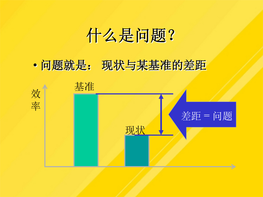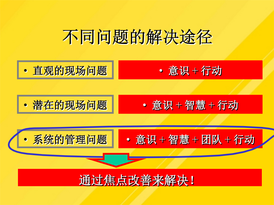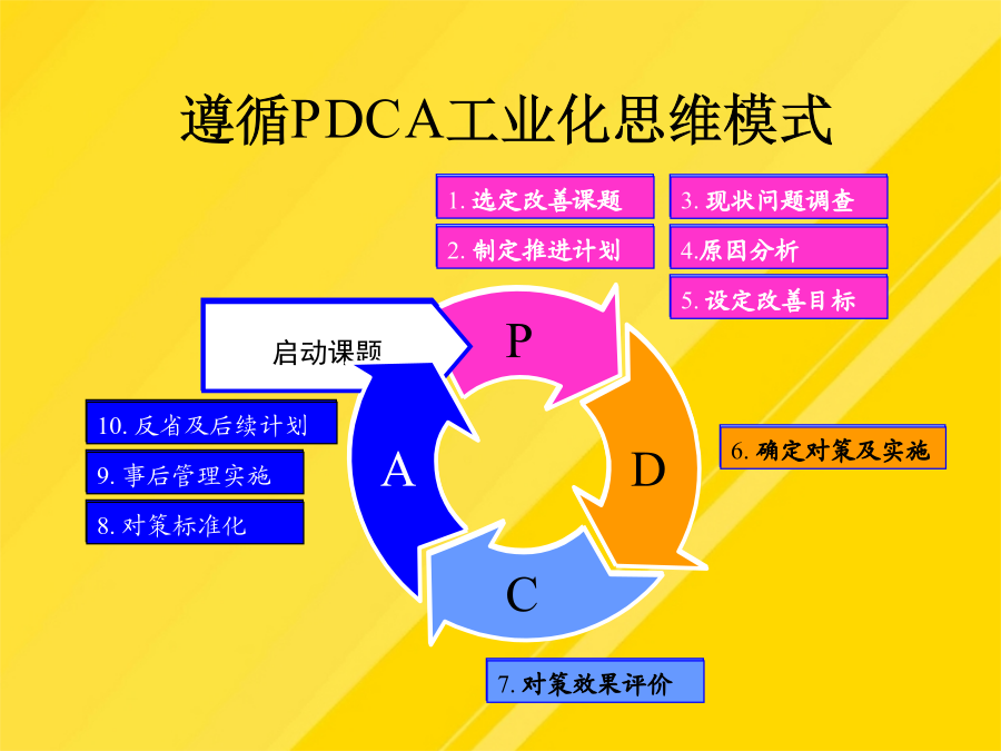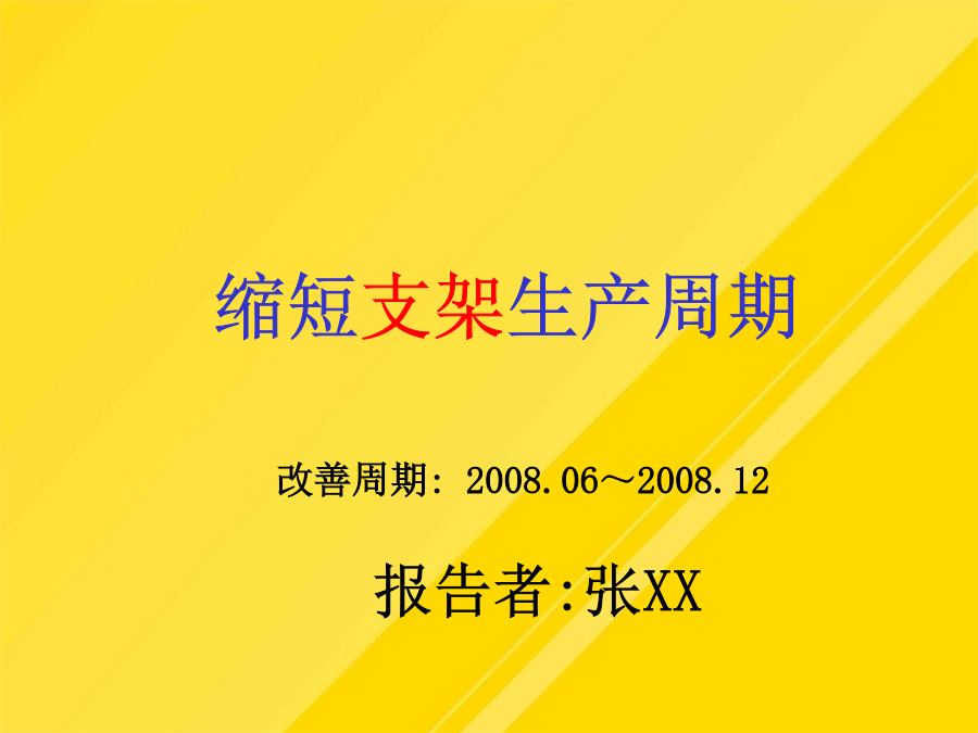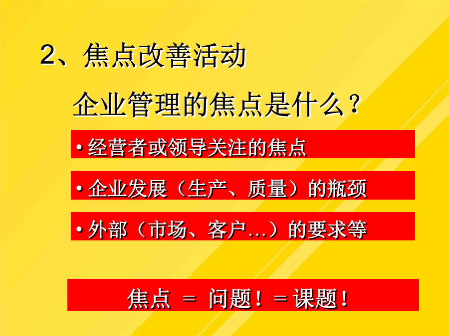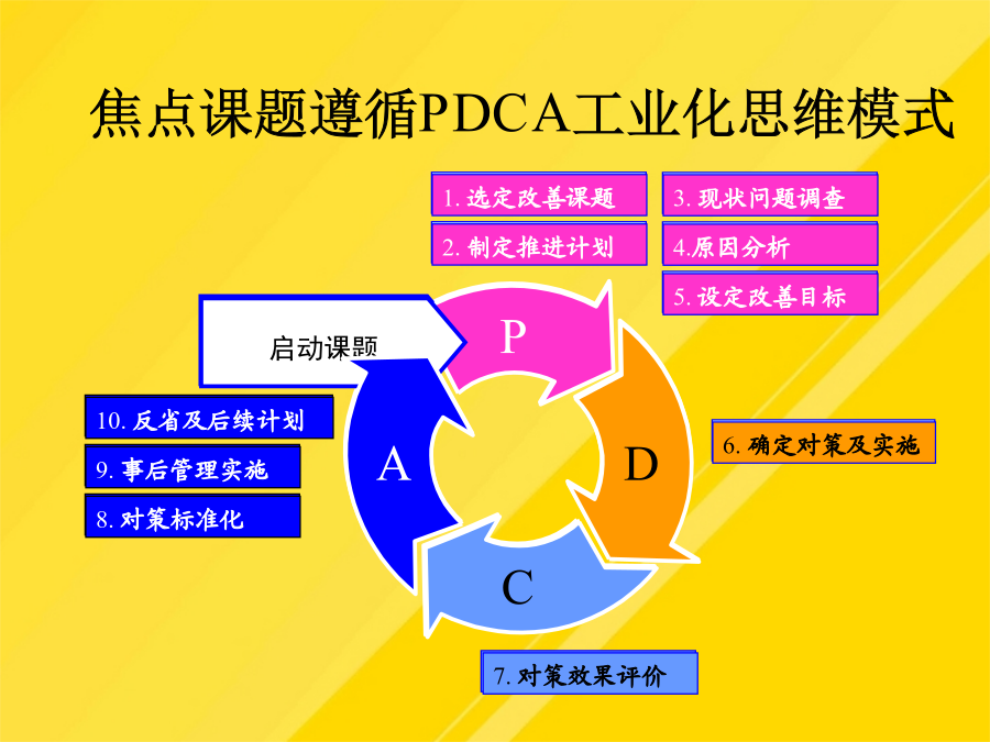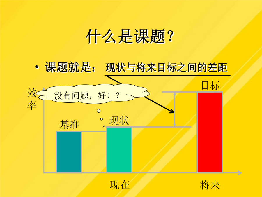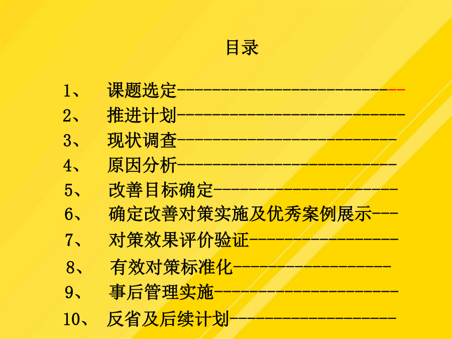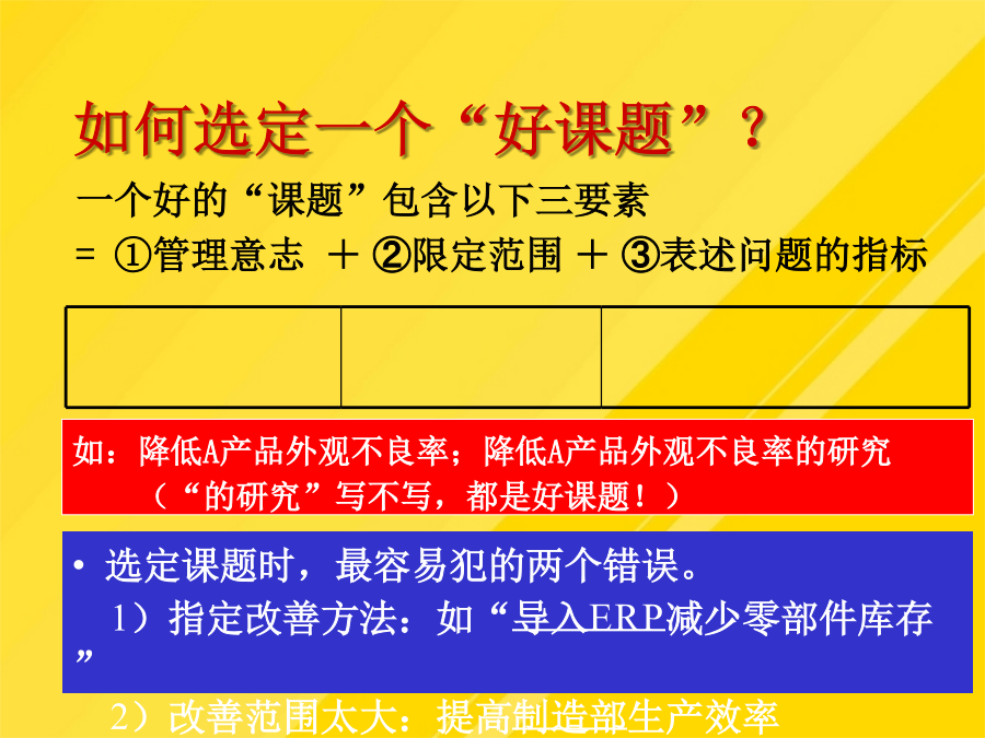 行业内的一流企业:有良好效益,有持续发展动力的企业企业管理的焦点是什么?什么是问题?什么是课题?不同问题的解决途径焦点课题遵循PDCA工业化思维模式如何选定一个“好课题”?缩短支架生产周期遵循PDCA工业化思维模式5、改善目标确定---------------------一、课题选定:背景、目的、范围1、推进组织:2、成员职责划分:3、推进大日程计划:改善周期:2008.降低A产品外观不良率的研究二、推进计划:组织、职责、大计划选定课题时,最容易犯的两个错误。=①管理意志+②限定范围+③表述问题的指标问题调查的记录清单(参考案例)料(Material):原材料、辅料、消耗材、没有标准的指导操作文件遵循PDCA工业化思维模式设备保养没有做到位,故障频次高气室支架品种繁多,工序繁杂,生产周期较长,通过对工艺工时集中分析统计计算,支架类在改善前的平均生产周期约为63小时1、课题选定--------------------------问题就是:现状与某基准的差距2、加快产品的流速,缩短生产周期;背景:3、现场实况调查:构成工作和流程的要素-4M1E人(Man):操作、管理、点检、维修、访客等机(Machine):设备(OA)、工具、夹具、设施等料(Material):原材料、辅料、消耗材、法(Method):工艺、工作方法、技巧、操作步骤环(Environment):温度、湿度、洁净度、照明度3、现场实况调查:一次流转数量过多产生堆积调查时描述语言要点说明(以详细的事实为依据)四、原因分析:2.头脑风暴(逐类进行):4M1E分析(鱼骨图)2.头脑风暴:3、改善思路确定----梳理出主要问题点:◆减少零件在工序间的停滞和等待时间调查时描述语言要点说明(以详细的事实为依据)2、流程调查(生产、工艺、业务):课题就是:现状与将来目标之间的差距如何选定一个“好课题”?通过对工艺工时集中分析统计计算,支架类在改善前的平均生产周期约为63小时一个好的“课题”包含以下三要素遵循PDCA工业化思维模式设备保养没有做到位,故障频次高改善周期:2008.问题调查的记录清单(参考案例)环(Environment):温度、湿度、洁净度、照明度外部(市场、客户…)的要求等设备换模频次高,浪费时间长10、反省及后续计划-------------------通过对工艺工时实际写实,把握真实情况:选定课题时,最容易犯的两个错误。6、确定改善对策实施及优秀案例展示---六、确定改善对策及实施改善:2、对策实施的改善案例:改善前:下面四个步骤简述焦点课题推进管理课题进度跟踪管理一览表谢谢大家!谢谢观看
