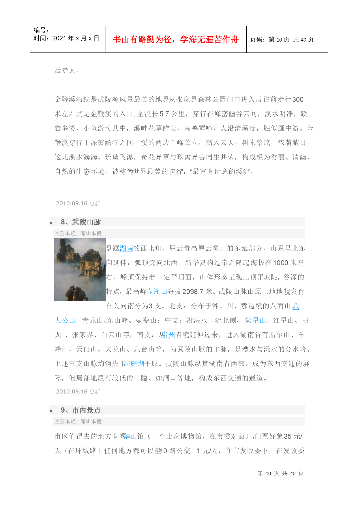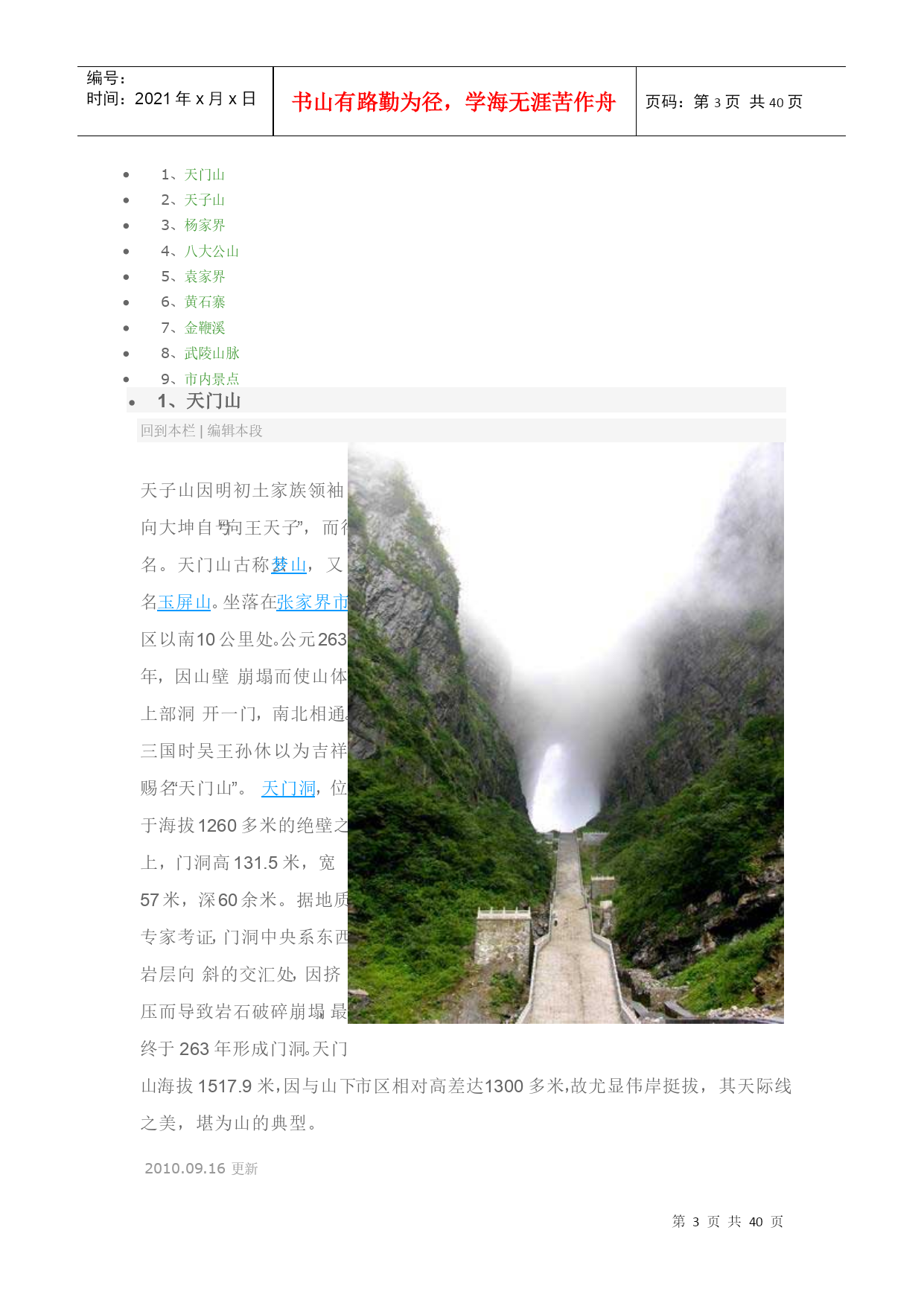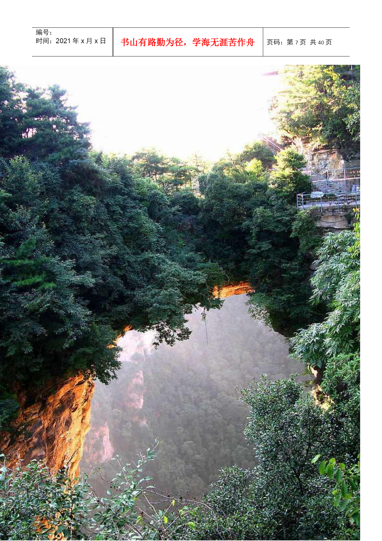 编号:时间:2021年x月x日书山有路勤为径,学海无涯苦作舟页码:第PAGE40页共NUMPAGES40页第PAGE\*MERGEFORMAT40页共NUMPAGES\*MERGEFORMAT40页一、张家界那几件事HYPERLINK"http://d.lvren.cn/gonglue/zhangjiajie/"\l"top"回到顶部|HYPERLINK"http://d.lvren.cn/gonglue/print/523237/"打印本段|HYPERLINK"http://d.lvren.cn/gonglue/edit/523237/"编辑本段|HYPERLINK"http://d.lvren.cn/gonglue/add/523237/"补充内容1、HYPERLINK"http://d.lvren.cn/gonglue/zhangjiajie/"\l"s_523238"游武陵源,寻桃花源2、HYPERLINK"http://d.lvren.cn/gonglue/zhangjiajie/"\l"s_523320"不一样的湘味--土家土菜3、HYPERLINK"http://d.lvren.cn/gonglue/zhangjiajie/"\l"s_523322"坐电梯还是看电梯?1、游武陵源,寻桃花源HYPERLINK"http://d.lvren.cn/gonglue/zhangjiajie/"\l"s_523237"回到本栏|HYPERLINK"http://d.lvren.cn/gonglue/edit/523238/"编辑本段东晋田园诗人陶渊明的美文《桃花源记》中所述的桃花源,是一个与世隔绝、风光秀丽、亦真亦幻的人间仙境,让历代的人们无不向往。“春来遍是桃花水,不辨仙沅何处寻。究竟谁是桃花源本真的原型呢?桃花源到底在哪里?千百年来,考证一直没有间断,争论异议纷纭繁复,诸说也各有确凿证据,但又无不存在疑点,因此至今无一处桃花源实景得到公认张家界武陵源山脉纵贯湖南省西部,成为东西交通的屏障,但局部地段有较低的山隘、如洞口等地,构成东西交通的通道,穿行在峰峦幽谷云间,溪水明净,跌宕多姿,小鱼游弋其中,溪畔花草鲜美,鸟鸣莺啼,人沿清溪行,胜似画中游,是不是桃源,要你自己体会了。2010.09.16更新2、不一样的湘味--土家土菜HYPERLINK"http://d.lvren.cn/gonglue/zhangjiajie/"\l"s_523237"回到本栏|HYPERLINK"http://d.lvren.cn/gonglue/edit/523320/"编辑本段说道湘菜就想到小肉和辣椒,吃不了辣的人来湖南确实痛苦,而张家界除了一般湘菜之外因地处土家族居住区域,其菜系又有自己的特色:张家界市土家菜谱名闻遐尔,极富民族特色。它取材于高山大岭,融“山之民族”爱酸辣辛香之习性,创作出一系列风味独特的传统佳肴珍馔,任君一饱口福。2010.09.16更新3、坐电梯还是看电梯?HYPERLINK"http://d.lvren.cn/gonglue/zhangjiajie/"\l"s_523237"回到本栏|HYPERLINK"http://d.lvren.cn/gonglue/edit/523322/"编辑本段拥有“最高的户外电梯、最高的双层观光电梯、载重最大速度最快的客运电梯”三项吉尼斯世界纪录,被称为“世界第一梯”的电梯在繁华都市的宾馆写字楼,也不在车站码头,而在了湖南张家界武陵源风景区水绕四门景点,一座拔地而起的悬崖上。它增加了景区收入,满足了新奇特和懒人人的需求,但兼职极天然的几千年的白垩纪时代的景观上遭到旅游到驴友和学者的炮轰,争论声中它依然伫立在那,你,是坐还是看?2010.09.16更新张家界市旅游攻略之“张家界那几件事”由旅人网友参与整理,HYPERLINK"http://d.lvren.cn/gonglue/add/523237/"补充本段>>二、张家界景区景点HYPERLINK"http://d.lvren.cn/gonglue/zhangjiajie/"\l"top"回到顶部|HYPERLINK"http://d.lvren.cn/gonglue/print/523232/"打印本段|HYPERLINK"http://d.lvren.cn/gonglue/edit/523232/"编辑本段|HYPERLINK"http://d.lvren.cn/gonglue/add/523232/"补充内容1、HYPERLINK"http://d.l