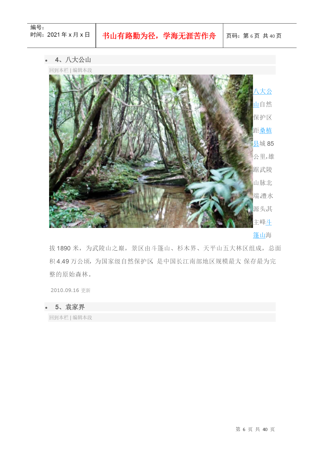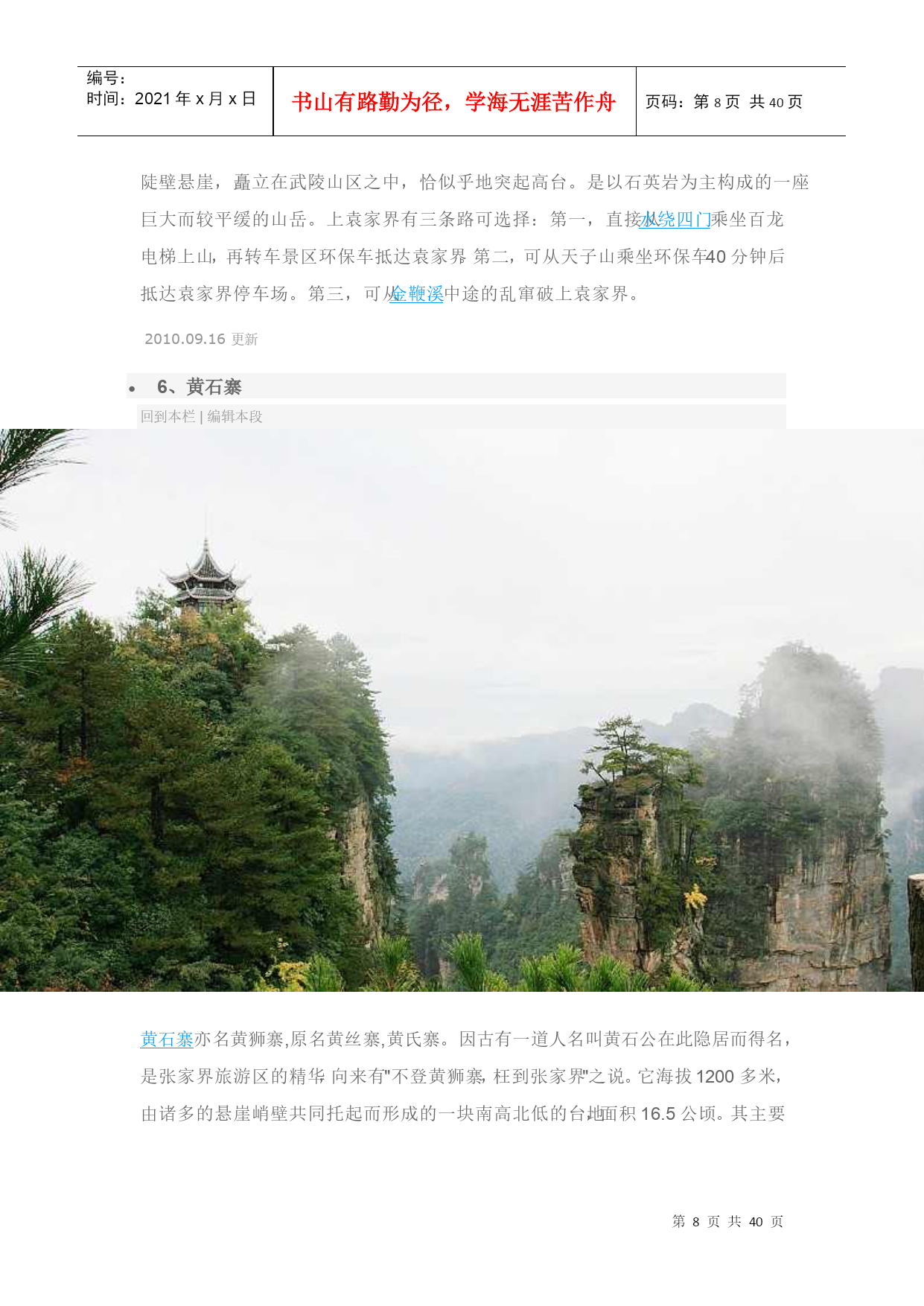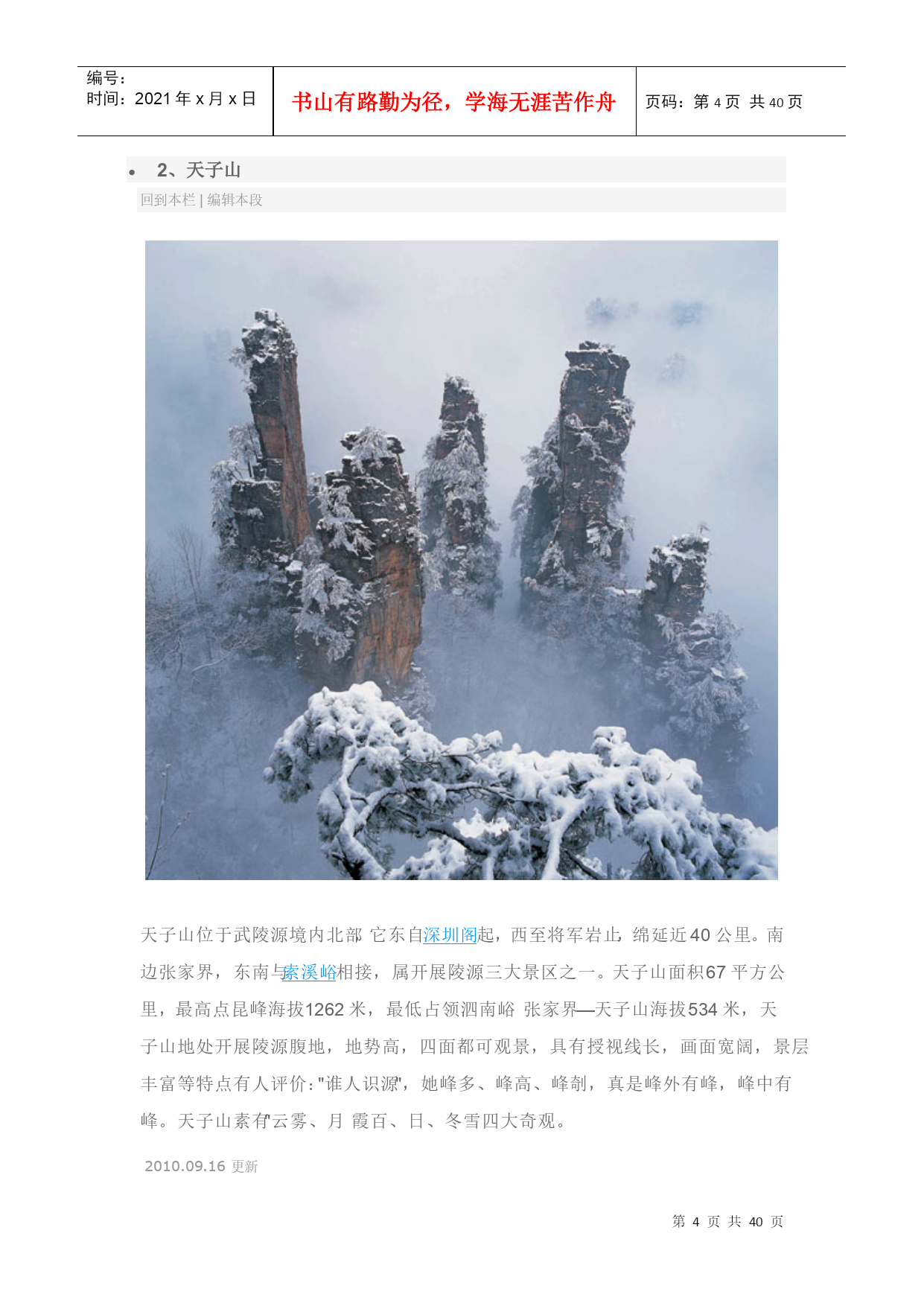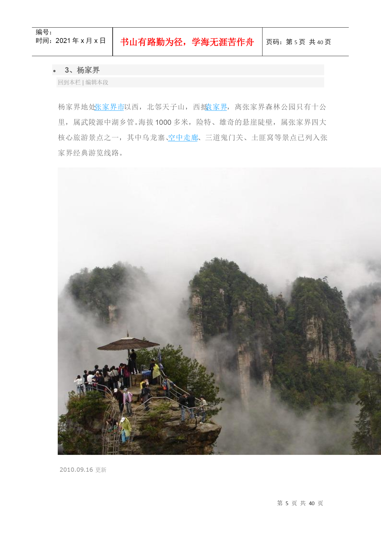 编号:时间:2021年x月x日书山有路勤为径,学海无涯苦作舟页码:第PAGE40页共NUMPAGES40页第PAGE\*MERGEFORMAT40页共NUMPAGES\*MERGEFORMAT40页一、张家界那几件事HYPERLINK"http://d.lvren.cn/gonglue/zhangjiajie/"\l"top"回到顶部|HYPERLINK"http://d.lvren.cn/gonglue/print/523237/"打印本段|HYPERLINK"http://d.lvren.cn/gonglue/edit/523237/"编辑本段|HYPERLINK"http://d.lvren.cn/gonglue/add/523237/"补充内容1、HYPERLINK"http://d.lvren.cn/gonglue/zhangjiajie/"\l"s_523238"游武陵源,寻桃花源2、HYPERLINK"http://d.lvren.cn/gonglue/zhangjiajie/"\l"s_523320"不一样的湘味--土家土菜3、HYPERLINK"http://d.lvren.cn/gonglue/zhangjiajie/"\l"s_523322"坐电梯还是看电梯?1、游武陵源,寻桃花源HYPERLINK"http://d.lvren.cn/gonglue/zhangjiajie/"\l"s_523237"回到本栏|HYPERLINK"http://d.lvren.cn/gonglue/edit/523238/"编辑本段东晋田园诗人陶渊明的美文《桃花源记》中所述的桃花源,是一个与世隔绝、风光秀丽、亦真亦幻的人间仙境,让历代的人们无不向往。“春来遍是桃花水,不辨仙沅何处寻。究竟谁是桃花源本真的原型呢?桃花源到底在哪里?千百年来,考证一直没有间断,争论异议纷纭繁复,诸说也各有确凿证据,但又无不存在疑点,因此至今无一处桃花源实景得到公认张家界武陵源山脉纵贯湖南省西部,成为东西交通的屏障,但局部地段有较低的山隘、如洞口等地,构成东西交通的通道,穿行在峰峦幽谷云间,溪水明净,跌宕多姿,小鱼游弋其中,溪畔花草鲜美,鸟鸣莺啼,人沿清溪行,胜似画中游,是不是桃源,要你自己体会了。2010.09.16更新2、不一样的湘味--土家土菜HYPERLINK"http://d.lvren.cn/gonglue/zhangjiajie/"\l"s_523237"回到本栏|HYPERLINK"http://d.lvren.cn/gonglue/edit/523320/"编辑本段说道湘菜就想到小肉和辣椒,吃不了辣的人来湖南确实痛苦,而张家界除了一般湘菜之外因地处土家族居住区域,其菜系又有自己的特色:张家界市土家菜谱名闻遐尔,极富民族特色。它取材于高山大岭,融“山之民族”爱酸辣辛香之习性,创作出一系列风味独特的传统佳肴珍馔,任君一饱口福。2010.09.16更新3、坐电梯还是看电梯?HYPERLINK"http://d.lvren.cn/gonglue/zhangjiajie/"\l"s_523237"回到本栏|HYPERLINK"http://d.lvren.cn/gonglue/edit/523322/"编辑本段拥有“最高的户外电梯、最高的双层观光电梯、载重最大速度最快的客运电梯”三项吉尼斯世界纪录,被称为“世界第一梯”的电梯在繁华都市的宾馆写字楼,也不在车站码头,而在了湖南张家界武陵源风景区水绕四门景点,一座拔地而起的悬崖上。它增加了景区收入,满足了新奇特和懒人人的需求,但兼职极天然的几千年的白垩纪时代的景观上遭到旅游到驴友和学者的炮轰,争论声中它依然伫立在那,你,是坐还是看?2010.09.16更新张家界市旅游攻略之“张家界那几件事”由旅人网友参与整理,HYPERLINK"http://d.lvren.cn/gonglue/add/523237/"补充本段>>二、张家界景区景点HYPERLINK"http://d.lvren.cn/gonglue/zhangjiajie/"\l"top"回到顶部|HYPERLINK"http://d.lvren.cn/gonglue/print/523232/"打印本段|HYPERLINK"http://d.lvren.cn/gonglue/edit/523232/"编辑本段|HYPERLINK"http://d.lvren.cn/gonglue/add/523232/"补充内容1、HYPERLINK"http://d.l
