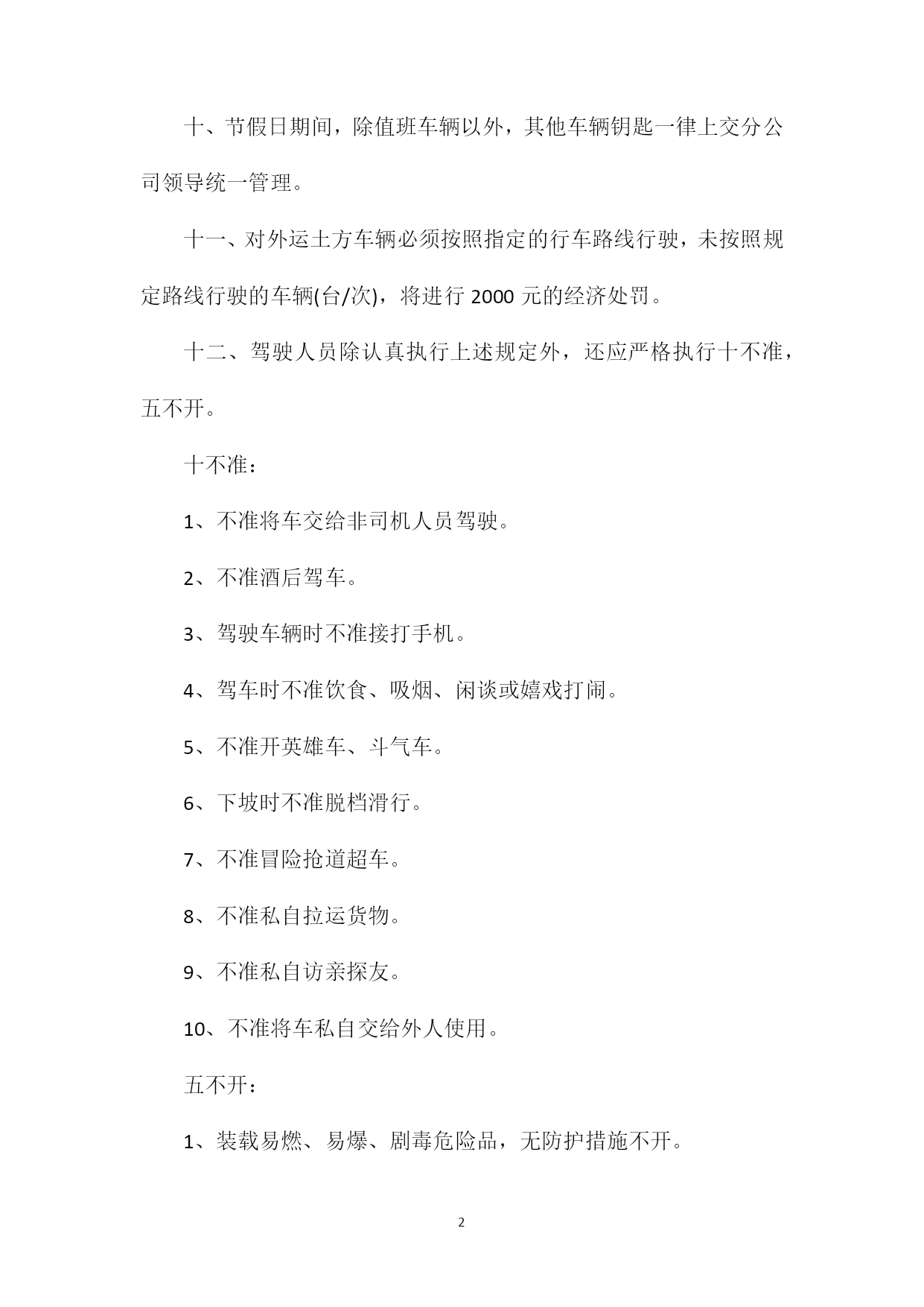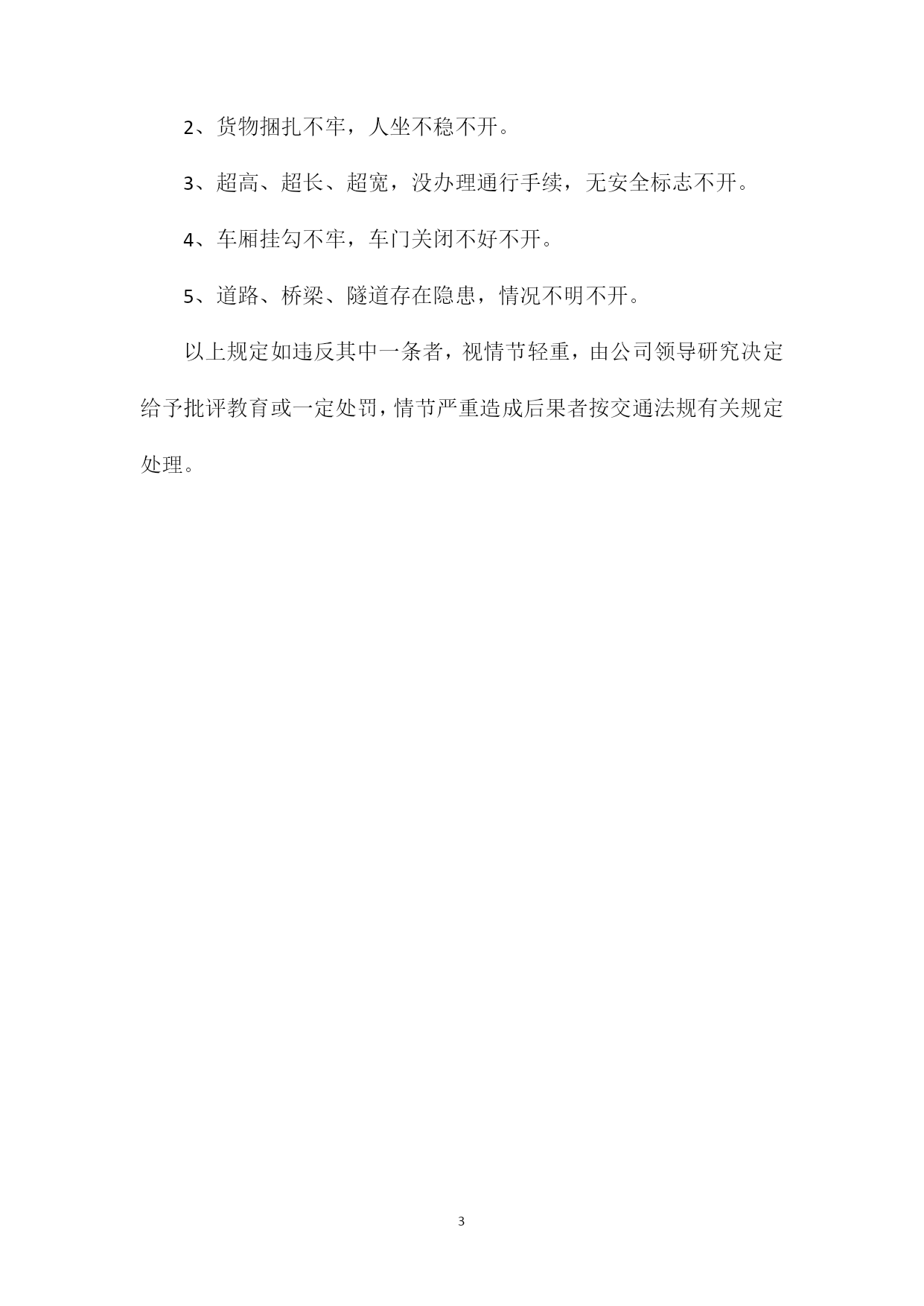 PAGEPAGE3车辆交通安全管理制度为了进一步加强我单位交通运输安全管理工作,提高驾驶人员的安全意识,确保车辆行驶安全,特制定本制度。一、全体驾驶人员必须认真学习和遵守交通安全法规和有关规定,自觉遵守交通规则,维护交通秩序,服从交通管理部门的管理。二、自觉维护和保持好自己使用的车辆,按时参加年检,使自己的车辆始终保持在良好的运行状态。保证客货车的运输安全。三、在施工现场服从施工负责人的领导和指挥,不得擅离工作岗位,进入现场必须戴好安全帽。四、发生交通事故时,及时报告交通管理部门进行处理,并应发扬人道主义精神,对受伤者紧急救护,不得肇事逃逸。五、车辆按照公司要求,定点存放。未经允许不准随意停放他处。六、现场所有机动车辆的驾驶员必须经过国家有关部门培训并持证上岗。七、所有施工车辆必须保持完好的车况,严禁施工机械带病运行。八、施工机械必须做好每天的施工机械记录(含施工机械保养记录)。九、施工机械要保持良好的车容车貌,必须根据实际情况进行定期或不定期的冲洗。十、节假日期间,除值班车辆以外,其他车辆钥匙一律上交分公司领导统一管理。十一、对外运土方车辆必须按照指定的行车路线行驶,未按照规定路线行驶的车辆(台/次),将进行2000元的经济处罚。十二、驾驶人员除认真执行上述规定外,还应严格执行十不准,五不开。十不准:1、不准将车交给非司机人员驾驶。2、不准酒后驾车。3、驾驶车辆时不准接打手机。4、驾车时不准饮食、吸烟、闲谈或嬉戏打闹。5、不准开英雄车、斗气车。6、下坡时不准脱档滑行。7、不准冒险抢道超车。8、不准私自拉运货物。9、不准私自访亲探友。10、不准将车私自交给外人使用。五不开:1、装载易燃、易爆、剧毒危险品,无防护措施不开。2、货物捆扎不牢,人坐不稳不开。3、超高、超长、超宽,没办理通行手续,无安全标志不开。4、车厢挂勾不牢,车门关闭不好不开。5、道路、桥梁、隧道存在隐患,情况不明不开。以上规定如违反其中一条者,视情节轻重,由公司领导研究决定给予批评教育或一定处罚,情节严重造成后果者按交通法规有关规定处理。