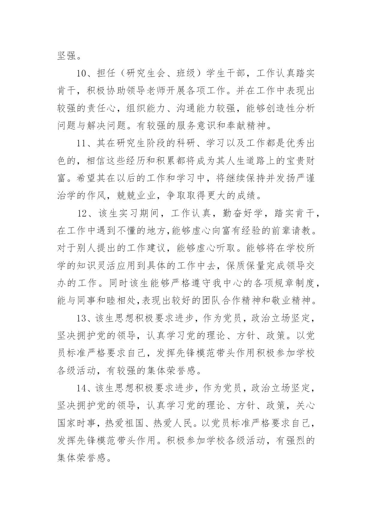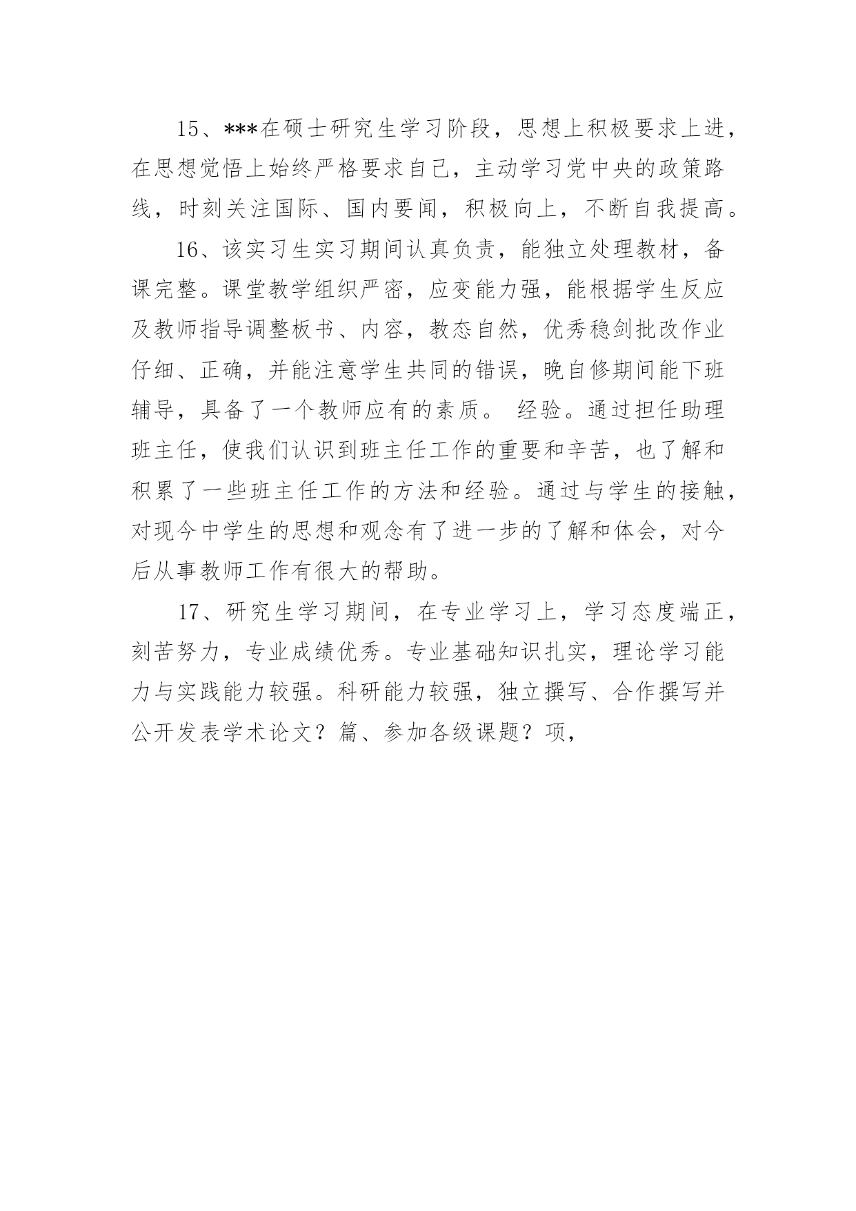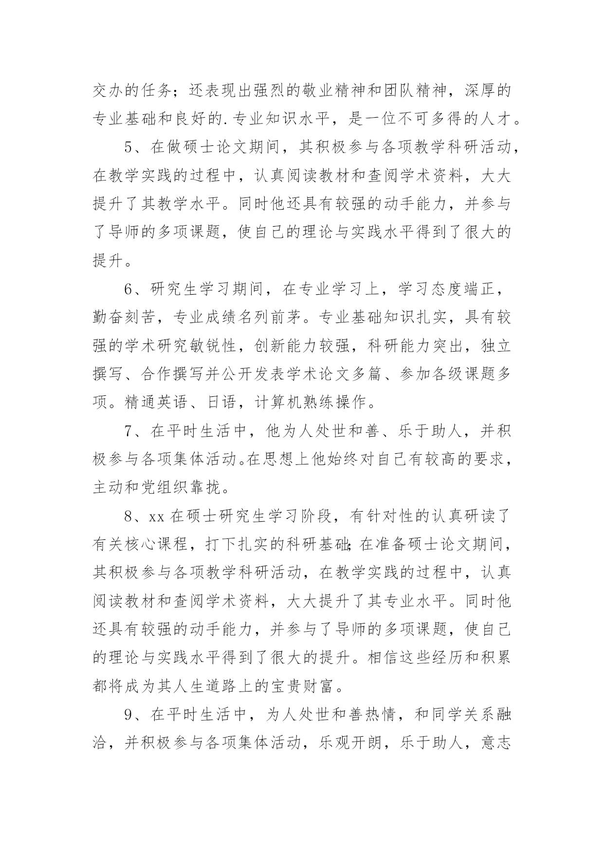 研究生系级鉴定评语研究生系级鉴定评语我们怎么样写相关的评语呢?不同的情况有不同的评语,看看下面的研究生系级鉴定评语吧!研究生系级鉴定评语1、积极参加各种社会实践活动,在实习单位表现出色。作风正派,有公民-意识和良好的道德素质。热爱生活,积极参加体育活动,锻炼自己的毅力和体魄,关心他人,富有同情心和爱心,主动帮助有困难群众。该生是一名优秀毕业研究生。2、表现高度热忱,讲解钜细靡遗,能兼顾不同程度学生的需要,亦能根据学生反应及教师指导调整板书、速度、教学方式、内容……,努力求得学生最大利益。批改作业认真,评语多样、丰富而恳切。上课秩序掌控得宜,收放自如,优秀稳剑发现问题能主动提出讨论,讨论中自然流露极佳学养与见识。3、该生工作认真负责,班主任工作做的扎实,经常深入学生了解他们的思想和学习状况,与学生谈心,帮助他们树立正确的人生观和价值观,与学生交流探讨好的学习方法,组织、开展各项有益的文体活动,深得学生喜爱。该生已具备一名优秀青年教师的基本素质。4、该生在实习期间,态度极其认真,工作积极、细心、踏实,能虚心接受指导;同时善于思考,能够举一反三,具有较强地外语沟通能力和沟通技巧,能保质保量地完成领导交办的任务;还表现出强烈的敬业精神和团队精神,深厚的专业基础和良好的.专业知识水平,是一位不可多得的人才。5、在做硕士论文期间,其积极参与各项教学科研活动,在教学实践的过程中,认真阅读教材和查阅学术资料,大大提升了其教学水平。同时他还具有较强的动手能力,并参与了导师的多项课题,使自己的理论与实践水平得到了很大的提升。6、研究生学习期间,在专业学习上,学习态度端正,勤奋刻苦,专业成绩名列前茅。专业基础知识扎实,具有较强的学术研究敏锐性,创新能力较强,科研能力突出,独立撰写、合作撰写并公开发表学术论文多篇、参加各级课题多项。精通英语、日语,计算机熟练操作。7、在平时生活中,他为人处世和善、乐于助人,并积极参与各项集体活动。在思想上他始终对自己有较高的要求,主动和党组织靠拢。8、xx在硕士研究生学习阶段,有针对性的认真研读了有关核心课程,打下扎实的科研基础;在准备硕士论文期间,其积极参与各项教学科研活动,在教学实践的过程中,认真阅读教材和查阅学术资料,大大提升了其专业水平。同时他还具有较强的动手能力,并参与了导师的多项课题,使自己的理论与实践水平得到了很大的提升。相信这些经历和积累都将成为其人生道路上的宝贵财富。9、在平时生活中,为人处世和善热情,和同学关系融洽,并积极参与各项集体活动,乐观开朗,乐于助人,意志坚强。10、担任(研究生会、班级)学生干部,工作认真踏实肯干,积极协助领导老师开展各项工作。并在工作中表现出较强的责任心,组织能力、沟通能力较强,能够创造性分析问题与解决问题。有较强的服务意识和奉献精神。11、其在研究生阶段的科研、学习以及工作都是优秀出色的,相信这些经历和积累都将成为其人生道路上的宝贵财富。希望其在以后的工作和学习中,将继续保持并发扬严谨治学的作风,兢兢业业,争取取得更大的成绩。12、该生实习期间,工作认真,勤奋好学,踏实肯干,在工作中遇到不懂的地方,能够虚心向富有经验的前辈请教。对于别人提出的工作建议,能够虚心听取。能够将在学校所学的知识灵活应用到具体的工作中去,保质保量完成领导交办的工作。同时该生能够严格遵守我中心的各项规章制度,能与同事和睦相处,表现出较好的团队合作精神和敬业精神。13、该生思想积极要求进步,作为党员,政治立场坚定,坚决拥护党的领导,认真学习党的理论、方针、政策。以党员标准严格要求自己,发挥先锋模范带头作用积极参加学校各级活动,有较强的集体荣誉感。14、该生思想积极要求进步,作为党员,政治立场坚定,坚决拥护党的领导,认真学习党的理论、方针、政策,关心国家时事,热爱祖国、热爱人民。以党员标准严格要求自己,发挥先锋模范带头作用。积极参加学校各级活动,有强烈的集体荣誉感。15、***在硕士研究生学习阶段,思想上积极要求上进,在思想觉悟上始终严格要求自己,主动学习党中央的政策路线,时刻关注国际、国内要闻,积极向上,不断自我提高。16、该实习生实习期间认真负责,能独立处理教材,备课完整。课堂教学组织严密,应变能力强,能根据学生反应及教师指导调整板书、内容,教态自然,优秀稳剑批改作业仔细、正确,并能注意学生共同的错误,晚自修期间能下班辅导,具备了一个教师应有的素质。经验。通过担任助理班主任,使我们认识到班主任工作的重要和辛苦,也了解和积累了一些班主任工作的方法和经验。通过与学生的接触,对现今中学生的思想和观念有了进一步的了解和体会,对今后从事教师工作有很大的帮助。17、研究生学习期间,在专业学习上,学习态度端正,刻苦努力,专业成绩优秀。专业基础知识扎实,理论学习能力与实践能力较强。科研能力较强,独立撰写、合
