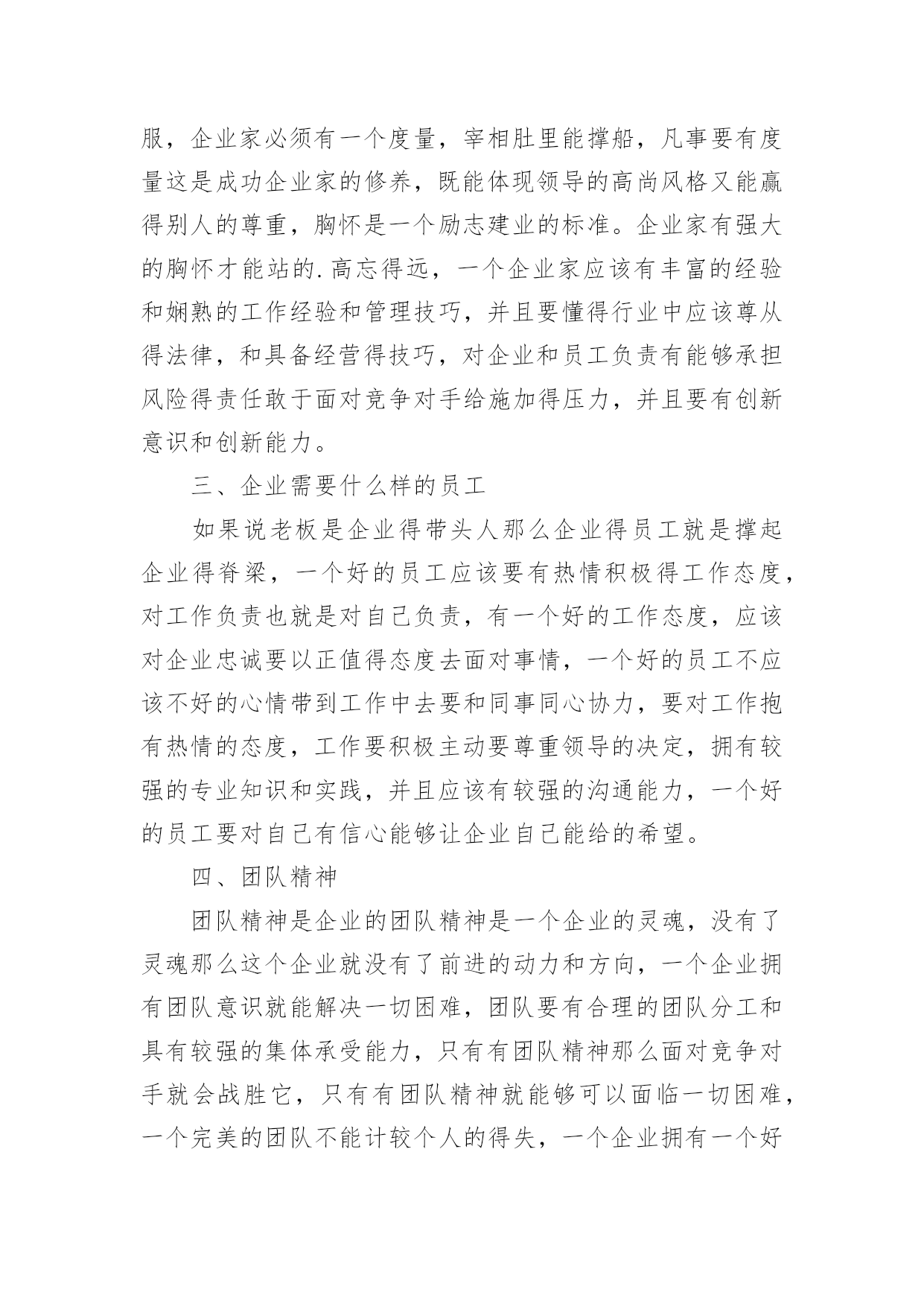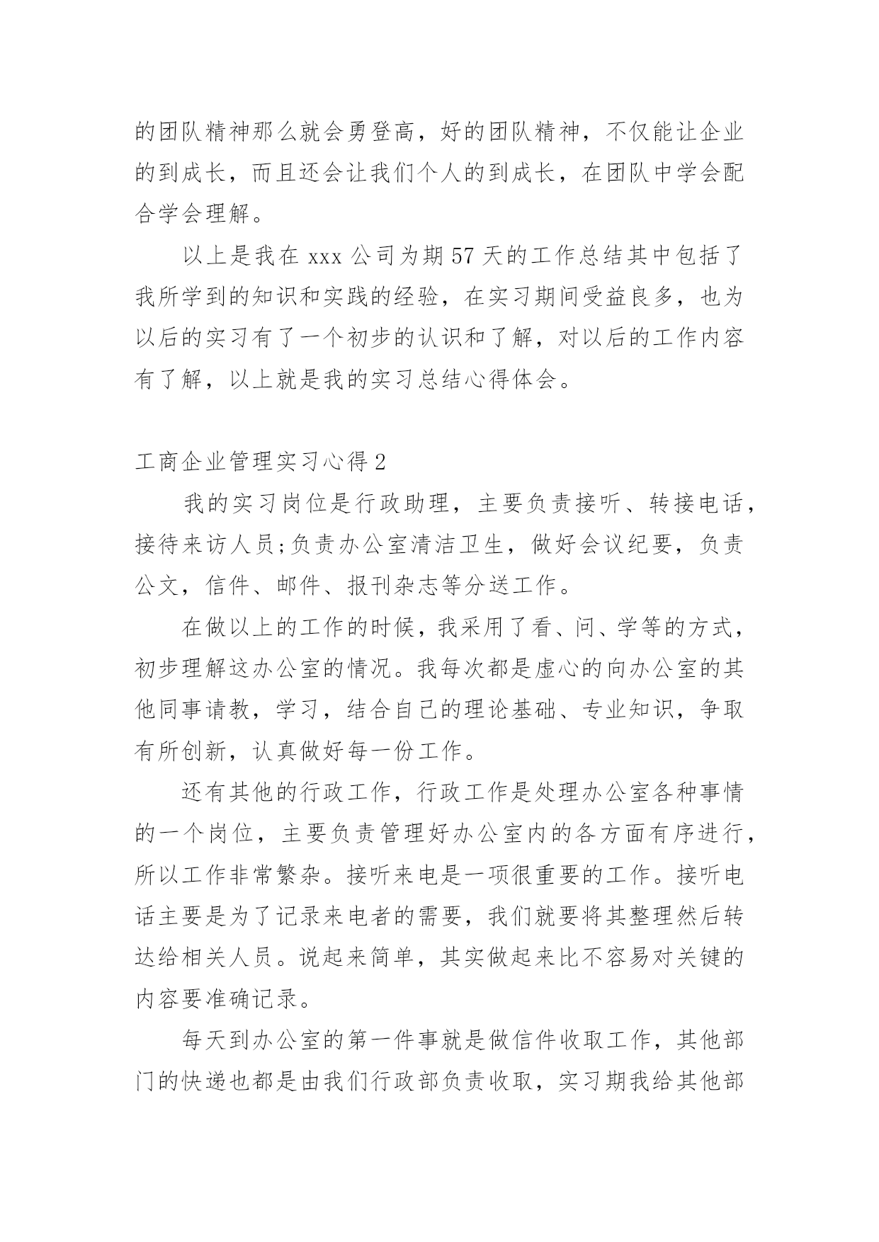 工商企业管理实习心得有了一些收获以后,可以寻思将其写进心得体会中,通过写心得体会,可以帮助我们总结积累经验。那么你知道心得体会如何写吗?以下是小编收集整理的工商企业管理实习心得,希望对大家有所帮助。工商企业管理实习心得1我于xxxx年xx月xx日到xx月xx日在先xx公司进行为期57天的企业实习,在为期57天的企业实习中将课堂上所学到的知识运用到实践中让我深有感触,感觉自己所学的知识匮乏和实践操作缺乏经验,开始感觉工作无从下手不知所措。一、企业文化每一个企业都应该有一个必备的流程和好的企业文化,首先客户向经销商发提货单然后由业务代表接单接下来将到交给出纳员,然后由库管提货送到客户家,公司的工作宗旨是“没有完美的个人只有完美的集体”二、成功企业家必备的素质一个企业要拥有一个好的带头人,这个公司才能向远看向前发展,成功企业家应该心胸宽广,海纳百川,有容乃大。现在企业家如果心胸狭隘不能容人,不仅难成大事而且难以与人亲密相处,企业家拥有宽大的胸怀不仅能够收揽人心,也能体现自己身边聚集了许多优秀的人才。还能使人心悦诚服,企业家必须有一个度量,宰相肚里能撑船,凡事要有度量这是成功企业家的修养,既能体现领导的高尚风格又能赢得别人的尊重,胸怀是一个励志建业的标准。企业家有强大的胸怀才能站的.高忘得远,一个企业家应该有丰富的经验和娴熟的工作经验和管理技巧,并且要懂得行业中应该尊从得法律,和具备经营得技巧,对企业和员工负责有能够承担风险得责任敢于面对竞争对手给施加得压力,并且要有创新意识和创新能力。三、企业需要什么样的员工如果说老板是企业得带头人那么企业得员工就是撑起企业得脊梁,一个好的员工应该要有热情积极得工作态度,对工作负责也就是对自己负责,有一个好的工作态度,应该对企业忠诚要以正值得态度去面对事情,一个好的员工不应该不好的心情带到工作中去要和同事同心协力,要对工作抱有热情的态度,工作要积极主动要尊重领导的决定,拥有较强的专业知识和实践,并且应该有较强的沟通能力,一个好的员工要对自己有信心能够让企业自己能给的希望。四、团队精神团队精神是企业的团队精神是一个企业的灵魂,没有了灵魂那么这个企业就没有了前进的动力和方向,一个企业拥有团队意识就能解决一切困难,团队要有合理的团队分工和具有较强的集体承受能力,只有有团队精神那么面对竞争对手就会战胜它,只有有团队精神就能够可以面临一切困难,一个完美的团队不能计较个人的得失,一个企业拥有一个好的团队精神那么就会勇登高,好的团队精神,不仅能让企业的到成长,而且还会让我们个人的到成长,在团队中学会配合学会理解。以上是我在xxx公司为期57天的工作总结其中包括了我所学到的知识和实践的经验,在实习期间受益良多,也为以后的实习有了一个初步的认识和了解,对以后的工作内容有了解,以上就是我的实习总结心得体会。工商企业管理实习心得2我的实习岗位是行政助理,主要负责接听、转接电话,接待来访人员;负责办公室清洁卫生,做好会议纪要,负责公文,信件、邮件、报刊杂志等分送工作。在做以上的工作的时候,我采用了看、问、学等的方式,初步理解这办公室的情况。我每次都是虚心的向办公室的其他同事请教,学习,结合自己的理论基础、专业知识,争取有所创新,认真做好每一份工作。还有其他的行政工作,行政工作是处理办公室各种事情的一个岗位,主要负责管理好办公室内的各方面有序进行,所以工作非常繁杂。接听来电是一项很重要的工作。接听电话主要是为了记录来电者的需要,我们就要将其整理然后转达给相关人员。说起来简单,其实做起来比不容易对关键的内容要准确记录。每天到办公室的第一件事就是做信件收取工作,其他部门的快递也都是由我们行政部负责收取,实习期我给其他部门的同事取过快递,也协作过行政部寄发过快递。行政看起来简单实际要做起来,一定要做到细心,耐心和有责任心。通过这次实习让我认识到我认识到了计算机在办公室日常活动中应用的重要性。有一些工作,比如文件的写作、真理,数据的查询、录入都与计算机是密切相关的。自己平时对计算机的接触不是很多,办公软件运用都不熟练。因为不太会,所以做起来比较慢。一些办公软件较为复杂的.运用都是自已临时学的,问了一些同事,也在同事的帮助下完成了领导交给的工作。但我明显的感觉到我这方面的能力的薄弱,我一定要多学习一些方面的知识,在实习期间有了一定的进步。工作中一定要认真工作,多做事才能更好的了解工作情况,更加专心的投入到工作当中去,才能更好的完成工作任务,从而取得领导的信任。少说话,就是少说无关紧要的话,不说不利团结影响安定的话,以谨慎负责的态度处理工作,这样才能够得到同事的信赖,为开展工作打下良好的基础,没有一个人脱离工作伙伴而单独的把工作完成好,任何时候都不要忽略人的因素。通过这次实习,让我学到了很多课堂上根本学不到的东西,仿佛自已一下成熟了