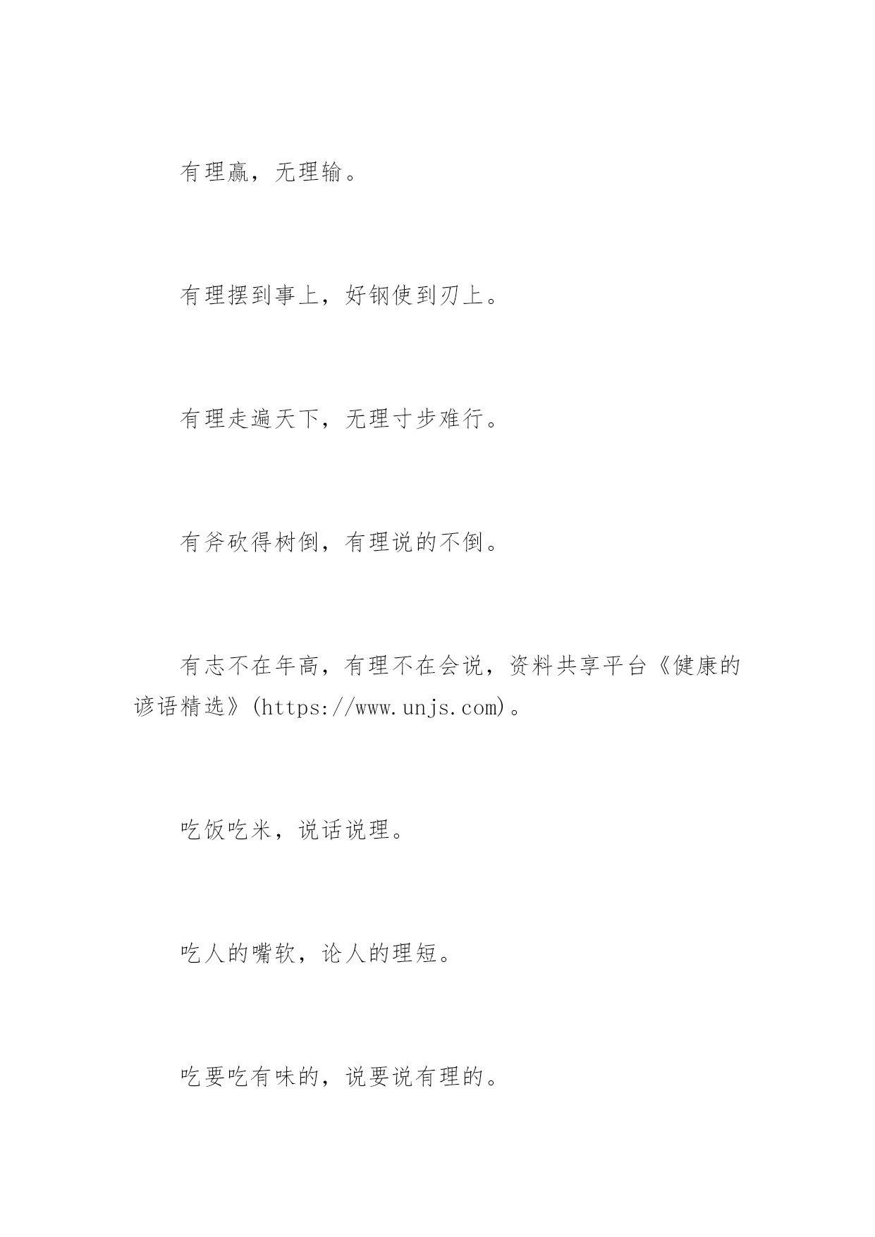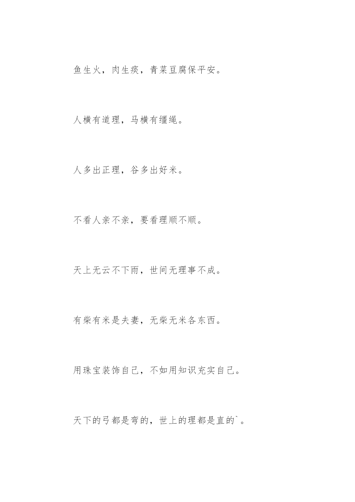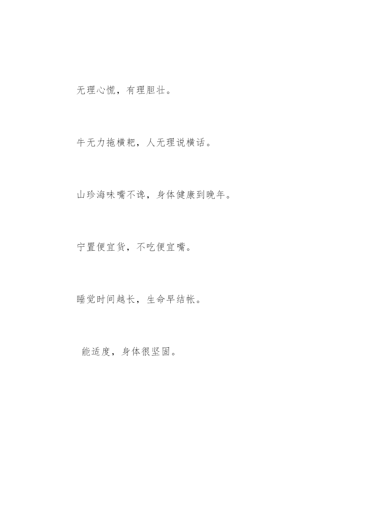 健康的谚语健康的谚语精选有车就有辙,有树就有影,健康的谚语精选。有理的想着说,没理的抢着说。有理走遍天下,无理寸步难行。有粮当思无粮难,莫到无粮思有粮。有钱难买老来瘦。有钱三十为宰相,无钱八十做长工。有肉嫌毛,有酒嫌糟。有山必有路,有水必有渡。有上坡必有下坡,有进路必有出路。有时省一口,缺时当一斗。有事叫公公,无事脸朝东。有心烧香,不论早晚。有一兴必有一败,有一利必有一弊。有志不在年高,有理不在会说。有麝自然香,不用大风扬。鱼生火,肉生痰,青菜豆腐保平安。人横有道理,马横有缰绳。人多出正理,谷多出好米。不看人亲不亲,要看理顺不顺。天上无云不下雨,世间无理事不成。有柴有米是夫妻,无柴无米各东西。用珠宝装饰自己,不如用知识充实自己。天下的弓都是弯的,世上的理都是直的`。有理赢,无理输。有理摆到事上,好钢使到刃上。有理走遍天下,无理寸步难行。有斧砍得树倒,有理说的不倒。有志不在年高,有理不在会说,资料共享平台《健康的谚语精选》(https://www.unjs.com)。吃饭吃米,说话说理。吃人的嘴软,论人的理短。吃要吃有味的,说要说有理的。会走走不过影,会说说不过理。舌头是肉长的,事实是铁打的。灯不亮,要人拨;事不明,要人说。灯不拨不亮,理不辩不明。好人争理,坏人争嘴。好茶不怕细品,好事不怕细论。理不短,嘴不软。菜没盐无味,话没理无力。脚跑不过雨,嘴强不过理。做事循天理,出言顺人心。船稳不怕风大,有理通行天下。路是弯的,理是直的。路不平,众人踩;事不平,大家管。路有千条,理只一条。天无二日,人无二理。井越掏,水越清;事越摆,理越明。无理心慌,有理胆壮。牛无力拖横耙,人无理说横话。山珍海味嘴不谗,身体健康到晚年。宁置便宜货,不吃便宜嘴。睡觉时间越长,生命早结帐。能适度,身体很坚固。