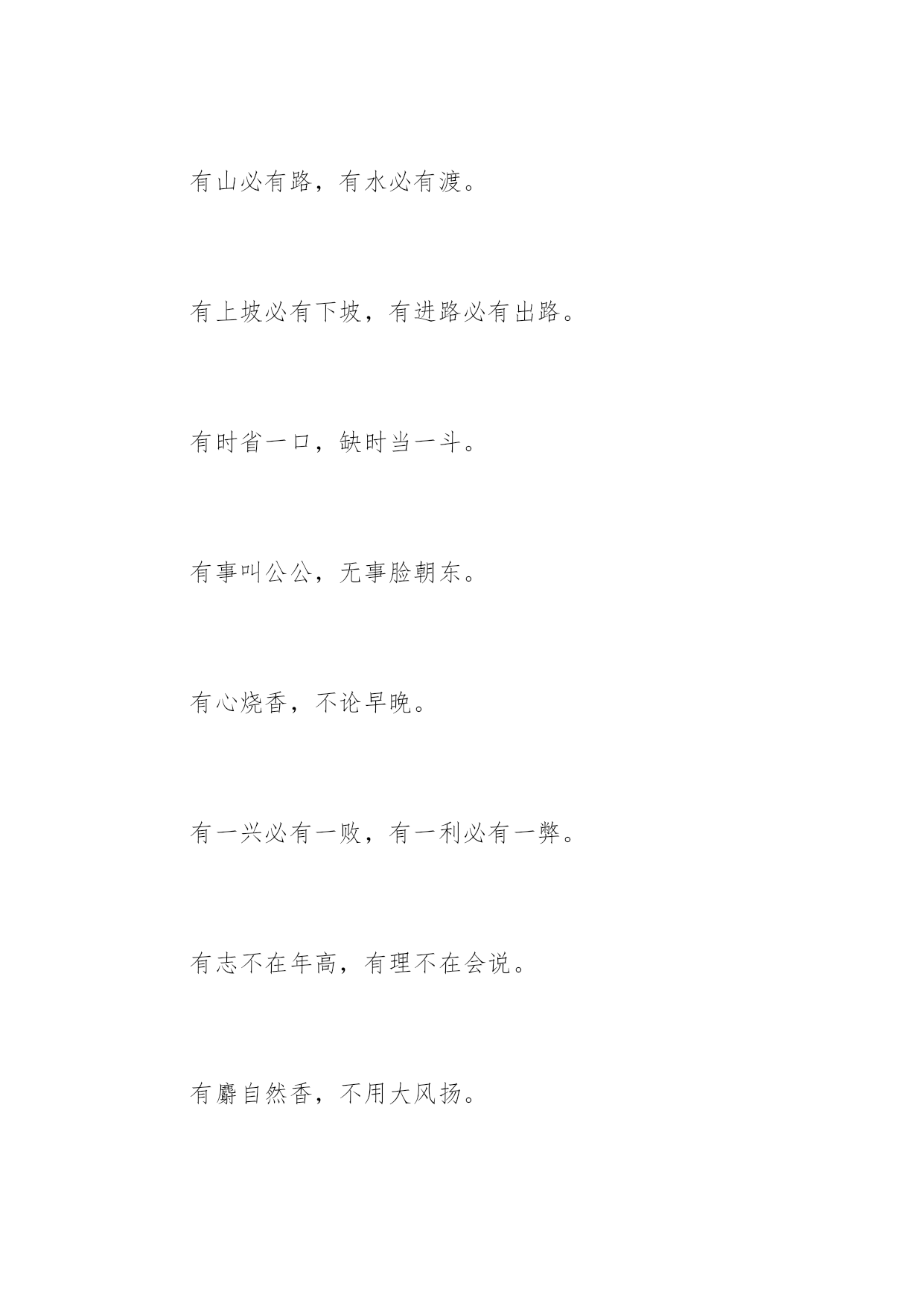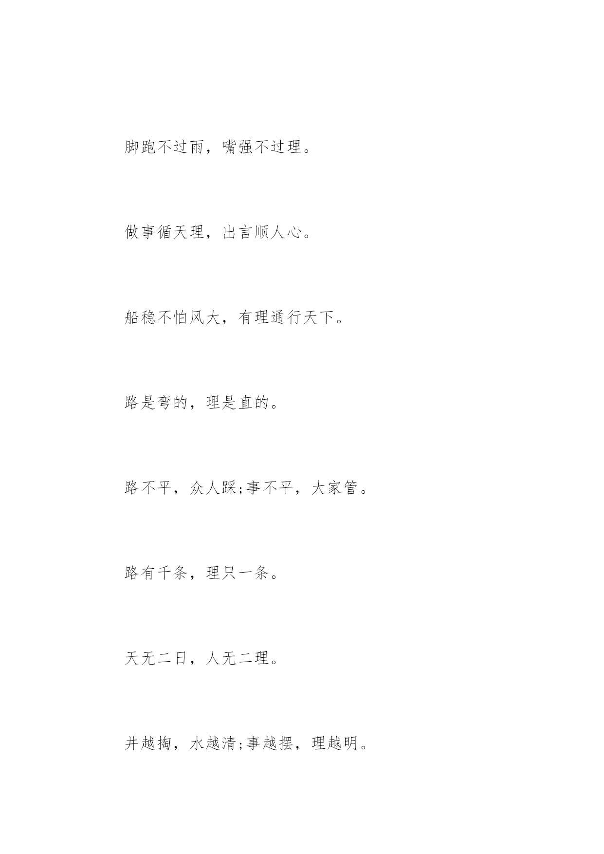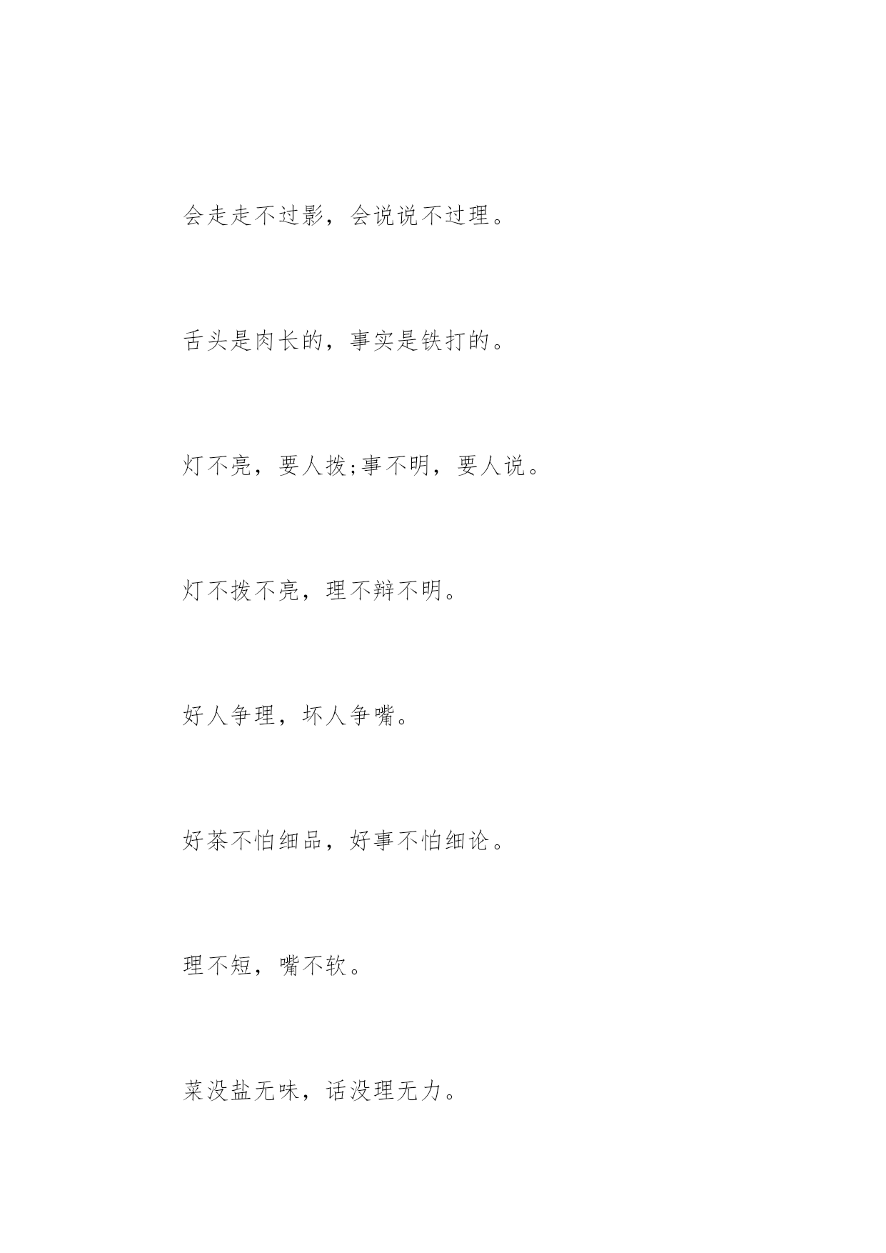 健康的谚语健康的谚语精选有车就有辙,有树就有影,健康的谚语精选。有理的想着说,没理的抢着说。有理走遍天下,无理寸步难行。有粮当思无粮难,莫到无粮思有粮。有钱难买老来瘦。有钱三十为宰相,无钱八十做长工。有肉嫌毛,有酒嫌糟。有山必有路,有水必有渡。有上坡必有下坡,有进路必有出路。有时省一口,缺时当一斗。有事叫公公,无事脸朝东。有心烧香,不论早晚。有一兴必有一败,有一利必有一弊。有志不在年高,有理不在会说。有麝自然香,不用大风扬。鱼生火,肉生痰,青菜豆腐保平安。人横有道理,马横有缰绳。人多出正理,谷多出好米。不看人亲不亲,要看理顺不顺。天上无云不下雨,世间无理事不成。有柴有米是夫妻,无柴无米各东西。用珠宝装饰自己,不如用知识充实自己。天下的弓都是弯的,世上的理都是直的`。有理赢,无理输。有理摆到事上,好钢使到刃上。有理走遍天下,无理寸步难行。有斧砍得树倒,有理说的不倒。有志不在年高,有理不在会说,资料共享平台《健康的谚语精选》(https://www.unjs.com)。吃饭吃米,说话说理。吃人的嘴软,论人的理短。吃要吃有味的,说要说有理的。会走走不过影,会说说不过理。舌头是肉长的,事实是铁打的。灯不亮,要人拨;事不明,要人说。灯不拨不亮,理不辩不明。好人争理,坏人争嘴。好茶不怕细品,好事不怕细论。理不短,嘴不软。菜没盐无味,话没理无力。脚跑不过雨,嘴强不过理。做事循天理,出言顺人心。船稳不怕风大,有理通行天下。路是弯的,理是直的。路不平,众人踩;事不平,大家管。路有千条,理只一条。天无二日,人无二理。井越掏,水越清;事越摆,理越明。无理心慌,有理胆壮。牛无力拖横耙,人无理说横话。山珍海味嘴不谗,身体健康到晚年。宁置便宜货,不吃便宜嘴。睡觉时间越长,生命早结帐。能适度,身体很坚固。