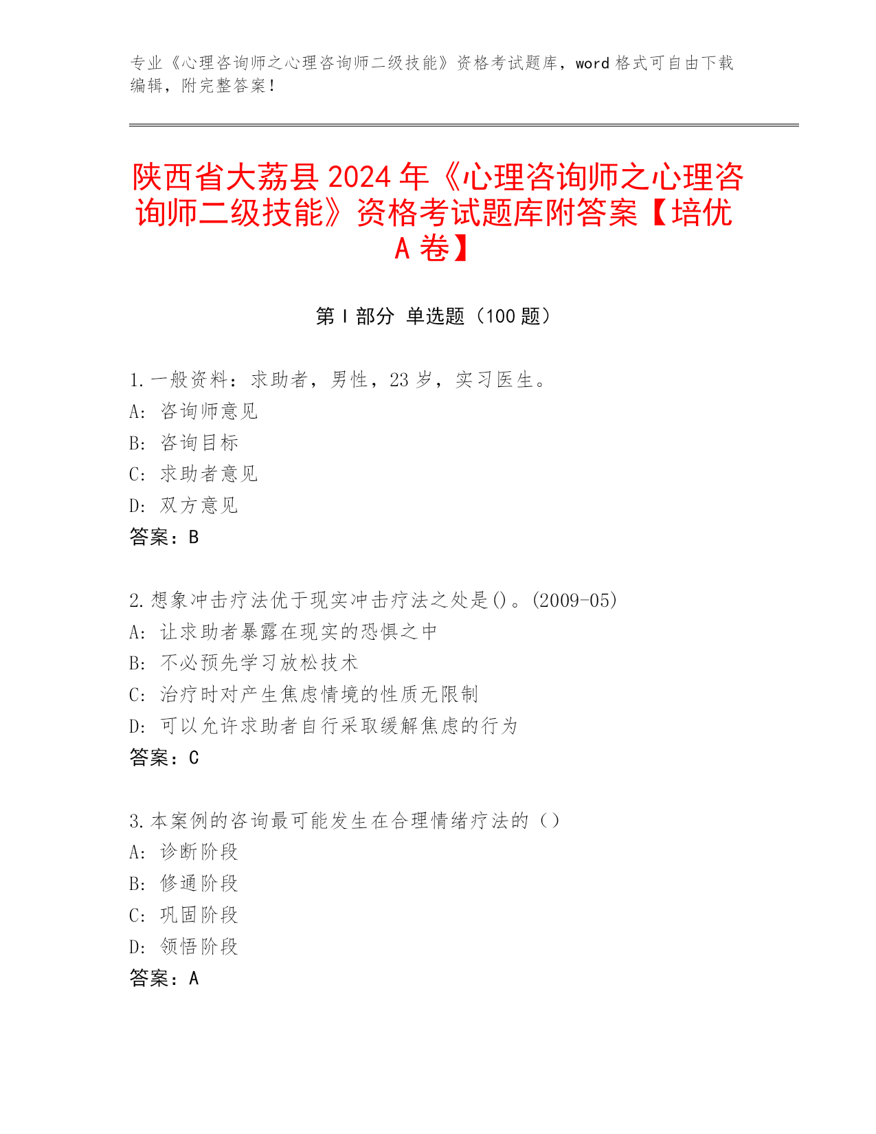 陕西省大荔县2024年《心理咨询师之心理咨询师二级技能》资格考试题库附答案【培优A卷】