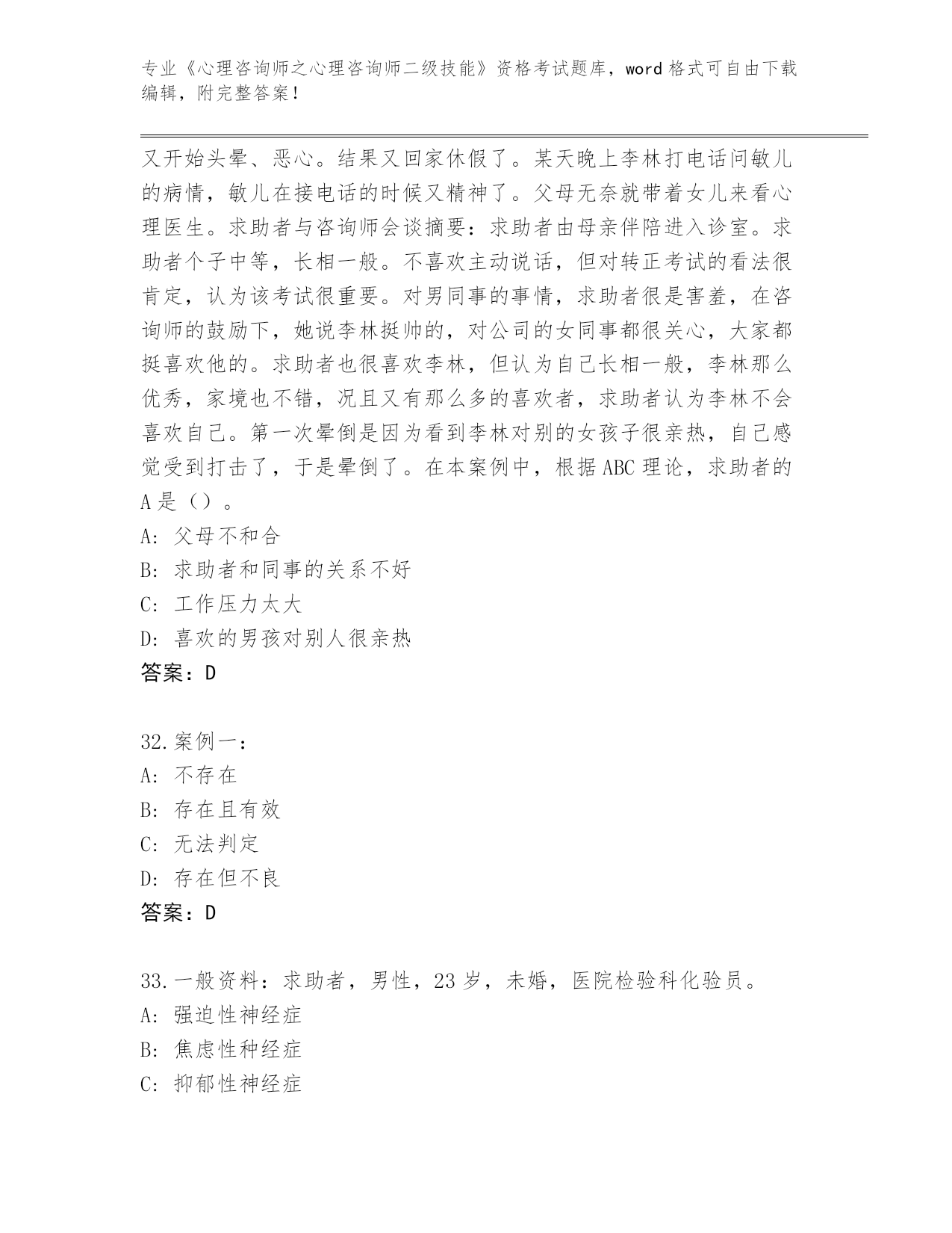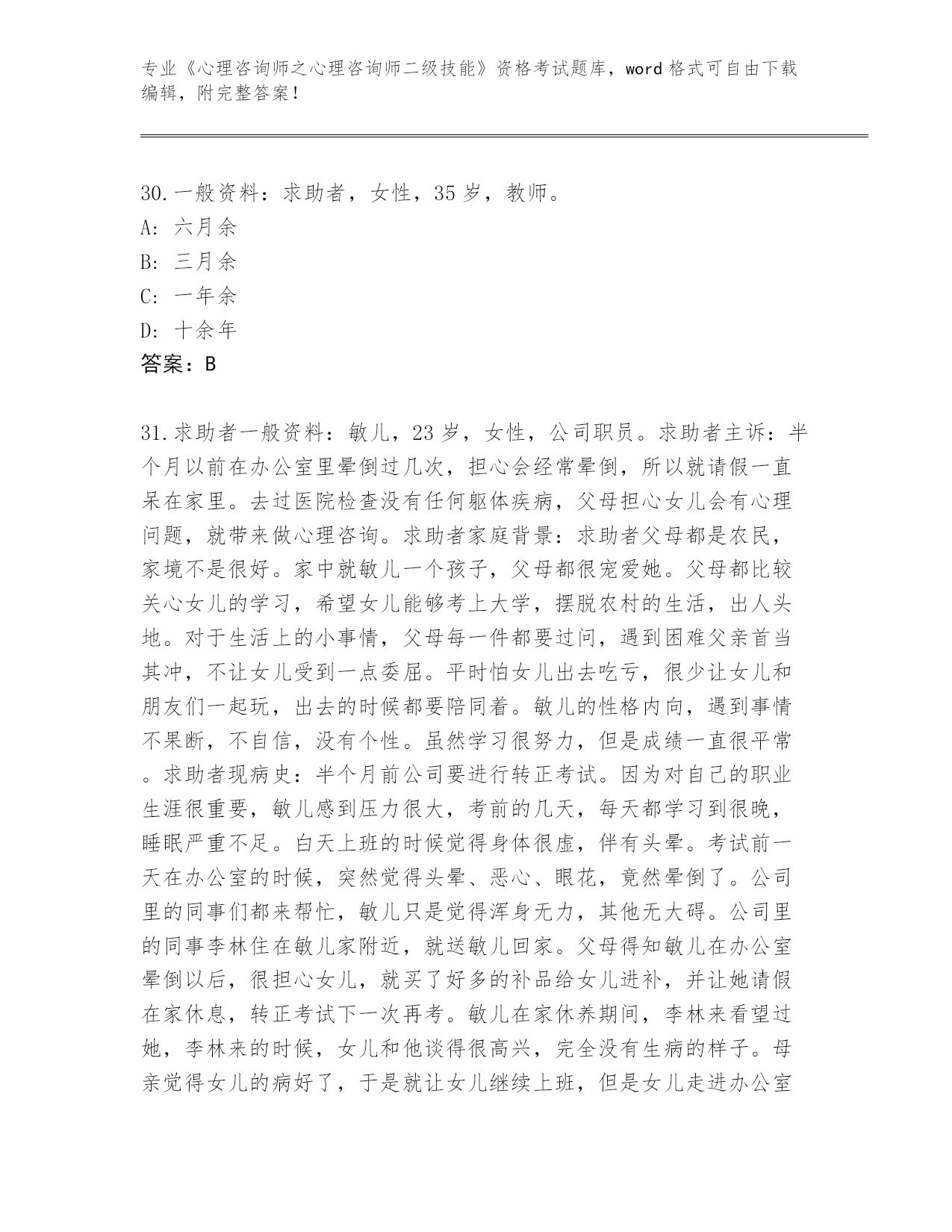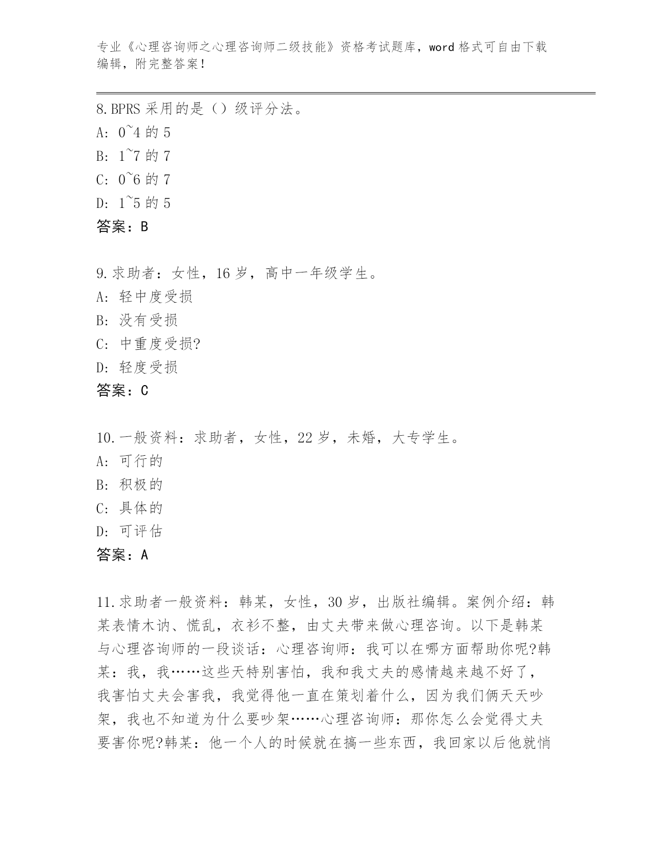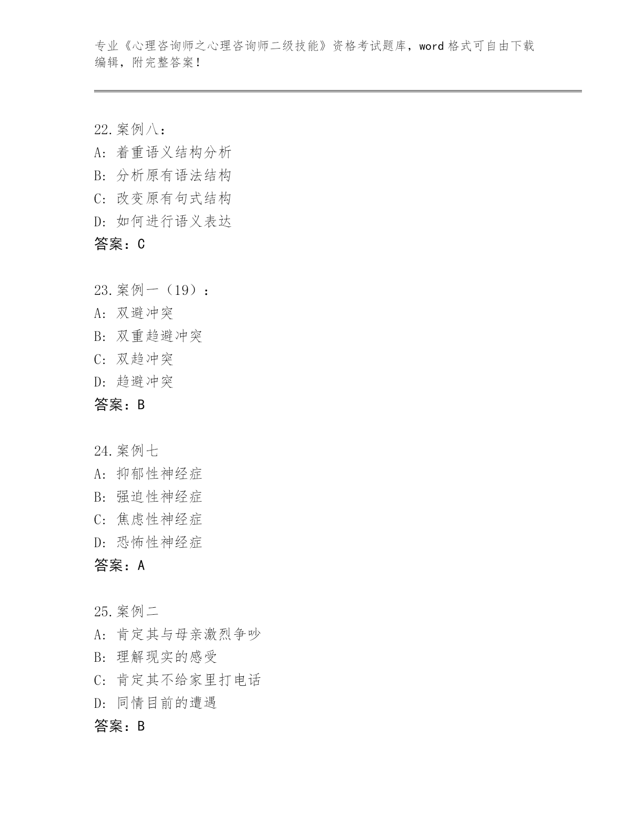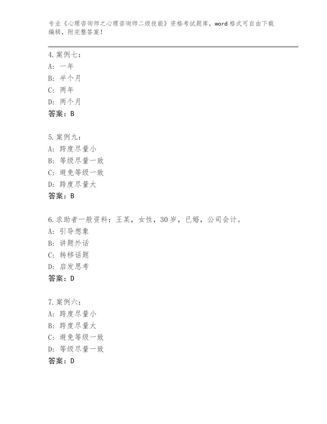 陕西省大荔县2024年《心理咨询师之心理咨询师二级技能》考试完整题库及答案