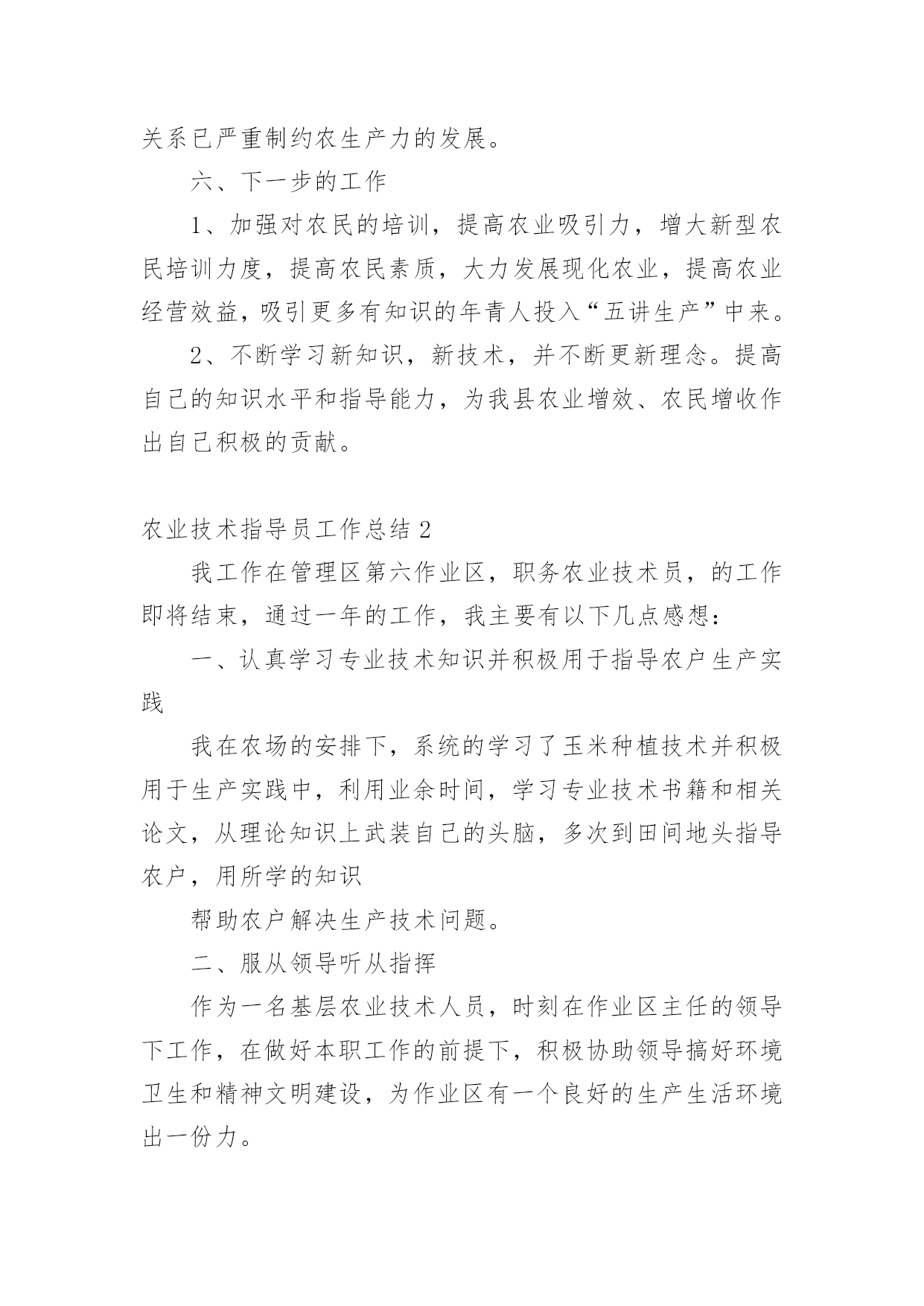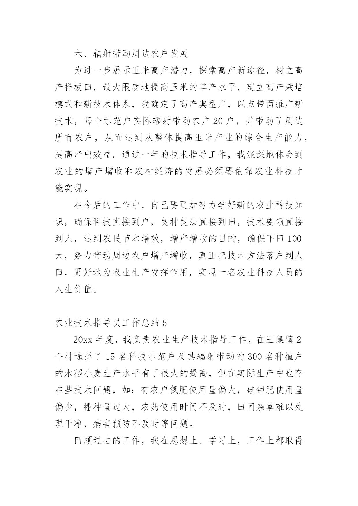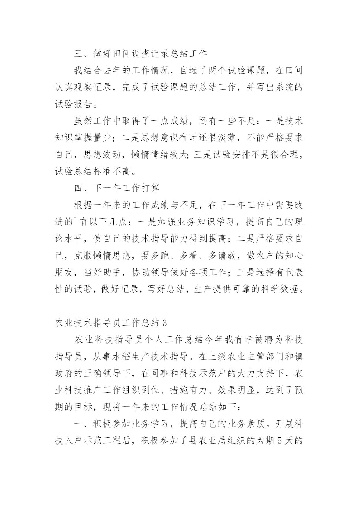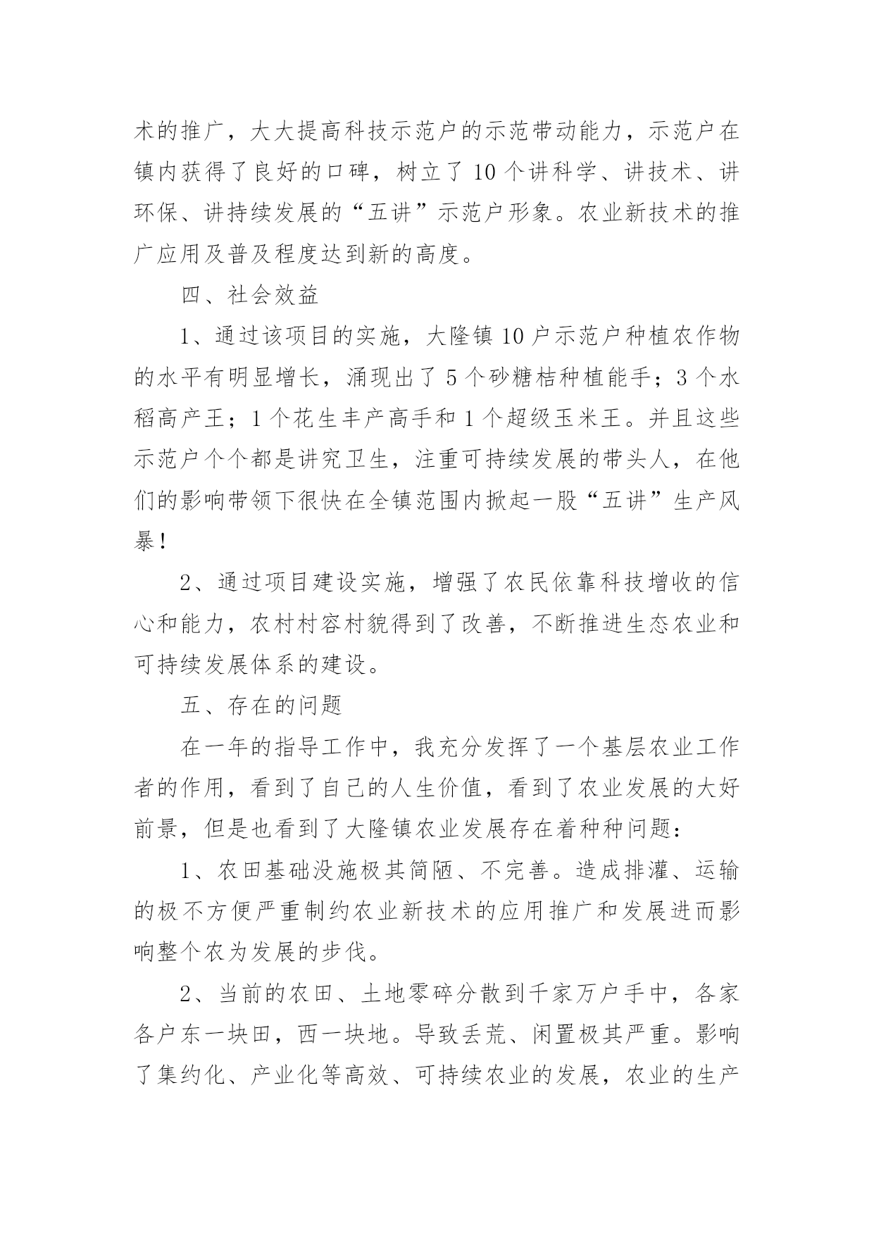 农业技术指导员工作总结总结在一个时期、一个年度、一个阶段对学习和工作生活等情况加以回顾和分析的一种书面材料,他能够提升我们的书面表达能力,不妨让我们认真地完成总结吧。但是却发现不知道该写些什么,以下是小编为大家收集的农业技术指导员工作总结,欢迎大家分享。农业技术指导员工作总结1xx年我被聘为岑溪市大隆镇《基层农技推广体系改革和建设示范县》项目的农业技术指导员,共联系了该镇科技示范户10个,两年来,我按照项目要求,通过不断创新工作机制,通过办培训班、出板报、现场指导等多种形式提升农民科学种植水平,推广新品种、新技术,促进农业科技成果快速转化,使广大农户取得了增产、增收,效果显著,现将有关工作总结如下:一、做好宣传,遴选技示范户,大隆镇是一个山区小镇,粮食作物主要是以水稻、玉米、为主,辅以一定的花生、砂糖桔等经济作物。经过广泛宣传,由农户自愿申请,村民委员会择优推荐,报县农业局审定,我遴选培养了10个具有较高文化程度,较高养殖水平,乐于助人,拥护党在农村的各项方针政策、遵纪守法、以礼诚信,具有丰富的生产实践经验,生产经营较好的农户为科技示范户,每个科技示范户辐射带动20户农户。我根据每个科技示范户的具体情况,制定了分户技术指导方案。认真填写了《技术指导员手册》和《示范户手册》明确了技术指导员与示范户的责任和权利,有效地为科技示范户提供技术指导服务。二、努力学习新知识、新技术,构建科学的农技推广体系积极参加基层农业人员的知识更新培训,我不断加强学习,提高自身素质和业务能力,一年来参加在梧州农校、隆平种业公司和市农业局会举办的农业科学新技术知识培训班,学习现代农业新知识、新技术并将所学的知识和技术传授给示范户,构建了专家—技术指导员—技术示范户—辐射带动户的科技成果快速转化通道,形成了科学的农技推广体系。三、加强新技术的.推广与应用为进一步加强农技新技术的推广应用,一年来先后进行了多次技术培训;并印发技术宣传手册;出版墙报及病虫情报等。主要以示范户为切入点,并通过示范户的示范辐射作用,迅速在广大农户中传播开来。以种植、田间管理、病虫害防治、市场信息等技术为培训推广内容。在各类作物生长的关键时节,采取理论与实践相结合,集中培训与田间分户现场指导科技示范户相结合,利用进村入户把有关技术资料发放到示范户手中,并及时解答农民的种植技术难题,同时结合美丽广西·清洁乡村的推广契机,引导示范户向“搞好生产,不忘环保”的生产模式前进,通过这些农业实用新技术的推广,大大提高科技示范户的示范带动能力,示范户在镇内获得了良好的口碑,树立了10个讲科学、讲技术、讲环保、讲持续发展的“五讲”示范户形象。农业新技术的推广应用及普及程度达到新的高度。四、社会效益1、通过该项目的实施,大隆镇10户示范户种植农作物的水平有明显增长,涌现出了5个砂糖桔种植能手;3个水稻高产王;1个花生丰产高手和1个超级玉米王。并且这些示范户个个都是讲究卫生,注重可持续发展的带头人,在他们的影响带领下很快在全镇范围内掀起一股“五讲”生产风暴!2、通过项目建设实施,增强了农民依靠科技增收的信心和能力,农村村容村貌得到了改善,不断推进生态农业和可持续发展体系的建设。五、存在的问题在一年的指导工作中,我充分发挥了一个基层农业工作者的作用,看到了自己的人生价值,看到了农业发展的大好前景,但是也看到了大隆镇农业发展存在着种种问题:1、农田基础没施极其简陋、不完善。造成排灌、运输的极不方便严重制约农业新技术的应用推广和发展进而影响整个农为发展的步伐。2、当前的农田、土地零碎分散到千家万户手中,各家各户东一块田,西一块地。导致丢荒、闲置极其严重。影响了集约化、产业化等高效、可持续农业的发展,农业的生产关系已严重制约农生产力的发展。六、下一步的工作1、加强对农民的培训,提高农业吸引力,增大新型农民培训力度,提高农民素质,大力发展现化农业,提高农业经营效益,吸引更多有知识的年青人投入“五讲生产”中来。2、不断学习新知识,新技术,并不断更新理念。提高自己的知识水平和指导能力,为我县农业增效、农民增收作出自己积极的贡献。农业技术指导员工作总结2我工作在管理区第六作业区,职务农业技术员,的工作即将结束,通过一年的工作,我主要有以下几点感想:一、认真学习专业技术知识并积极用于指导农户生产实践我在农场的安排下,系统的学习了玉米种植技术并积极用于生产实践中,利用业余时间,学习专业技术书籍和相关论文,从理论知识上武装自己的头脑,多次到田间地头指导农户,用所学的知识帮助农户解决生产技术问题。二、服从领导听从指挥作为一名基层农业技术人员,时刻在作业区主任的领导下工作,在做好本职工作的前提下,积极协助领导搞好环境卫生和精神文明建设,为作业区有一个良好的生产生活环境出一份力。三、做好田间调查记录总结工作我结合去年的工作情况