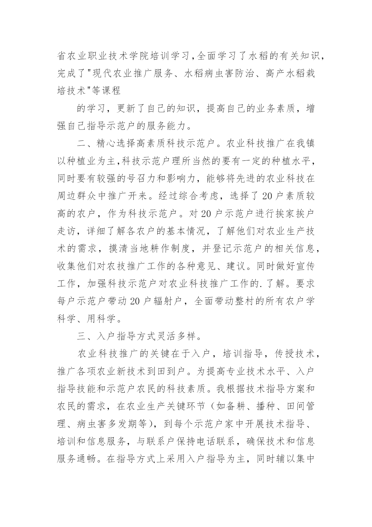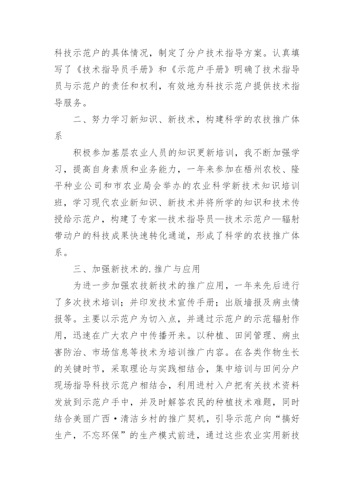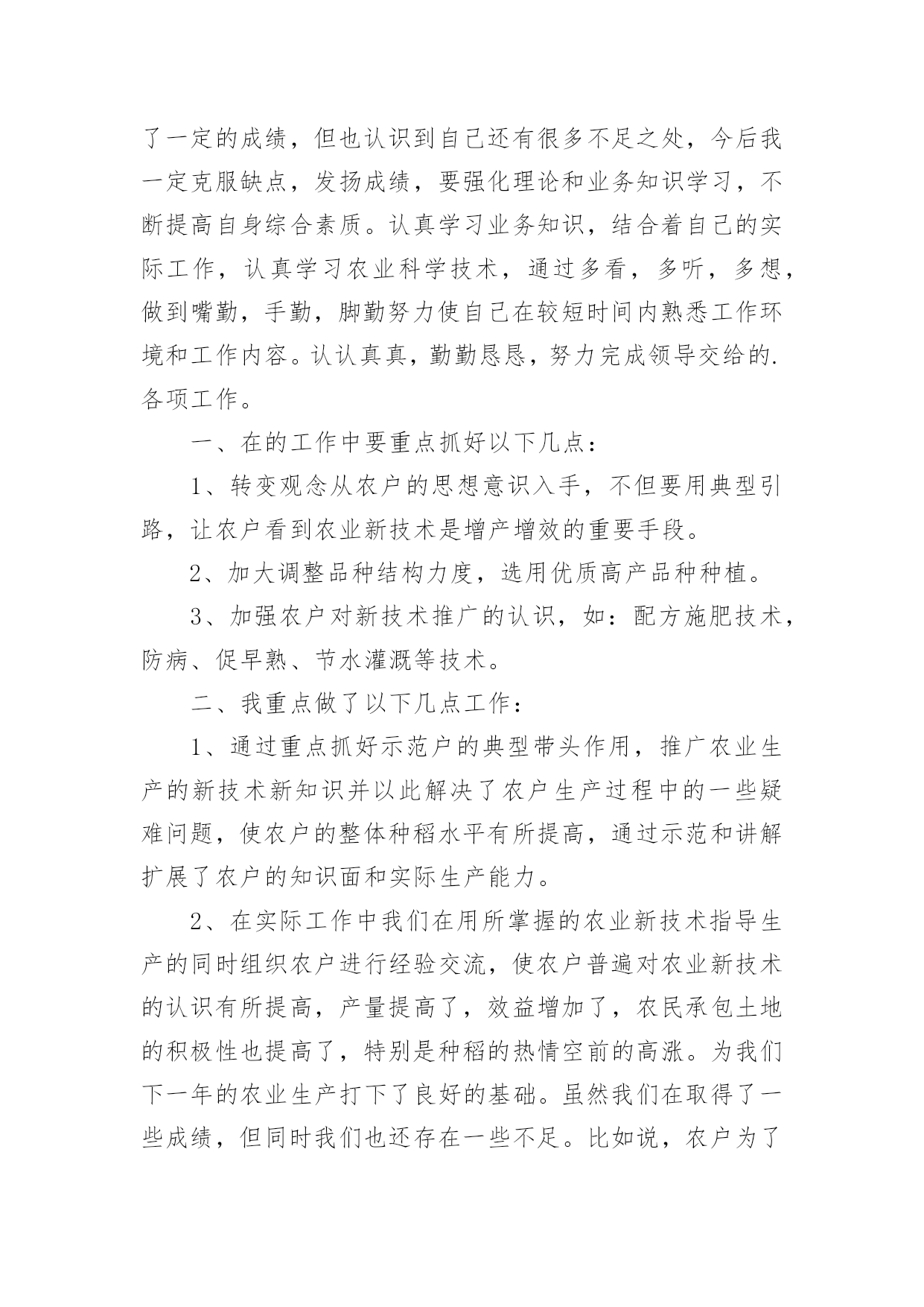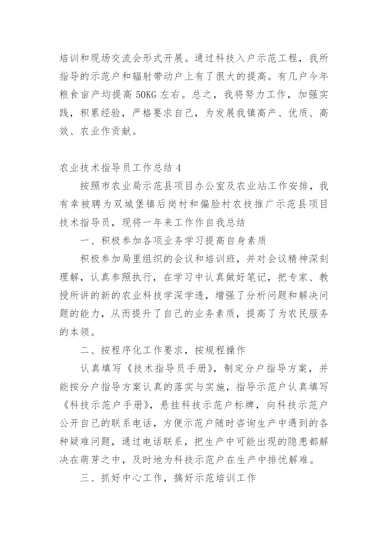农业技术指导员工作总结总结在一个时期、一个年度、一个阶段对学习和工作生活等情况加以回顾和分析的一种书面材料,他能够提升我们的书面表达能力,不妨让我们认真地完成总结吧。但是却发现不知道该写些什么,以下是小编为大家收集的农业技术指导员工作总结,欢迎大家分享。农业技术指导员工作总结1xx年我被聘为岑溪市大隆镇《基层农技推广体系改革和建设示范县》项目的农业技术指导员,共联系了该镇科技示范户10个,两年来,我按照项目要求,通过不断创新工作机制,通过办培训班、出板报、现场指导等多种形式提升农民科学种植水平,推广新品种、新技术,促进农业科技成果快速转化,使广大农户取得了增产、增收,效果显著,现将有关工作总结如下:一、做好宣传,遴选技示范户,大隆镇是一个山区小镇,粮食作物主要是以水稻、玉米、为主,辅以一定的花生、砂糖桔等经济作物。经过广泛宣传,由农户自愿申请,村民委员会择优推荐,报县农业局审定,我遴选培养了10个具有较高文化程度,较高养殖水平,乐于助人,拥护党在农村的各项方针政策、遵纪守法、以礼诚信,具有丰富的生产实践经验,生产经营较好的农户为科技示范户,每个科技示范户辐射带动20户农户。我根据每个科技示范户的具体情况,制定了分户技术指导方案。认真填写了《技术指导员手册》和《示范户手册》明确了技术指导员与示范户的责任和权利,有效地为科技示范户提供技术指导服务。二、努力学习新知识、新技术,构建科学的农技推广体系积极参加基层农业人员的知识更新培训,我不断加强学习,提高自身素质和业务能力,一年来参加在梧州农校、隆平种业公司和市农业局会举办的农业科学新技术知识培训班,学习现代农业新知识、新技术并将所学的知识和技术传授给示范户,构建了专家—技术指导员—技术示范户—辐射带动户的科技成果快速转化通道,形成了科学的农技推广体系。三、加强新技术的.推广与应用为进一步加强农技新技术的推广应用,一年来先后进行了多次技术培训;并印发技术宣传手册;出版墙报及病虫情报等。主要以示范户为切入点,并通过示范户的示范辐射作用,迅速在广大农户中传播开来。以种植、田间管理、病虫害防治、市场信息等技术为培训推广内容。在各类作物生长的关键时节,采取理论与实践相结合,集中培训与田间分户现场指导科技示范户相结合,利用进村入户把有关技术资料发放到示范户手中,并及时解答农民的种植技术难题,同时结合美丽广西·清洁乡村的推广契机,引导示范户向“搞好生产,不忘环保”的生产模式前进,通过这些农业实用新技术的推广,大大提高科技示范户的示范带动能力,示范户在镇内获得了良好的口碑,树立了10个讲科学、讲技术、讲环保、讲持续发展的“五讲”示范户形象。农业新技术的推广应用及普及程度达到新的高度。四、社会效益1、通过该项目的实施,大隆镇10户示范户种植农作物的水平有明显增长,涌现出了5个砂糖桔种植能手;3个水稻高产王;1个花生丰产高手和1个超级玉米王。并且这些示范户个个都是讲究卫生,注重可持续发展的带头人,在他们的影响带领下很快在全镇范围内掀起一股“五讲”生产风暴!2、通过项目建设实施,增强了农民依靠科技增收的信心和能力,农村村容村貌得到了改善,不断推进生态农业和可持续发展体系的建设。五、存在的问题在一年的指导工作中,我充分发挥了一个基层农业工作者的作用,看到了自己的人生价值,看到了农业发展的大好前景,但是也看到了大隆镇农业发展存在着种种问题:1、农田基础没施极其简陋、不完善。造成排灌、运输的极不方便严重制约农业新技术的应用推广和发展进而影响整个农为发展的步伐。2、当前的农田、土地零碎分散到千家万户手中,各家各户东一块田,西一块地。导致丢荒、闲置极其严重。影响了集约化、产业化等高效、可持续农业的发展,农业的生产关系已严重制约农生产力的发展。六、下一步的工作1、加强对农民的培训,提高农业吸引力,增大新型农民培训力度,提高农民素质,大力发展现化农业,提高农业经营效益,吸引更多有知识的年青人投入“五讲生产”中来。2、不断学习新知识,新技术,并不断更新理念。提高自己的知识水平和指导能力,为我县农业增效、农民增收作出自己积极的贡献。农业技术指导员工作总结2我工作在管理区第六作业区,职务农业技术员,的工作即将结束,通过一年的工作,我主要有以下几点感想:一、认真学习专业技术知识并积极用于指导农户生产实践我在农场的安排下,系统的学习了玉米种植技术并积极用于生产实践中,利用业余时间,学习专业技术书籍和相关论文,从理论知识上武装自己的头脑,多次到田间地头指导农户,用所学的知识帮助农户解决生产技术问题。二、服从领导听从指挥作为一名基层农业技术人员,时刻在作业区主任的领导下工作,在做好本职工作的前提下,积极协助领导搞好环境卫生和精神文明建设,为作业区有一个良好的生产生活环境出一份力。三、做好田间调查记录总结工作我结合去年的工作情况