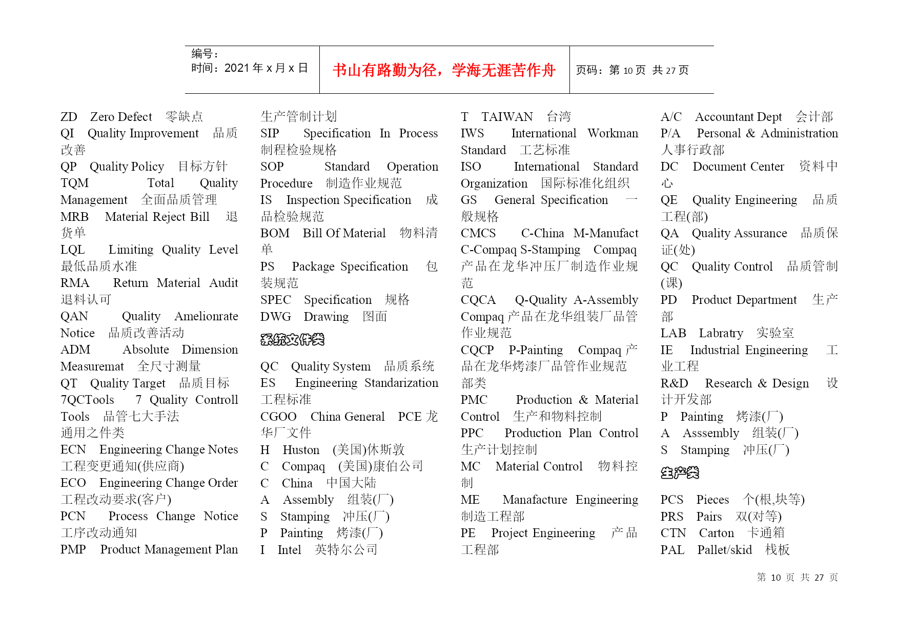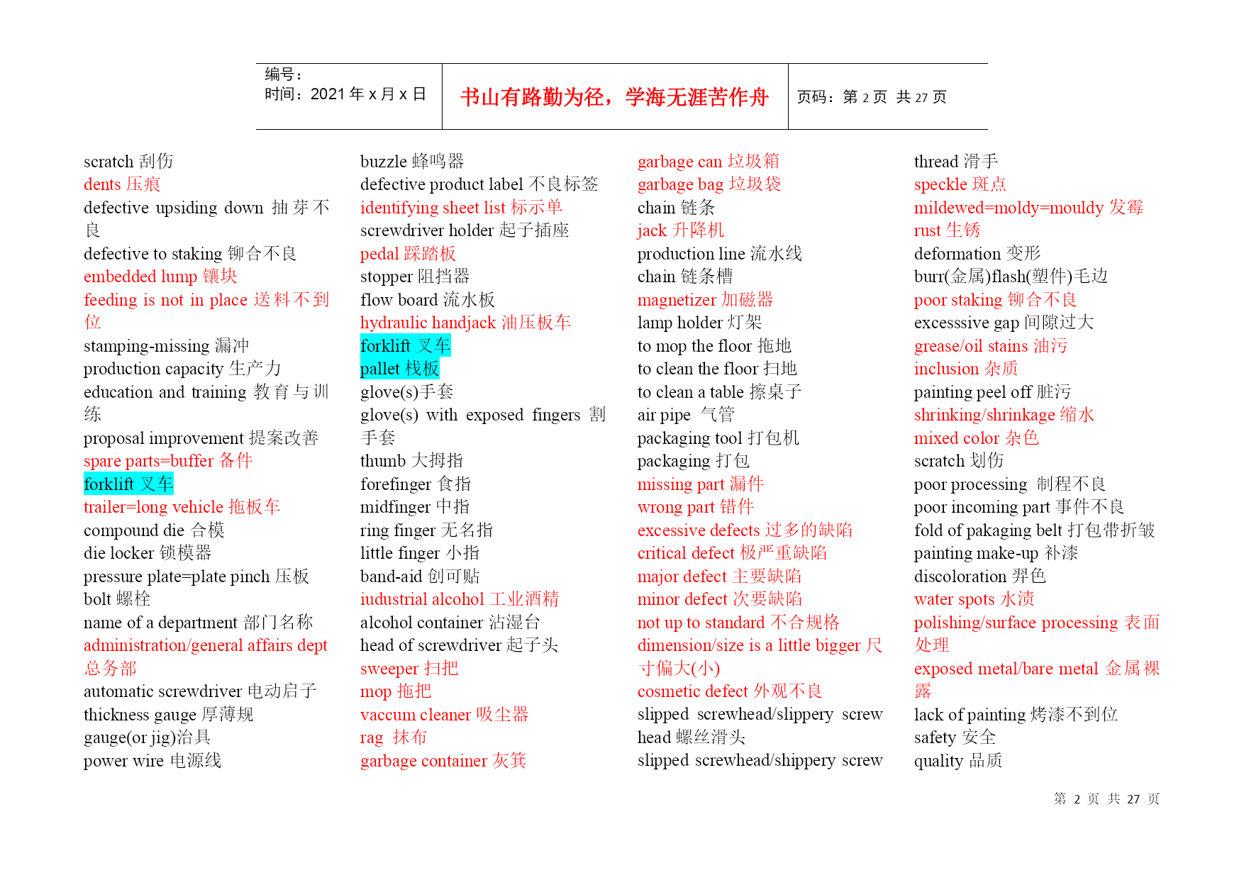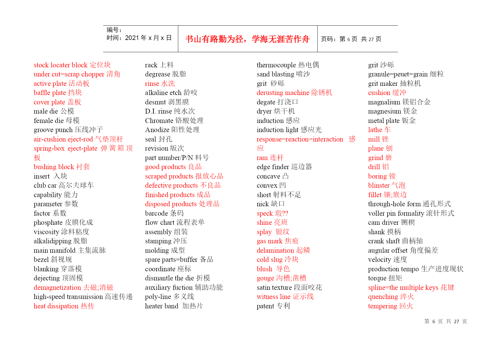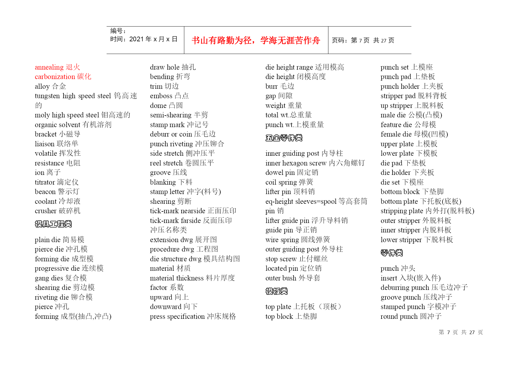 编号:时间:2021年x月x日书山有路勤为径,学海无涯苦作舟页码:第PAGE27页共NUMPAGES27页第PAGE\*MERGEFORMAT27页共NUMPAGES\*MERGEFORMAT27页组装、冲压、喷漆等专业词汇Assemblyline组装线Layout布置图Conveyer流水线物料板Rivettable拉钉机Rivetgun拉钉枪Screwdriver起子Electricscrewdriver电动起子Pneumaticscrewdriver气动起子worktable工作桌OOBA开箱检查fittogether组装在一起fasten锁紧(螺丝)fixture夹具(治具)pallet栈板barcode条码barcodescanner条码扫描器fusetogether熔合fusemachine热熔机repair修理operator作业员QC品管supervisor课长ME制造工程师MT制造生技cosmeticinspect外观检查innerpartsinspect内部检查thumbscrew大头螺丝lbs.inch镑、英寸EMIgasket导电条frontplate前板rearplate后板chassis基座bezelpanel面板powerbutton电源按键resetbutton重置键Hi-pottestofSPS高源高压测试VoltageswitchofSPS电源电压接拉键sheetmetalparts冲件plasticparts塑胶件SOP制造作业程序materialchecklist物料检查表workcell工作间trolley台车carton纸箱sub-line支线leftfork叉车personnelresourcedepartment人力资源部productiondepartment生产部门planningdepartment企划部QCSection品管科stampingfactory冲压厂paintingfactory烤漆厂moldingfactory成型厂commonequipment常用设备uncoilerandstraightener整平机punchingmachine冲床robot机械手hydraulicmachine油压机lathe车床planer|'plein|刨床miller铣床grinder磨床driller??床linearcutting线切割electricalsparkle电火花welder电焊机staker=revitingmachine铆合机position职务president董事长generalmanager总经理specialassistantmanager特助factorydirector厂长departmentdirector部长deputymanager|=vicemanager副理sectionsupervisor课长deputysectionsupervisor=vicesectionsuperisor副课长groupleader/supervisor组长linesupervisor线长assistantmanager助理tomove,tocarry,tohandle搬运beputinstorage入库packpacking包装toapplyoil擦油tofileburr锉毛刺finalinspection终检toconnectmaterial接料toreversematerial翻料wetstation沾湿台Tiana天那水cleaningcloth抹布toloadmaterial上料tounloadmaterial卸料toreturnmaterial/stockto退料scraped|'skræpid|报废scrape..v.刮;削deficientpurchase来料不良manufactureprocedure制程deficientmanufacturingprocedure制程不良oxidation|'ksi'dein|氧化scratch刮伤dents压痕defectiveupsidingdown抽芽不良defectivetostaking铆合不良embeddedlump镶块feedingisnotinplace送料不到位stamping-missing漏冲productioncapacity生产力educationandtraining教育与训练pro