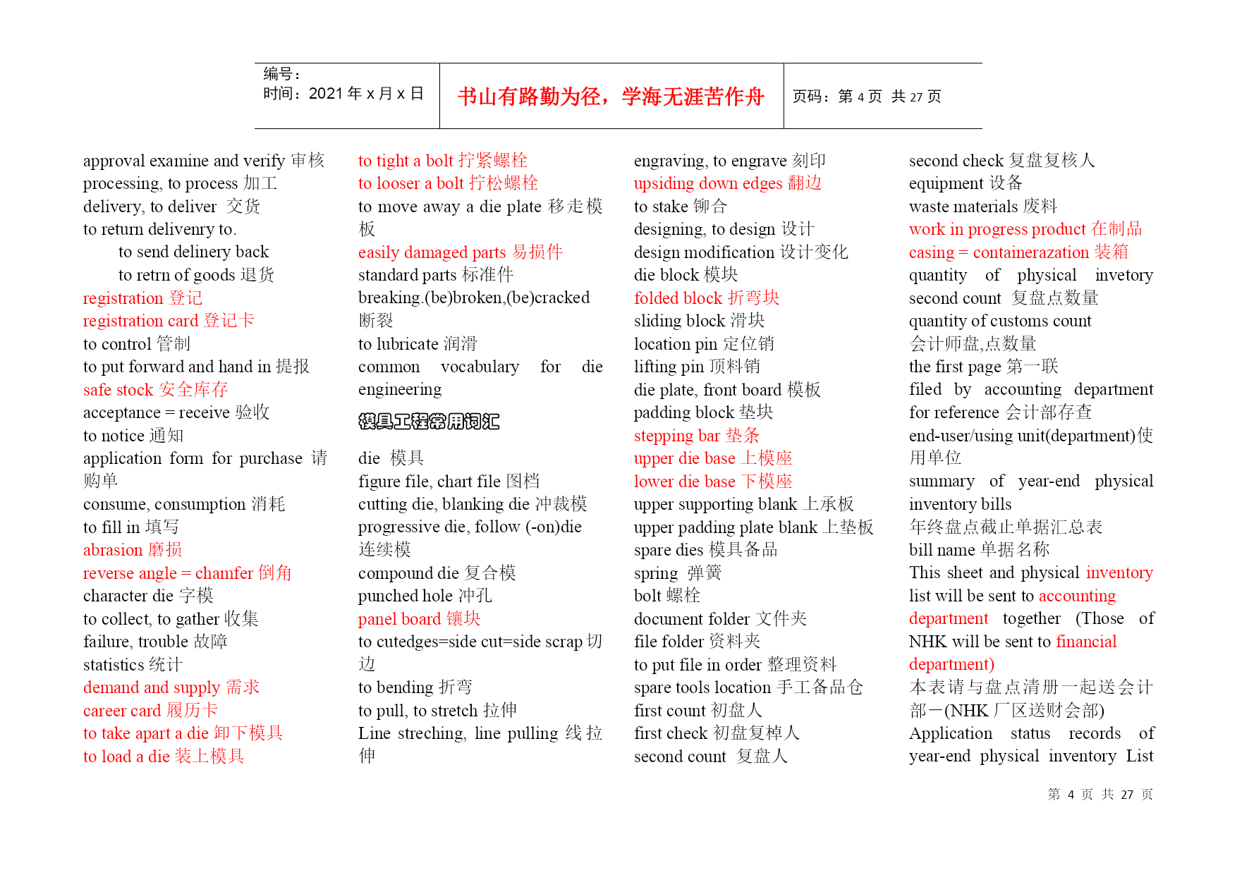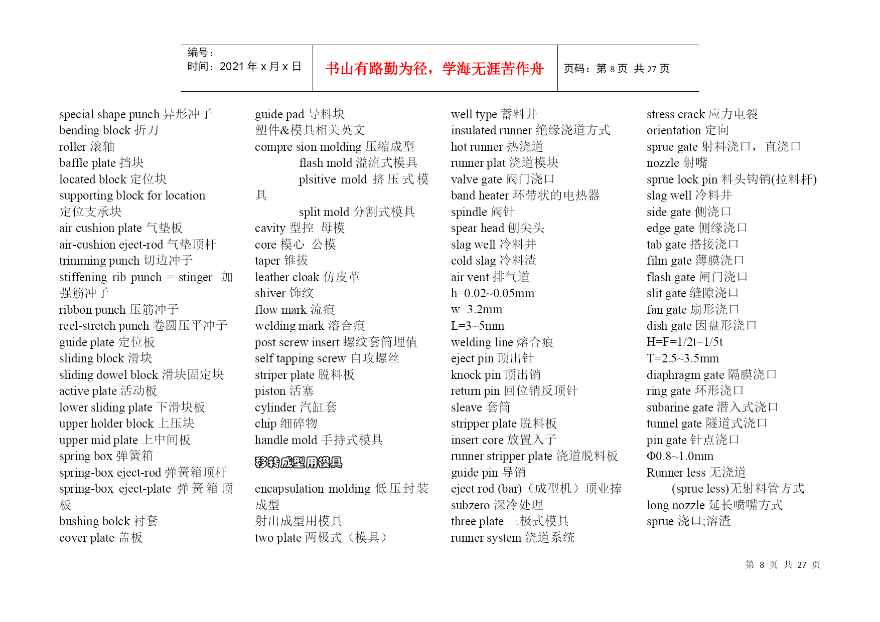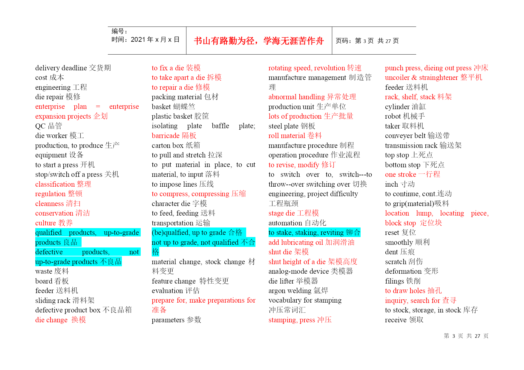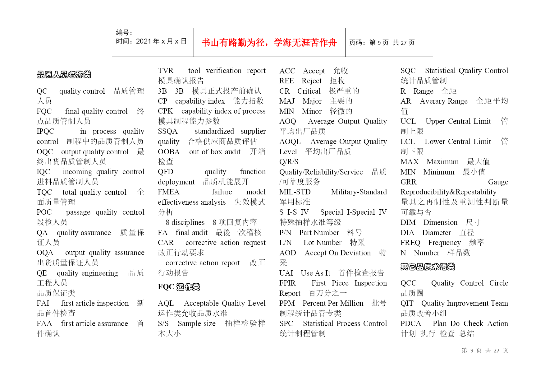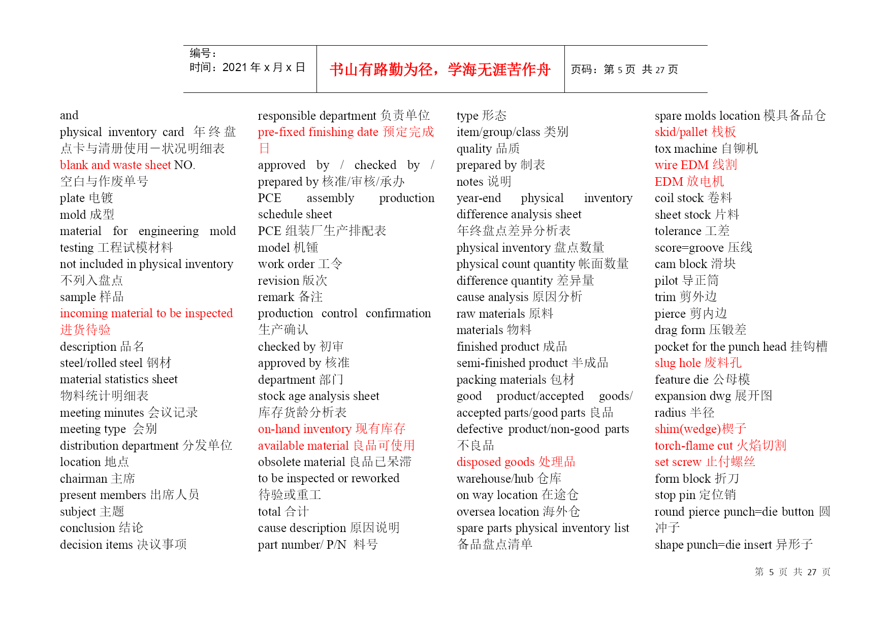 编号:时间:2021年x月x日书山有路勤为径,学海无涯苦作舟页码:第PAGE27页共NUMPAGES27页第PAGE\*MERGEFORMAT27页共NUMPAGES\*MERGEFORMAT27页组装、冲压、喷漆等专业词汇Assemblyline组装线Layout布置图Conveyer流水线物料板Rivettable拉钉机Rivetgun拉钉枪Screwdriver起子Electricscrewdriver电动起子Pneumaticscrewdriver气动起子worktable工作桌OOBA开箱检查fittogether组装在一起fasten锁紧(螺丝)fixture夹具(治具)pallet栈板barcode条码barcodescanner条码扫描器fusetogether熔合fusemachine热熔机repair修理operator作业员QC品管supervisor课长ME制造工程师MT制造生技cosmeticinspect外观检查innerpartsinspect内部检查thumbscrew大头螺丝lbs.inch镑、英寸EMIgasket导电条frontplate前板rearplate后板chassis基座bezelpanel面板powerbutton电源按键resetbutton重置键Hi-pottestofSPS高源高压测试VoltageswitchofSPS电源电压接拉键sheetmetalparts冲件plasticparts塑胶件SOP制造作业程序materialchecklist物料检查表workcell工作间trolley台车carton纸箱sub-line支线leftfork叉车personnelresourcedepartment人力资源部productiondepartment生产部门planningdepartment企划部QCSection品管科stampingfactory冲压厂paintingfactory烤漆厂moldingfactory成型厂commonequipment常用设备uncoilerandstraightener整平机punchingmachine冲床robot机械手hydraulicmachine油压机lathe车床planer|'plein|刨床miller铣床grinder磨床driller??床linearcutting线切割electricalsparkle电火花welder电焊机staker=revitingmachine铆合机position职务president董事长generalmanager总经理specialassistantmanager特助factorydirector厂长departmentdirector部长deputymanager|=vicemanager副理sectionsupervisor课长deputysectionsupervisor=vicesectionsuperisor副课长groupleader/supervisor组长linesupervisor线长assistantmanager助理tomove,tocarry,tohandle搬运beputinstorage入库packpacking包装toapplyoil擦油tofileburr锉毛刺finalinspection终检toconnectmaterial接料toreversematerial翻料wetstation沾湿台Tiana天那水cleaningcloth抹布toloadmaterial上料tounloadmaterial卸料toreturnmaterial/stockto退料scraped|'skræpid|报废scrape..v.刮;削deficientpurchase来料不良manufactureprocedure制程deficientmanufacturingprocedure制程不良oxidation|'ksi'dein|氧化scratch刮伤dents压痕defectiveupsidingdown抽芽不良defectivetostaking铆合不良embeddedlump镶块feedingisnotinplace送料不到位stamping-missing漏冲productioncapacity生产力educationandtraining教育与训练pro
