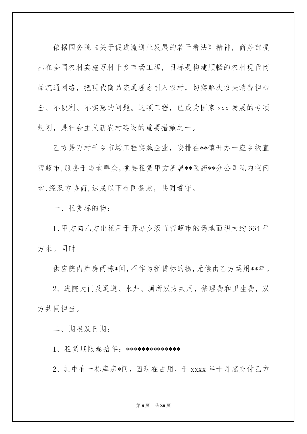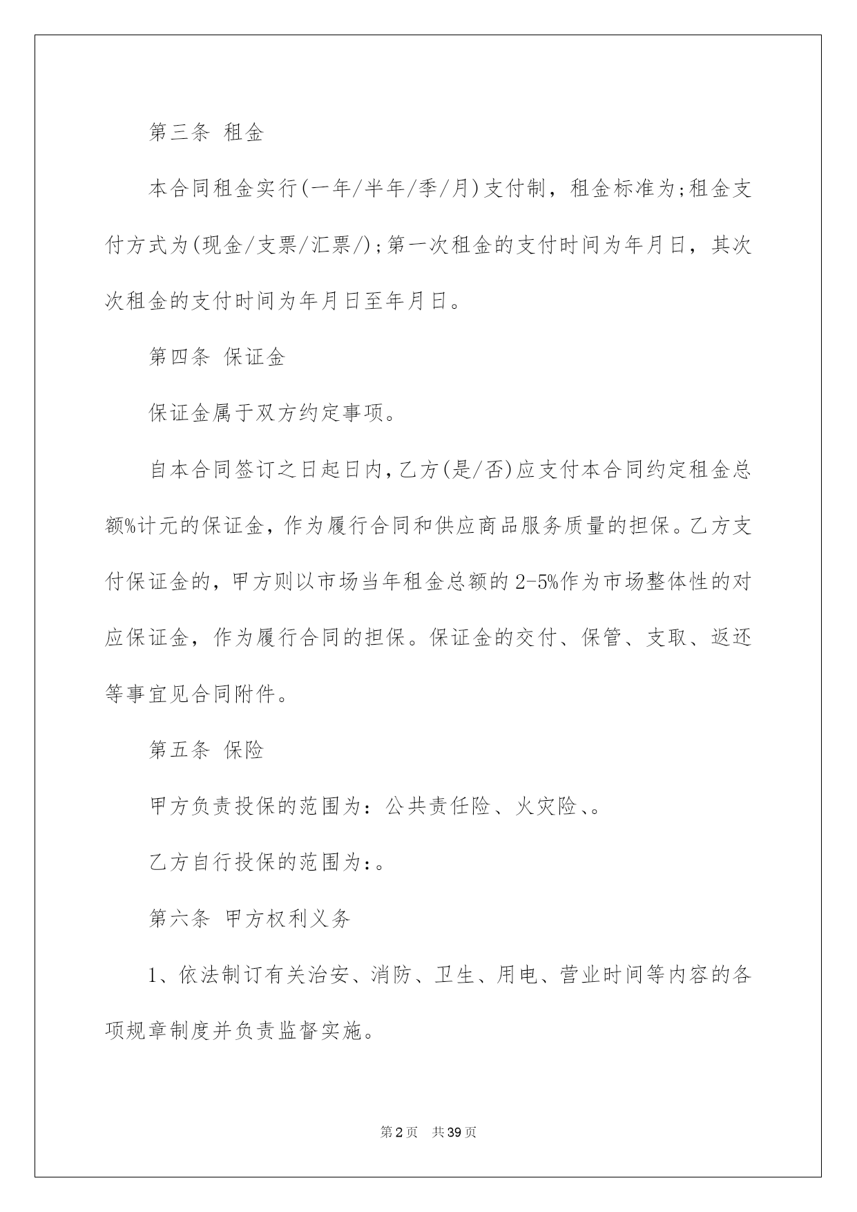 第PAGE\*Arabic\*MERGEFORMAT39页共NUMPAGES\*Arabic\*MERGEFORMAT39页第PAGE\*MERGEFORMAT39页共NUMPAGES\*MERGEFORMAT39页第PAGE\*MERGEFORMAT39页共NUMPAGES\*MERGEFORMAT39页第PAGE\*MERGEFORMAT39页共NUMPAGES\*MERGEFORMAT39页第PAGE\*MERGEFORMAT39页共NUMPAGES\*MERGEFORMAT39页第PAGE\*MERGEFORMAT39页共NUMPAGES\*MERGEFORMAT39页第PAGE\*MERGEFORMAT39页共NUMPAGES\*MERGEFORMAT39页第PAGE\*MERGEFORMAT39页共NUMPAGES\*MERGEFORMAT39页第PAGE\*MERGEFORMAT39页共NUMPAGES\*MERGEFORMAT39页第PAGE\*MERGEFORMAT39页共NUMPAGES\*MERGEFORMAT39页第PAGE\*MERGEFORMAT39页共NUMPAGES\*MERGEFORMAT39页2022场地租赁合同有关场地租赁合同范文锦集六篇随着人们对法律的了解日益加深,合同的法律效力与日俱增,合同是企业发展中一个特别重要的因素。知道吗,写合同可是有方法的哦,下面是我整理的场地租赁合同6篇,欢迎阅读与保藏。场地租赁合同篇1出租人(甲方):承租人(乙方):依据《中华人民共和国合同法》等有关法律、法规的规定,双方就租赁场地从事经营的事宜经协商达成协议如下:第一条租赁场地乙方承租甲方(层/厅)号场地,面积平方米,用途以营业执照核准的经营范围为准;库房平方米,库房位置为。其次条租赁期限自年月日起至年月日止,共计年个月;其中免租期为自年月日起至年月日。第三条租金本合同租金实行(一年/半年/季/月)支付制,租金标准为;租金支付方式为(现金/支票/汇票/);第一次租金的支付时间为年月日,其次次租金的支付时间为年月日至年月日。第四条保证金保证金属于双方约定事项。自本合同签订之日起日内,乙方(是/否)应支付本合同约定租金总额%计元的保证金,作为履行合同和供应商品服务质量的担保。乙方支付保证金的,甲方则以市场当年租金总额的2-5%作为市场整体性的对应保证金,作为履行合同的担保。保证金的交付、保管、支取、返还等事宜见合同附件。第五条保险甲方负责投保的范围为:公共责任险、火灾险、。乙方自行投保的范围为:。第六条甲方权利义务1、依法制订有关治安、消防、卫生、用电、营业时间等内容的各项规章制度并负责监督实施。2、帮助各级行政管理机关对违反有关规定的乙方进行监督、教化、整顿,直至单方解除合同。3、应按约定为乙方供应场地及相关配套设施和经营条件,保障乙方正常经营。4、除有明确约定外,不得干涉乙方正常的经营活动。5、应对市场进行商业管理,维护并改善市场的整体形象,包括:对商品品种的规划和限制、功能区域的划分、商品档次的定位、商品经营的管理及质量管理;服务质量管理;营销管理;形象设计;市场调研;公共关系协调;纠纷调解;人员培训;。6、应对市场进行物业管理,并负责市场内的平安防范和经营设施的建设及维护,包括:建筑物(包括公共区域及租赁场地)的管理及修理保养;对乙方装修的审查和监督;水、电、气、空调、电梯、扶梯等设备、管道、线路、设施及系统的管理、修理及保养;清洁管理;保安管理并负责市场的公共平安;消防管理;内外各种通道、道路、停车场的管理;。7、做好市场的整体广告宣扬,并保证全年广告宣扬费用不低于市场全年租金总额的%。第七条乙方权利义务1、有权监督甲方履行合同约定的各项义务。2、应具备合法的经营资格,并根据工商行政管理部门核准的经营范围亮证照经营。3、应根据约定的用途开展经营活动,自觉遵守甲方依法制订的各项规章制度及索票索证制度,听从甲方的监督管理。4、应按期支付租金并担当因经营产生的各项税费。5、应爱惜并合理运用市场内的各项设施,如需改动应先征得甲方同意,造成损坏的还应担当修复或赔偿责任。6、应根据各级行政管理部门的规定,本着公允合理、诚恳信用的原则合法经营,不得损害国家利益及其他经营者和消费者的合法权益,并担当因违法经营造成的一切后果。7、将场地转让给第三人或和其他租户交换场地的,应先征得甲方的书面同意,按规定办理相关手续,并不得出租、转让、转借、出卖营业执照。8、应根据甲方的要求供应有关本人或本企业的备案资料。9、建筑物外立面及建筑物内部非乙方承租场地范围内的广告发布权