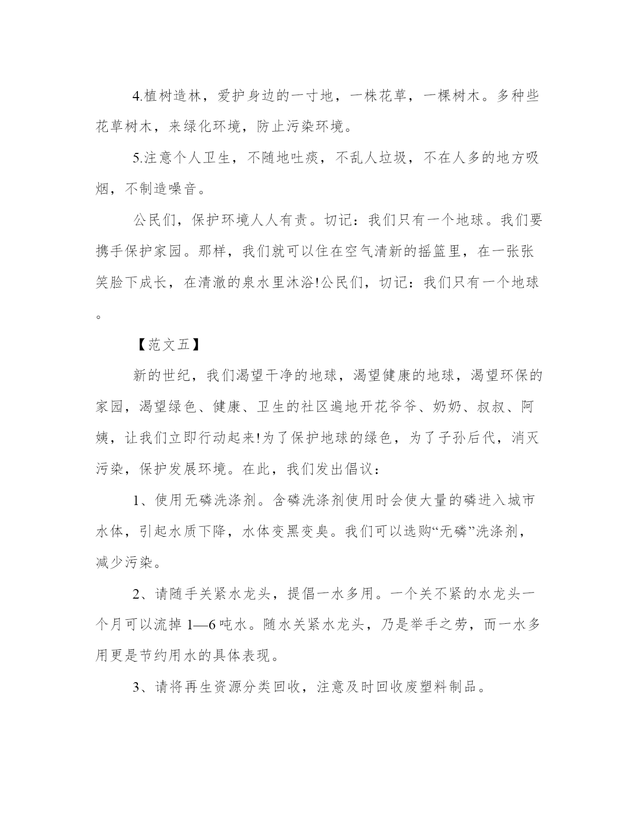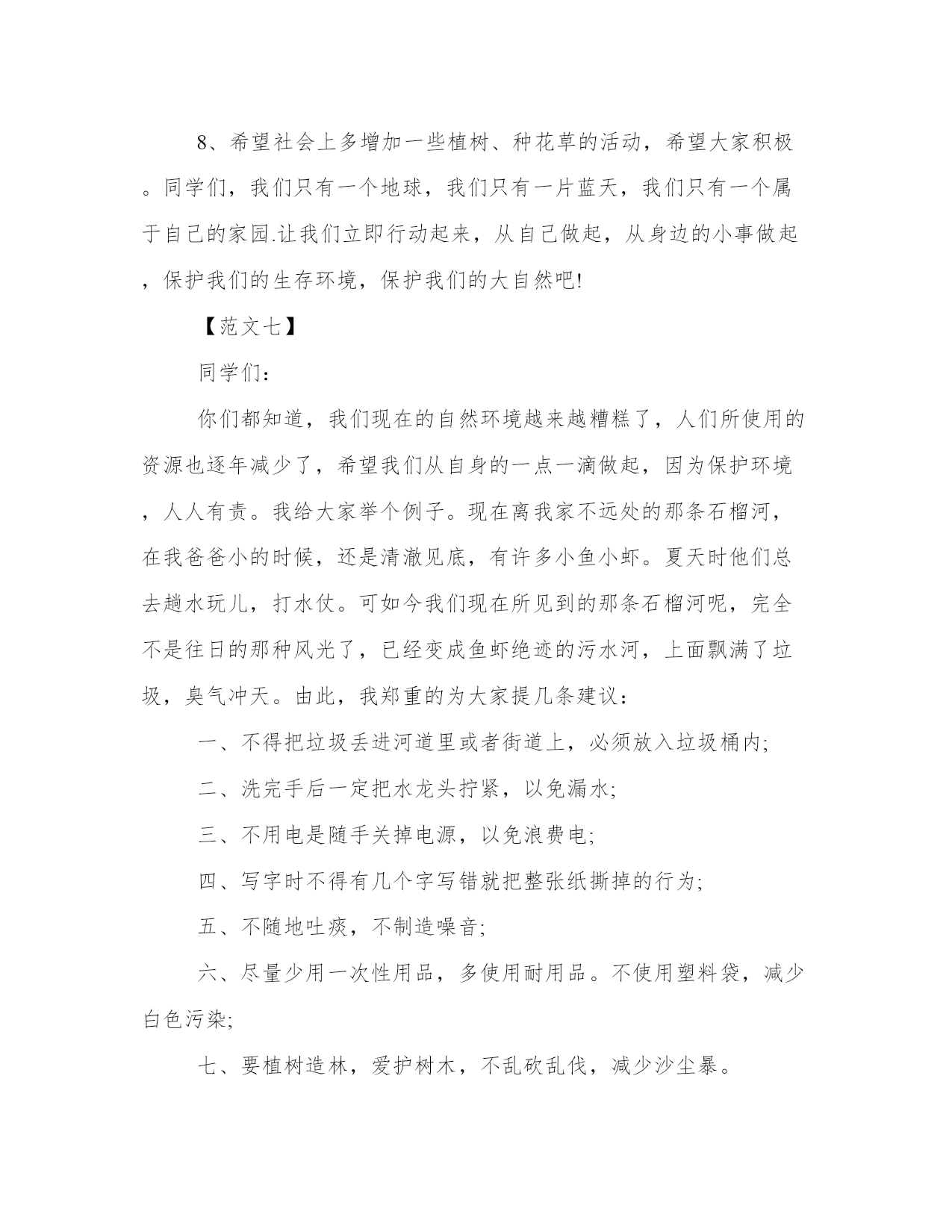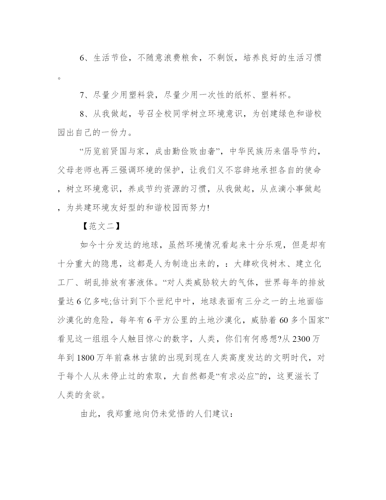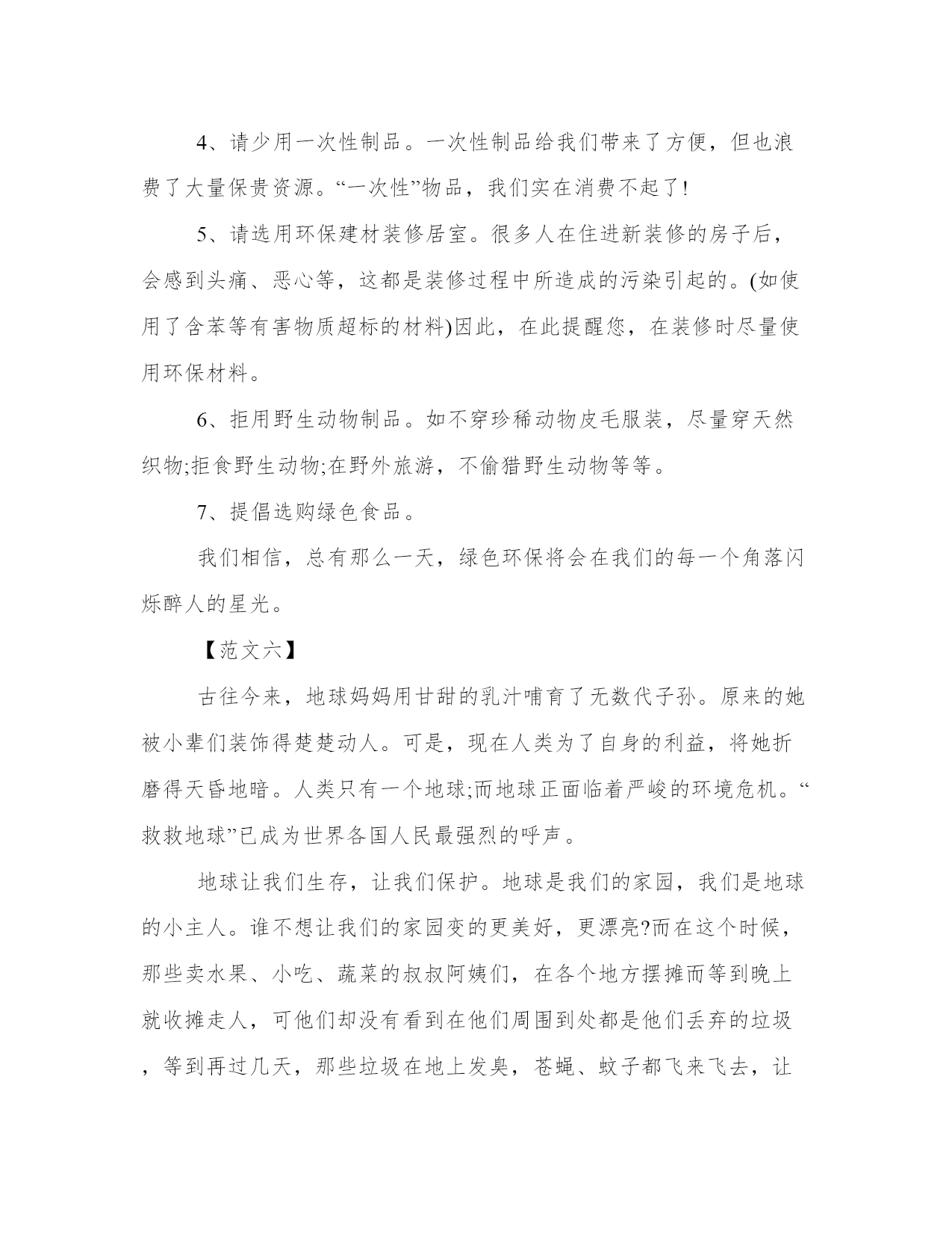 环保倡议书范文7篇亲爱的同学们:当你在这美丽的校园中学习,为我们美好的未来而努力时,相信我们每一个同学都渴望有一个干净的校园,渴望健康的生命,渴望绿色,渴望我们有一个良好的生活环境。学校是育人的场所,环境教育是提高我们思想道德素质和科学文化素质的基本手段之一,建立节约型和环境友好型校园,这不仅是学校自身发展的需要,更是我们学生应有的社会责任。为了增强大家的环境保护意识,让校园、班级环境更加整洁靓丽,有利于创建绿色和谐的校园环境,我们“校园环境志愿者”活动小组恳切地向师生们提出如下倡议:1、树立绿色文明观念,自觉关心环境状况,把个人环保行为视为个人文明修养的组成部分。2、不乱扔垃圾,果皮纸屑,不随地吐痰,不随意采摘校园的一草一木,爱护公共绿地。3、爱护仪器、设备和公物,使设备始终保持完好状态,尽力减少损坏维修。4、节约用水,珍惜水资源,减少水污染;节约用电,做到人走灯灭,光线充足时不要开灯,避免“白昼灯”、“长明灯的情况发生,微机室电脑用后及时关机5、节约用纸,尽量少用餐巾纸,草稿纸等尽量两面用。6、生活节俭,不随意浪费粮食,不剩饭,培养良好的生活习惯。7、尽量少用塑料袋,尽量少用一次性的纸杯、塑料杯。8、从我做起,号召全校同学树立环境意识,为创建绿色和谐校园出自己的一份力。“历览前贤国与家,成由勤俭败由奢”,中华民族历来倡导节约,父母老师也再三强调环境的保护,让我们义不容辞地承担各自的使命,树立环境意识,养成节约资源的习惯,从我做起,从点滴小事做起,为共建环境友好型的和谐校园而努力!【范文二】如今十分发达的地球,虽然环境情况看起来十分乐观,但是却有十分重大的隐患,这都是人为制造出来的,:大肆砍伐树木、建立化工厂、胡乱排放有害液体。“对人类威胁较大的气体,世界每年的排放量达6亿多吨;估计到下个世纪中叶,地球表面有三分之一的土地面临沙漠化的危险,每年有6平方公里的土地沙漠化,威胁着60多个国家”看见这一组组令人触目惊心的数字,人类,你们有何感想?从2300万年到1800万年前森林古猿的出现到现在人类高度发达的文明时代,对于每个人从未停止过的索取,大自然都是“有求必应”的,这更滋长了人类的贪欲。由此,我郑重地向仍未觉悟的人们建议:第一,人类要想征服可怕的大自然,就必须尊重自然。对于改造自然理应慎之又慎,又要大刀阔斧,勇于实践和改良,才能控制自然,使自身利益与自然协调发展,决不能重蹈西方发达国家“先污染,后治理”的覆辙。第二,要从我做起,首先选择有利于保护环境的生活方式。善待我们的家园、善待地球,共创一个美好的生活环境。1、节约资源减少污染(1)节水为荣,随时关上水龙头,防止滴漏。(2)慎用清洁剂,尽量用肥皂,减少洗涤剂中的化学物质对水的污染。2、绿色消费环保选择(1)用无铅汽油、无镉铅电池、无磷洗涤剂,减少水与空气的污染。(2)购买低砩家用制冷器具、无砩发用摩丝,减少对臭氧层的污染。3、重复使用多次利用尽量少使用一次性用品,多使用耐用品。如不使用一次性塑料和餐盒,减少白色污染;不使用一次性筷子;自备购物口袋或提篮。4、分类回收循环再用不乱丢弃废电池、废塑料等垃圾、废物;将垃圾分类投放,变废为宝,使资源循环再生,造福人类。5、保护自然万物共存不猎杀、使用珍稀动物和受保护的动物,关爱与保护野生动植物;植树造林,爱护我们身边的每一寸绿地、每一株花草、每一片树木。6、讲究卫生保护环境不随地吐痰,不乱扔垃圾,不在公共场所吸烟,不制造噪音。作为新时代的小学生,我倡导同学门提高保护环境的意识,也建议叔叔阿姨们加入我们的队伍中来,为保护环境、造福后代贡献自己的力量。因为:保护环境,刻不容缓!保护地球,从我做起!【范文三】敬爱的市长伯伯:您好!地球,是人类的母亲,是生命的摇篮。青草、绿叶、花朵是我们的姐妹;骏马、雄鹰、狮子,是我们的兄弟。山川河流,是地球母亲的乳汁,哺育着我们健康成长;微风,是地球母亲那布满老茧的双手,轻轻抚摸着我们的脸颊。可是,市长伯伯您知道吗,我们生活的环境已经遭到了严重破坏!大街上,随地吐痰,乱扔果皮杂物的现象随处可见。有的人,把垃圾随手一扔,可是前面明明就有一个离自己只有几米远的垃圾桶!他们,也不肯往前多走一步。在回家路上,常常可以看见许多摆摊的小贩在卖烧烤等小吃。一缕缕的烟,蔓延到马路上,使得行人纷纷捂住口鼻行走。这些摊贩只顾个人利益,却浑然不知自己已经污染了环境。我们的地球母亲整天以泪洗面,因为人们不懂得珍惜她,爱护她,所以才使得我们的地球母亲失去了原先美丽,光彩的面孔了。家园只有一个,地球不能克隆!据统计,世界每年所散发出来的,对人类身体健康有较大威胁的物体竟高达6亿多万吨!看到这个触目惊心的数字,市长伯伯您有何感想?为了我们的地球,我冒昧地