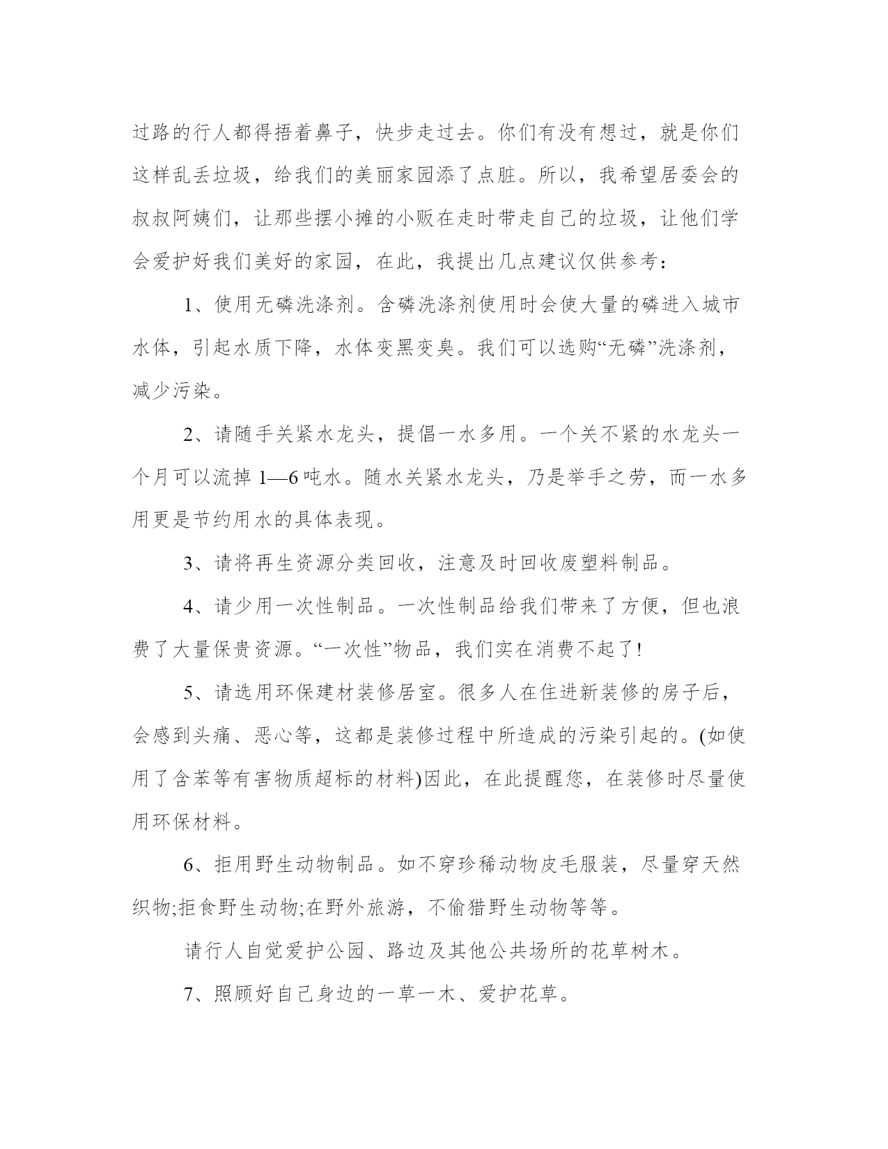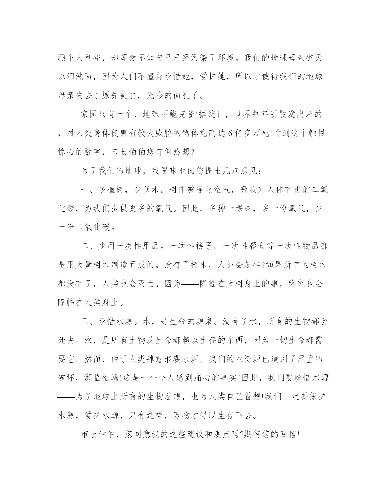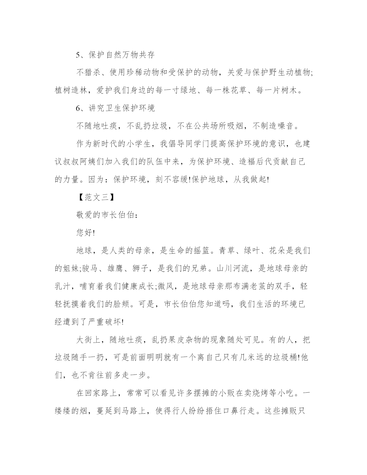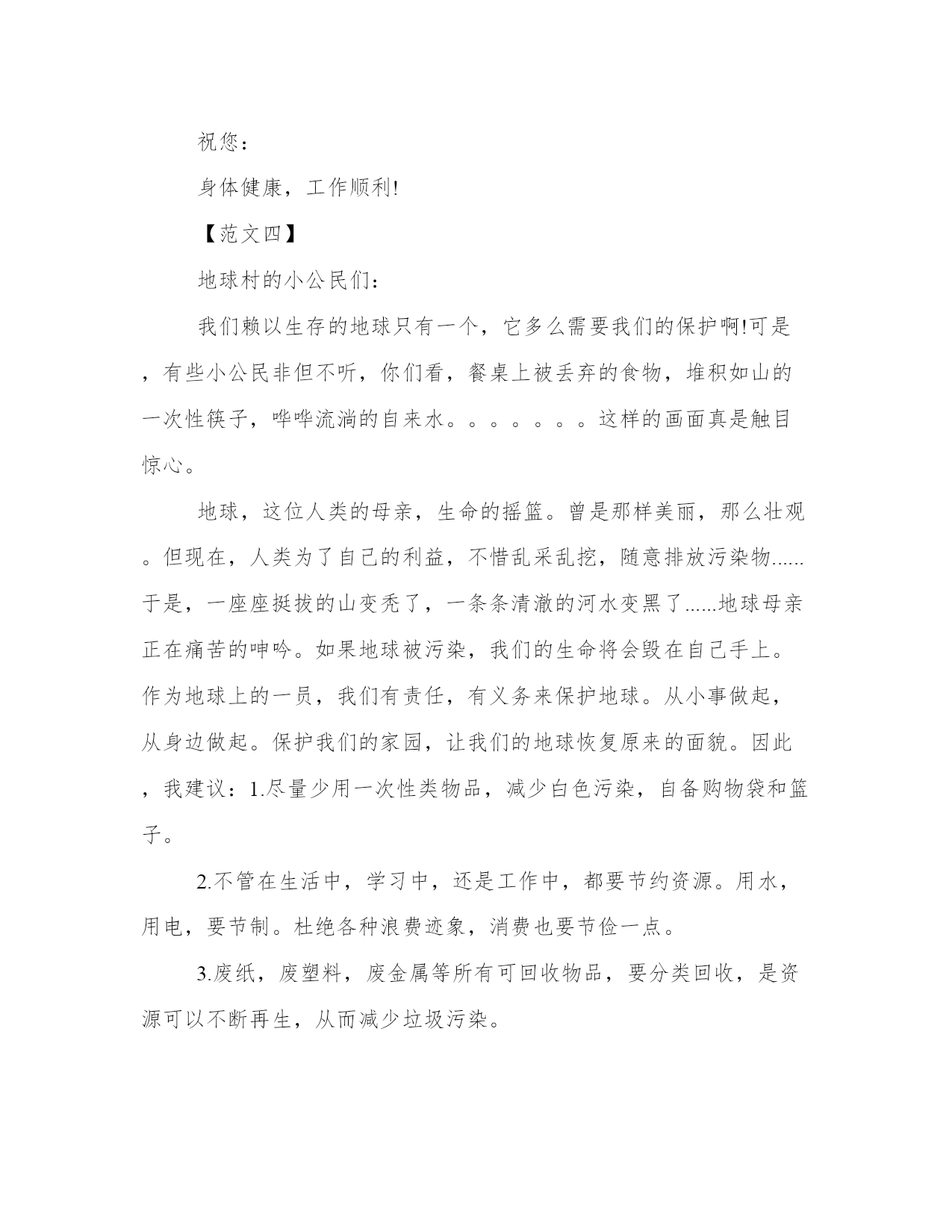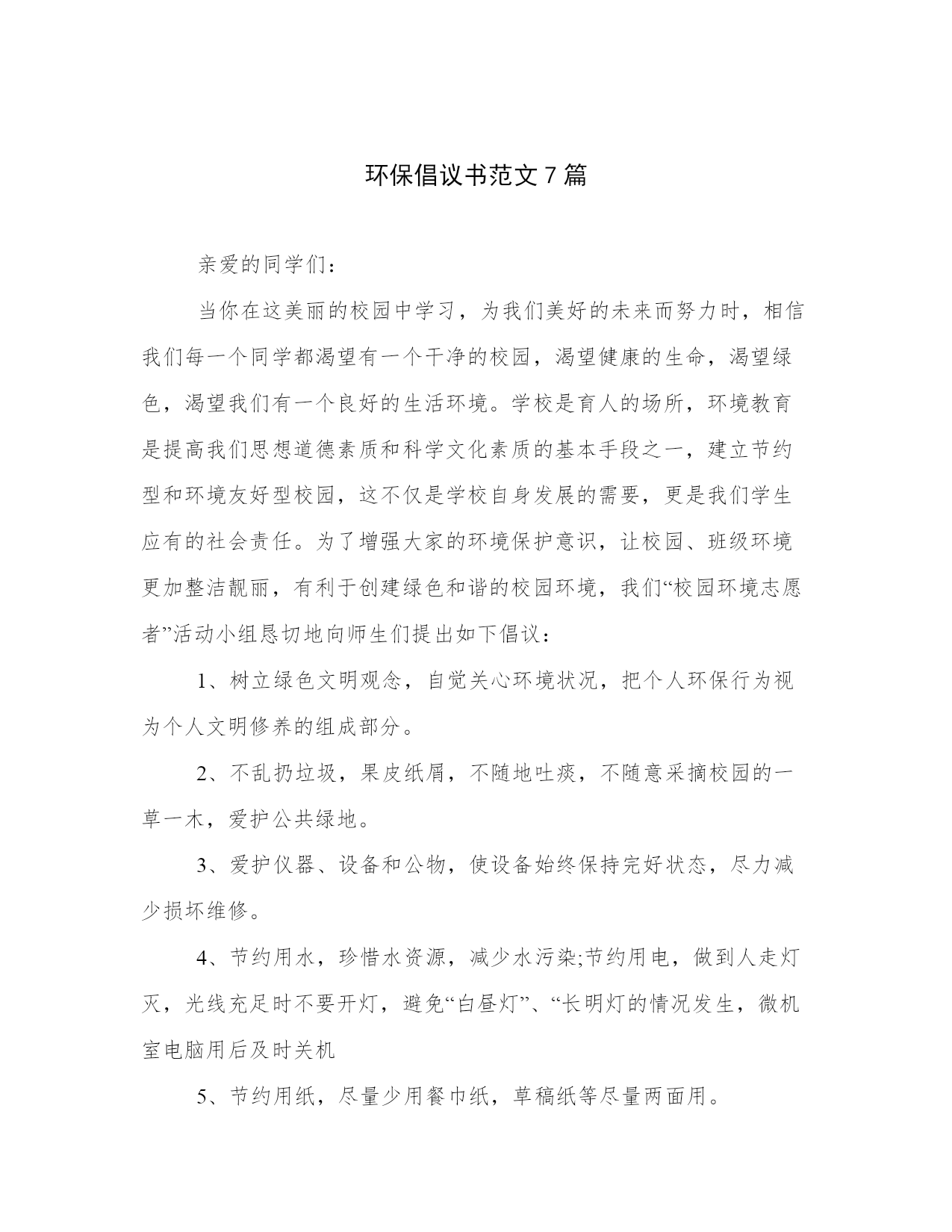 环保倡议书范文7篇亲爱的同学们:当你在这美丽的校园中学习,为我们美好的未来而努力时,相信我们每一个同学都渴望有一个干净的校园,渴望健康的生命,渴望绿色,渴望我们有一个良好的生活环境。学校是育人的场所,环境教育是提高我们思想道德素质和科学文化素质的基本手段之一,建立节约型和环境友好型校园,这不仅是学校自身发展的需要,更是我们学生应有的社会责任。为了增强大家的环境保护意识,让校园、班级环境更加整洁靓丽,有利于创建绿色和谐的校园环境,我们“校园环境志愿者”活动小组恳切地向师生们提出如下倡议:1、树立绿色文明观念,自觉关心环境状况,把个人环保行为视为个人文明修养的组成部分。2、不乱扔垃圾,果皮纸屑,不随地吐痰,不随意采摘校园的一草一木,爱护公共绿地。3、爱护仪器、设备和公物,使设备始终保持完好状态,尽力减少损坏维修。4、节约用水,珍惜水资源,减少水污染;节约用电,做到人走灯灭,光线充足时不要开灯,避免“白昼灯”、“长明灯的情况发生,微机室电脑用后及时关机5、节约用纸,尽量少用餐巾纸,草稿纸等尽量两面用。6、生活节俭,不随意浪费粮食,不剩饭,培养良好的生活习惯。7、尽量少用塑料袋,尽量少用一次性的纸杯、塑料杯。8、从我做起,号召全校同学树立环境意识,为创建绿色和谐校园出自己的一份力。“历览前贤国与家,成由勤俭败由奢”,中华民族历来倡导节约,父母老师也再三强调环境的保护,让我们义不容辞地承担各自的使命,树立环境意识,养成节约资源的习惯,从我做起,从点滴小事做起,为共建环境友好型的和谐校园而努力!【范文二】如今十分发达的地球,虽然环境情况看起来十分乐观,但是却有十分重大的隐患,这都是人为制造出来的,:大肆砍伐树木、建立化工厂、胡乱排放有害液体。“对人类威胁较大的气体,世界每年的排放量达6亿多吨;估计到下个世纪中叶,地球表面有三分之一的土地面临沙漠化的危险,每年有6平方公里的土地沙漠化,威胁着60多个国家”看见这一组组令人触目惊心的数字,人类,你们有何感想?从2300万年到1800万年前森林古猿的出现到现在人类高度发达的文明时代,对于每个人从未停止过的索取,大自然都是“有求必应”的,这更滋长了人类的贪欲。由此,我郑重地向仍未觉悟的人们建议:第一,人类要想征服可怕的大自然,就必须尊重自然。对于改造自然理应慎之又慎,又要大刀阔斧,勇于实践和改良,才能控制自然,使自身利益与自然协调发展,决不能重蹈西方发达国家“先污染,后治理”的覆辙。第二,要从我做起,首先选择有利于保护环境的生活方式。善待我们的家园、善待地球,共创一个美好的生活环境。1、节约资源减少污染(1)节水为荣,随时关上水龙头,防止滴漏。(2)慎用清洁剂,尽量用肥皂,减少洗涤剂中的化学物质对水的污染。2、绿色消费环保选择(1)用无铅汽油、无镉铅电池、无磷洗涤剂,减少水与空气的污染。(2)购买低砩家用制冷器具、无砩发用摩丝,减少对臭氧层的污染。3、重复使用多次利用尽量少使用一次性用品,多使用耐用品。如不使用一次性塑料和餐盒,减少白色污染;不使用一次性筷子;自备购物口袋或提篮。4、分类回收循环再用不乱丢弃废电池、废塑料等垃圾、废物;将垃圾分类投放,变废为宝,使资源循环再生,造福人类。5、保护自然万物共存不猎杀、使用珍稀动物和受保护的动物,关爱与保护野生动植物;植树造林,爱护我们身边的每一寸绿地、每一株花草、每一片树木。6、讲究卫生保护环境不随地吐痰,不乱扔垃圾,不在公共场所吸烟,不制造噪音。作为新时代的小学生,我倡导同学门提高保护环境的意识,也建议叔叔阿姨们加入我们的队伍中来,为保护环境、造福后代贡献自己的力量。因为:保护环境,刻不容缓!保护地球,从我做起!【范文三】敬爱的市长伯伯:您好!地球,是人类的母亲,是生命的摇篮。青草、绿叶、花朵是我们的姐妹;骏马、雄鹰、狮子,是我们的兄弟。山川河流,是地球母亲的乳汁,哺育着我们健康成长;微风,是地球母亲那布满老茧的双手,轻轻抚摸着我们的脸颊。可是,市长伯伯您知道吗,我们生活的环境已经遭到了严重破坏!大街上,随地吐痰,乱扔果皮杂物的现象随处可见。有的人,把垃圾随手一扔,可是前面明明就有一个离自己只有几米远的垃圾桶!他们,也不肯往前多走一步。在回家路上,常常可以看见许多摆摊的小贩在卖烧烤等小吃。一缕缕的烟,蔓延到马路上,使得行人纷纷捂住口鼻行走。这些摊贩只顾个人利益,却浑然不知自己已经污染了环境。我们的地球母亲整天以泪洗面,因为人们不懂得珍惜她,爱护她,所以才使得我们的地球母亲失去了原先美丽,光彩的面孔了。家园只有一个,地球不能克隆!据统计,世界每年所散发出来的,对人类身体健康有较大威胁的物体竟高达6亿多万吨!看到这个触目惊心的数字,市长伯伯您有何感想?为了我们的地球,我冒昧地