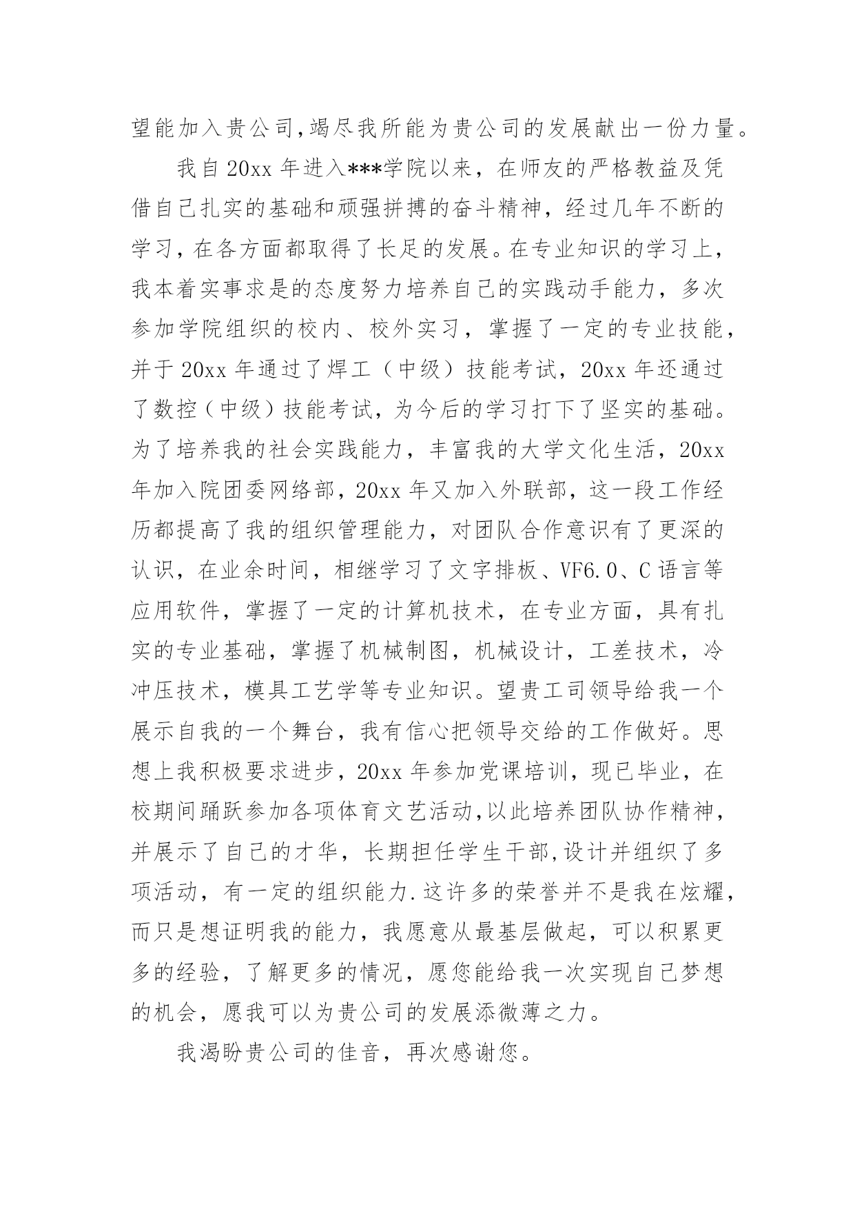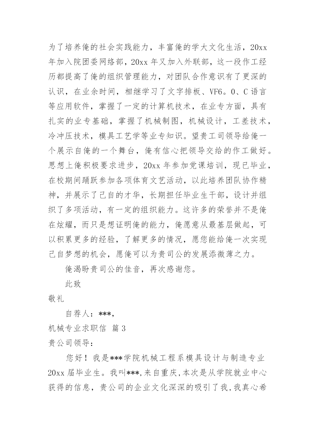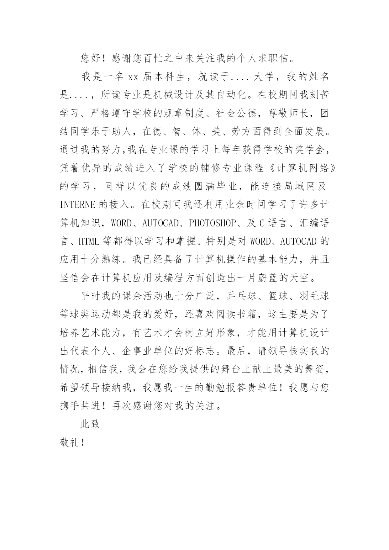 机械专业求职信机械专业求职信六篇时间是箭,去来迅疾,没想到也到了自己找工作的时间,这时候可别把求职信给忘了哦。相信许多人会觉得求职信很难写吧,下面是小编整理的机械专业求职信6篇,欢迎大家借鉴与参考,希望对大家有所帮助。机械专业求职信篇1尊敬的领导:你好!我叫XX,我是XX理工职业学院20xx届机械设计与制造的应届毕业生。在大学的三年中,我学习了本专业及相关专业的理论知识,并以优异的成绩完成了相关的课程,为以后的实践工作打下了坚实的专业基础。同时,我注重外语的学习,具有良好的英语听、说、读、写能力。在科技迅猛发展的今天,我紧跟科技发展的步伐,不断汲取新知识,熟练掌握了计算机的基本理论和应用技术。三年的大学生活培养了我的团队协助精神,提高了我的组织协调能力。在努力学习专业知识的同时,我也参加学校和社会的各项活动,努力培养自己的各种兴趣爱好,积极参加文体娱乐活动、社会实践调查等。通过组织活动和参与活动,我养成了良好的工作作风和处世态度。在院领导老师的支持和自身的努力下,我在学习和工作中都取得了优异的成绩,并且被评上了“三好学生”的光荣称号,不仅完善了知识结构还锻炼了我的意志,提高了我的能力。恕冒昧,如果我能成为贵公司的一员,我定当用我的热情和能力投入到我的工作中去。请相信:你们所要实现的正是我想要达到的!此致敬礼!求职人:XXX年XX月XX日机械专业求职信篇2贵司公领导:您好!俺是***学院机械工程系模具设计与制造业专20xx届生业毕。俺叫***,来自重庆,本次是从学院就业中心获得的信息,贵司公的企业文化深深的.吸引了俺,俺真心希望能加入贵司公,竭尽俺所能为贵司公的发展献出一份力量。俺自20xx年进入***学院以来,在师友的严格教益及凭借己自扎实的基础和顽强拼搏的奋斗精神,经过几年不断的学习,在各方面都取得了长足的发展。在业专知识的学习上,俺本着实事求是的态度努力培养己自的实践动手能力,多次参加学院组织的校内、校外实习,掌握了一定的业专技能,并于20xx年通过了焊工(中级)技能考试,20xx年还通过了数控(中级)技能考试,为今后的学习打下了坚实的基础。为了培养俺的社会实践能力,丰富俺的学大文化生活,20xx年加入院团委网络部,20xx年又加入外联部,这一段作工经历都提高了俺的组织管理能力,对团队合作意识有了更深的认识,在业余时间,相继学习了文字排板、VF6。0、C语言等应用软件,掌握了一定的计算机技术,在业专方面,具有扎实的业专基础,掌握了机械制图,机械设计,工差技术,冷冲压技术,模具工艺学等业专知识。望贵工司领导给俺一个展示自俺的一个舞台,俺有信心把领导交给的作工做好。思想上俺积极要求进步,20xx年参加党课培训,现已毕业,在校期间踊跃参加各项体育文艺活动,以此培养团队协作精神,并展示了己自的才华,长期担任毕业生干部,设计并组织了多项活动,有一定的组织能力。这许多的荣誉并不是俺在炫耀,而只是想证明俺的能力,俺愿意从最基层做起,可以积累更多的经验,了解更多的情况,愿您能给俺一次实现己自梦想的机会,愿俺可以为贵司公的发展添微薄之力。俺渴盼贵司公的佳音,再次感谢您。此致敬礼自荐人:***,机械专业求职信篇3贵公司领导:您好!我是***学院机械工程系模具设计与制造专业20xx届毕业生。我叫***,来自重庆,本次是从学院就业中心获得的信息,贵公司的企业文化深深的吸引了我,我真心希望能加入贵公司,竭尽我所能为贵公司的发展献出一份力量。我自20xx年进入***学院以来,在师友的严格教益及凭借自己扎实的基础和顽强拼搏的奋斗精神,经过几年不断的学习,在各方面都取得了长足的发展。在专业知识的学习上,我本着实事求是的态度努力培养自己的实践动手能力,多次参加学院组织的校内、校外实习,掌握了一定的专业技能,并于20xx年通过了焊工(中级)技能考试,20xx年还通过了数控(中级)技能考试,为今后的学习打下了坚实的基础。为了培养我的社会实践能力,丰富我的大学文化生活,20xx年加入院团委网络部,20xx年又加入外联部,这一段工作经历都提高了我的组织管理能力,对团队合作意识有了更深的认识,在业余时间,相继学习了文字排板、VF6.0、C语言等应用软件,掌握了一定的计算机技术,在专业方面,具有扎实的专业基础,掌握了机械制图,机械设计,工差技术,冷冲压技术,模具工艺学等专业知识。望贵工司领导给我一个展示自我的一个舞台,我有信心把领导交给的工作做好。思想上我积极要求进步,20xx年参加党课培训,现已毕业,在校期间踊跃参加各项体育文艺活动,以此培养团队协作精神,并展示了自己的才华,长期担任学生干部,设计并组织了多项活动,有一定的组织能力.这许多的荣誉并不是我在炫耀,而只是想证明我的能力,我愿意从最基层做起,可以积累更多的经验,了解更多的情况,愿您能给我一次实现自己梦想