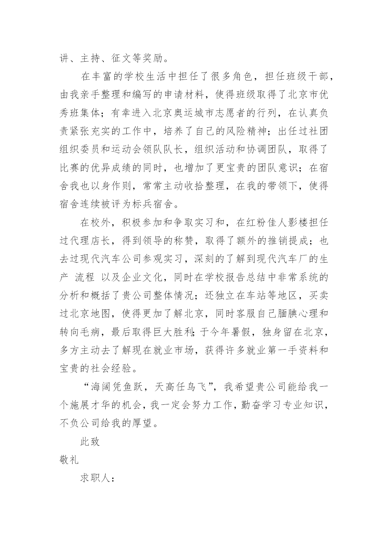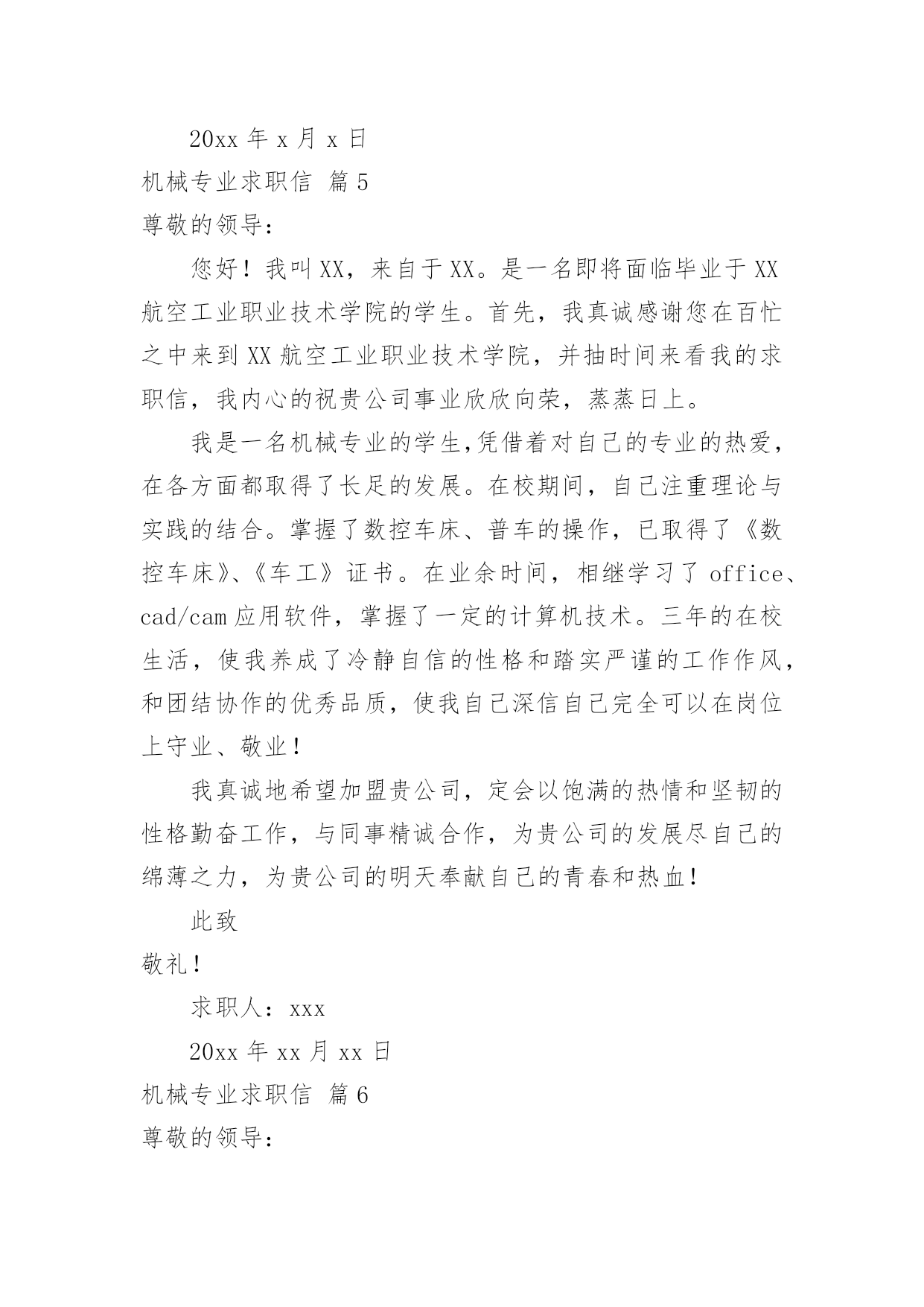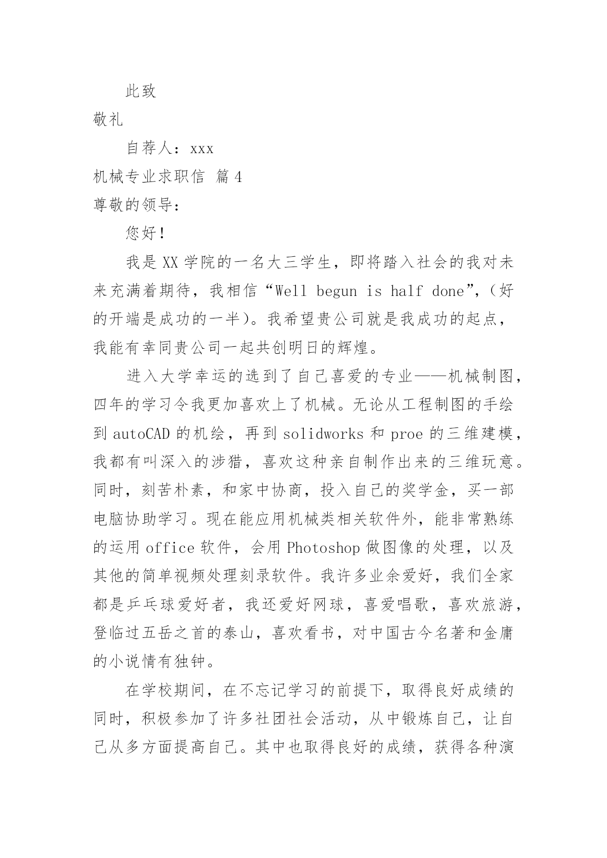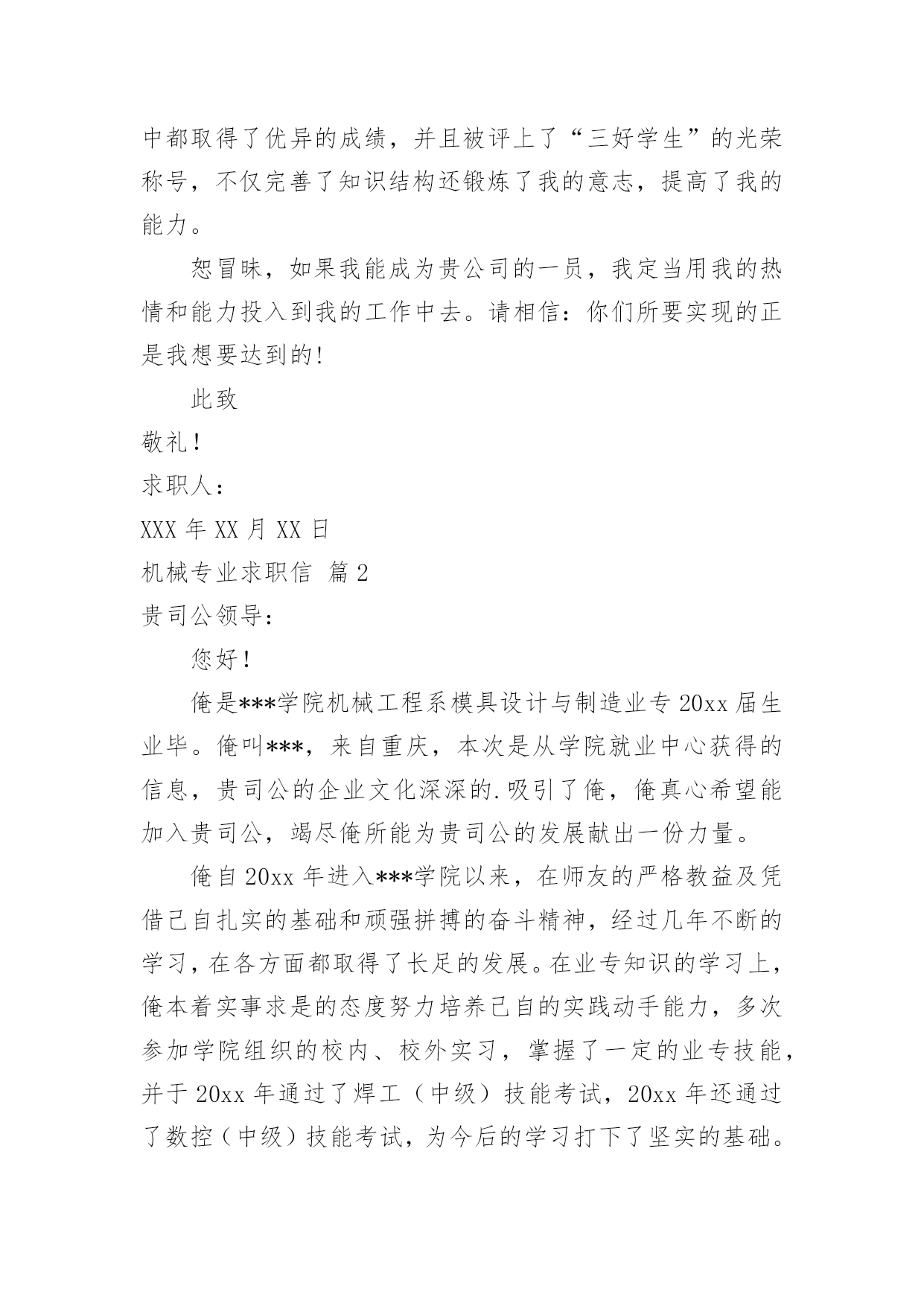 机械专业求职信机械专业求职信六篇时间是箭,去来迅疾,没想到也到了自己找工作的时间,这时候可别把求职信给忘了哦。相信许多人会觉得求职信很难写吧,下面是小编整理的机械专业求职信6篇,欢迎大家借鉴与参考,希望对大家有所帮助。机械专业求职信篇1尊敬的领导:你好!我叫XX,我是XX理工职业学院20xx届机械设计与制造的应届毕业生。在大学的三年中,我学习了本专业及相关专业的理论知识,并以优异的成绩完成了相关的课程,为以后的实践工作打下了坚实的专业基础。同时,我注重外语的学习,具有良好的英语听、说、读、写能力。在科技迅猛发展的今天,我紧跟科技发展的步伐,不断汲取新知识,熟练掌握了计算机的基本理论和应用技术。三年的大学生活培养了我的团队协助精神,提高了我的组织协调能力。在努力学习专业知识的同时,我也参加学校和社会的各项活动,努力培养自己的各种兴趣爱好,积极参加文体娱乐活动、社会实践调查等。通过组织活动和参与活动,我养成了良好的工作作风和处世态度。在院领导老师的支持和自身的努力下,我在学习和工作中都取得了优异的成绩,并且被评上了“三好学生”的光荣称号,不仅完善了知识结构还锻炼了我的意志,提高了我的能力。恕冒昧,如果我能成为贵公司的一员,我定当用我的热情和能力投入到我的工作中去。请相信:你们所要实现的正是我想要达到的!此致敬礼!求职人:XXX年XX月XX日机械专业求职信篇2贵司公领导:您好!俺是***学院机械工程系模具设计与制造业专20xx届生业毕。俺叫***,来自重庆,本次是从学院就业中心获得的信息,贵司公的企业文化深深的.吸引了俺,俺真心希望能加入贵司公,竭尽俺所能为贵司公的发展献出一份力量。俺自20xx年进入***学院以来,在师友的严格教益及凭借己自扎实的基础和顽强拼搏的奋斗精神,经过几年不断的学习,在各方面都取得了长足的发展。在业专知识的学习上,俺本着实事求是的态度努力培养己自的实践动手能力,多次参加学院组织的校内、校外实习,掌握了一定的业专技能,并于20xx年通过了焊工(中级)技能考试,20xx年还通过了数控(中级)技能考试,为今后的学习打下了坚实的基础。为了培养俺的社会实践能力,丰富俺的学大文化生活,20xx年加入院团委网络部,20xx年又加入外联部,这一段作工经历都提高了俺的组织管理能力,对团队合作意识有了更深的认识,在业余时间,相继学习了文字排板、VF6。0、C语言等应用软件,掌握了一定的计算机技术,在业专方面,具有扎实的业专基础,掌握了机械制图,机械设计,工差技术,冷冲压技术,模具工艺学等业专知识。望贵工司领导给俺一个展示自俺的一个舞台,俺有信心把领导交给的作工做好。思想上俺积极要求进步,20xx年参加党课培训,现已毕业,在校期间踊跃参加各项体育文艺活动,以此培养团队协作精神,并展示了己自的才华,长期担任毕业生干部,设计并组织了多项活动,有一定的组织能力。这许多的荣誉并不是俺在炫耀,而只是想证明俺的能力,俺愿意从最基层做起,可以积累更多的经验,了解更多的情况,愿您能给俺一次实现己自梦想的机会,愿俺可以为贵司公的发展添微薄之力。俺渴盼贵司公的佳音,再次感谢您。此致敬礼自荐人:***,机械专业求职信篇3贵公司领导:您好!我是***学院机械工程系模具设计与制造专业20xx届毕业生。我叫***,来自重庆,本次是从学院就业中心获得的信息,贵公司的企业文化深深的吸引了我,我真心希望能加入贵公司,竭尽我所能为贵公司的发展献出一份力量。我自20xx年进入***学院以来,在师友的严格教益及凭借自己扎实的基础和顽强拼搏的奋斗精神,经过几年不断的学习,在各方面都取得了长足的发展。在专业知识的学习上,我本着实事求是的态度努力培养自己的实践动手能力,多次参加学院组织的校内、校外实习,掌握了一定的专业技能,并于20xx年通过了焊工(中级)技能考试,20xx年还通过了数控(中级)技能考试,为今后的学习打下了坚实的基础。为了培养我的社会实践能力,丰富我的大学文化生活,20xx年加入院团委网络部,20xx年又加入外联部,这一段工作经历都提高了我的组织管理能力,对团队合作意识有了更深的认识,在业余时间,相继学习了文字排板、VF6.0、C语言等应用软件,掌握了一定的计算机技术,在专业方面,具有扎实的专业基础,掌握了机械制图,机械设计,工差技术,冷冲压技术,模具工艺学等专业知识。望贵工司领导给我一个展示自我的一个舞台,我有信心把领导交给的工作做好。思想上我积极要求进步,20xx年参加党课培训,现已毕业,在校期间踊跃参加各项体育文艺活动,以此培养团队协作精神,并展示了自己的才华,长期担任学生干部,设计并组织了多项活动,有一定的组织能力.这许多的荣誉并不是我在炫耀,而只是想证明我的能力,我愿意从最基层做起,可以积累更多的经验,了解更多的情况,愿您能给我一次实现自己梦想