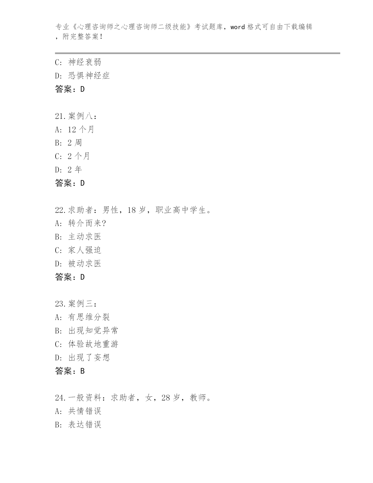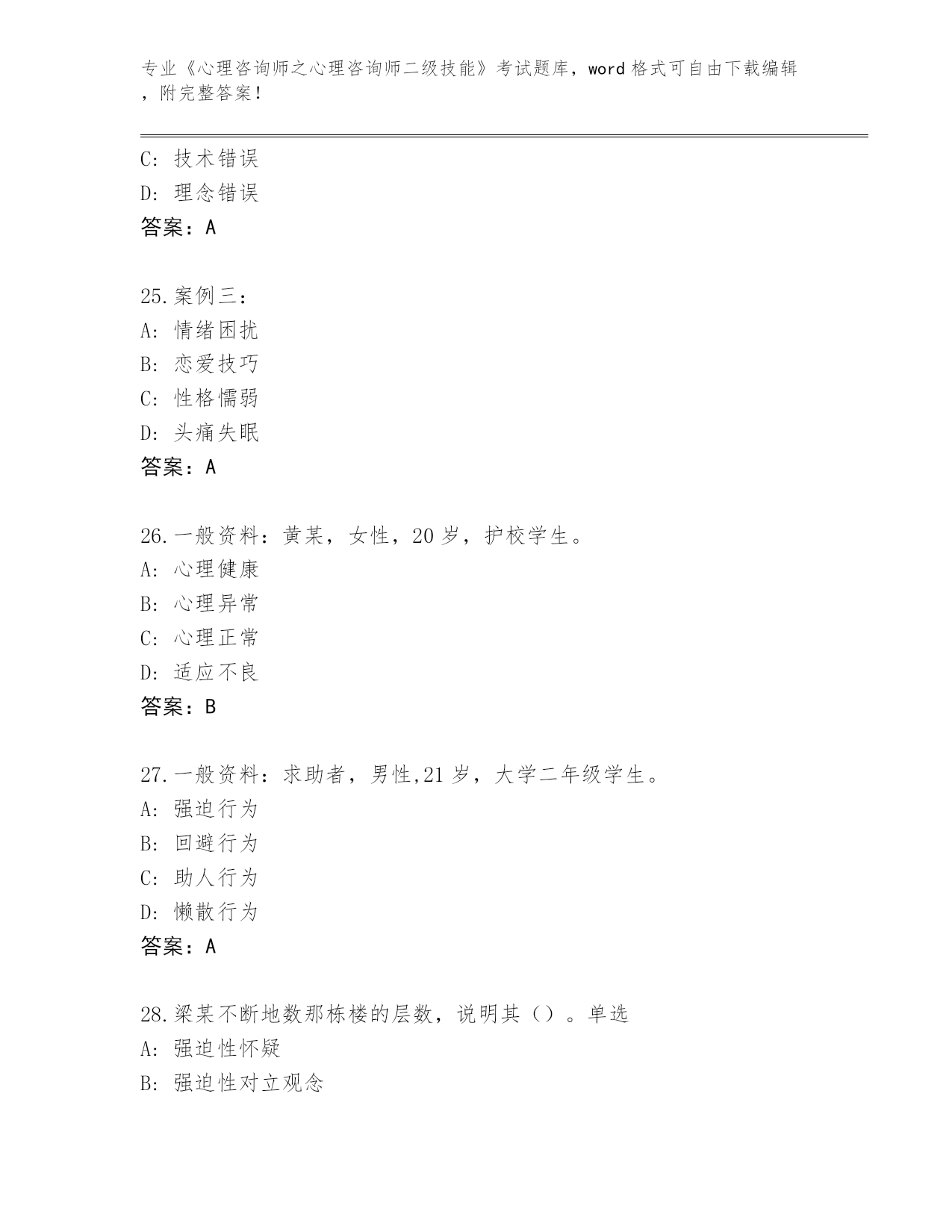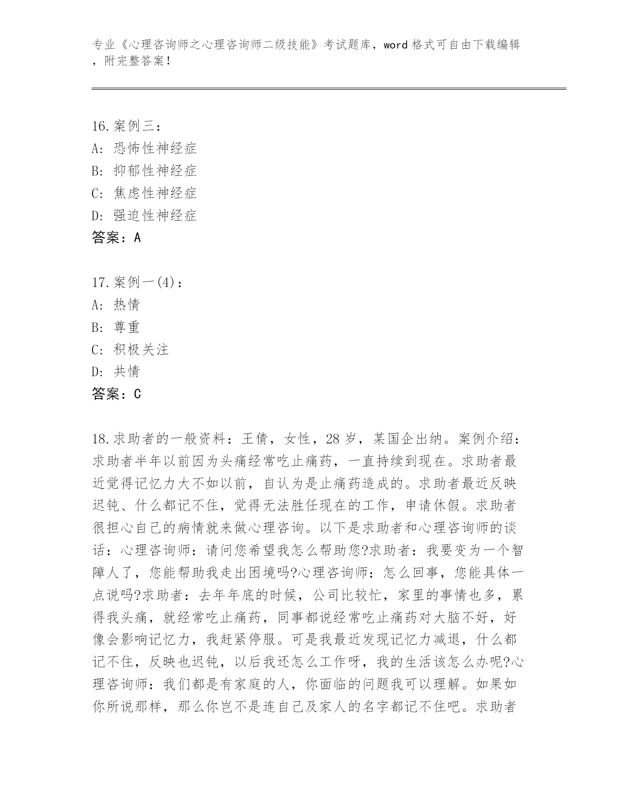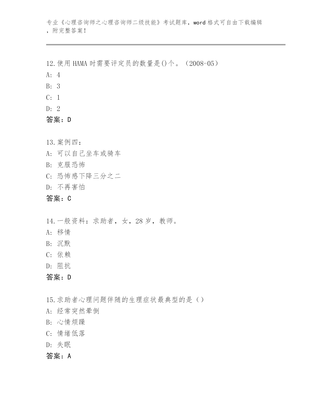 湖北省内部使用《心理咨询师之心理咨询师二级技能》考试大全(夺冠)